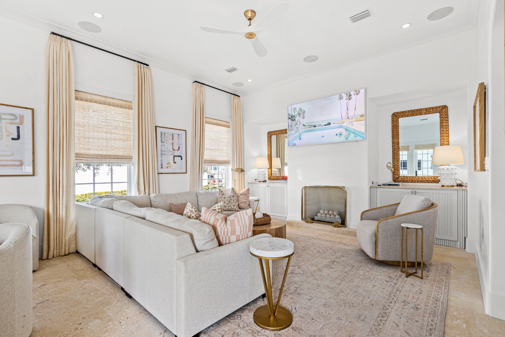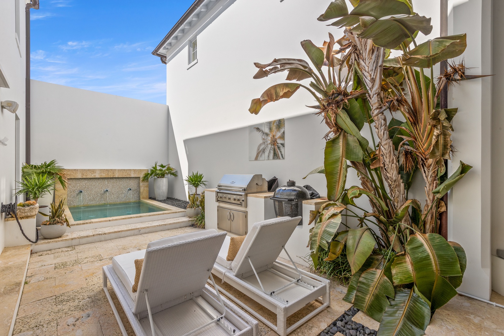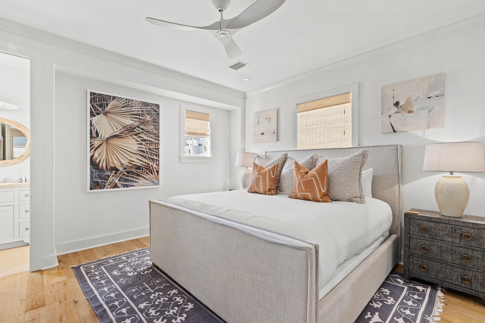 This vacation rental at Alys Beach is perfectly located between the Caliza Pool Complex and the ZUMA Wellness Center and is also a short walk to the emerging Town Center. This home features a private pool in the courtyard and covered outdoor seating with an outdoor television. The first floor offers a spacious great room with ample seating, a dining area and a kitchen with a large center island. Also on the first level is a half-bath, the laundry area and a bedroom with one king-sized bed and private bath. The second level of the home offers a large primary suite with one king-sized bed. Two additional bedrooms, both with private baths are found on the second level, one with a king-sized bed and one with two twin beds. A comfortable TV den is also found on the second level. Parking for this home is located in a two-car garage connected to the home.