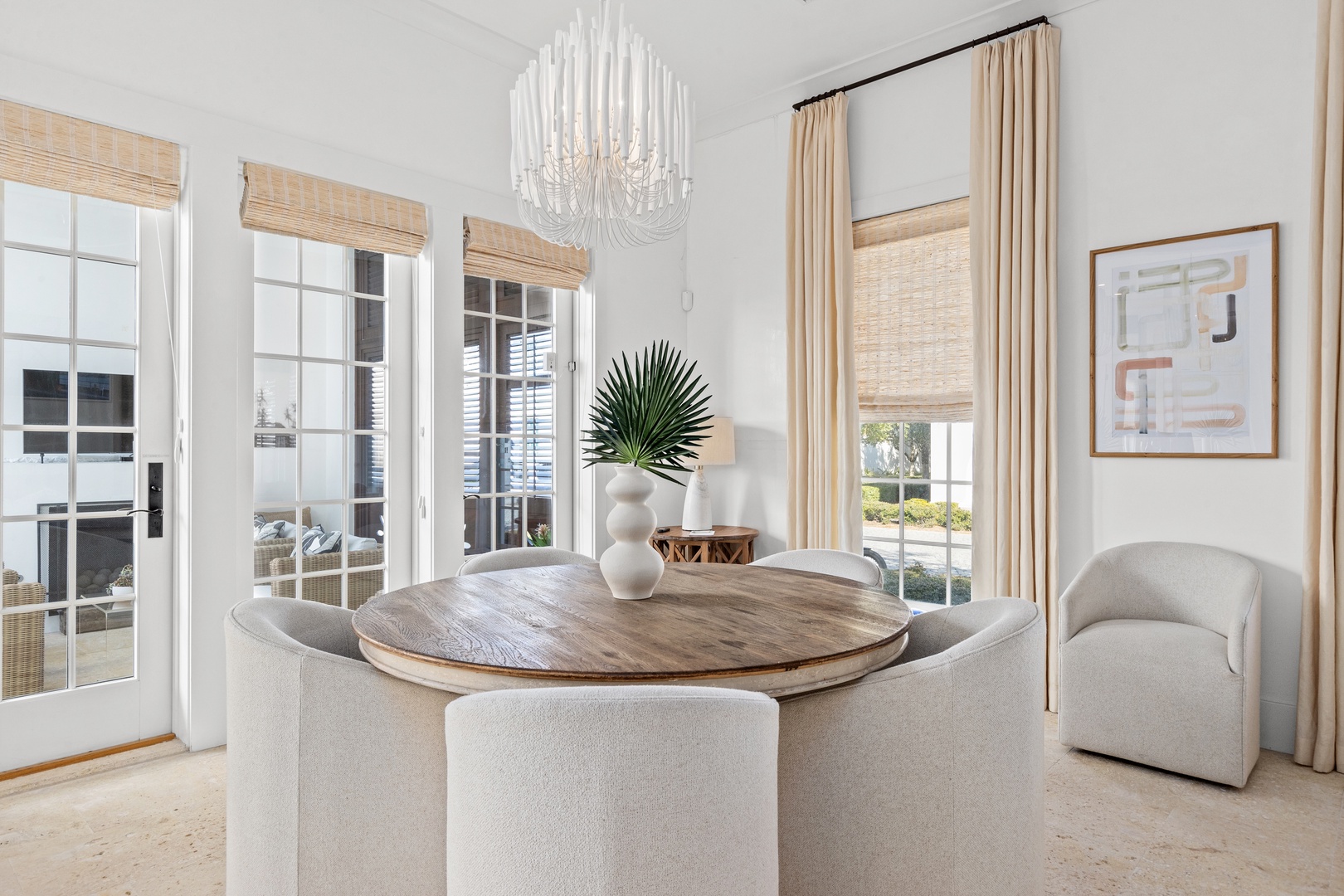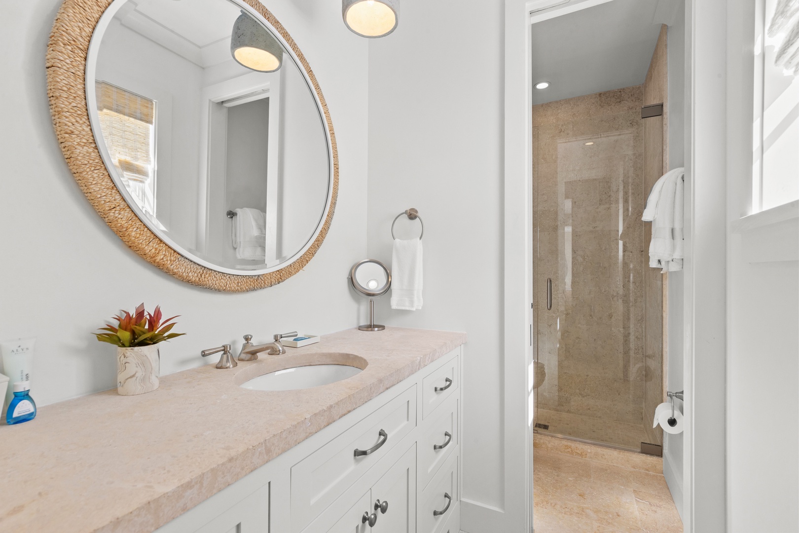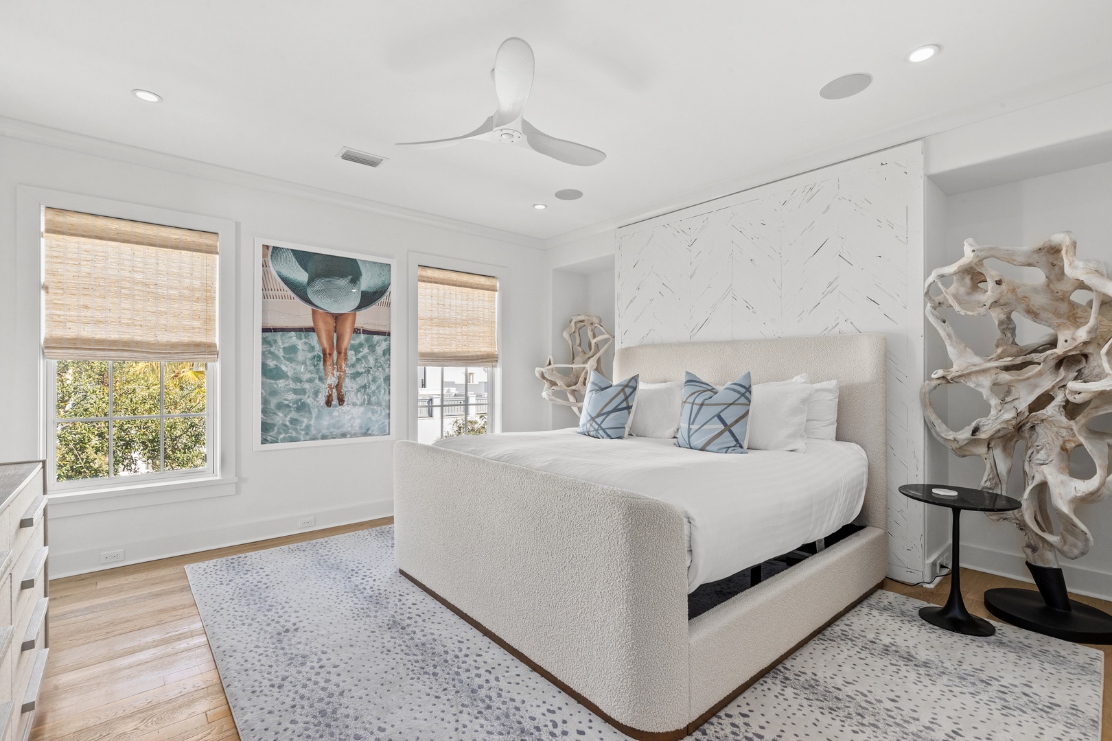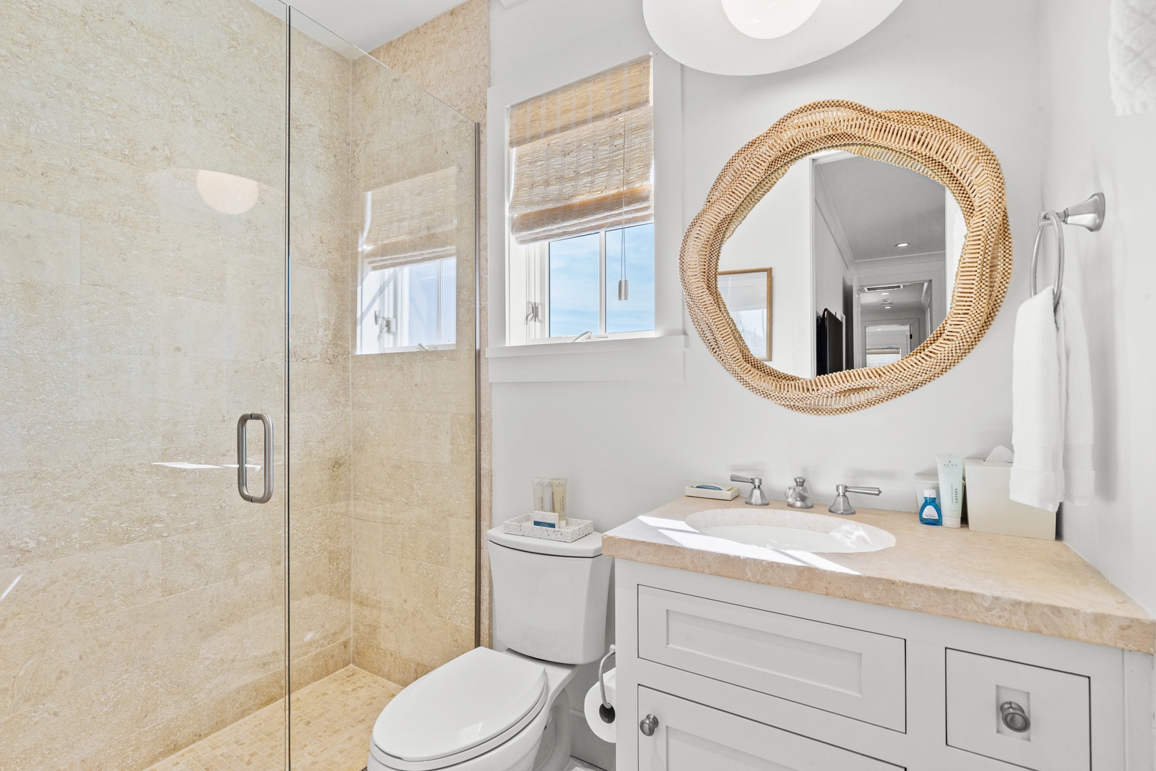 This vacation rental at Alys Beach is perfectly located between the Caliza Pool Complex and the ZUMA Wellness Center and is also a short walk to the emerging Town Center. This home features a private pool in the courtyard and covered outdoor seating with an outdoor television. The first floor offers a spacious great room with ample seating, a dining area and a kitchen with a large center island. Also on the first level is a half-bath, the laundry area and a bedroom with one king-sized bed and private bath. The second level of the home offers a large primary suite with one king-sized bed. Two additional bedrooms, both with private baths are found on the second level, one with a king-sized bed and one with two twin beds. A comfortable TV den is also found on the second level. Parking for this home is located in a two-car garage connected to the home.