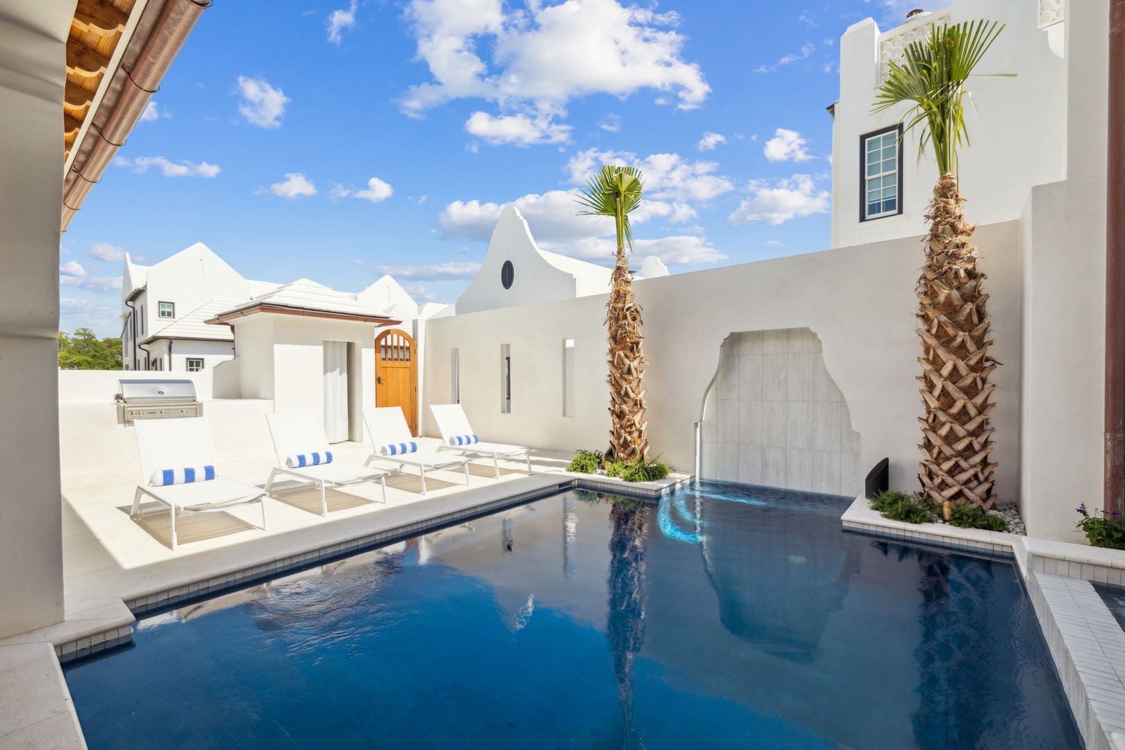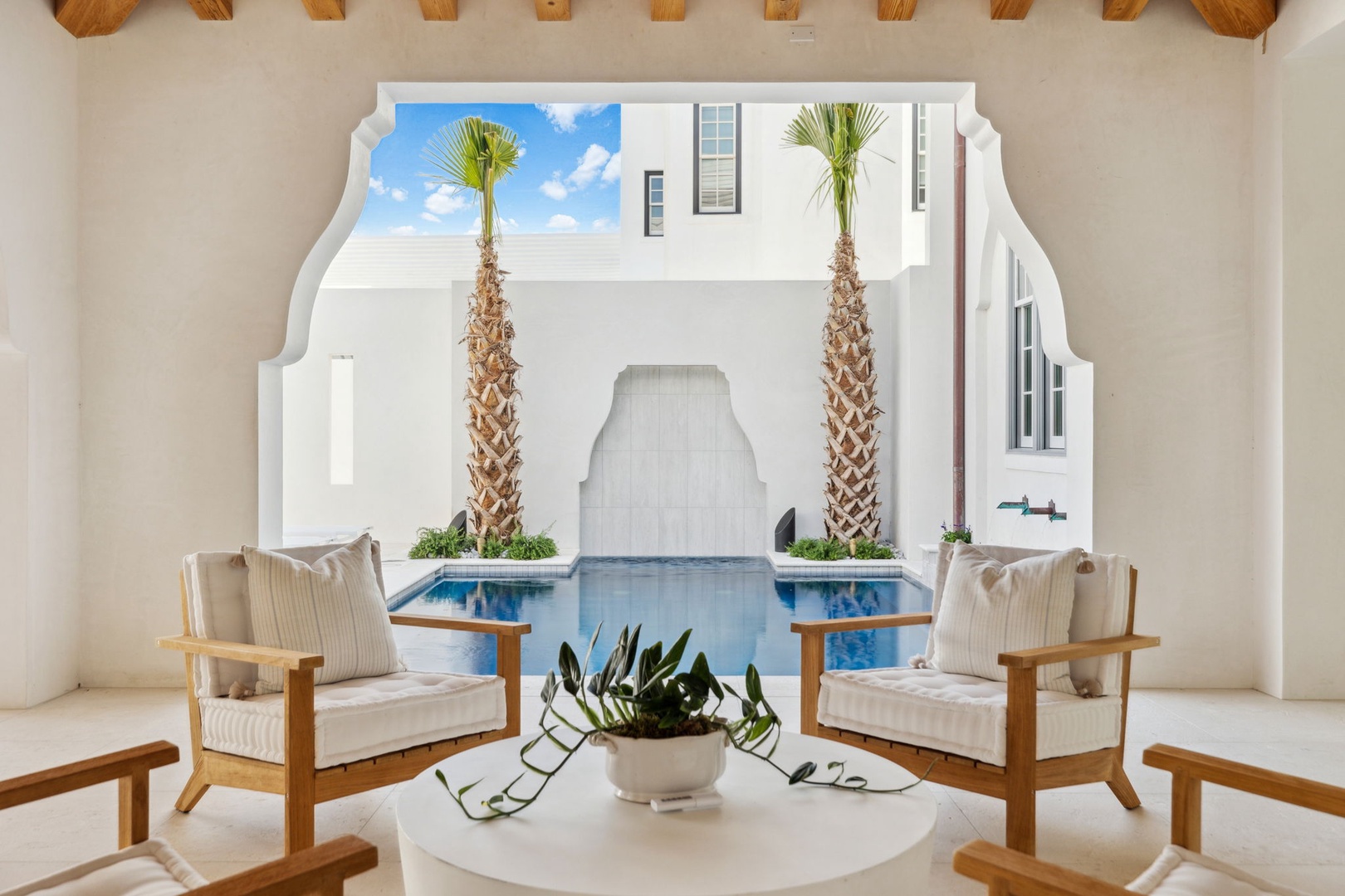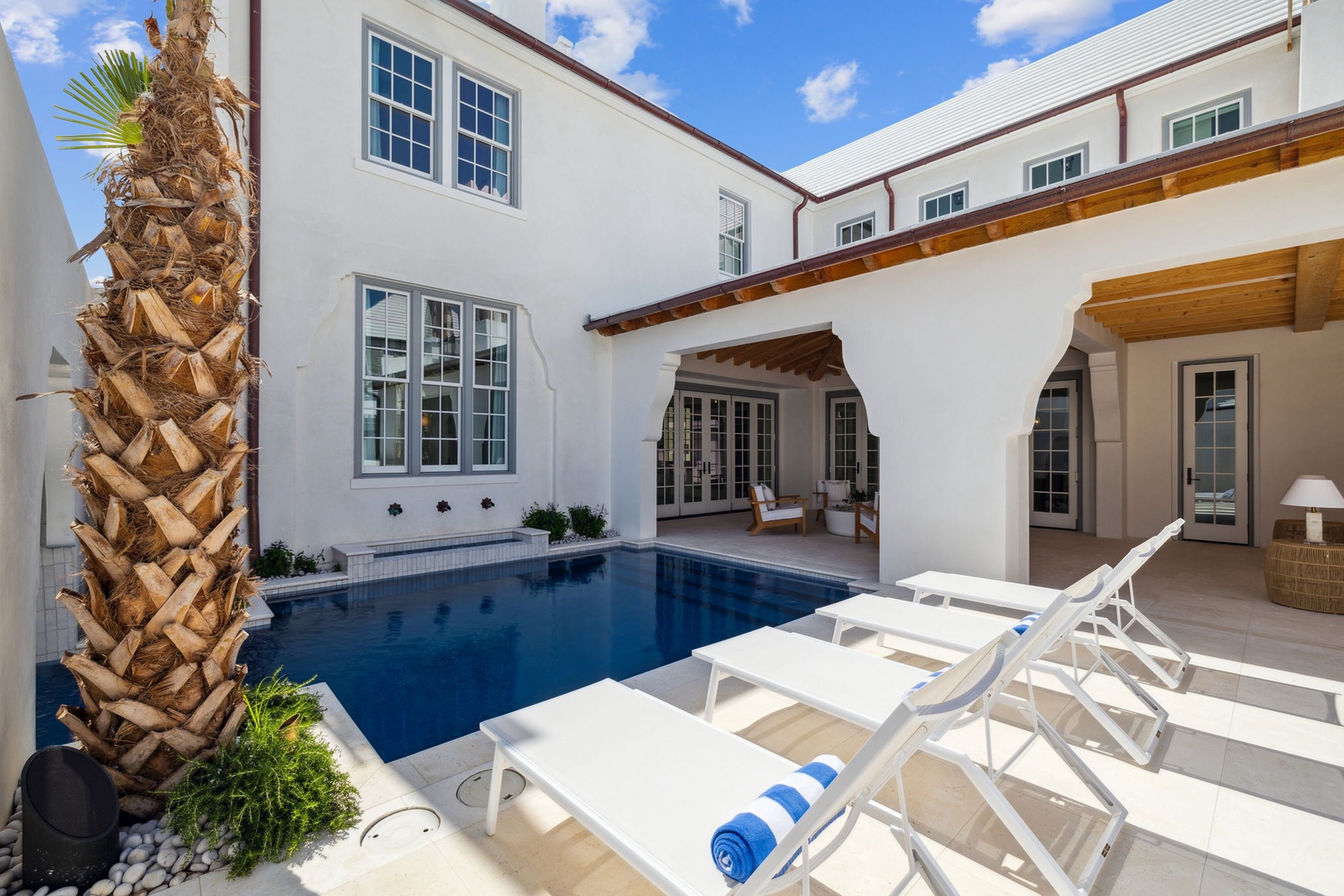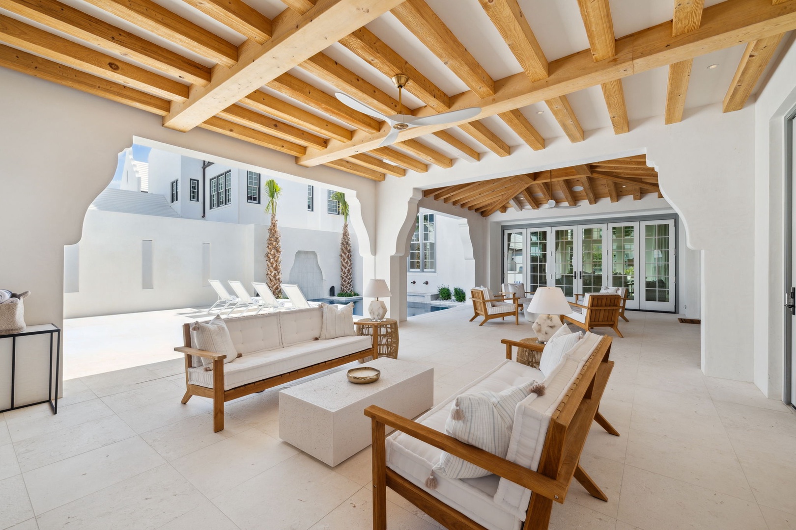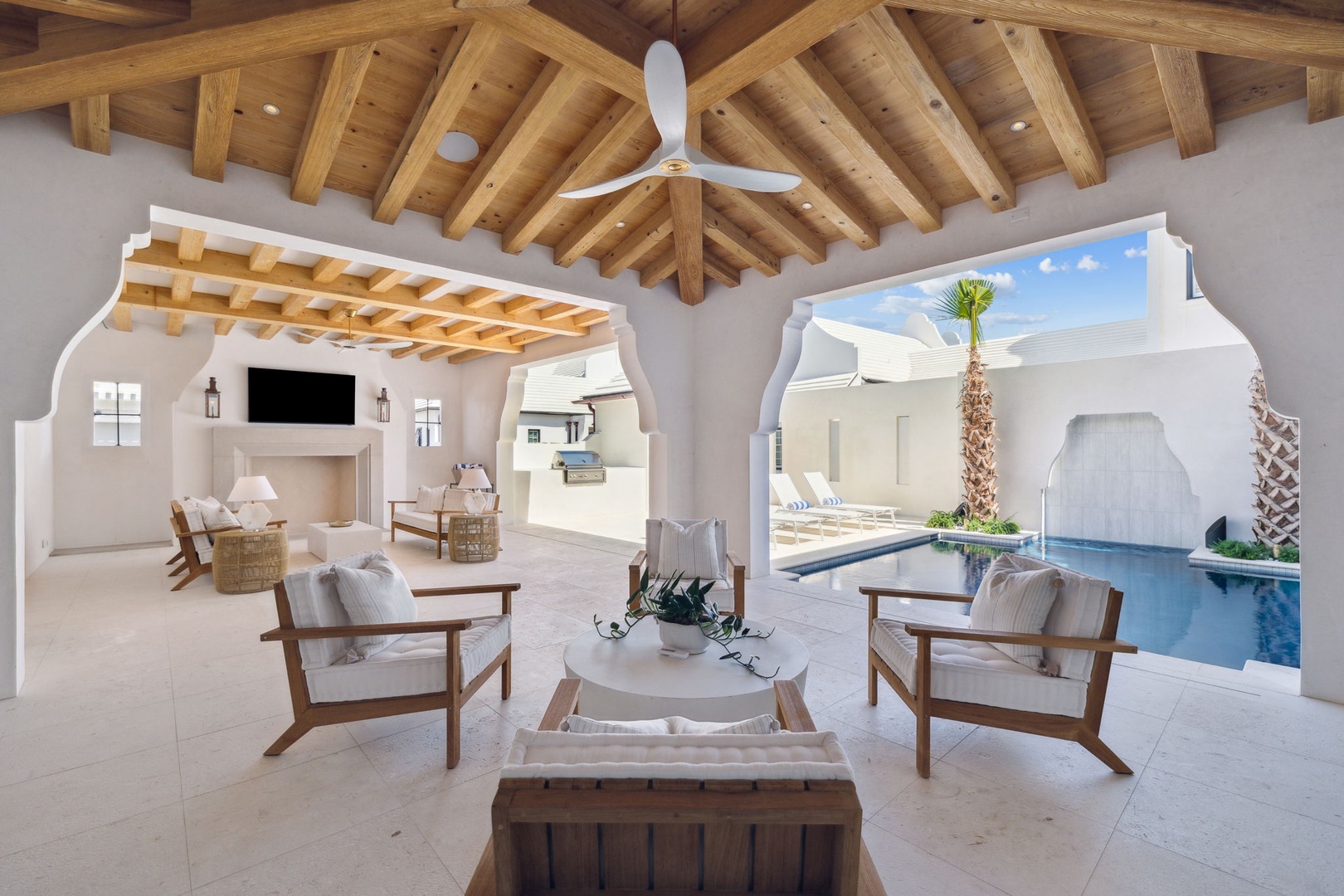 This brand-new vacation rental home was designed to accommodate two families, or a multi-generation visit with grandparents. Located in a quiet park setting on the North Turtle Bale pedestrian path, this home is a short stroll from the Caliza Pool Complex which is open to guests year-round. Offering five bedrooms all with private baths – two of which are master suites with spacious master baths - this grand and spacious home is the perfect fit for any party. Rarely does a vacation rental home offer so much outdoor space. The private pool is one of the largest of any home in Alys Beach. The courtyard offers ample outdoor and covered seating. An outdoor fireplace and television create the perfect place to enjoy many pleasant hours. Inside, the first floor features a large kitchen and dining area. The dining table offers seating for 8 with additional bar seating facing the kitchen. A large foyer leads to a tastefully decorated living room with lots of natural light looking over the pedestrian path and the home’s courtyard. A bedroom with one-king sized bed as well as a powder room are also found on this floor. Ascending the grand staircase, you will find a game table with four chairs at the top of the staircase as well as an additional TV den with a cathedral ceiling. Two bedrooms open from the den, each offering one king-sized bed. Down a separate hall, the fourth bedroom offers two queen-sized beds and the primary suite offers one king-sized bed and a private balcony with seating and a firepit. Parking for this home is in a two-car garage.