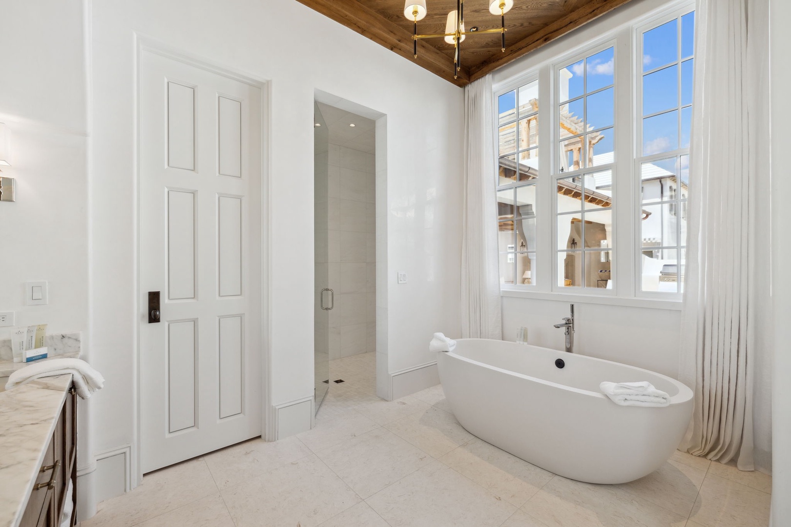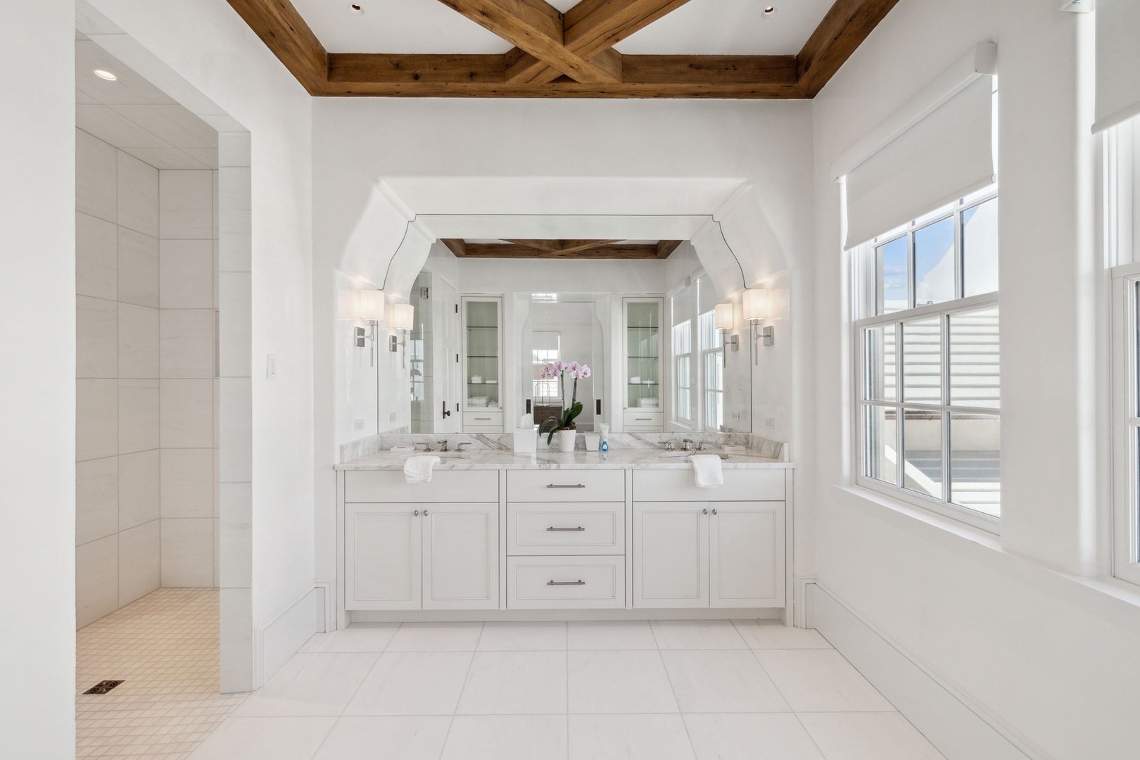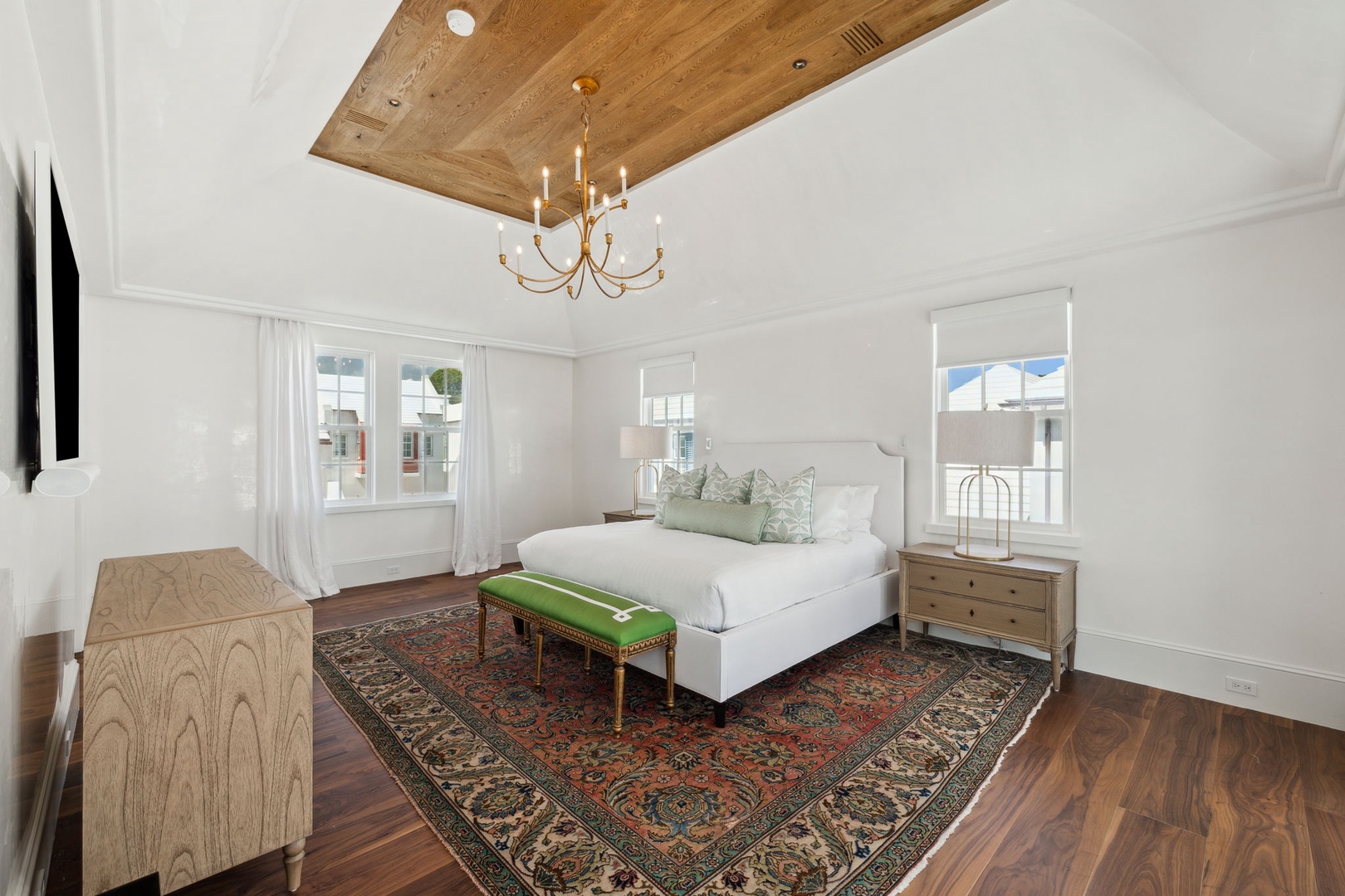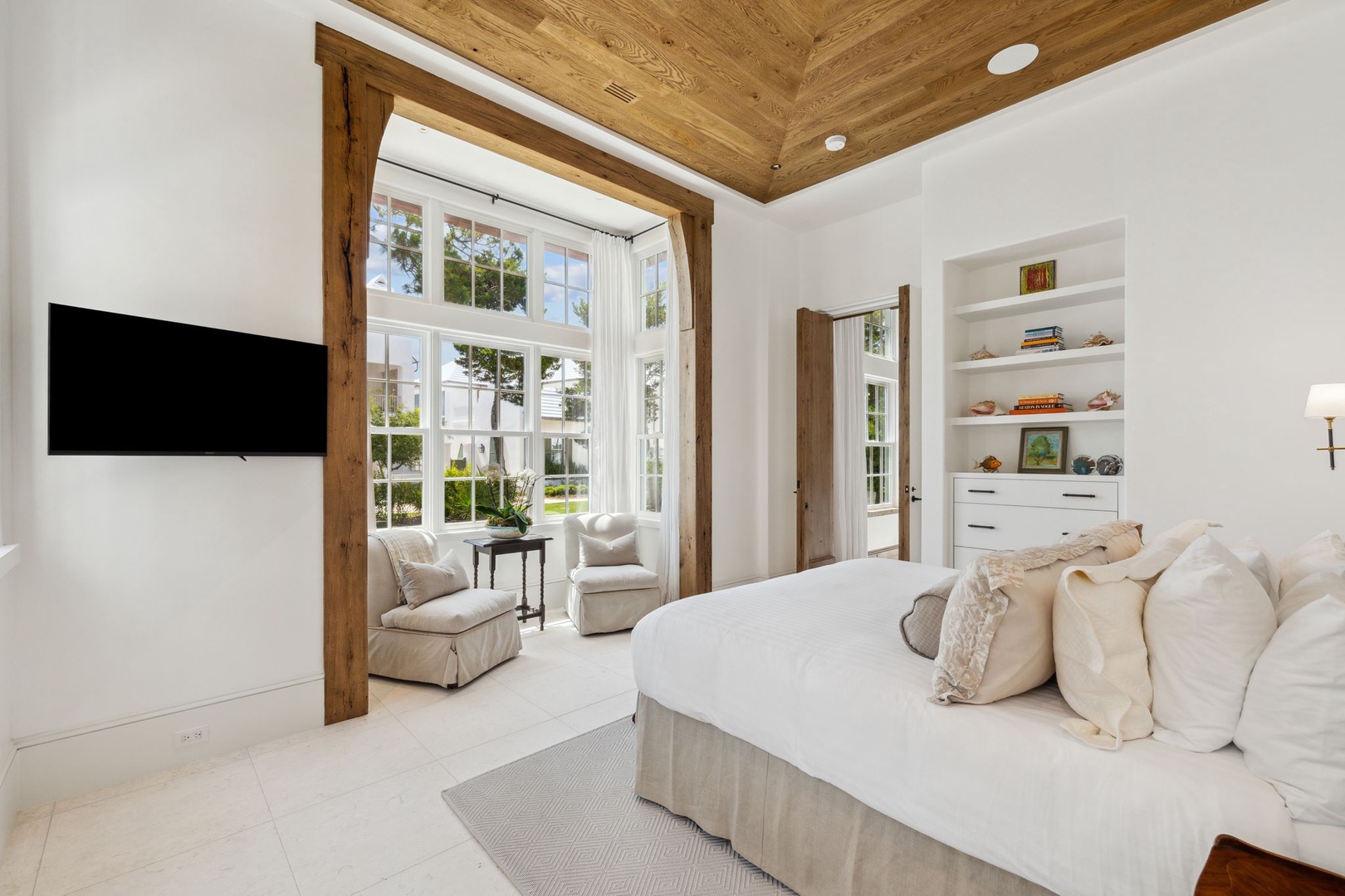 This brand-new vacation rental home was designed to accommodate two families, or a multi-generation visit with grandparents. Located in a quiet park setting on the North Turtle Bale pedestrian path, this home is a short stroll from the Caliza Pool Complex which is open to guests year-round. Offering five bedrooms all with private baths – two of which are master suites with spacious master baths - this grand and spacious home is the perfect fit for any party. Rarely does a vacation rental home offer so much outdoor space. The private pool is one of the largest of any home in Alys Beach. The courtyard offers ample outdoor and covered seating. An outdoor fireplace and television create the perfect place to enjoy many pleasant hours. Inside, the first floor features a large kitchen and dining area. The dining table offers seating for 8 with additional bar seating facing the kitchen. A large foyer leads to a tastefully decorated living room with lots of natural light looking over the pedestrian path and the home’s courtyard. A bedroom with one-king sized bed as well as a powder room are also found on this floor. Ascending the grand staircase, you will find a game table with four chairs at the top of the staircase as well as an additional TV den with a cathedral ceiling. Two bedrooms open from the den, each offering one king-sized bed. Down a separate hall, the fourth bedroom offers two queen-sized beds and the primary suite offers one king-sized bed and a private balcony with seating and a firepit. Parking for this home is in a two-car garage.