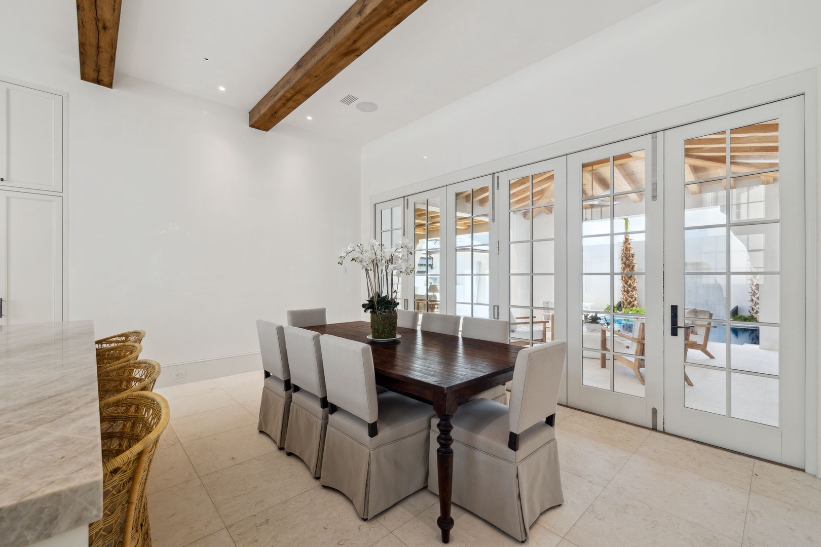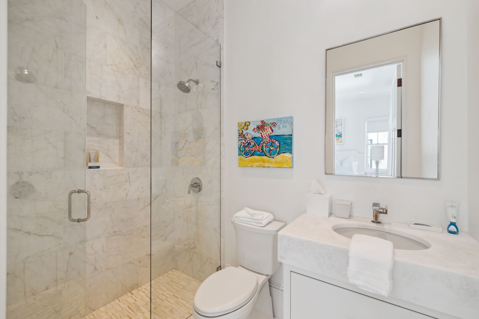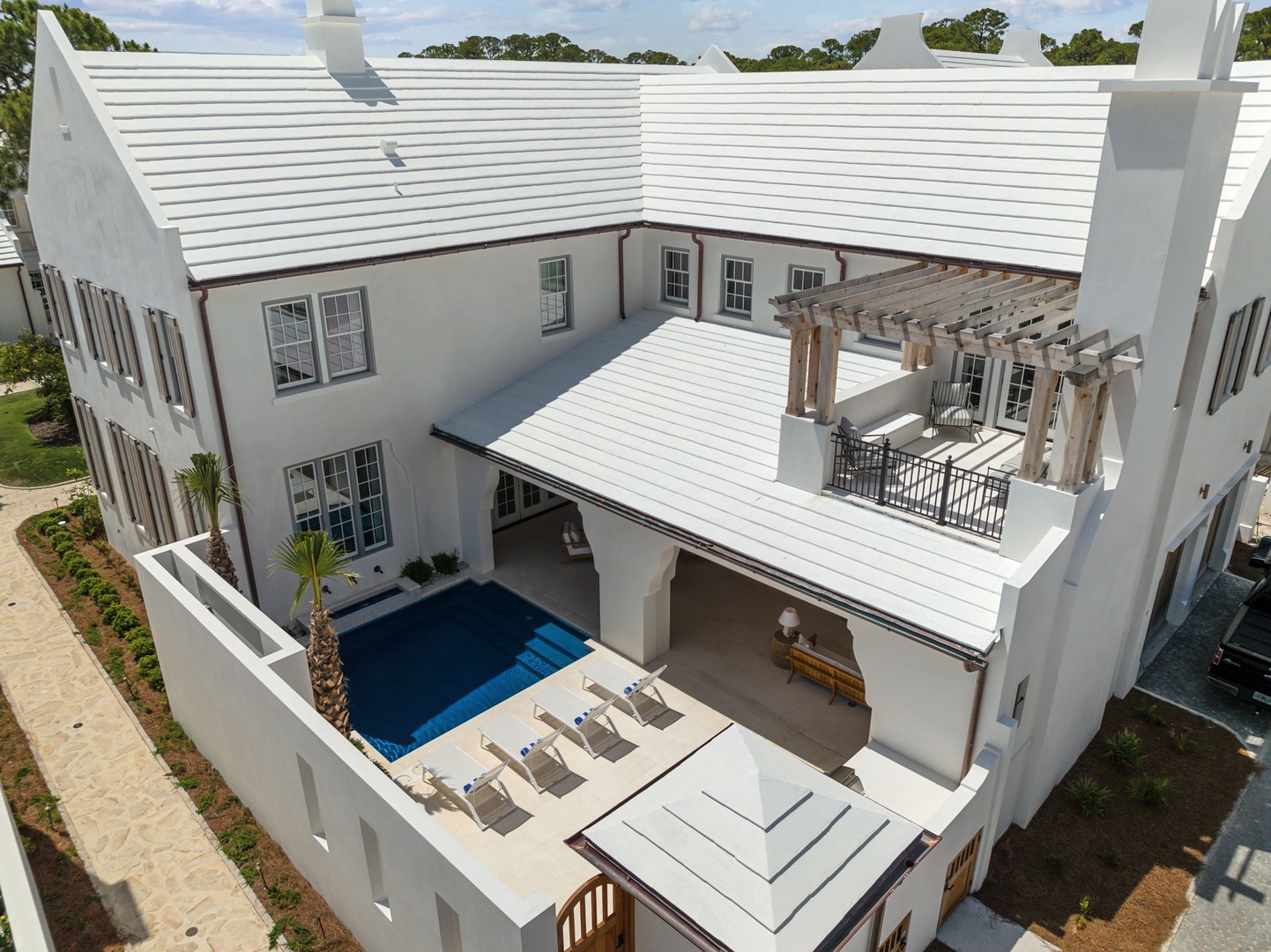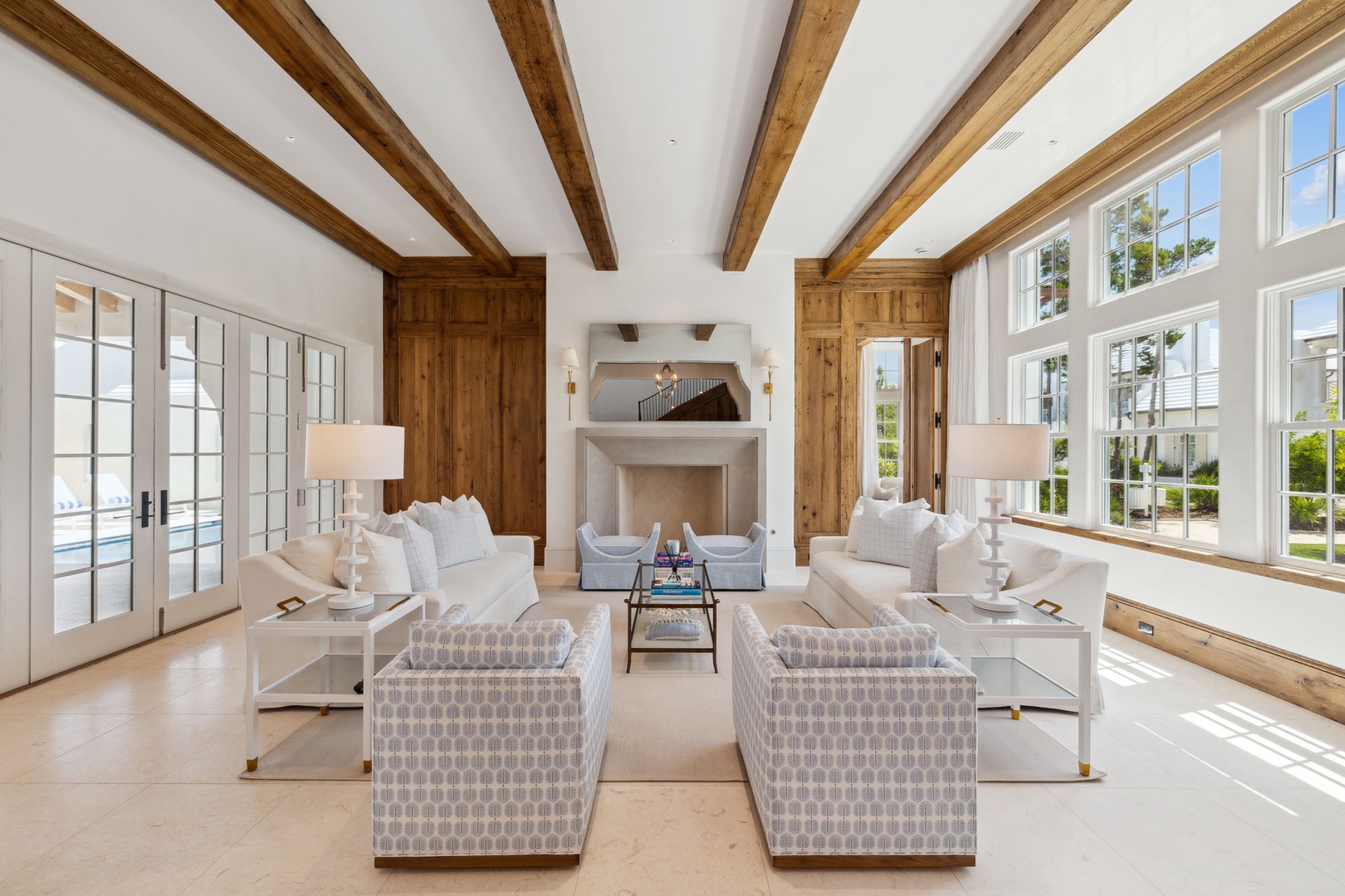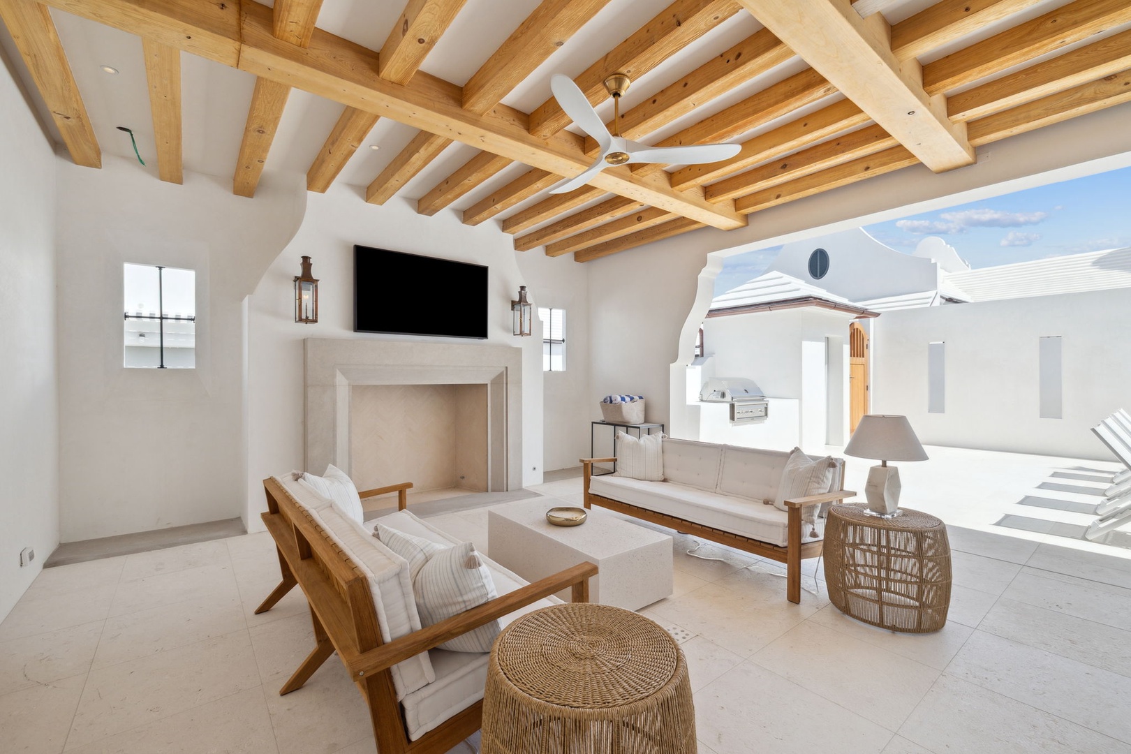 This brand-new vacation rental home was designed to accommodate two families, or a multi-generation visit with grandparents. Located in a quiet park setting on the North Turtle Bale pedestrian path, this home is a short stroll from the Caliza Pool Complex which is open to guests year-round. Offering five bedrooms all with private baths – two of which are master suites with spacious master baths - this grand and spacious home is the perfect fit for any party. Rarely does a vacation rental home offer so much outdoor space. The private pool is one of the largest of any home in Alys Beach. The courtyard offers ample outdoor and covered seating. An outdoor fireplace and television create the perfect place to enjoy many pleasant hours. Inside, the first floor features a large kitchen and dining area. The dining table offers seating for 8 with additional bar seating facing the kitchen. A large foyer leads to a tastefully decorated living room with lots of natural light looking over the pedestrian path and the home’s courtyard. A bedroom with one-king sized bed as well as a powder room are also found on this floor. Ascending the grand staircase, you will find a game table with four chairs at the top of the staircase as well as an additional TV den with a cathedral ceiling. Two bedrooms open from the den, each offering one king-sized bed. Down a separate hall, the fourth bedroom offers two queen-sized beds and the primary suite offers one king-sized bed and a private balcony with seating and a firepit. Parking for this home is in a two-car garage.