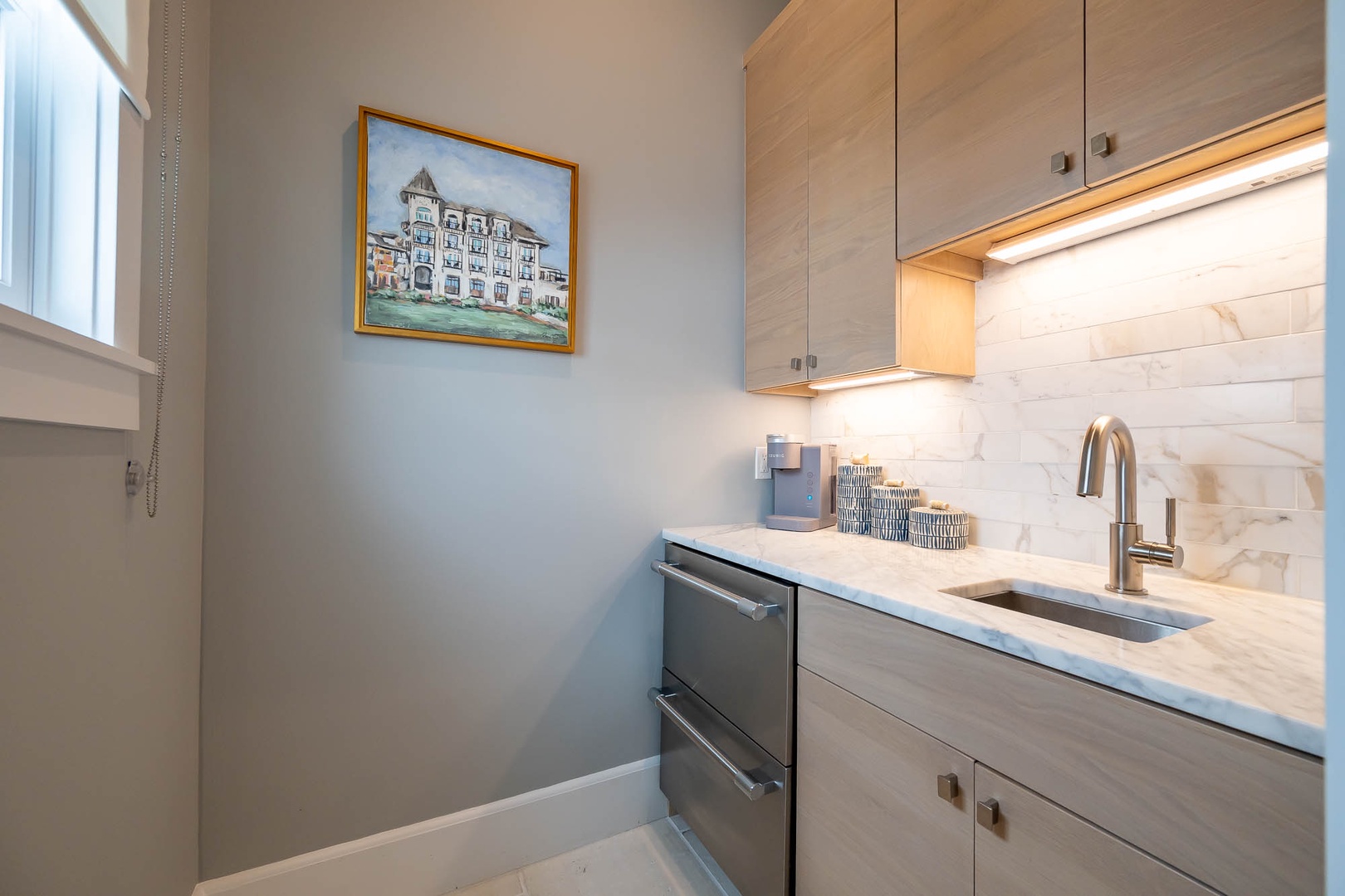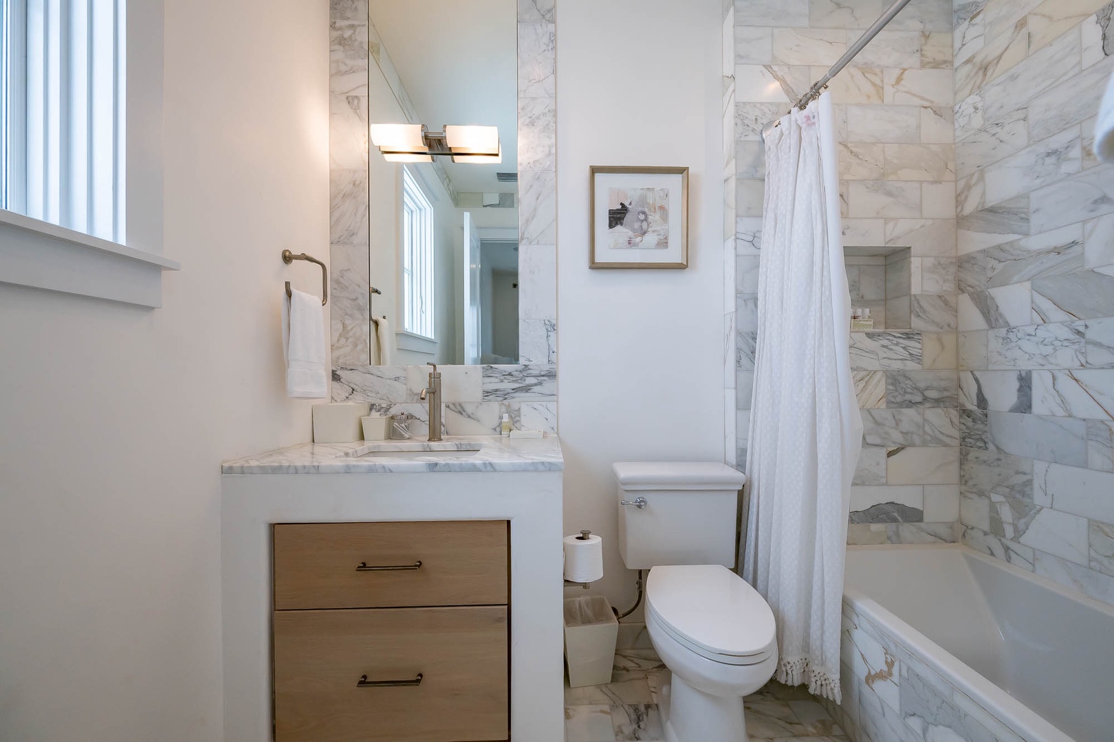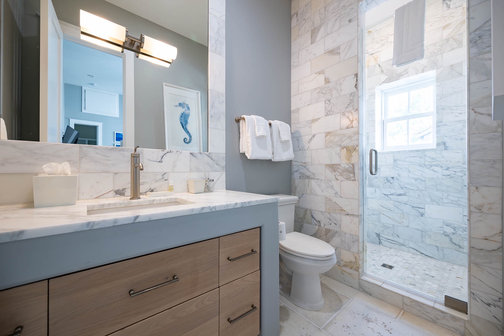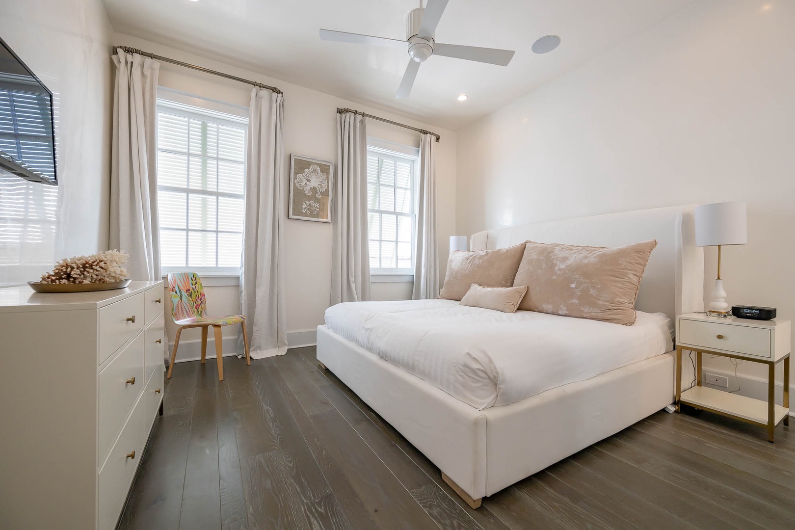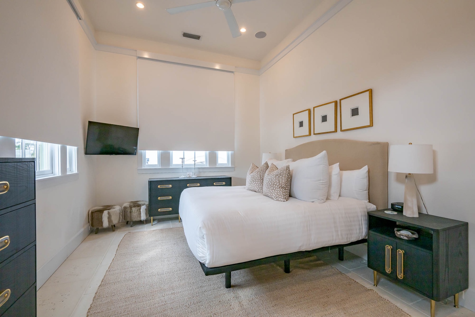 This newly added vacation rental home is located just steps away from ZUMA. The main home offers a first-floor primary bedroom with one king-sized bed including a stackable washer and dryer. The first floor also offers an open concept dining and living room area adjacent to the kitchen. On the second floor you will find two additional bedrooms each with one king-sized bed and en suite bathrooms. There is an additional washer and dryer on this level as well. This home also features a private courtyard with open seating as well as a covered veranda with additional seating and an outdoor TV. The fourth bedroom with one king-sized bed resides in the carriage house above the 2-car garage.
