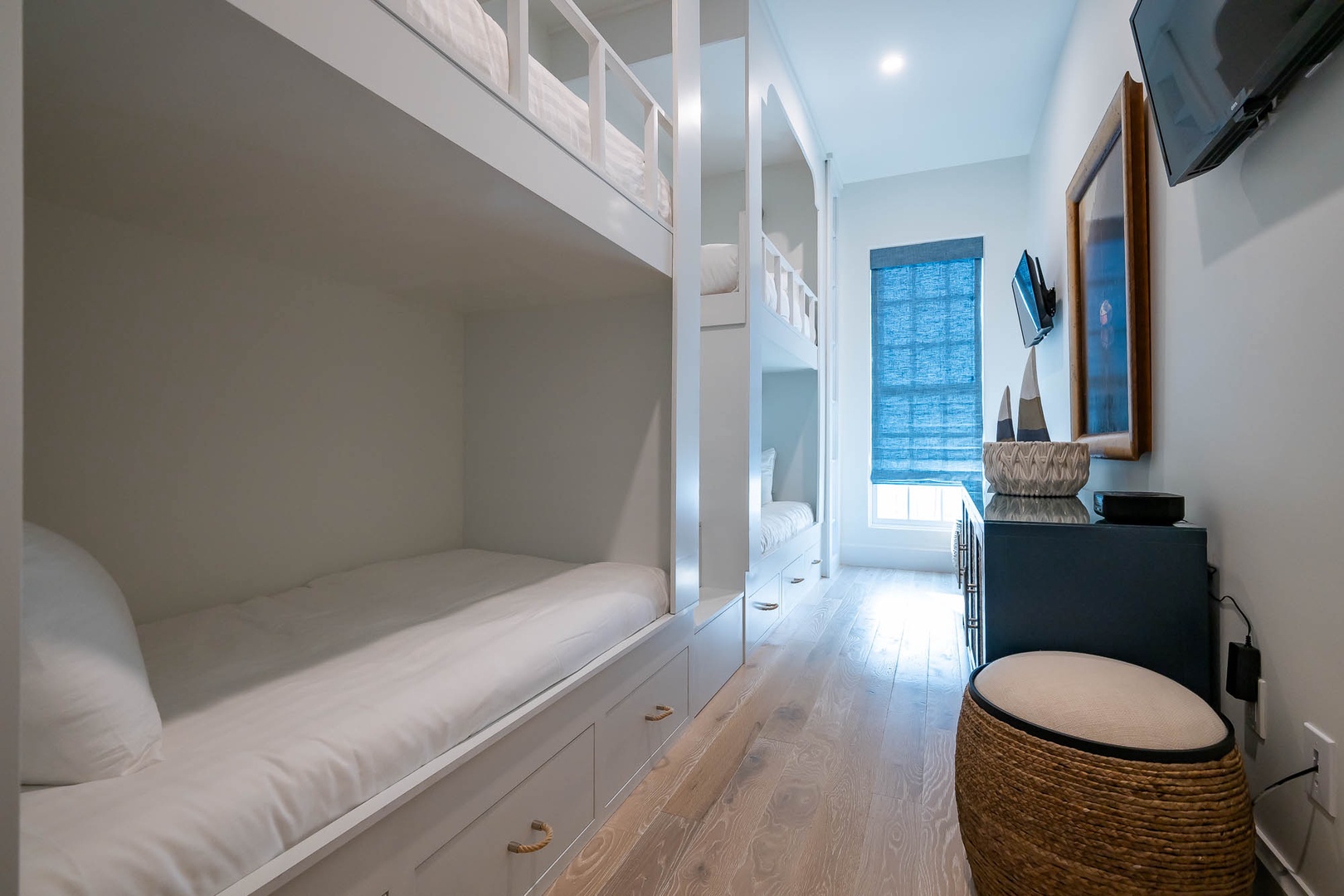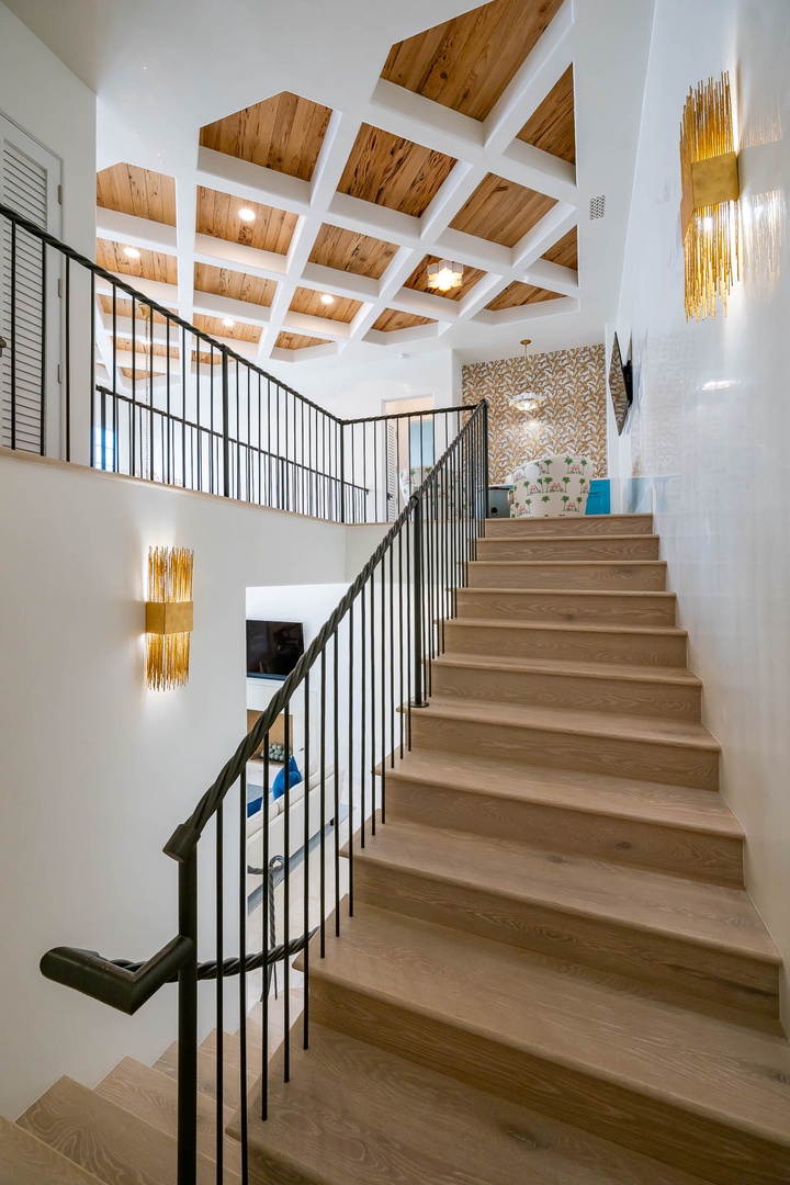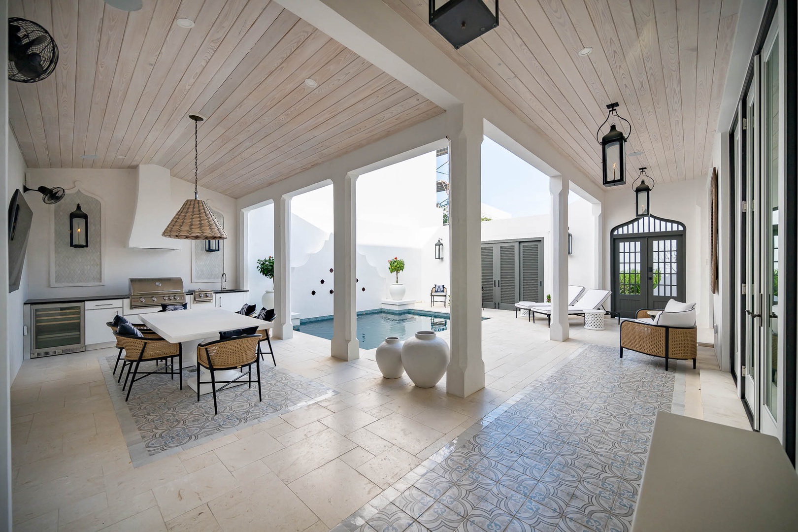 This newly constructed home just across from the Caliza Pool has a large great room with an open concept kitchen with plenty of counter space and a large island. The first floor also offers a double washer and dryer next to the kitchen. You will find the primary bedroom on the first floor with a tub and double walk-in shower, along with a sitting area and TV. The spacious courtyard offers a large, covered dining area with a summer kitchen for perfect outdoor entertainment. The private pool may be heated in cooler weather and offers open seating for taking in the sun. On the second floor, guests will find three king bedrooms with ensuite bathrooms. In addition, there is a bunk room with two sets of upper and lower beds. Parking for this home is a two-car garage.