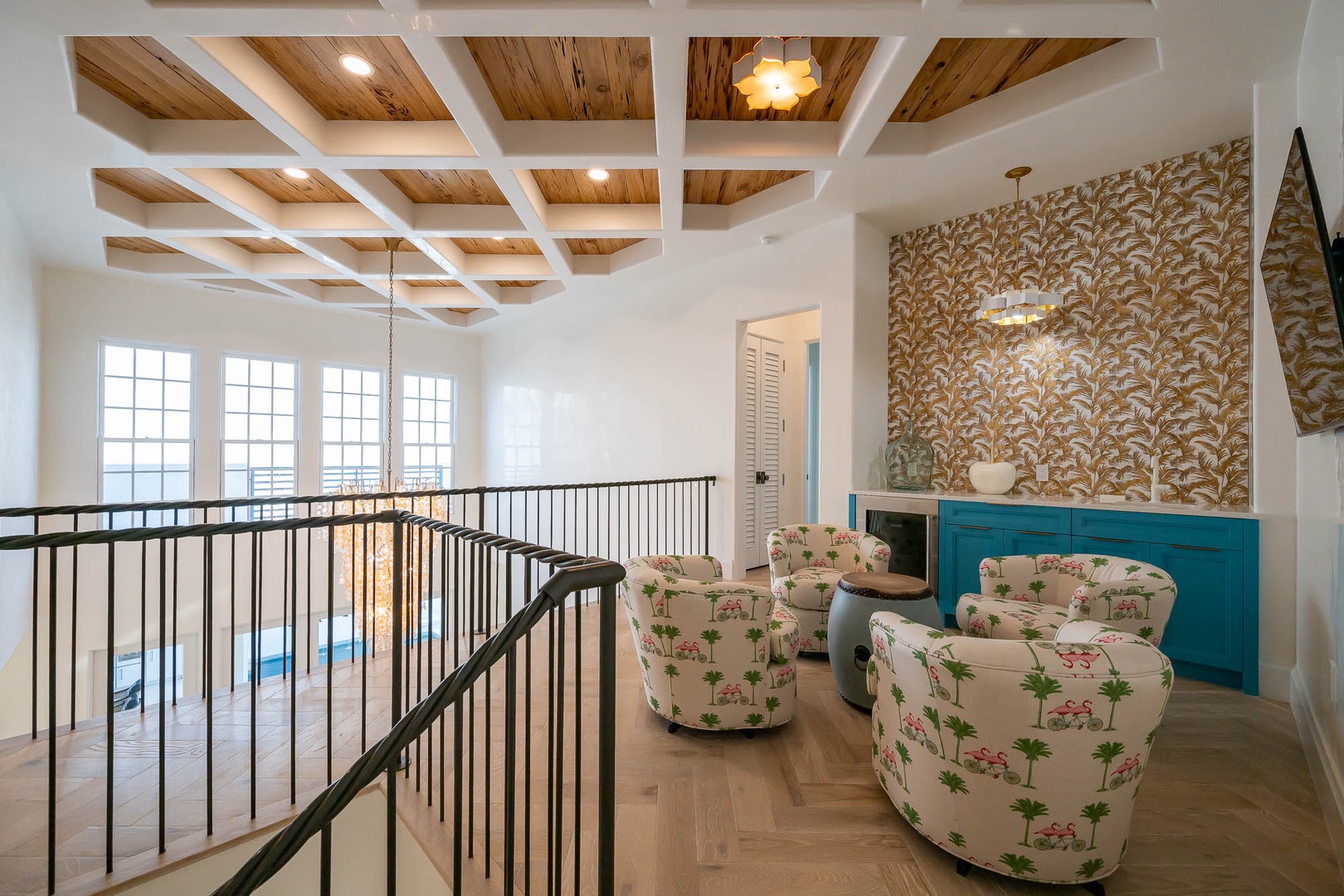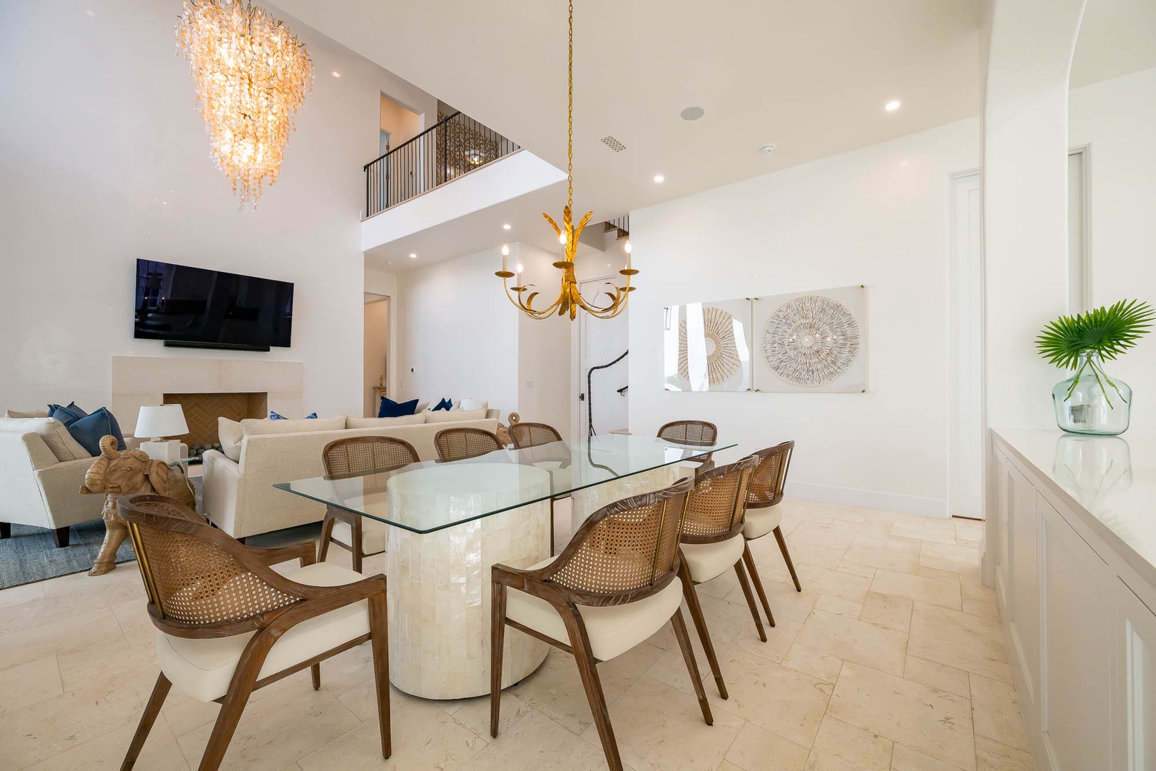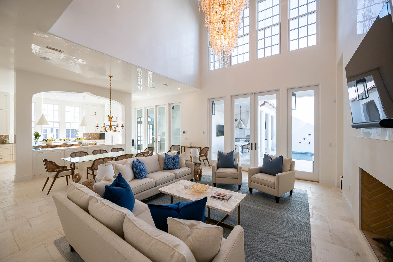 This newly constructed home just across from the Caliza Pool has a large great room with an open concept kitchen with plenty of counter space and a large island. The first floor also offers a double washer and dryer next to the kitchen. You will find the primary bedroom on the first floor with a tub and double walk-in shower, along with a sitting area and TV. The spacious courtyard offers a large, covered dining area with a summer kitchen for perfect outdoor entertainment. The private pool may be heated in cooler weather and offers open seating for taking in the sun. On the second floor, guests will find three king bedrooms with ensuite bathrooms. In addition, there is a bunk room with two sets of upper and lower beds. Parking for this home is a two-car garage.
