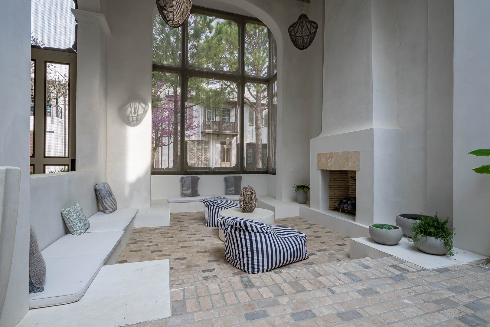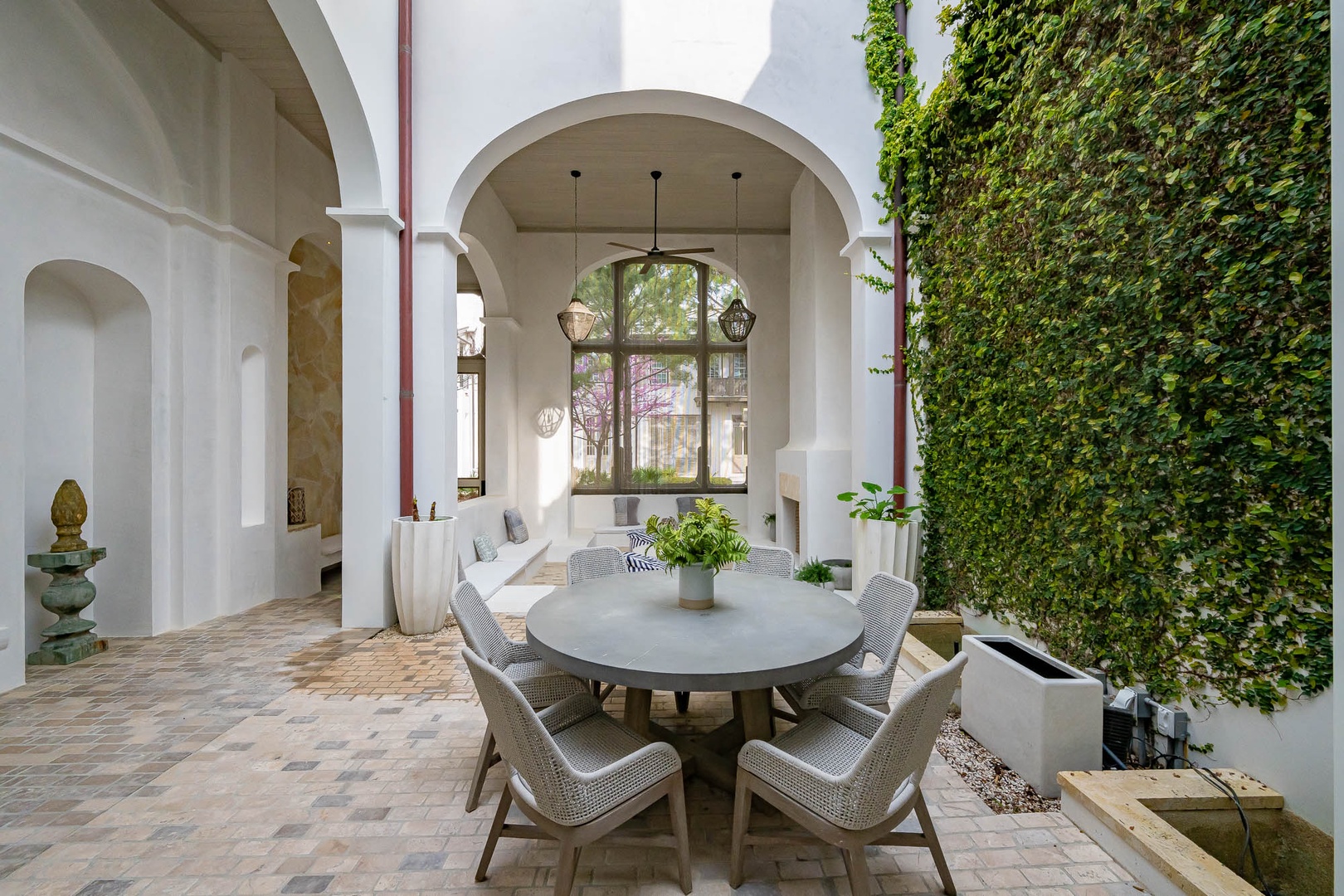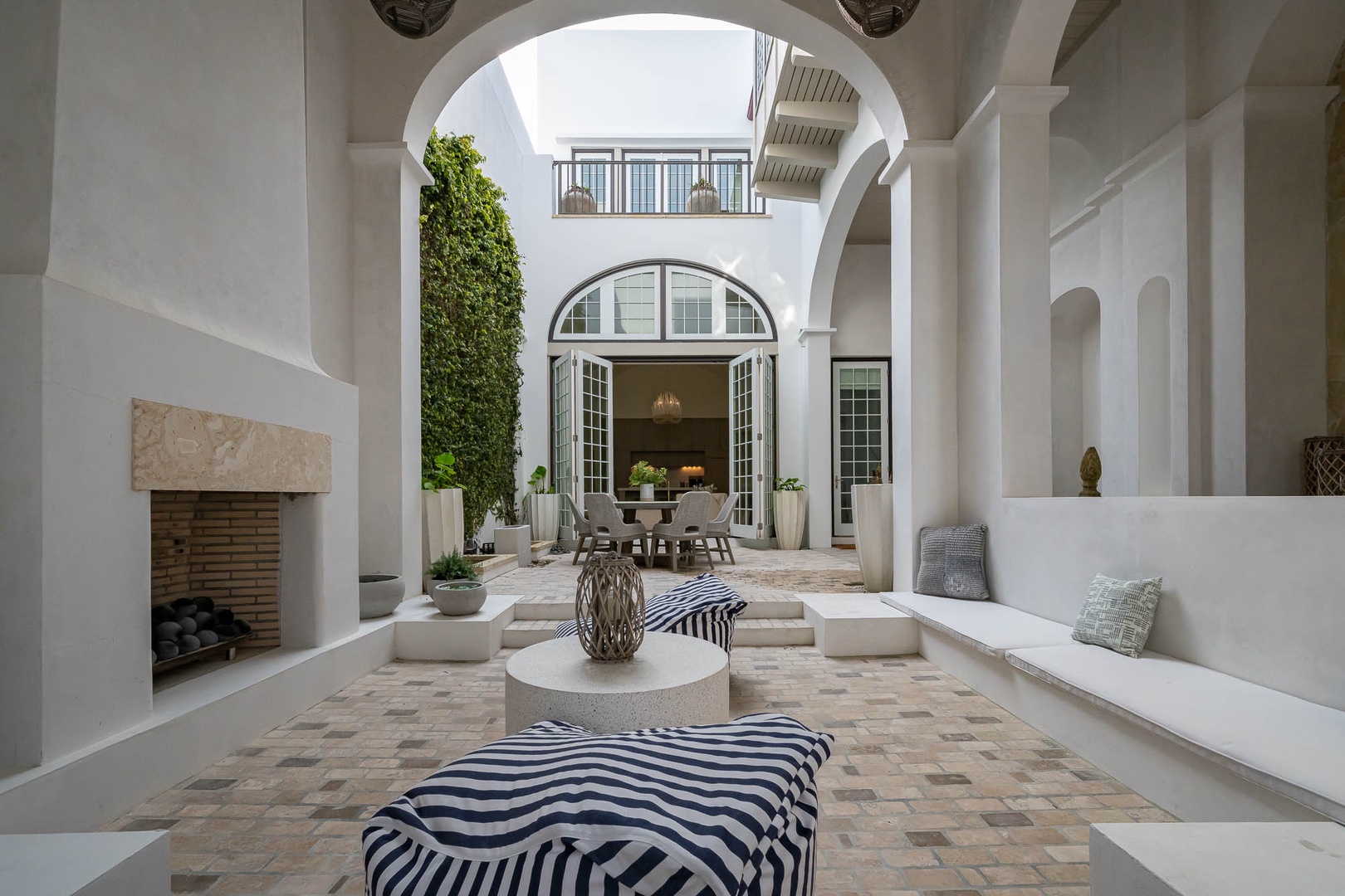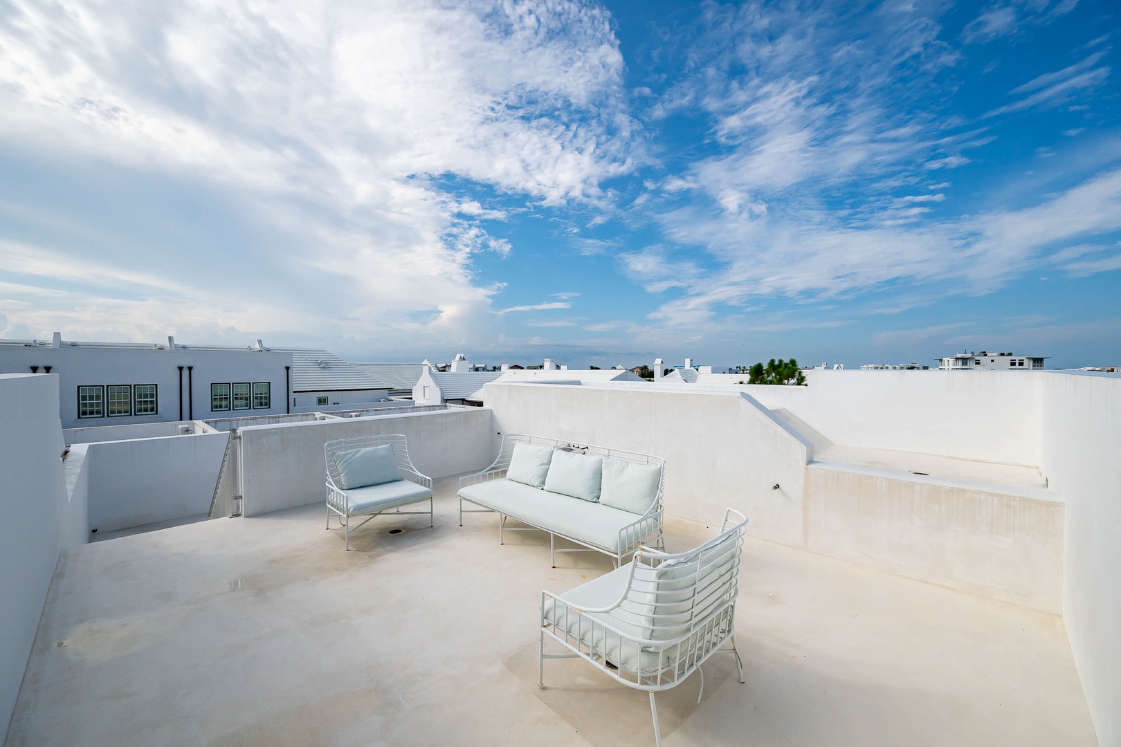 This lovely Alys Beach vacation home overlooks Arboleda Park and features a quiet, serene location. Guests will find a spacious outdoor courtyard with open and covered seating and an outdoor gas fireplace. The first level features the family room, dining area and open kitchen with a large center island as well as a half bath. Upstairs, the primary suite offers a king-sized bed and walk-in shower. A second bedroom offers a king-sized bed, private bath and a balcony overlooking the courtyard. Completing the second floor, guest will find the third bedroom with a queen-sized bed, small balcony overlooking the park and access to the third full bath. A twin-sized bed is located in an alcove of the hallway. Climbing to the third floor, guest will find two different open rooftop patios featuring several seating options for enjoying the sun. The laundry area as well as parking for this home is located in a two-car garage.