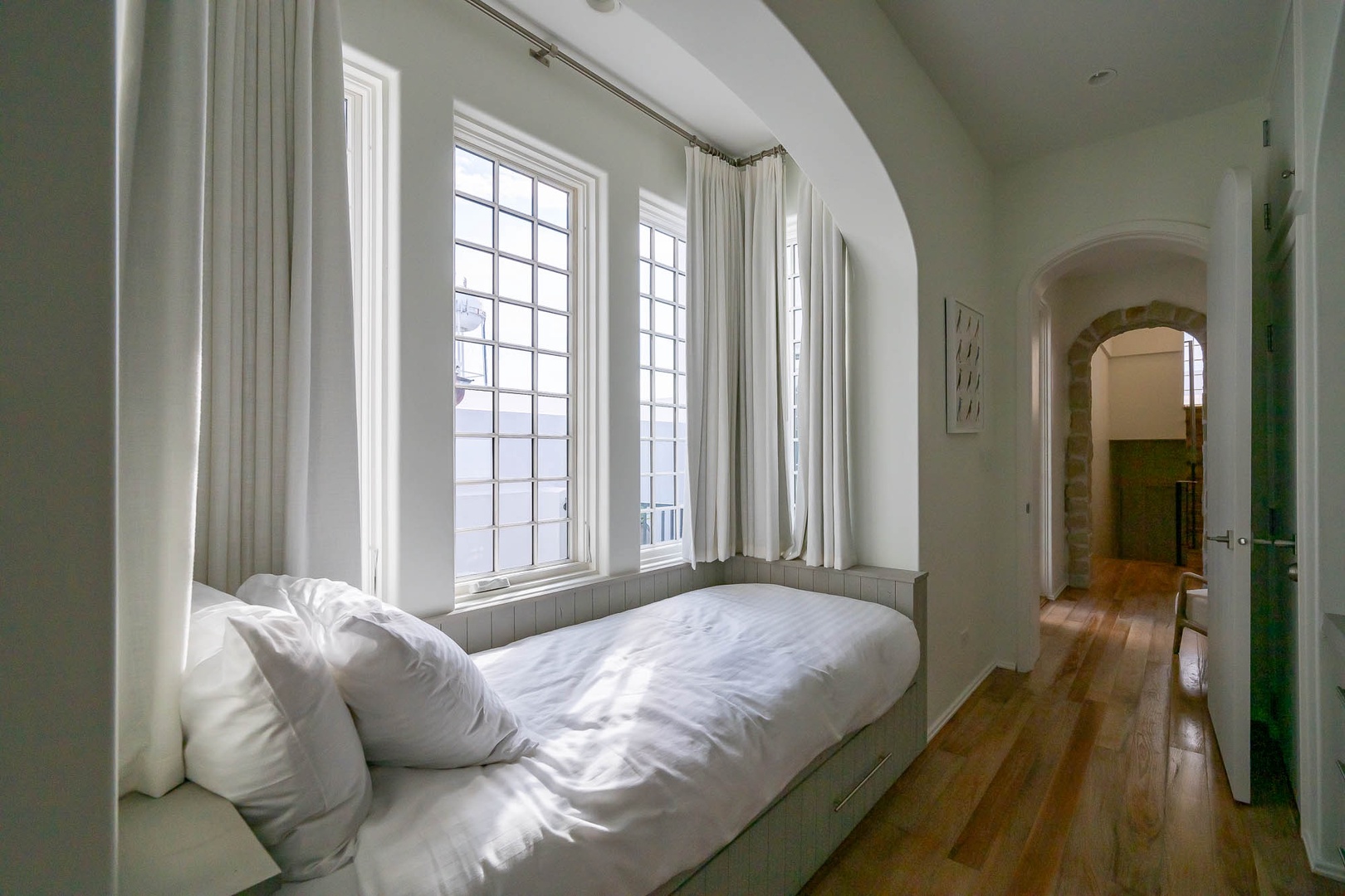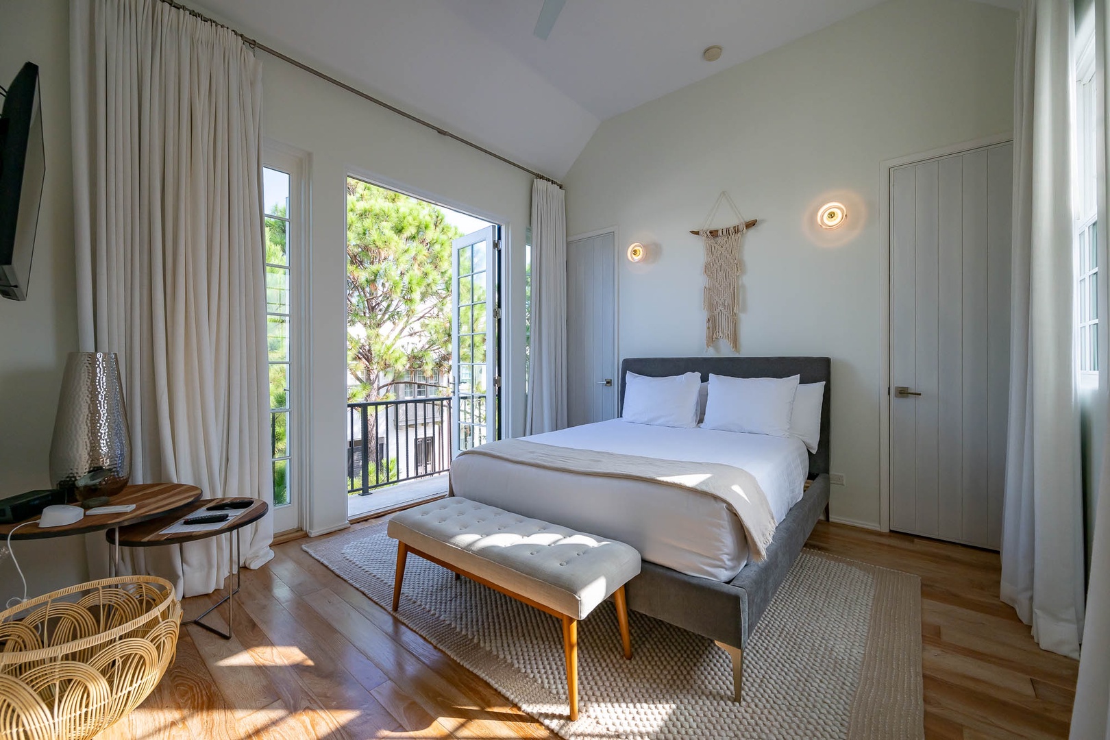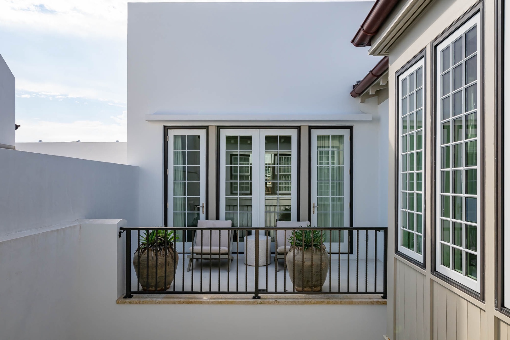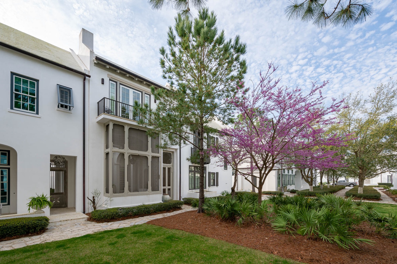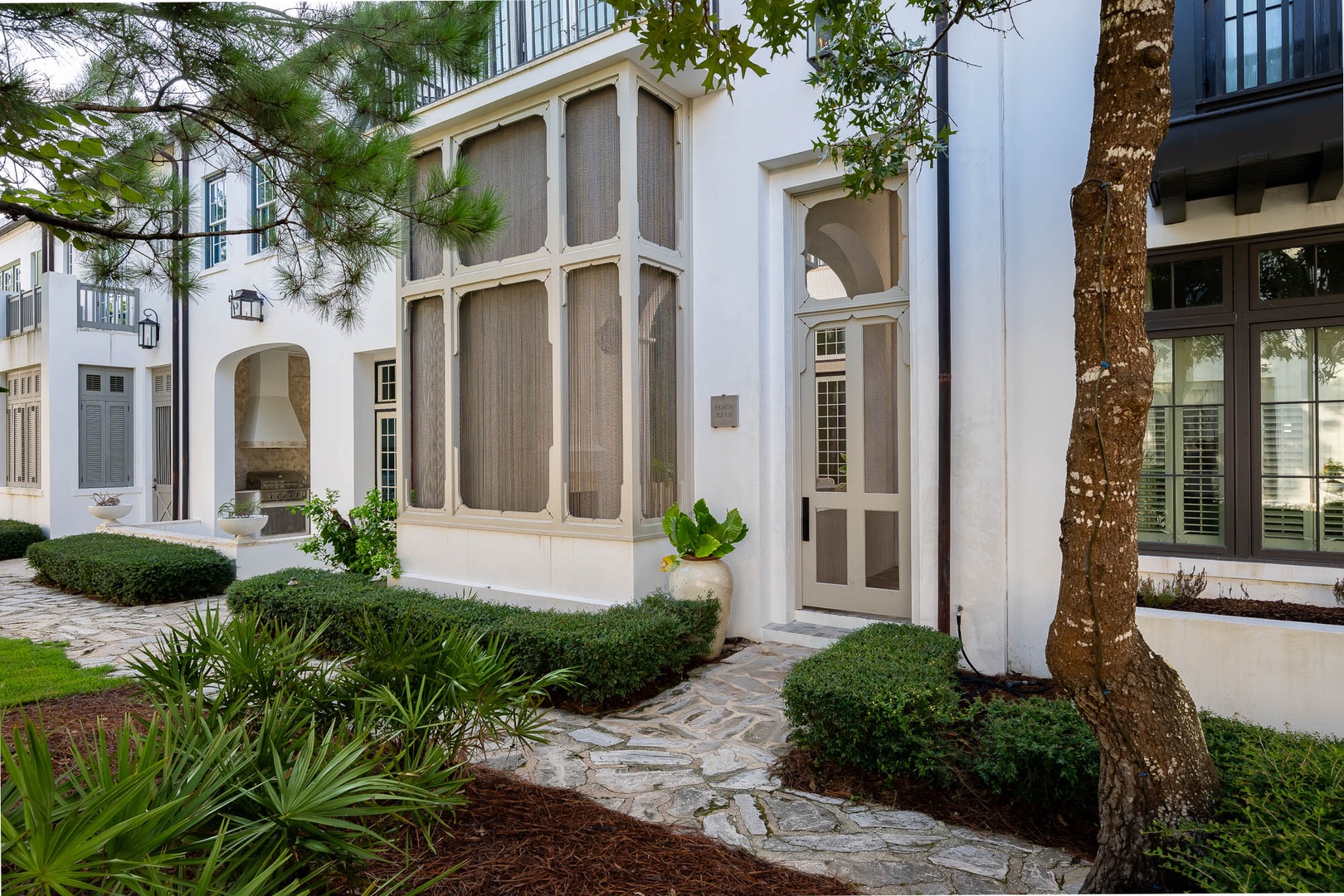 This lovely Alys Beach vacation home overlooks Arboleda Park and features a quiet, serene location. Guests will find a spacious outdoor courtyard with open and covered seating and an outdoor gas fireplace. The first level features the family room, dining area and open kitchen with a large center island as well as a half bath. Upstairs, the primary suite offers a king-sized bed and walk-in shower. A second bedroom offers a king-sized bed, private bath and a balcony overlooking the courtyard. Completing the second floor, guest will find the third bedroom with a queen-sized bed, small balcony overlooking the park and access to the third full bath. A twin-sized bed is located in an alcove of the hallway. Climbing to the third floor, guest will find two different open rooftop patios featuring several seating options for enjoying the sun. The laundry area as well as parking for this home is located in a two-car garage.