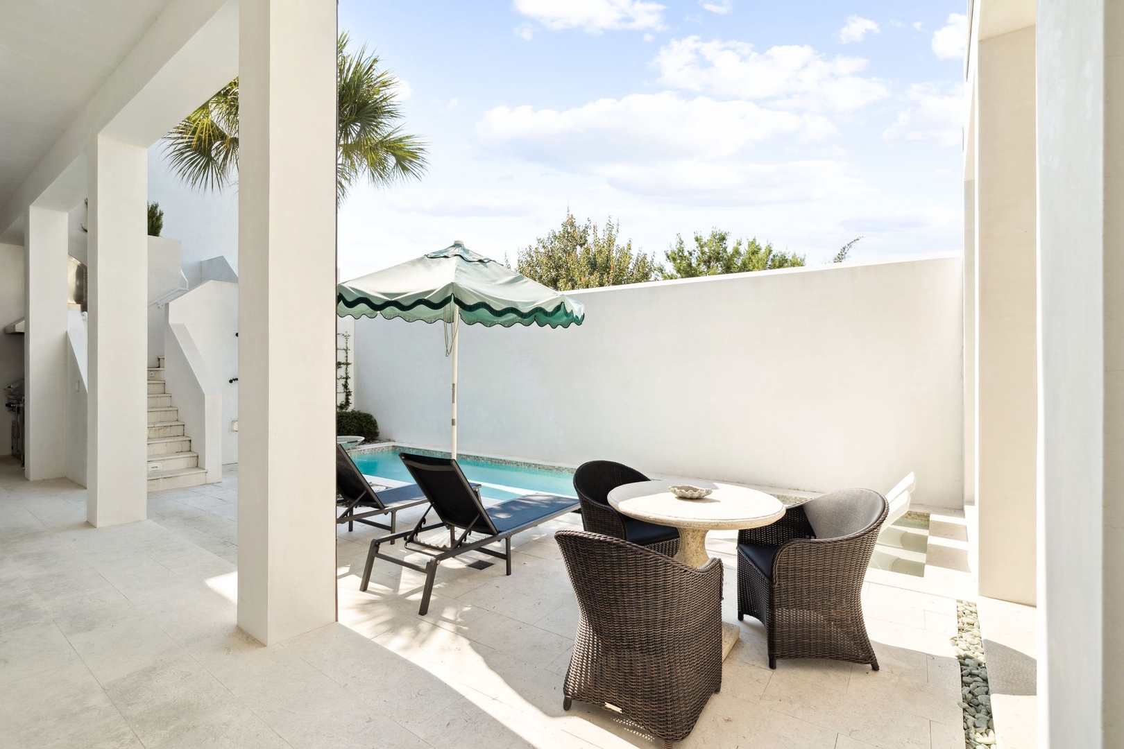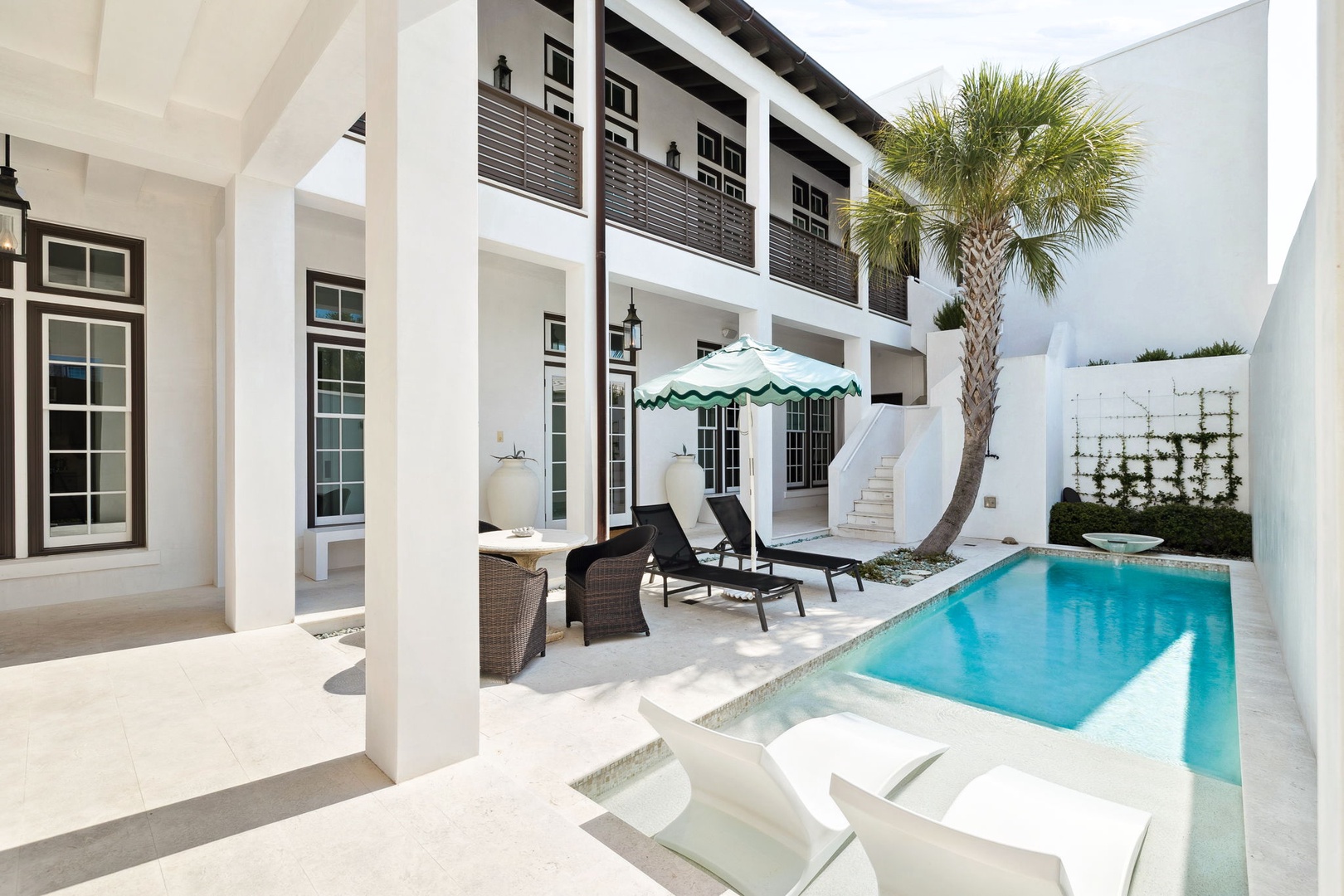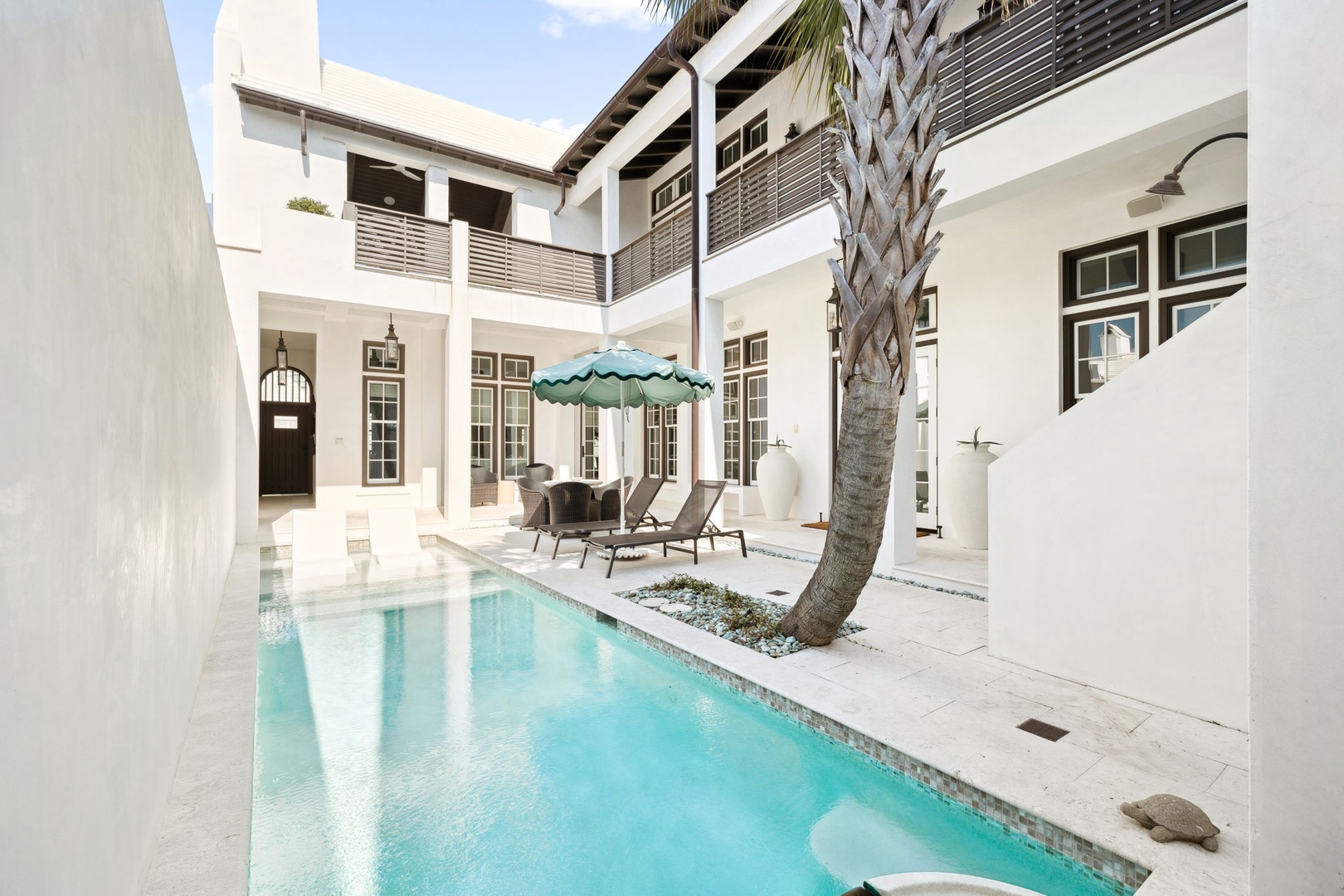 This beautiful vacation rental home occupies a prime location on the North Turtle Bale pedestrian path and equidistant from the Caliza pool complex and the new Silva pool complex (opening March 2026). The home offers three bedrooms, all with private baths. On the first level, guests will find a spacious living room, dining area and kitchen with large center island. A butler’s pantry off of the kitchen offers additional storage and a work space with desk. The first floor also features the laundry room as well as the primary bedroom with one king-sized bed, a spacious closet and bathroom offering both a walk-in shower and soaking tub. The courtyard has a plunge pool, outdoor seating and a built-in grill. On the second floor, you will find a spacious, covered terrace with ample seating overlooking the pedestrian path below. A sink, ice machine, mini fridge and television complete this area. Two additional king bedrooms with private baths complete this level. Parking is available in a two-car garage.