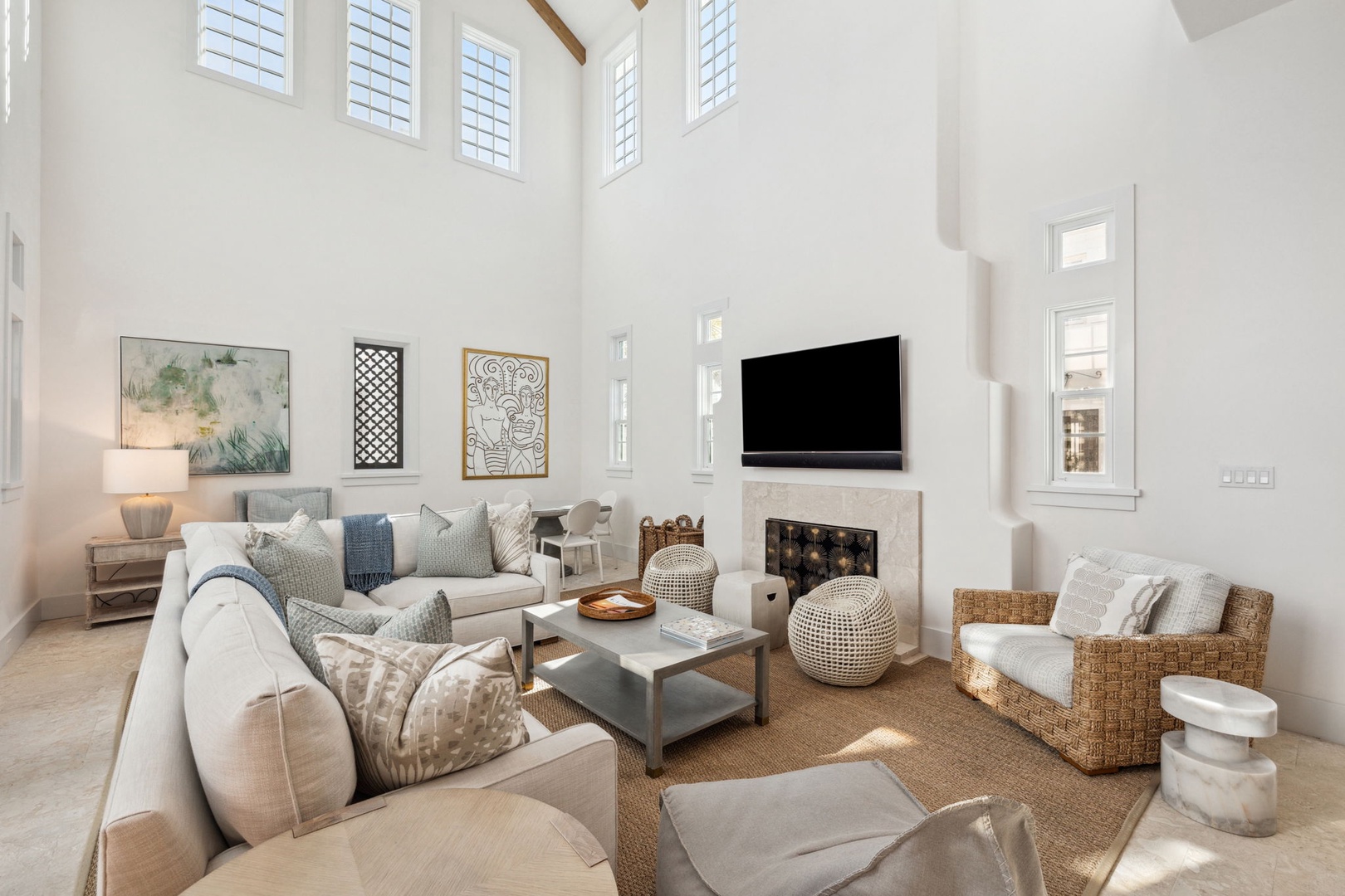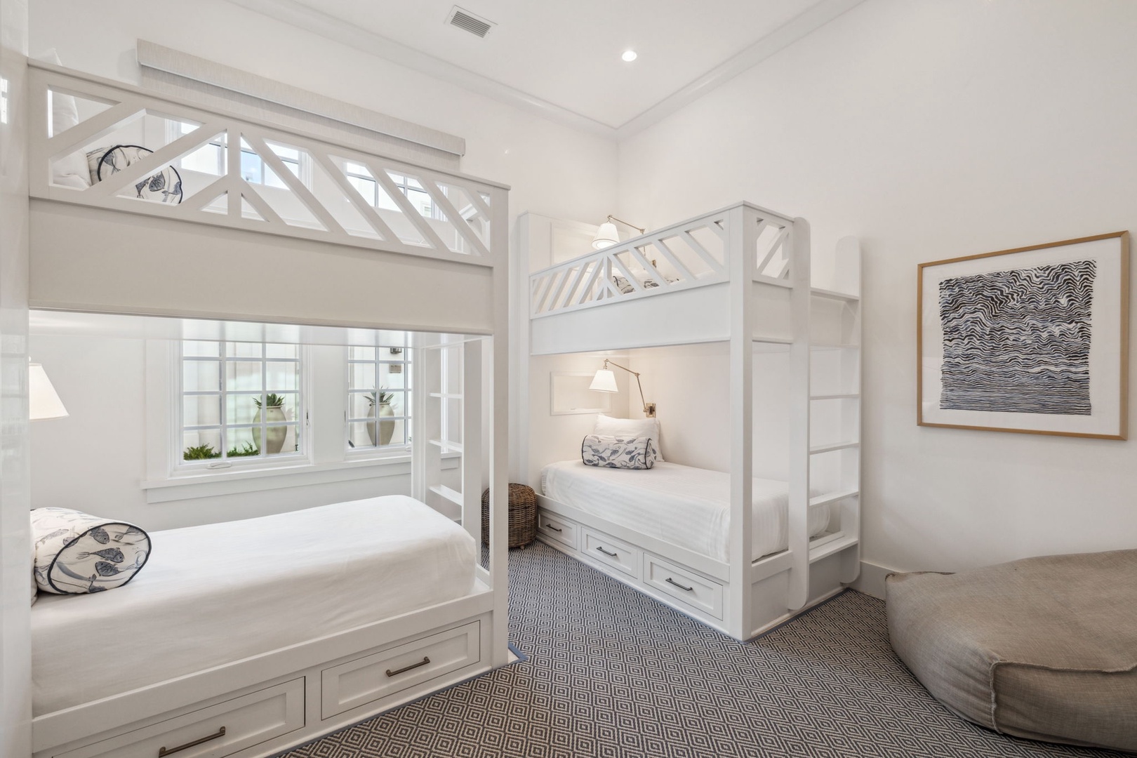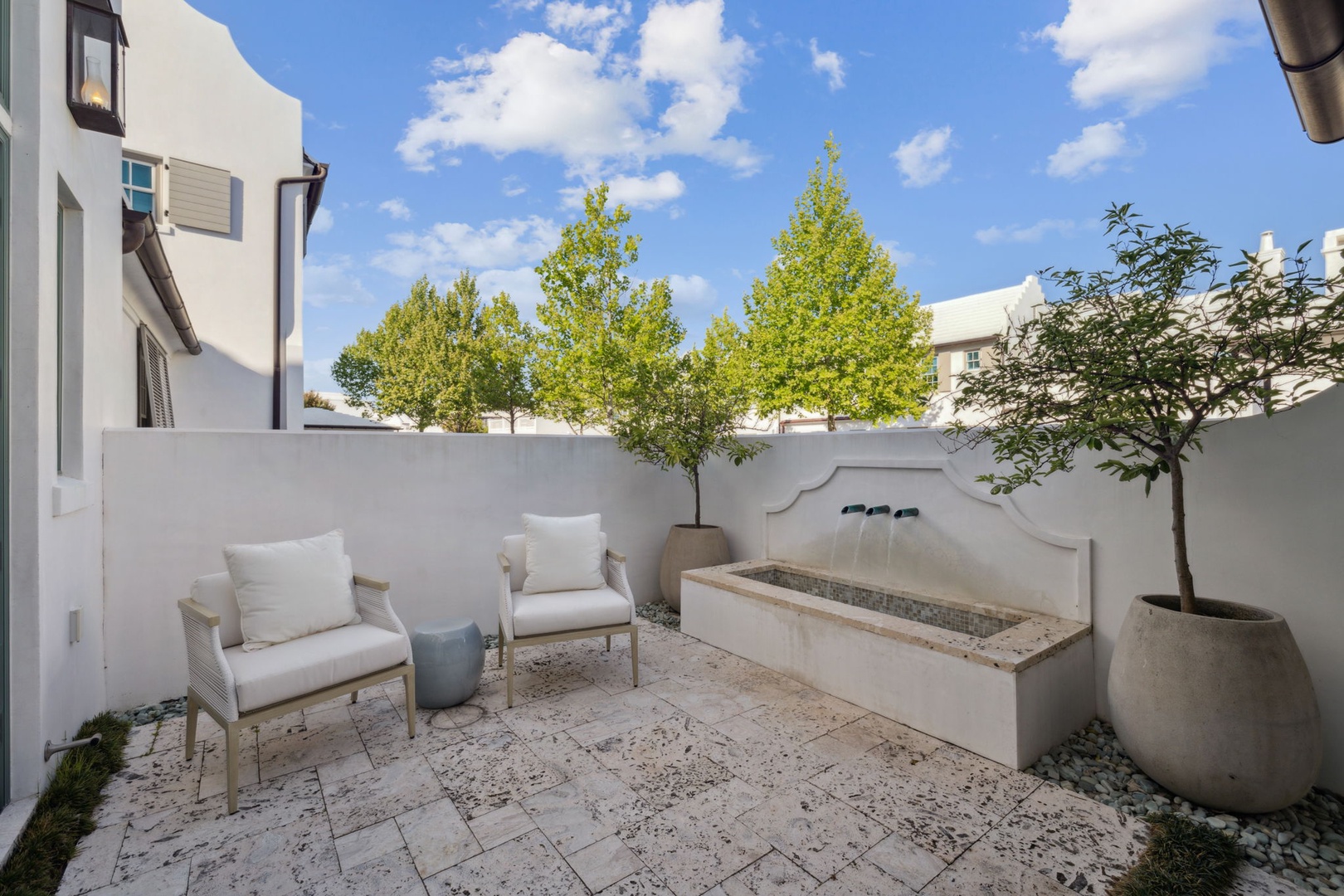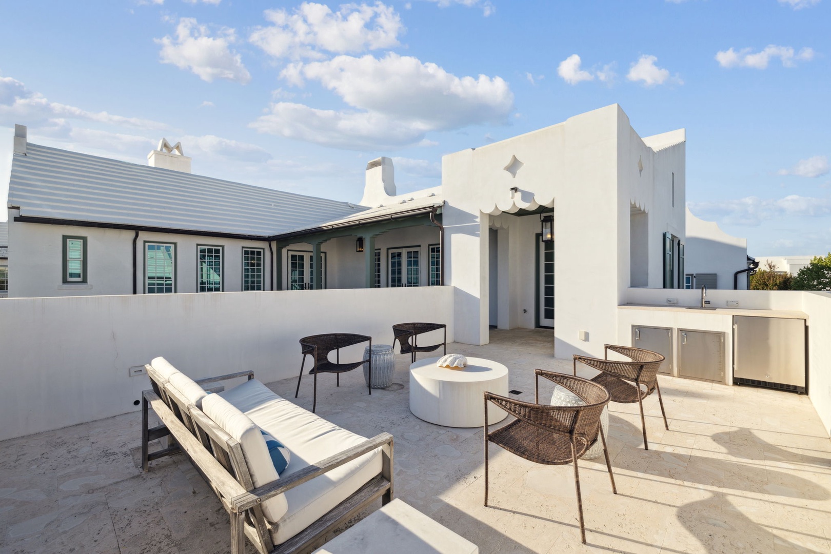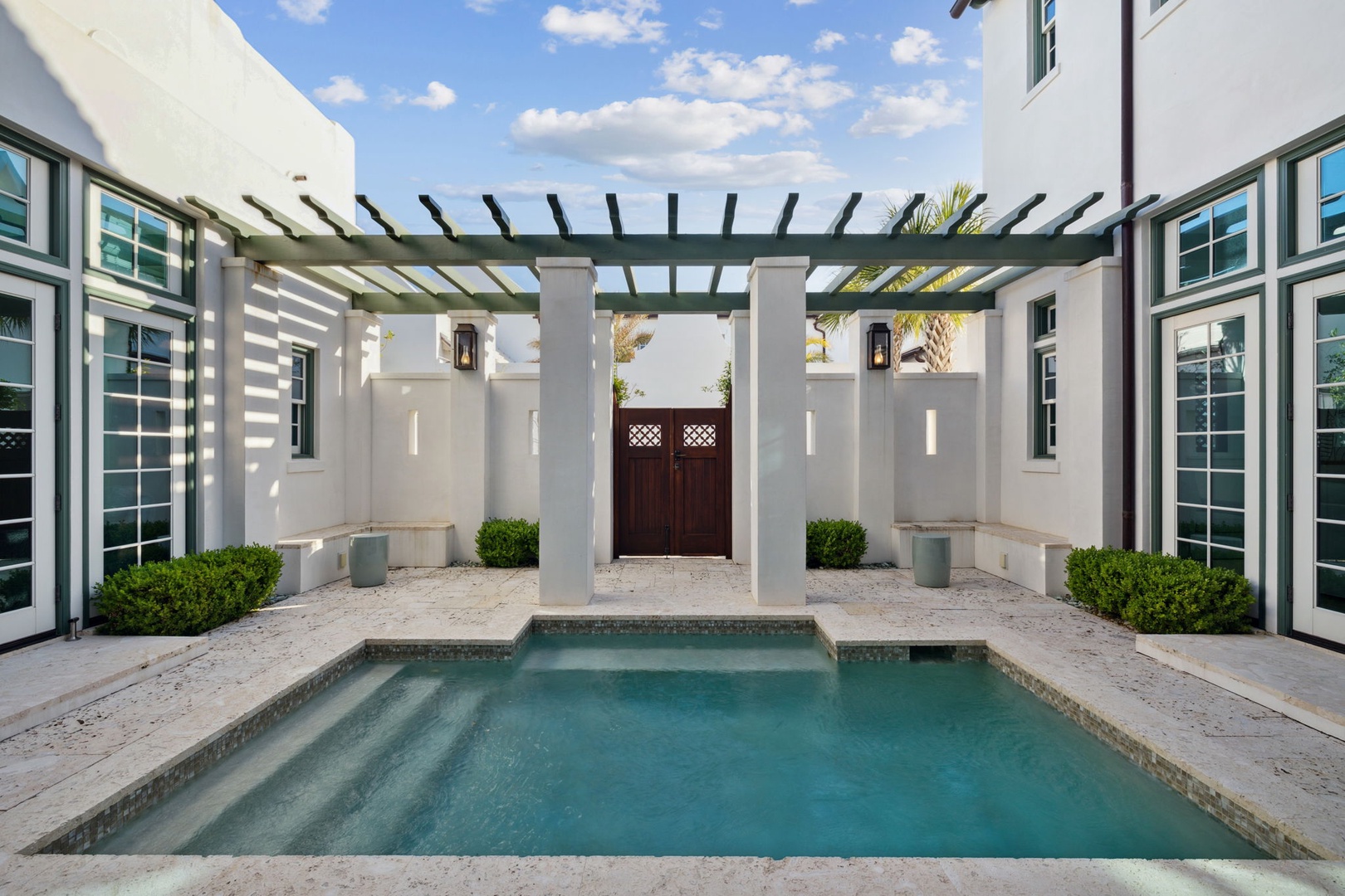 Located directly on the North Turtle Bale pedestrian path, this beautiful and impressive home is a welcome addition to the Alys Beach Rental program. Guests will enjoy four comfortable bedrooms, all with private baths. The first level features a dramatic two-story living room that is spacious with plenty of seating. The 1st floor bedroom offers four bunk beds (2 up, 2 down) with a private bath, just off the living room. The kitchen and dining areas offer plenty of room to gather and seating for ten. Guests will find one more bedroom with a king-sized bed on this level. The home also offers plenty of outdoor space. A private courtyard at the back of the home offers seating next to a fountain and access to a built-in grill. A wetbar with a separate icemaker and two refrigerated drawers supports the grill area for entertaining. The main courtyard with a private pool offers additional covered outdoor seating. Climbing to the second level, guests will find a pleasant sitting area overlooking the main living room. A bedroom with one king-sized bed, the laundry room, as well as the primary suite are found on this level. An expansive balcony runs most of the length of the home to a comfortable outdoor terrace with plenty of outdoor seating. Parking for this home is located in two designated spaces in a parking court behind the home.