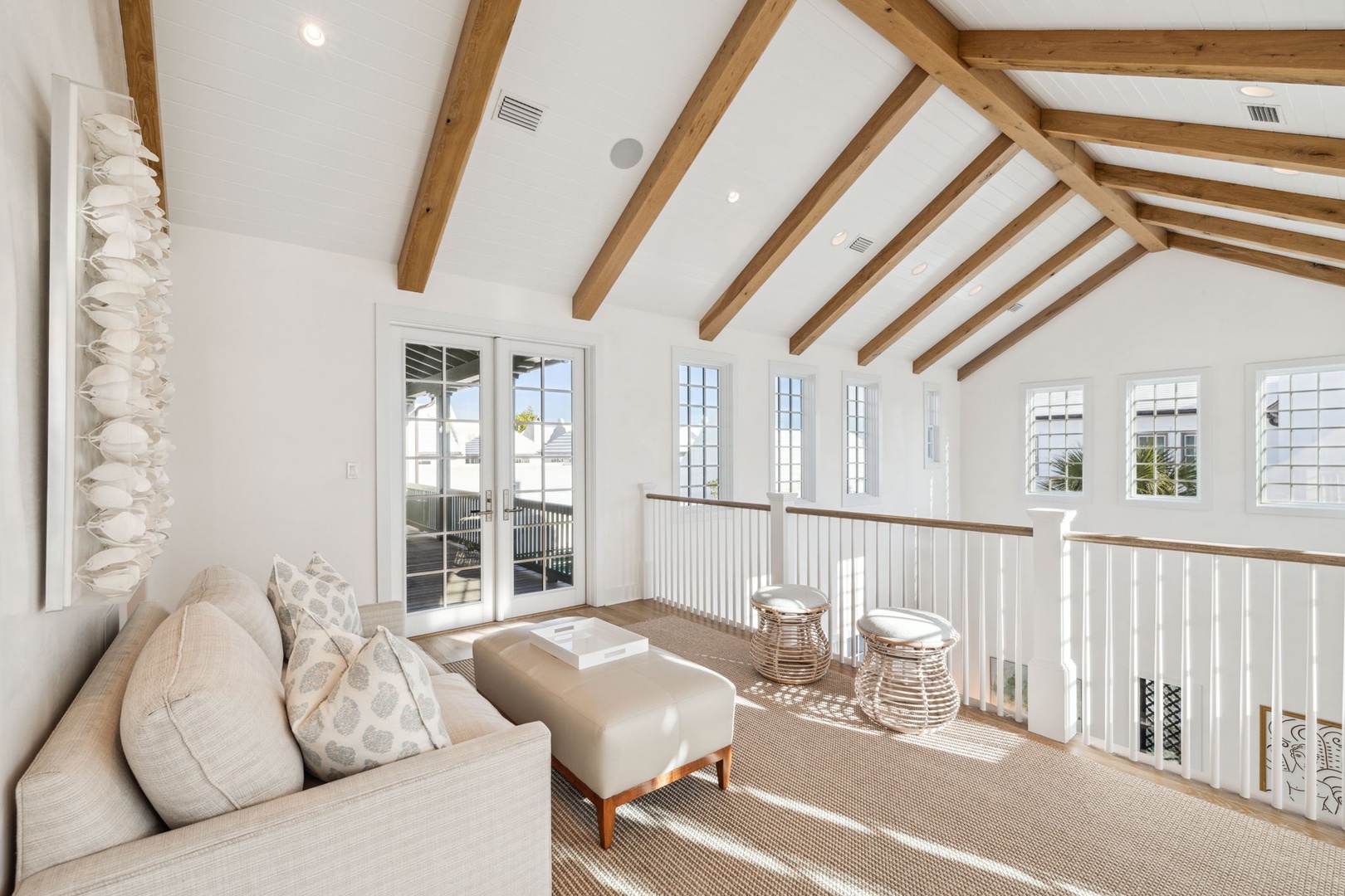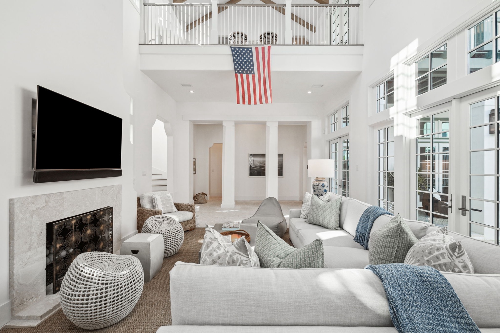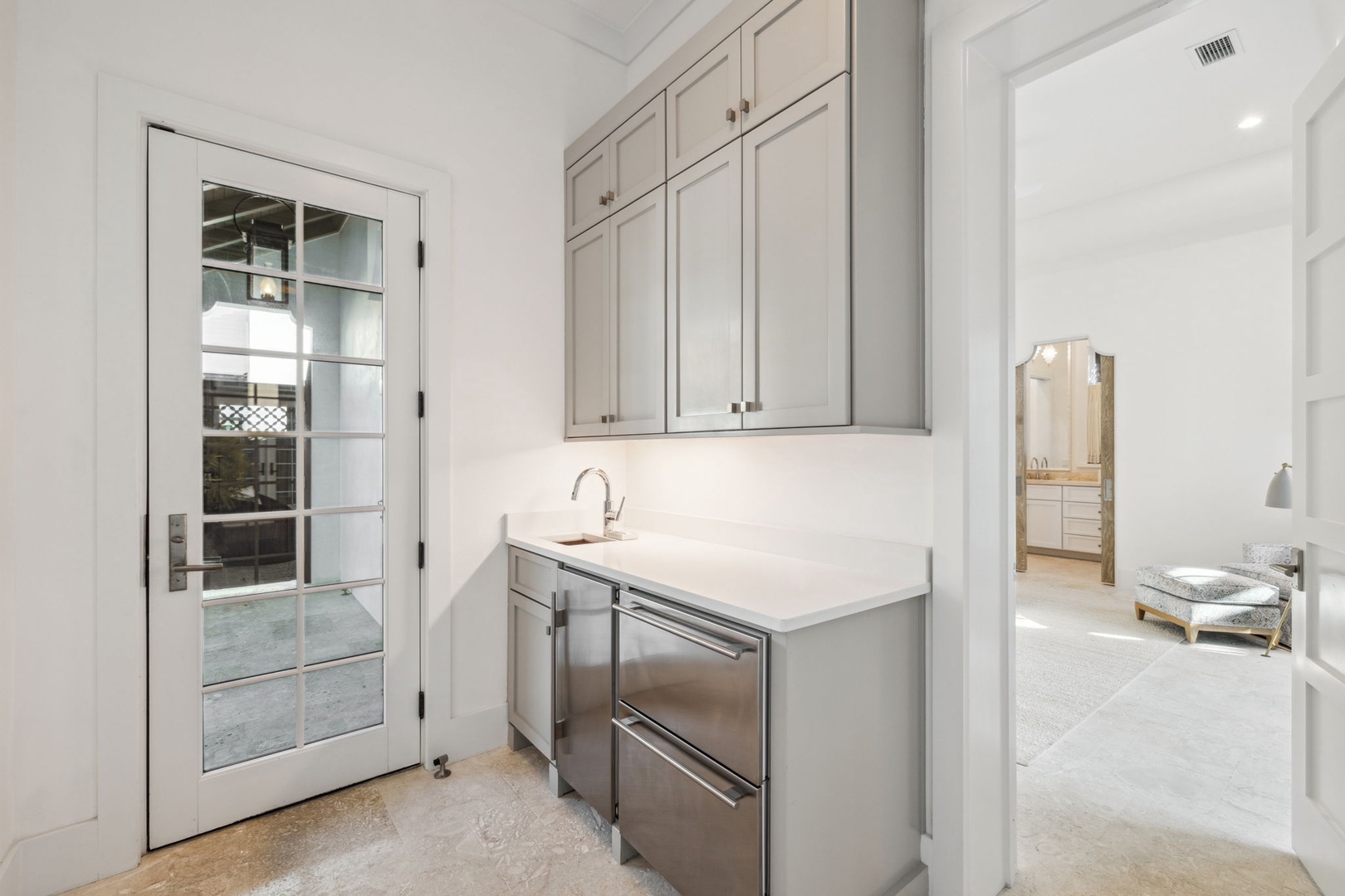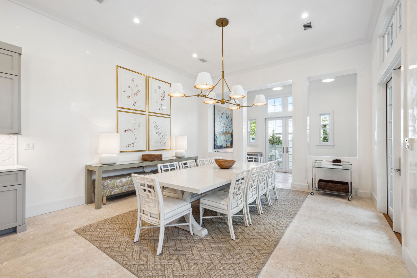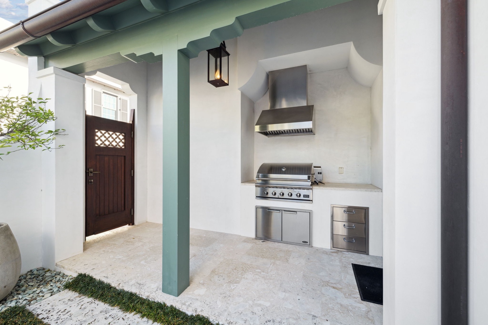 Located directly on the North Turtle Bale pedestrian path, this beautiful and impressive home is a welcome addition to the Alys Beach Rental program. Guests will enjoy four comfortable bedrooms, all with private baths. The first level features a dramatic two-story living room that is spacious with plenty of seating. The 1st floor bedroom offers four bunk beds (2 up, 2 down) with a private bath, just off the living room. The kitchen and dining areas offer plenty of room to gather and seating for ten. Guests will find one more bedroom with a king-sized bed on this level. The home also offers plenty of outdoor space. A private courtyard at the back of the home offers seating next to a fountain and access to a built-in grill. A wetbar with a separate icemaker and two refrigerated drawers supports the grill area for entertaining. The main courtyard with a private pool offers additional covered outdoor seating. Climbing to the second level, guests will find a pleasant sitting area overlooking the main living room. A bedroom with one king-sized bed, the laundry room, as well as the primary suite are found on this level. An expansive balcony runs most of the length of the home to a comfortable outdoor terrace with plenty of outdoor seating. Parking for this home is located in two designated spaces in a parking court behind the home.