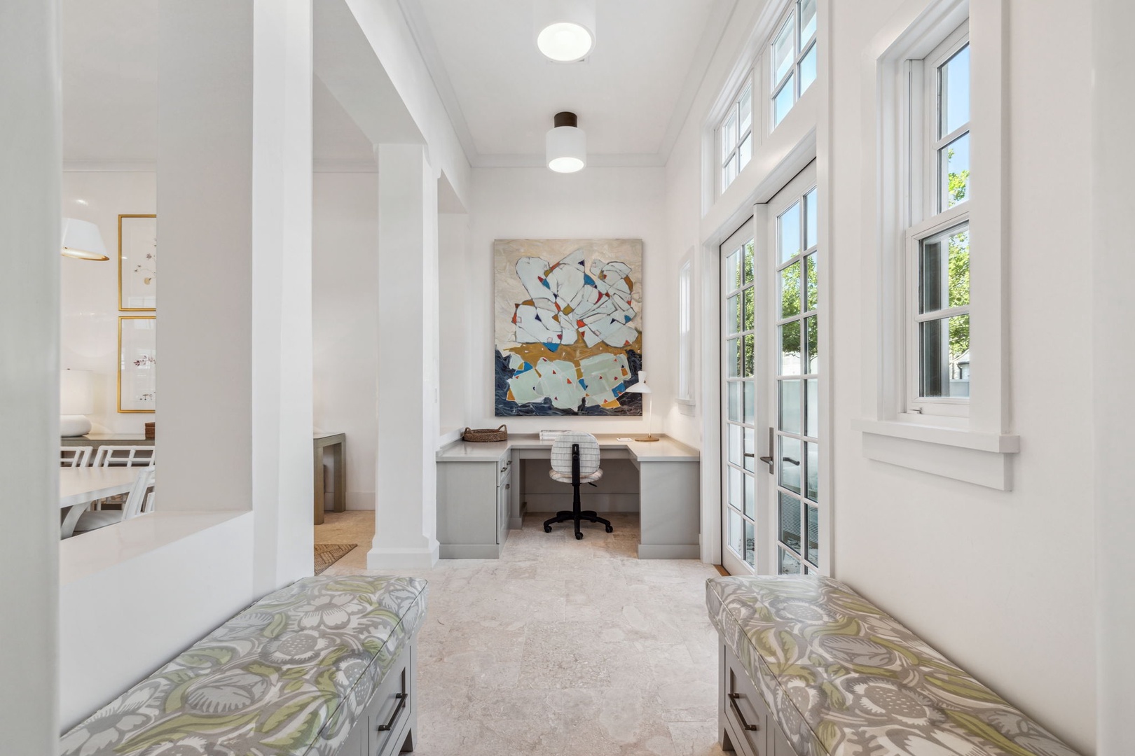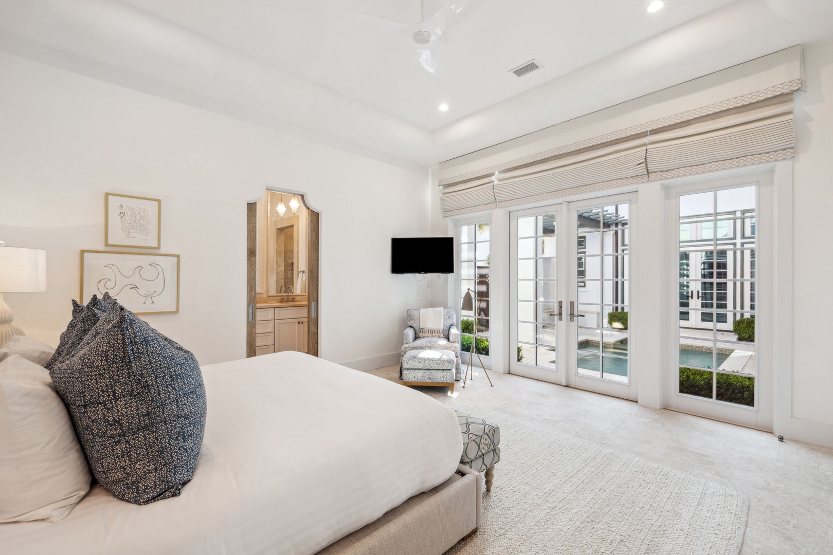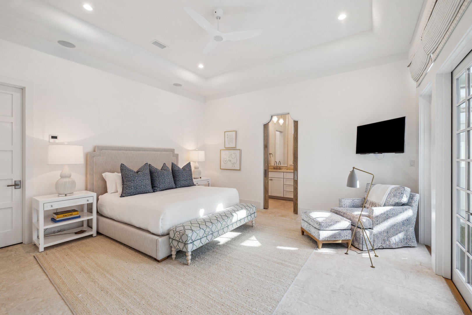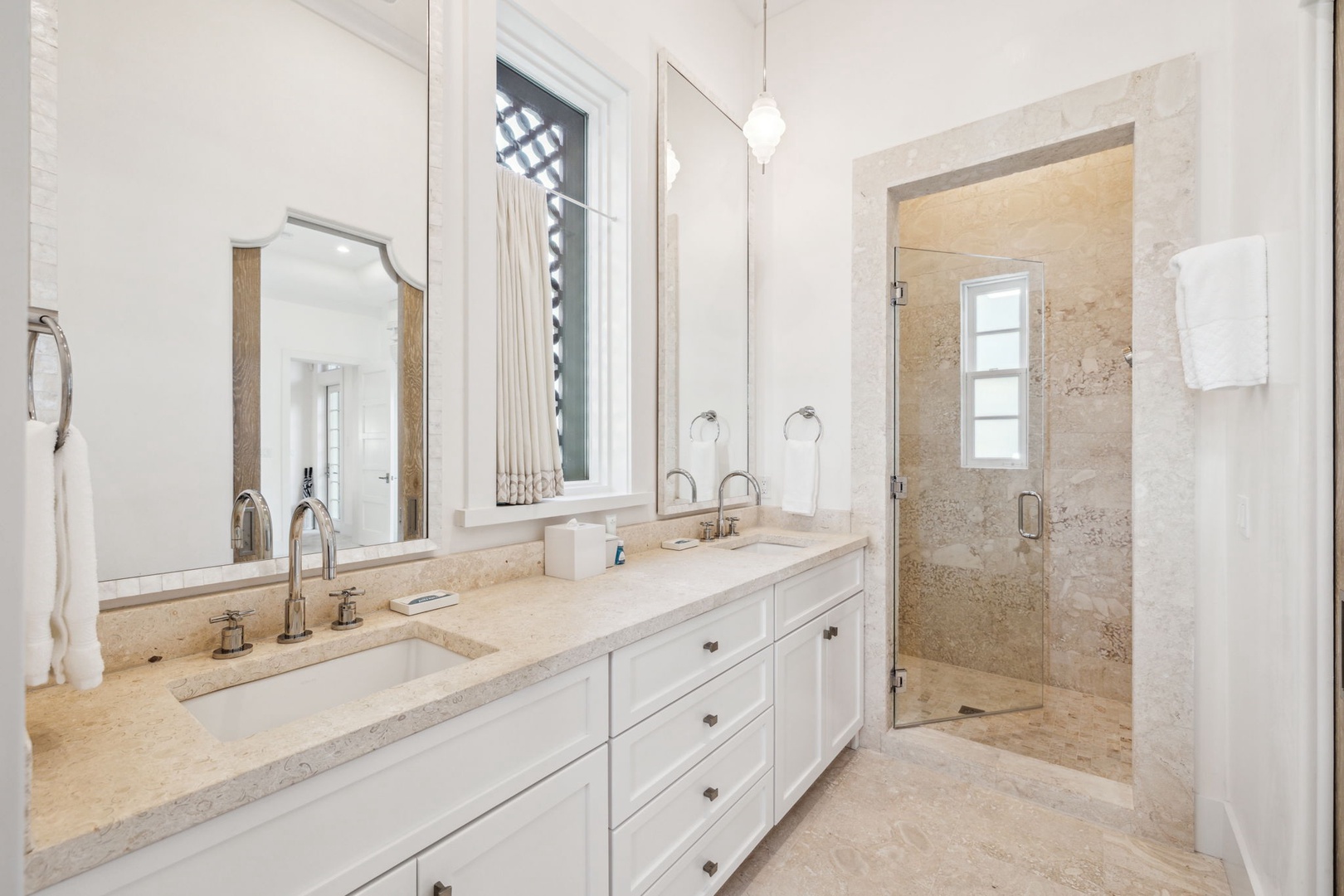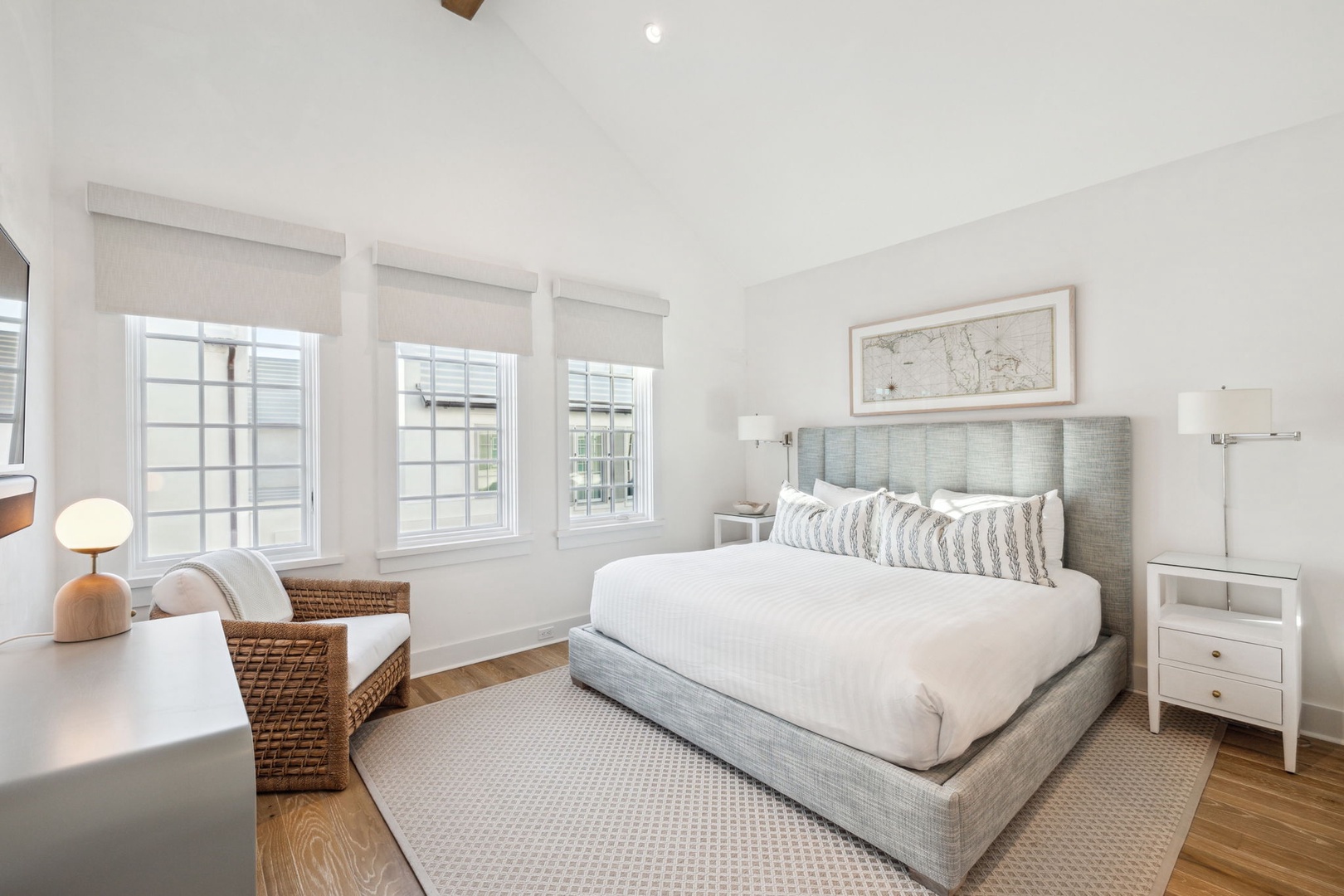 Located directly on the North Turtle Bale pedestrian path, this beautiful and impressive home is a welcome addition to the Alys Beach Rental program. Guests will enjoy four comfortable bedrooms, all with private baths. The first level features a dramatic two-story living room that is spacious with plenty of seating. The 1st floor bedroom offers four bunk beds (2 up, 2 down) with a private bath, just off the living room. The kitchen and dining areas offer plenty of room to gather and seating for ten. Guests will find one more bedroom with a king-sized bed on this level. The home also offers plenty of outdoor space. A private courtyard at the back of the home offers seating next to a fountain and access to a built-in grill. A wetbar with a separate icemaker and two refrigerated drawers supports the grill area for entertaining. The main courtyard with a private pool offers additional covered outdoor seating. Climbing to the second level, guests will find a pleasant sitting area overlooking the main living room. A bedroom with one king-sized bed, the laundry room, as well as the primary suite are found on this level. An expansive balcony runs most of the length of the home to a comfortable outdoor terrace with plenty of outdoor seating. Parking for this home is located in two designated spaces in a parking court behind the home.