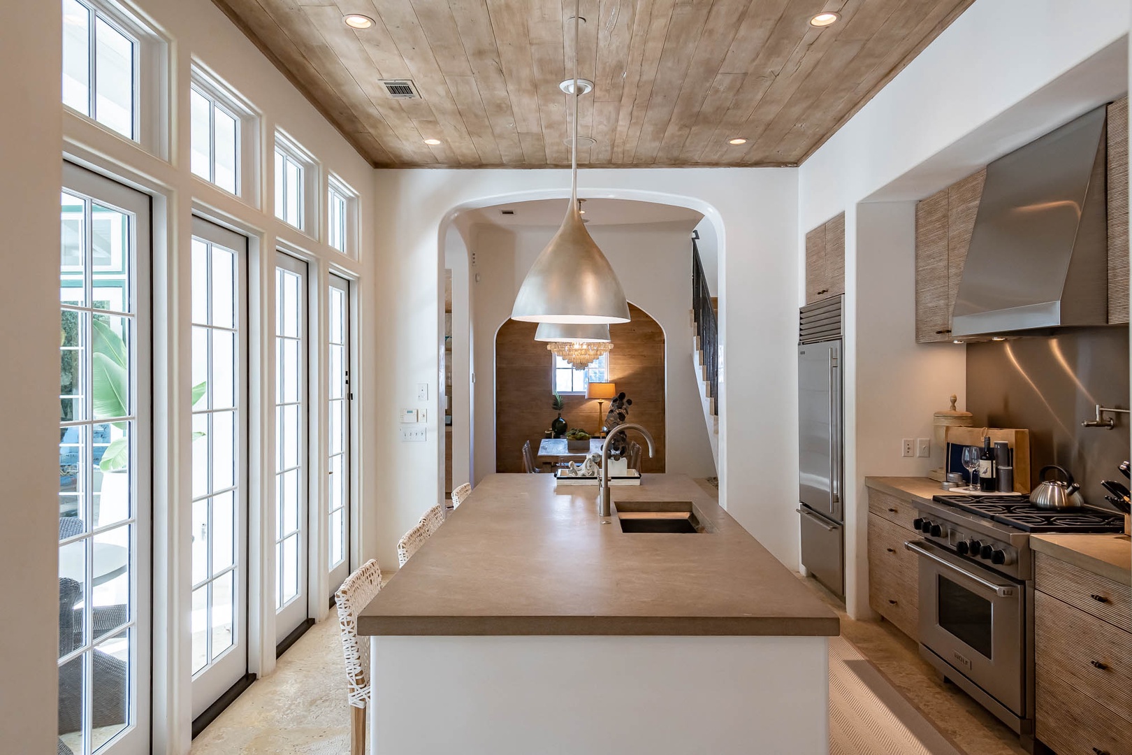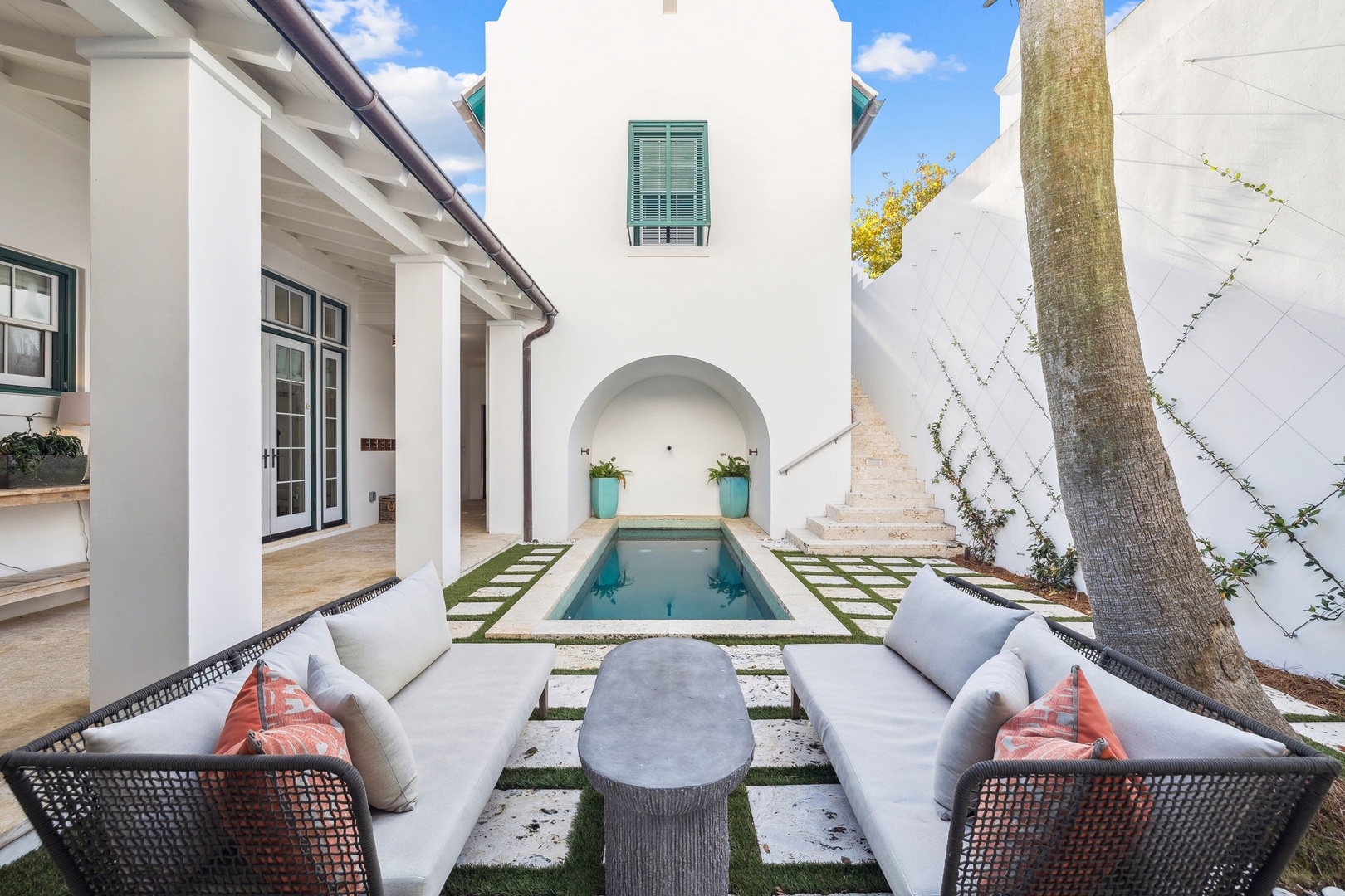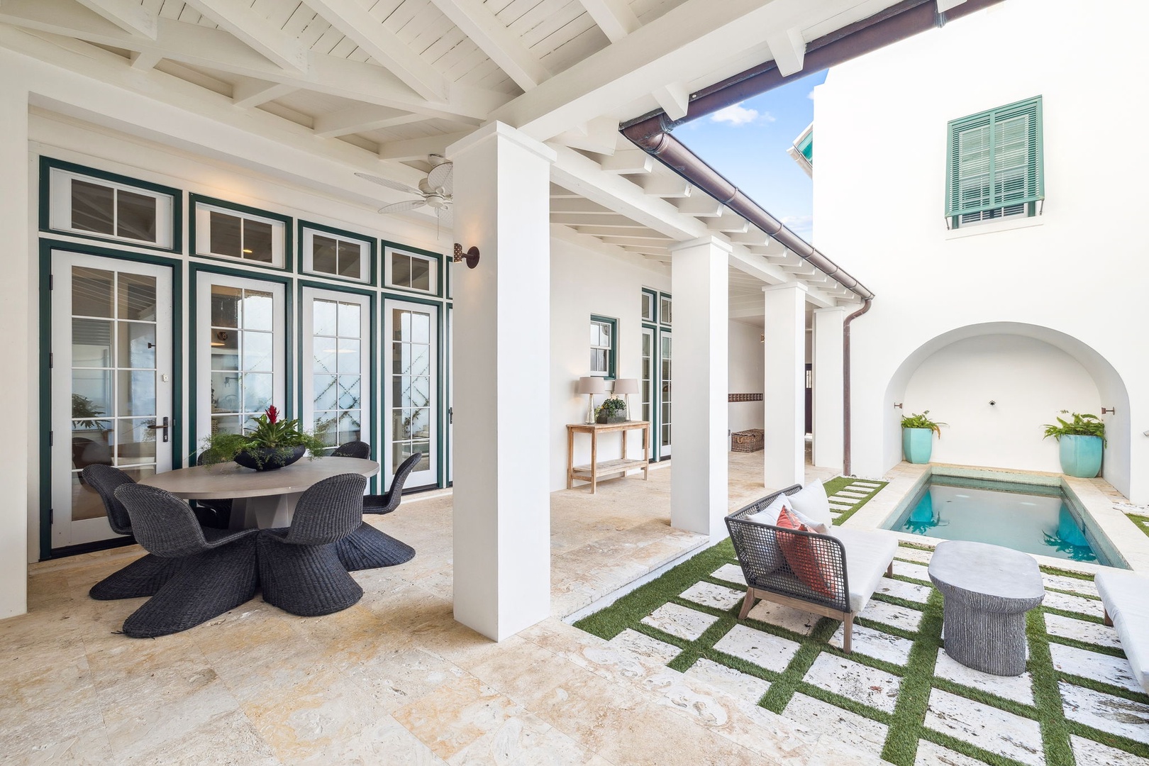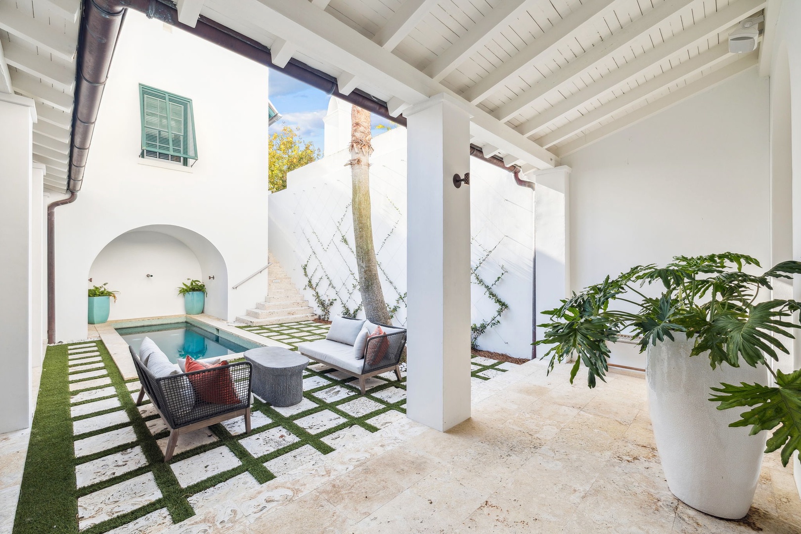 This Alys Beach Vacation Home is a short walk to all Alys Beach Amenities including our emerging Town Center. Guests will find a private courtyard with pool that offers open and covered seating as well as outdoor dining. The family room with beautiful natural wood accents offers ample seating and a wet bar with small refrigerator. The kitchen features a large center island with bar-style seating. Guest will find the primary suite with king-sized bed on the first level with an additional entrance to the courtyard. On the second level, guests will find a small tv lounge with additional seating, and two bedrooms, each with private baths. One of these bedrooms has one king bed and the other has two queen-sized beds. Finally, a roof-top terrace with grill completes this level. The fourth bedroom with a king-sized bed and private bath is detached from the main house and accessible by a stairway from the courtyard. Parking for this home is located in two designated spaces in a parking court.