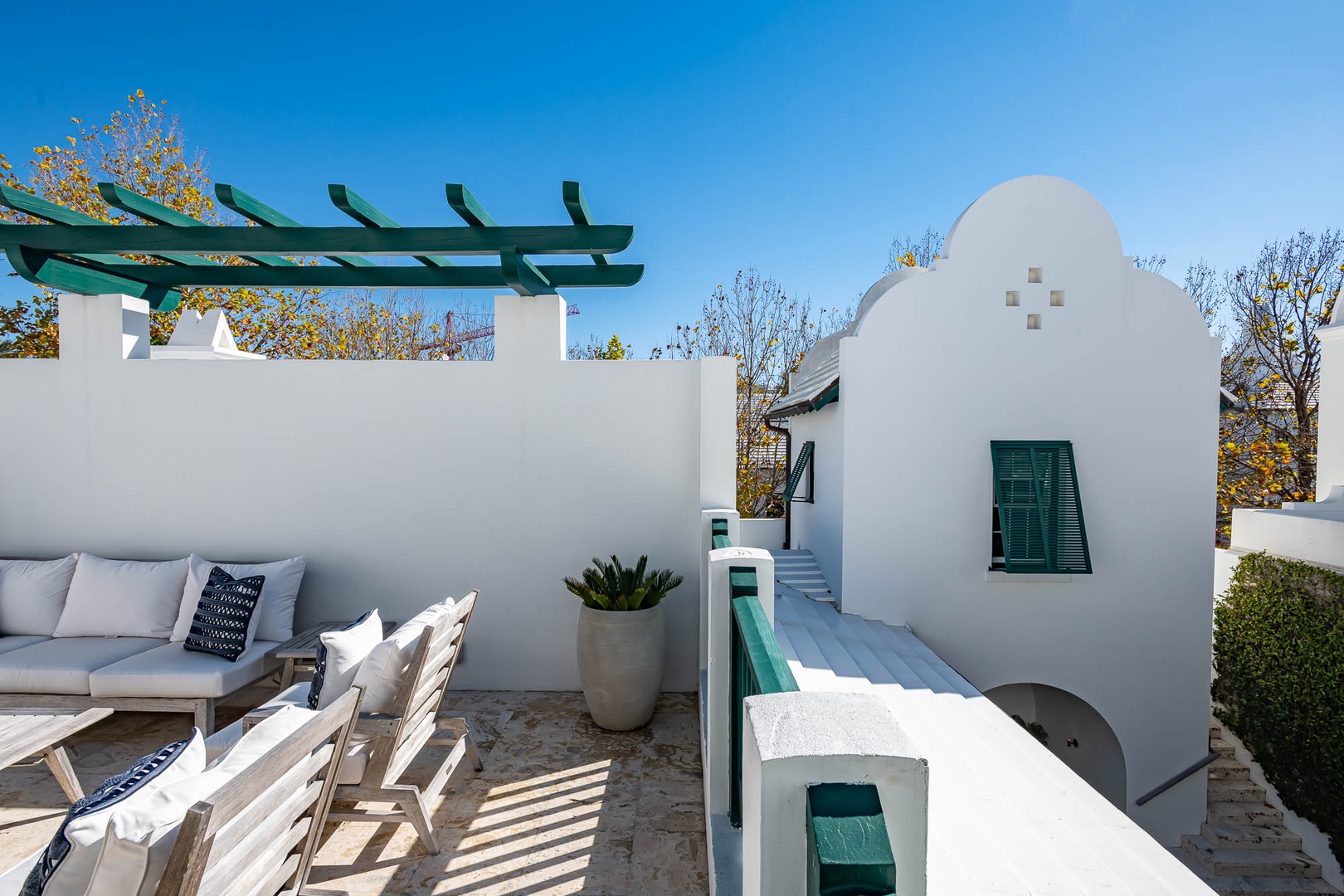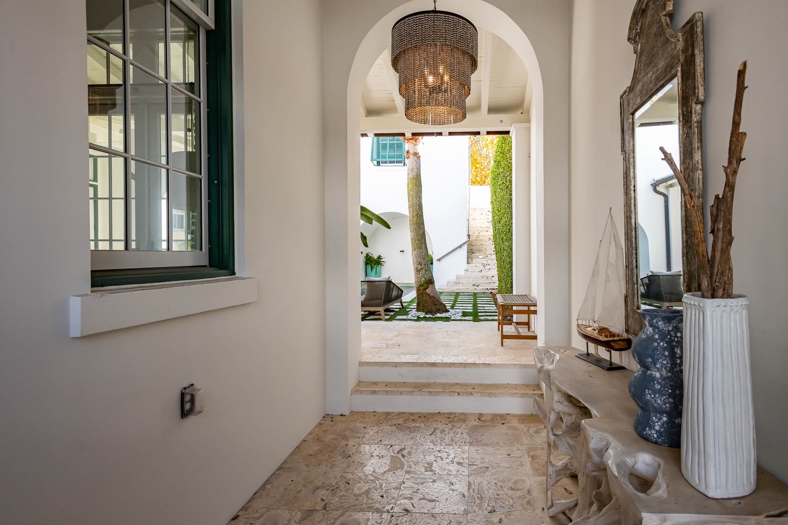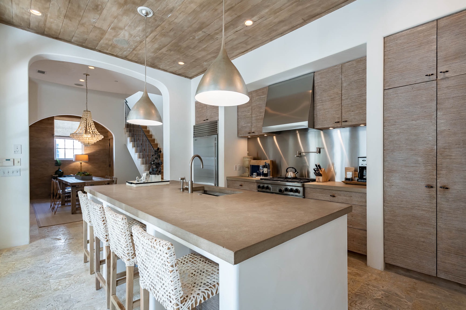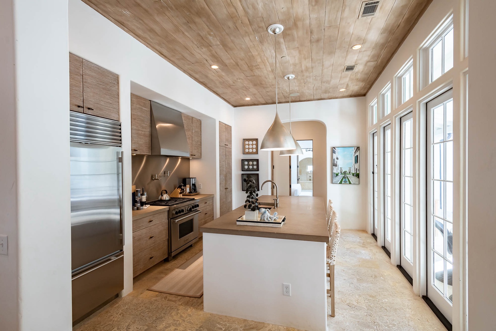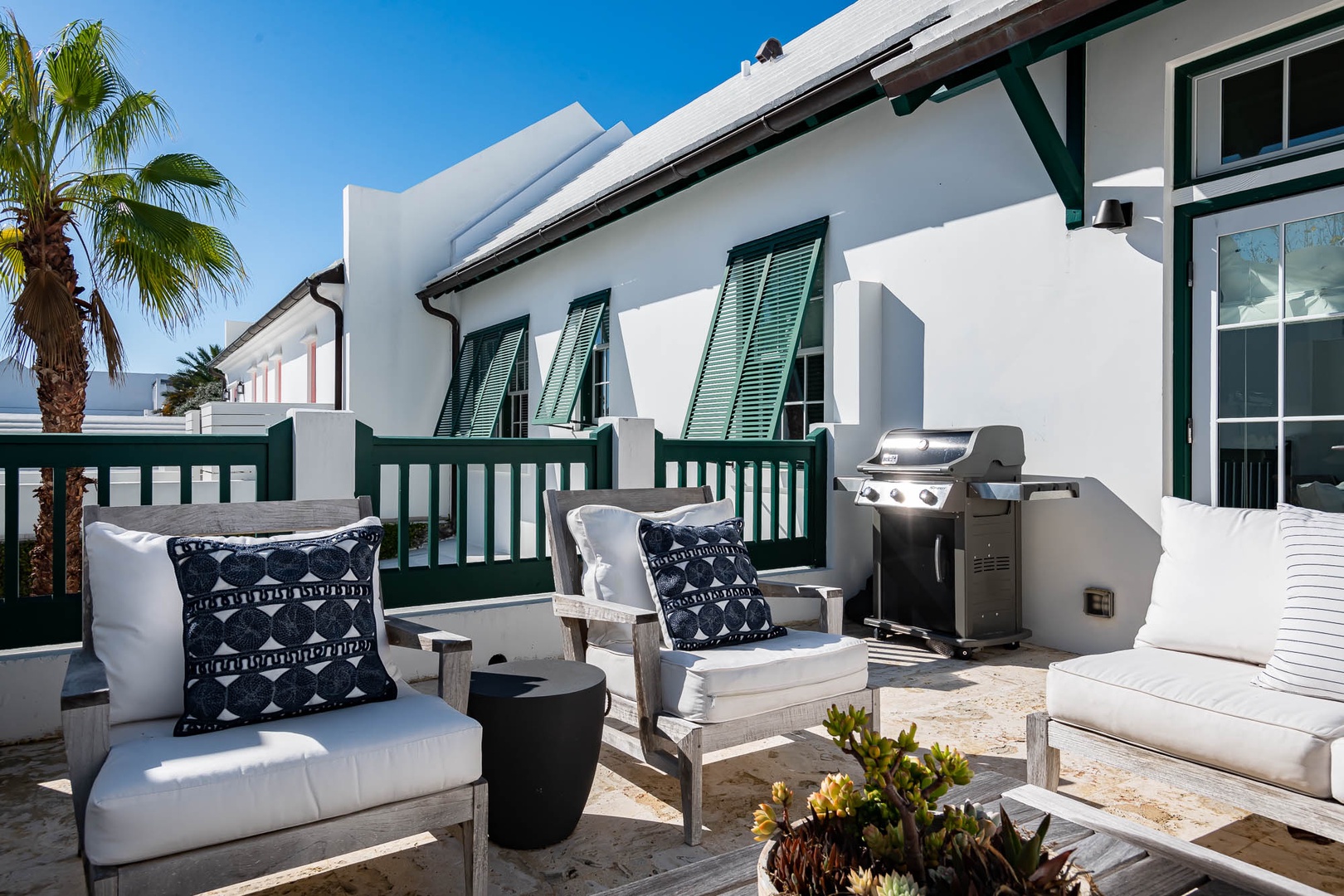 This Alys Beach Vacation Home is a short walk to all Alys Beach Amenities including our emerging Town Center. Guests will find a private courtyard with pool that offers open and covered seating as well as outdoor dining. The family room with beautiful natural wood accents offers ample seating and a wet bar with small refrigerator. The kitchen features a large center island with bar-style seating. Guest will find the primary suite with king-sized bed on the first level with an additional entrance to the courtyard. On the second level, guests will find a small tv lounge with additional seating, and two bedrooms, each with private baths. One of these bedrooms has one king bed and the other has two queen-sized beds. Finally, a roof-top terrace with grill completes this level. The fourth bedroom with a king-sized bed and private bath is detached from the main house and accessible by a stairway from the courtyard. Parking for this home is located in two designated spaces in a parking court.