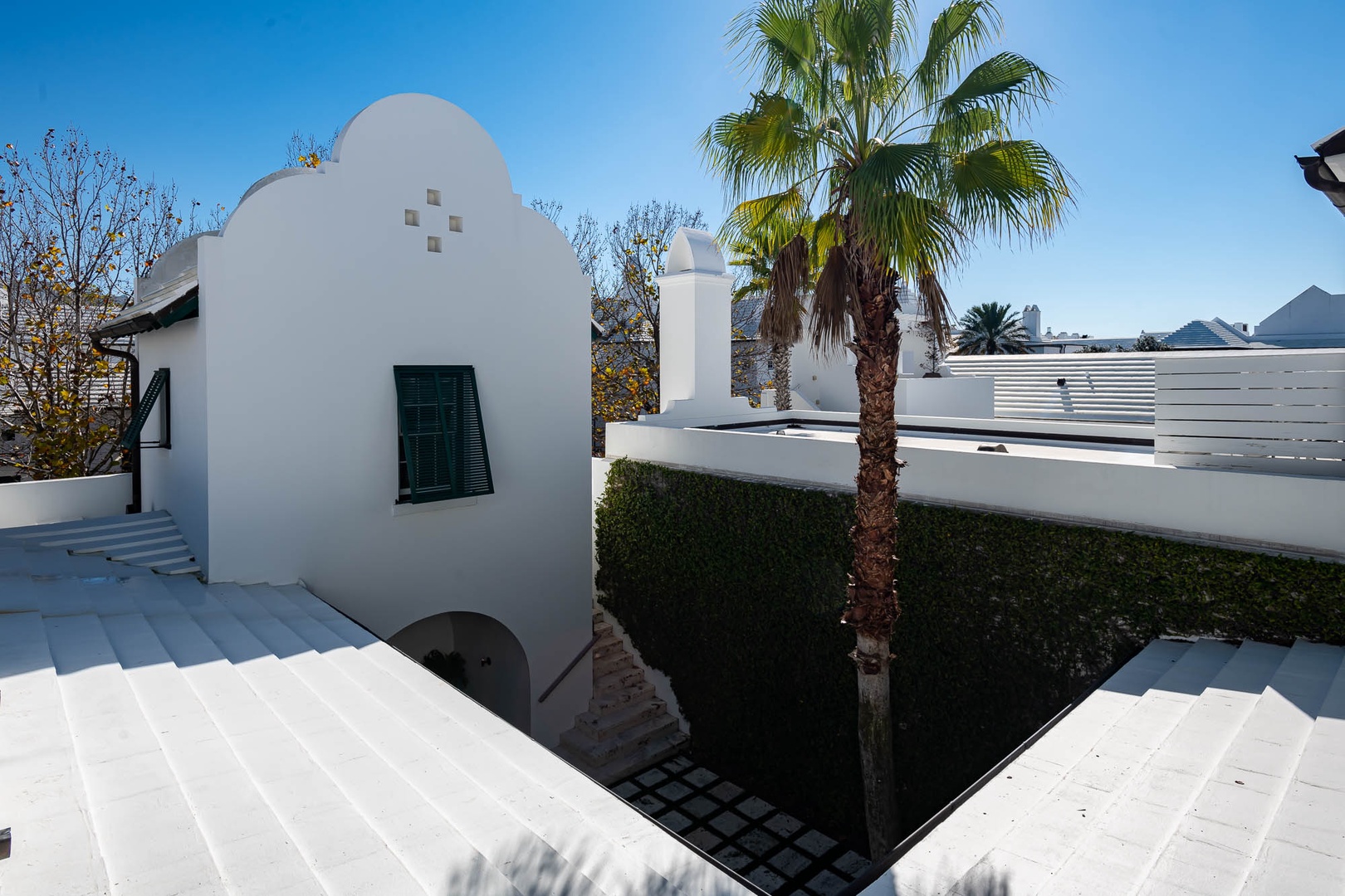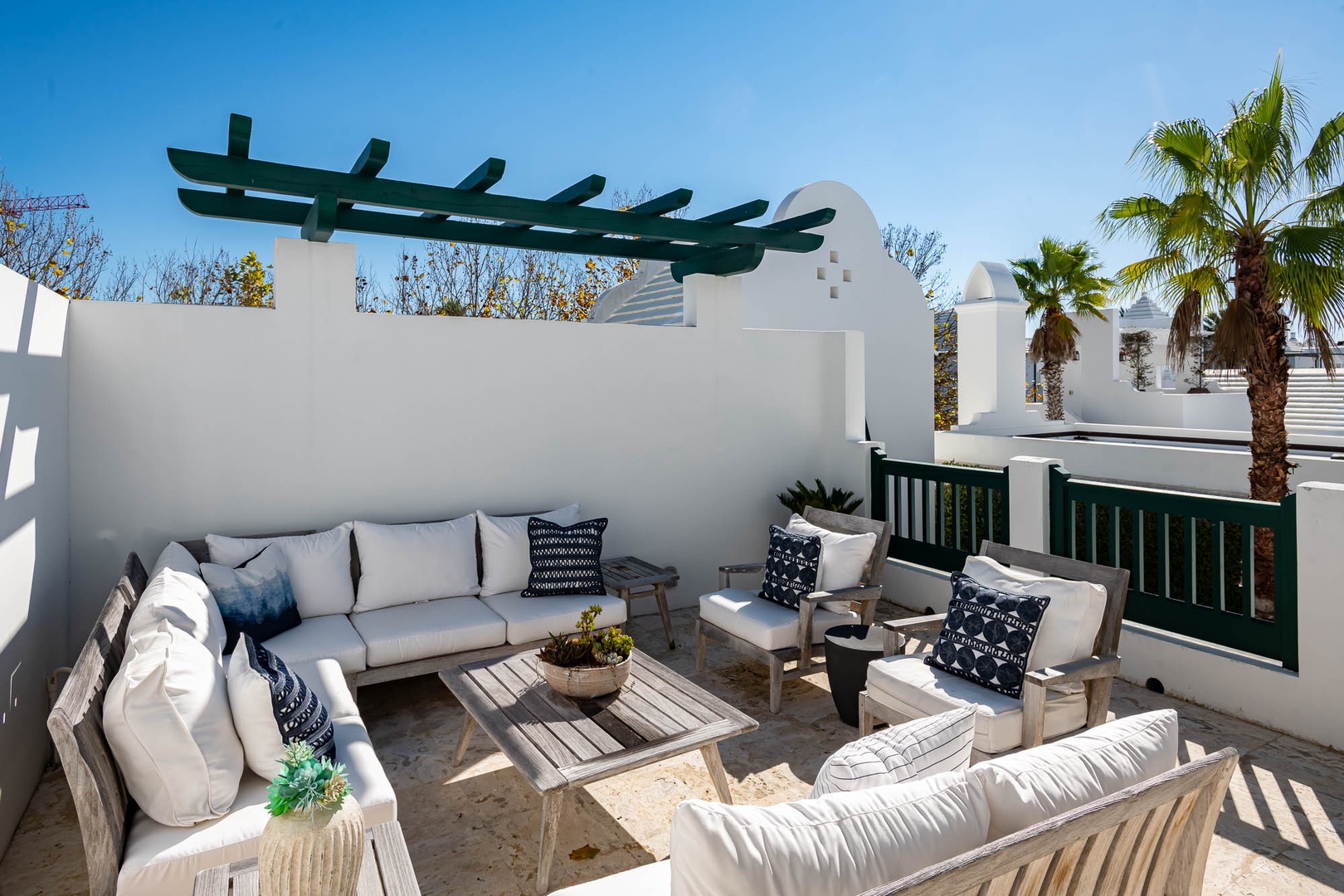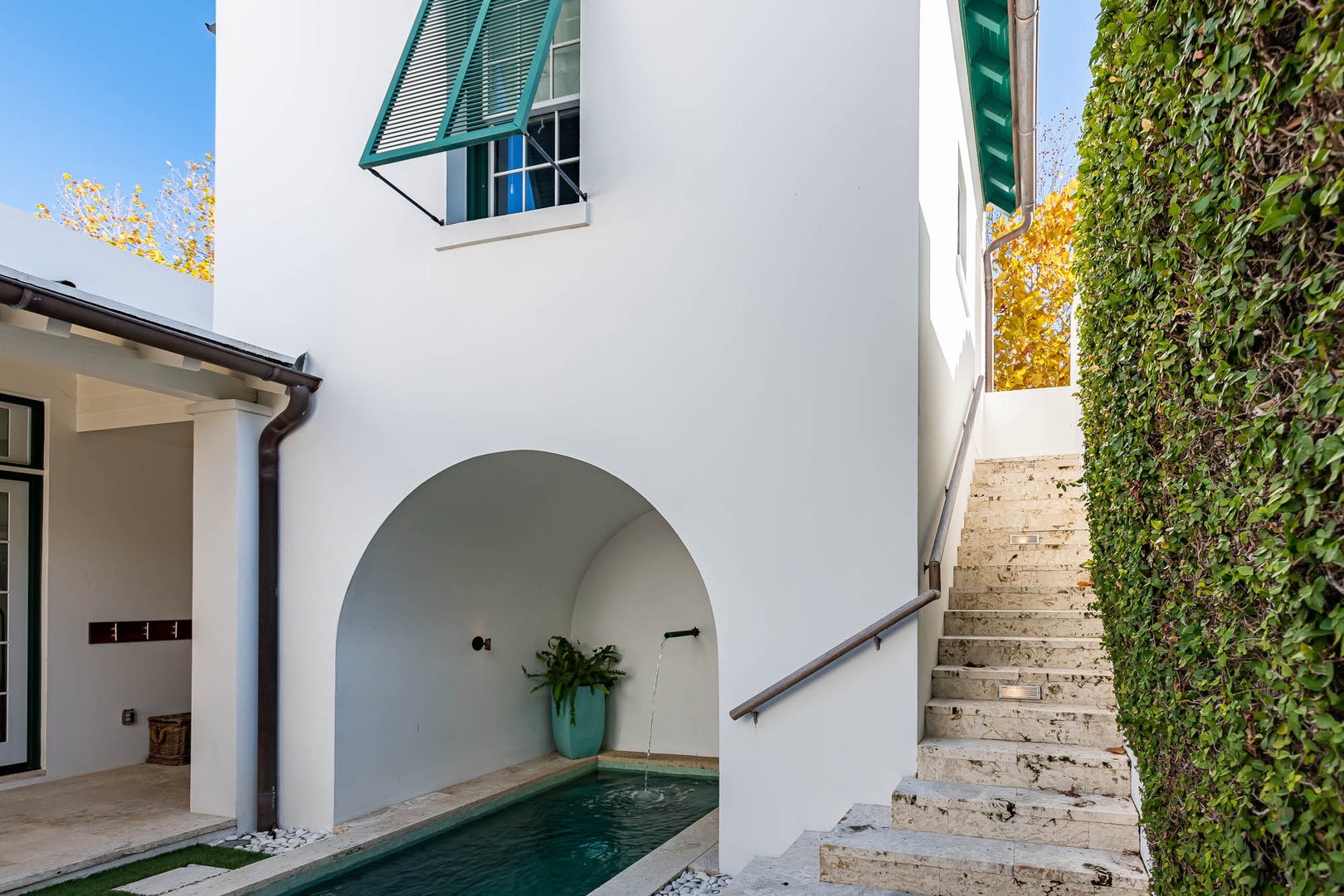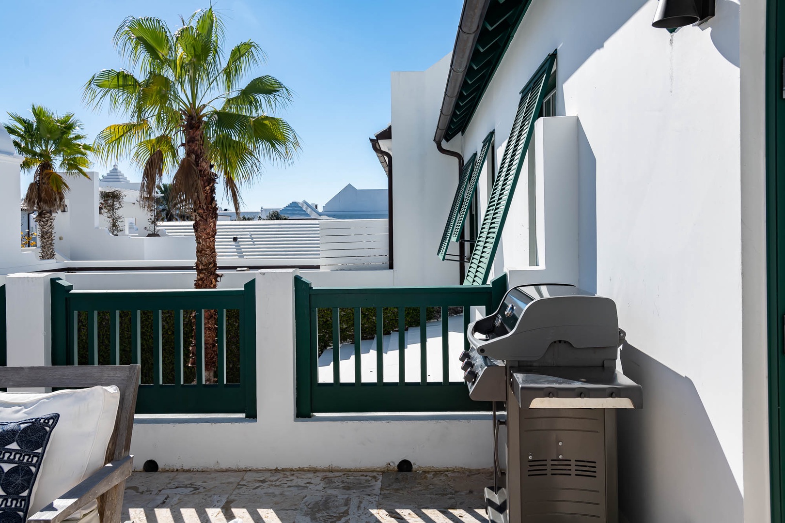 This Alys Beach Vacation Home is a short walk to all Alys Beach Amenities including our emerging Town Center. Guests will find a private courtyard with pool that offers open and covered seating as well as outdoor dining. The family room with beautiful natural wood accents offers ample seating and a wet bar with small refrigerator. The kitchen features a large center island with bar-style seating. Guest will find the primary suite with king-sized bed on the first level with an additional entrance to the courtyard. On the second level, guests will find a small tv lounge with additional seating, and two bedrooms, each with private baths. One of these bedrooms has one king bed and the other has two queen-sized beds. Finally, a roof-top terrace with grill completes this level. The fourth bedroom with a king-sized bed and private bath is detached from the main house and accessible by a stairway from the courtyard. Parking for this home is located in two designated spaces in a parking court.
