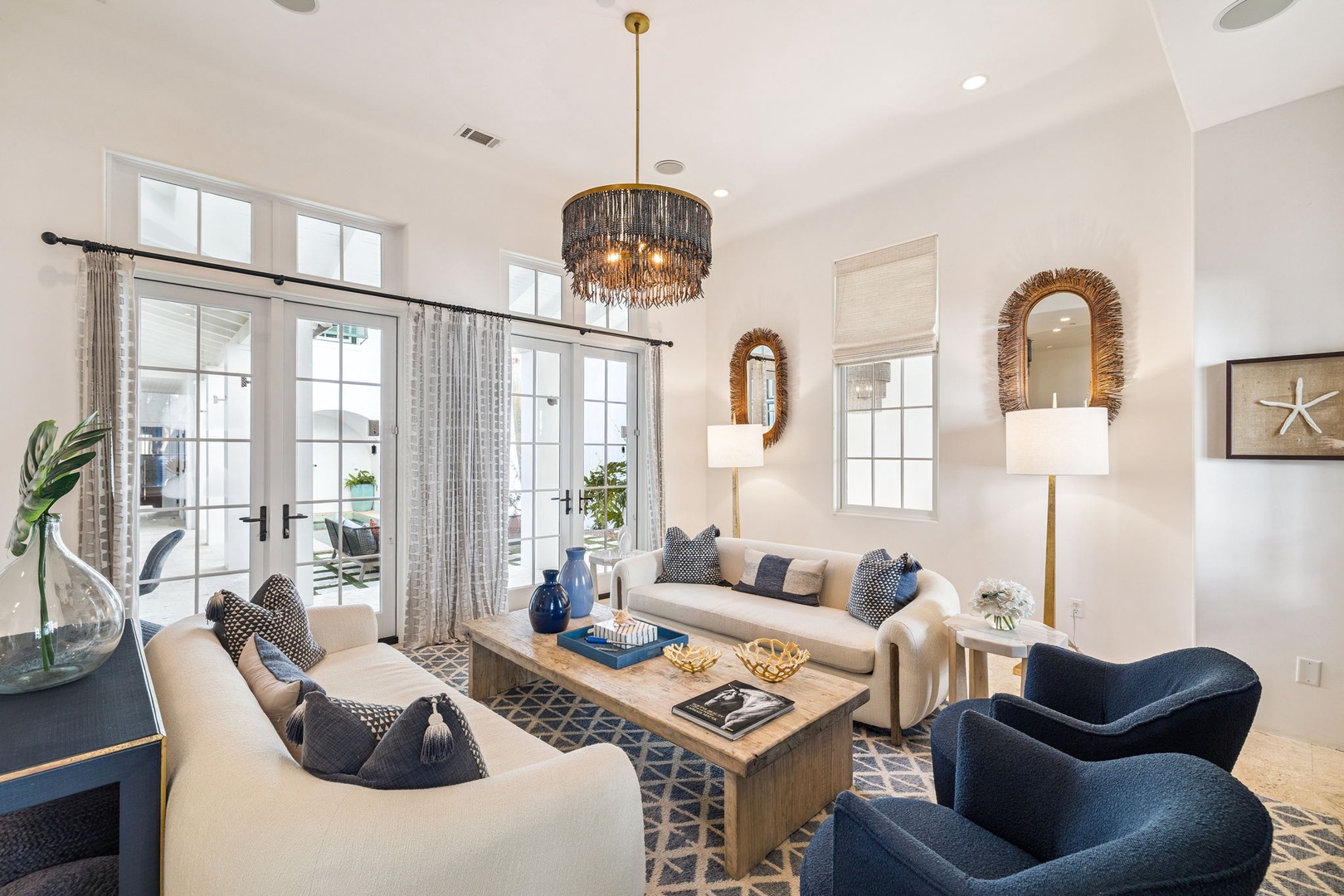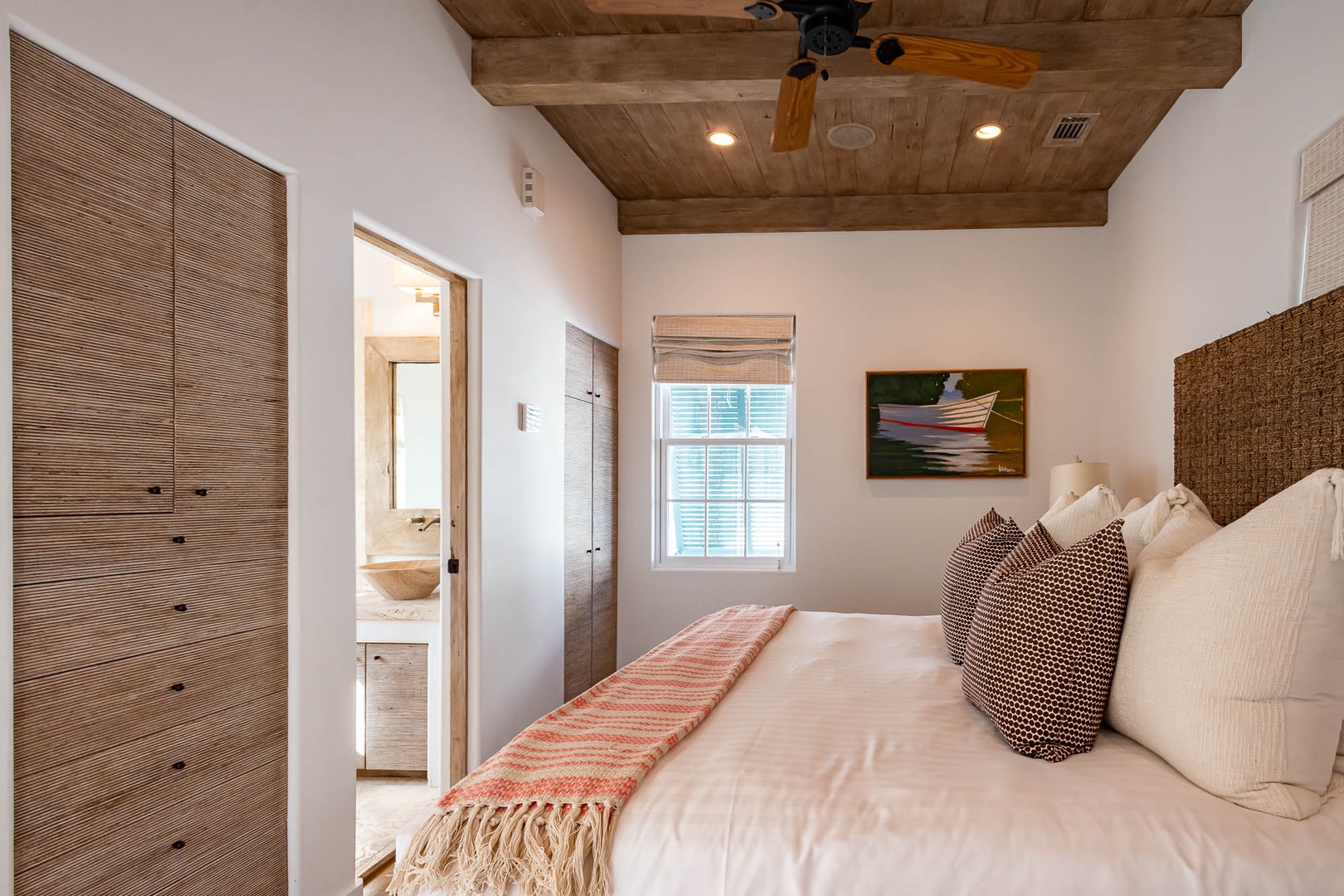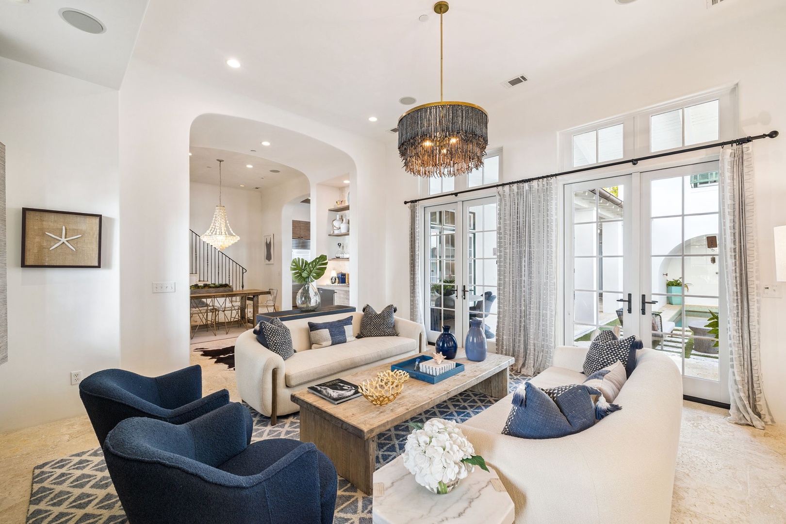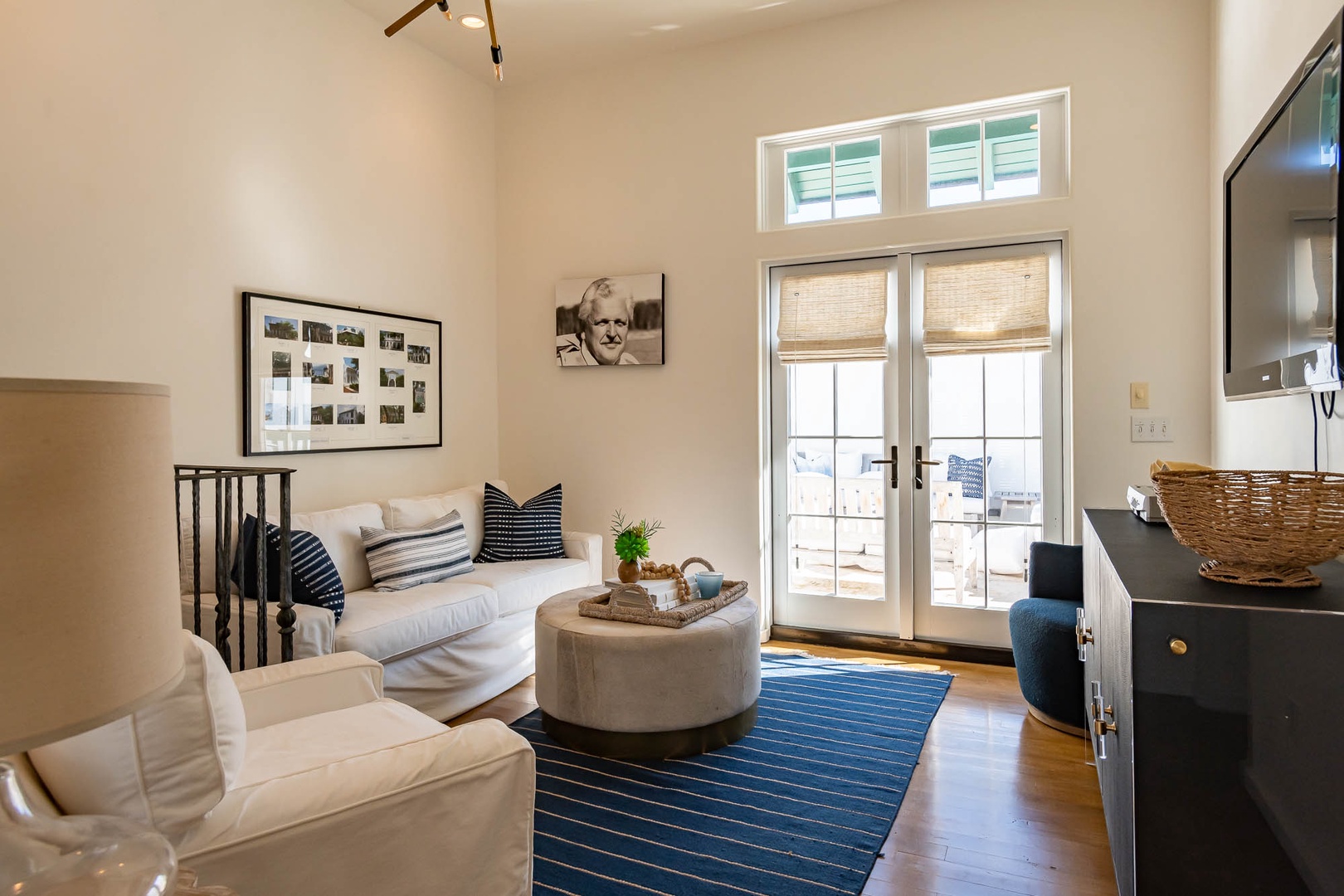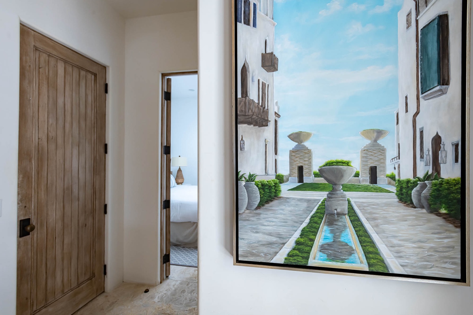 This Alys Beach Vacation Home is a short walk to all Alys Beach Amenities including our emerging Town Center. Guests will find a private courtyard with pool that offers open and covered seating as well as outdoor dining. The family room with beautiful natural wood accents offers ample seating and a wet bar with small refrigerator. The kitchen features a large center island with bar-style seating. Guest will find the primary suite with king-sized bed on the first level with an additional entrance to the courtyard. On the second level, guests will find a small tv lounge with additional seating, and two bedrooms, each with private baths. One of these bedrooms has one king bed and the other has two queen-sized beds. Finally, a roof-top terrace with grill completes this level. The fourth bedroom with a king-sized bed and private bath is detached from the main house and accessible by a stairway from the courtyard. Parking for this home is located in two designated spaces in a parking court.