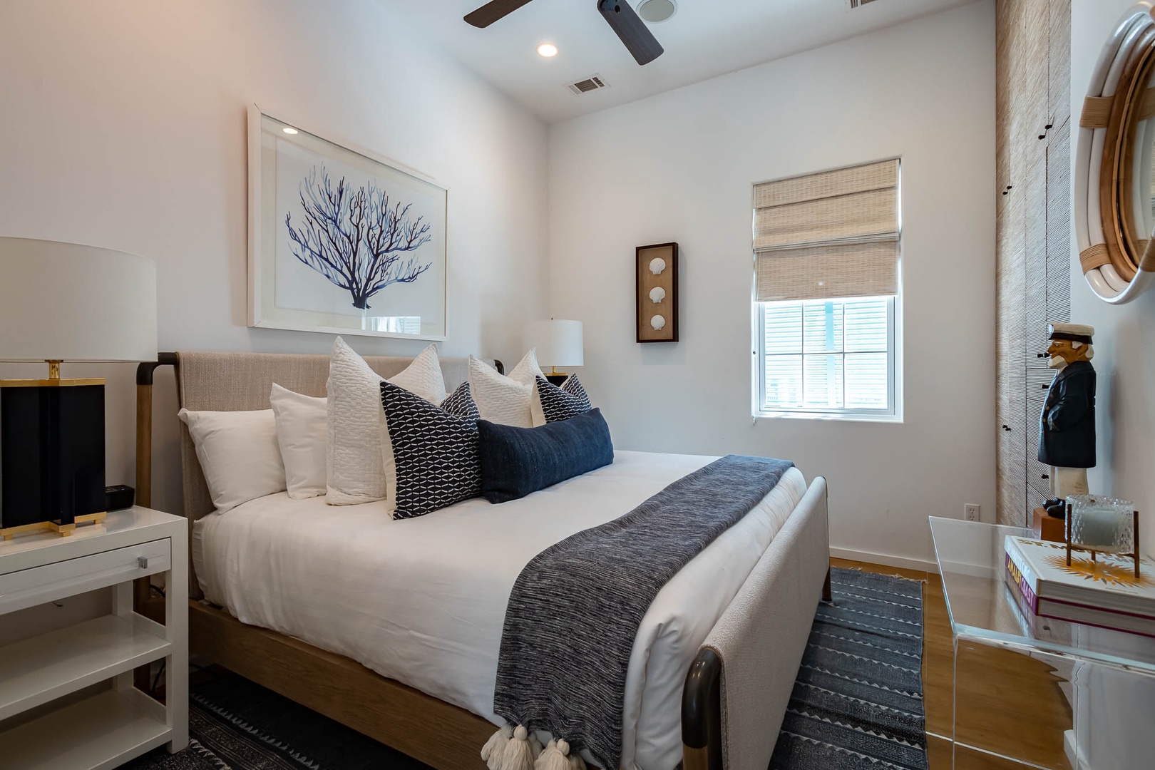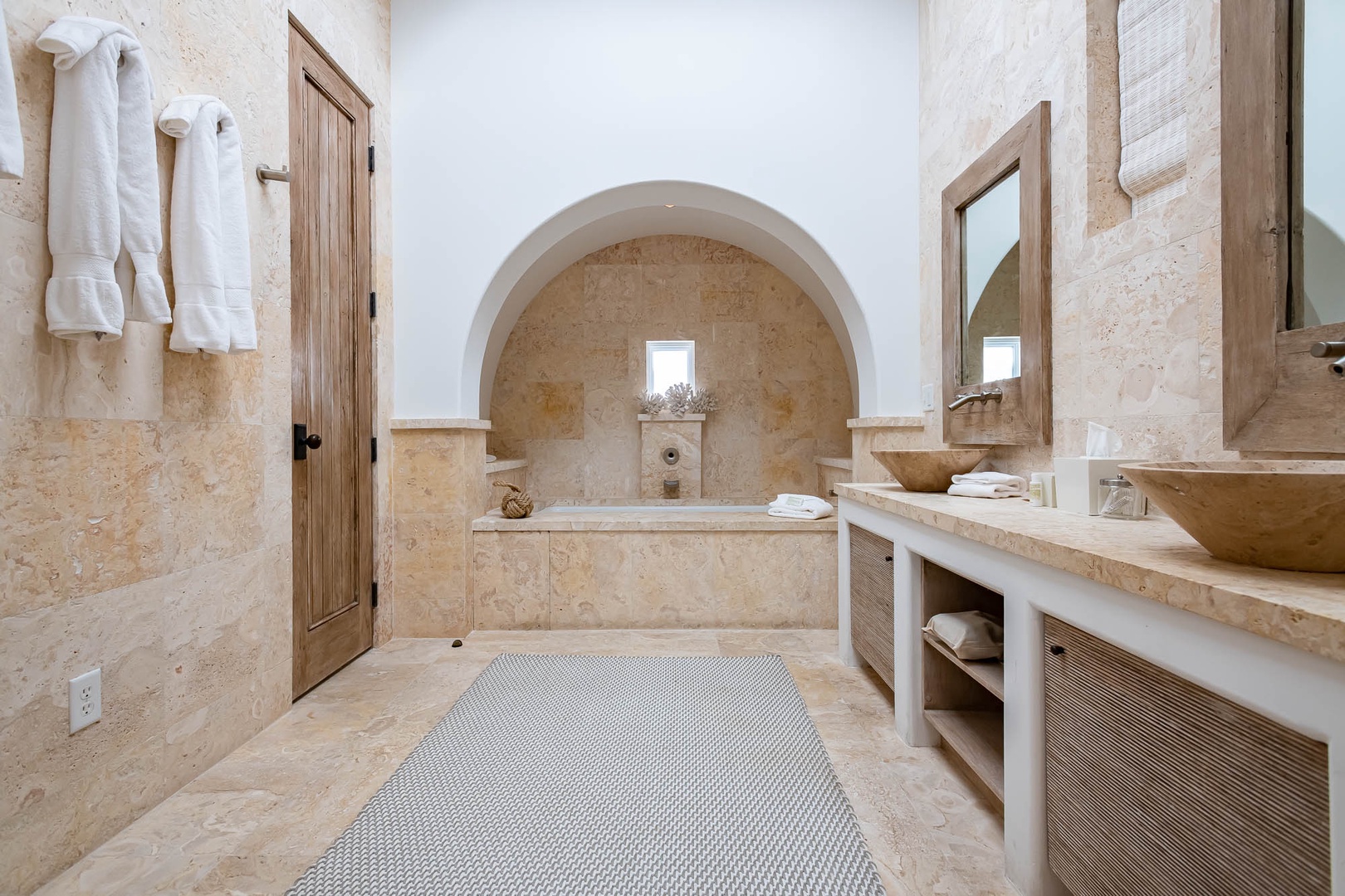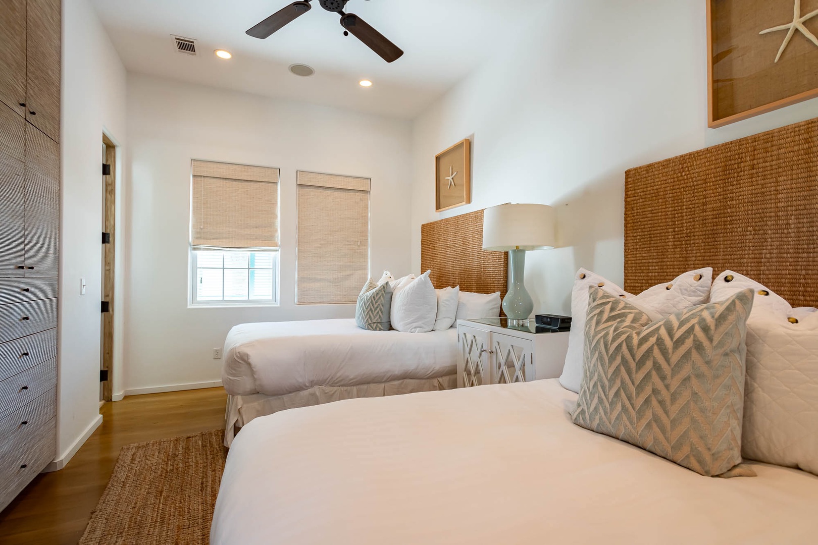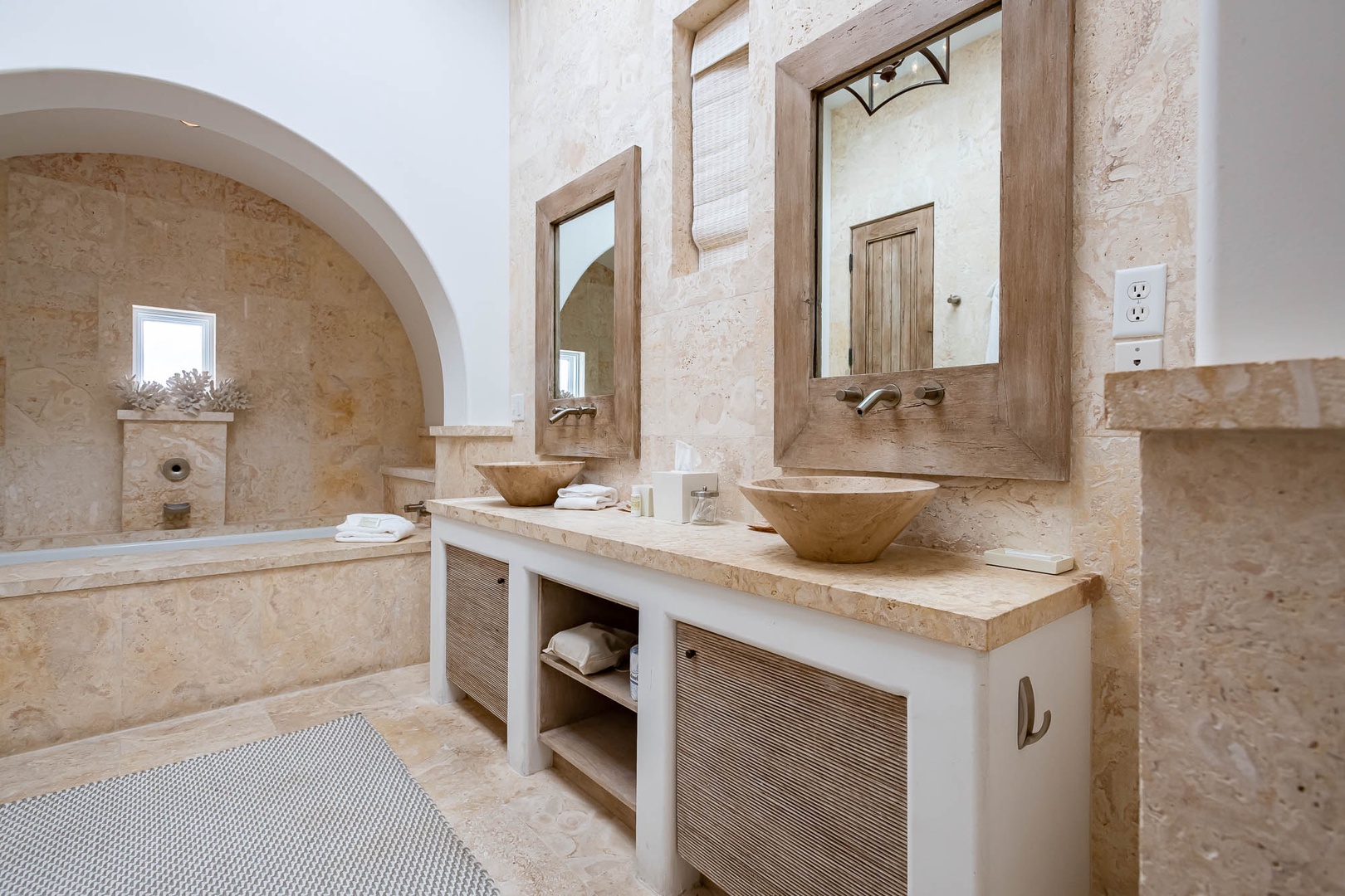 This Alys Beach Vacation Home is a short walk to all Alys Beach Amenities including our emerging Town Center. Guests will find a private courtyard with pool that offers open and covered seating as well as outdoor dining. The family room with beautiful natural wood accents offers ample seating and a wet bar with small refrigerator. The kitchen features a large center island with bar-style seating. Guest will find the primary suite with king-sized bed on the first level with an additional entrance to the courtyard. On the second level, guests will find a small tv lounge with additional seating, and two bedrooms, each with private baths. One of these bedrooms has one king bed and the other has two queen-sized beds. Finally, a roof-top terrace with grill completes this level. The fourth bedroom with a king-sized bed and private bath is detached from the main house and accessible by a stairway from the courtyard. Parking for this home is located in two designated spaces in a parking court.