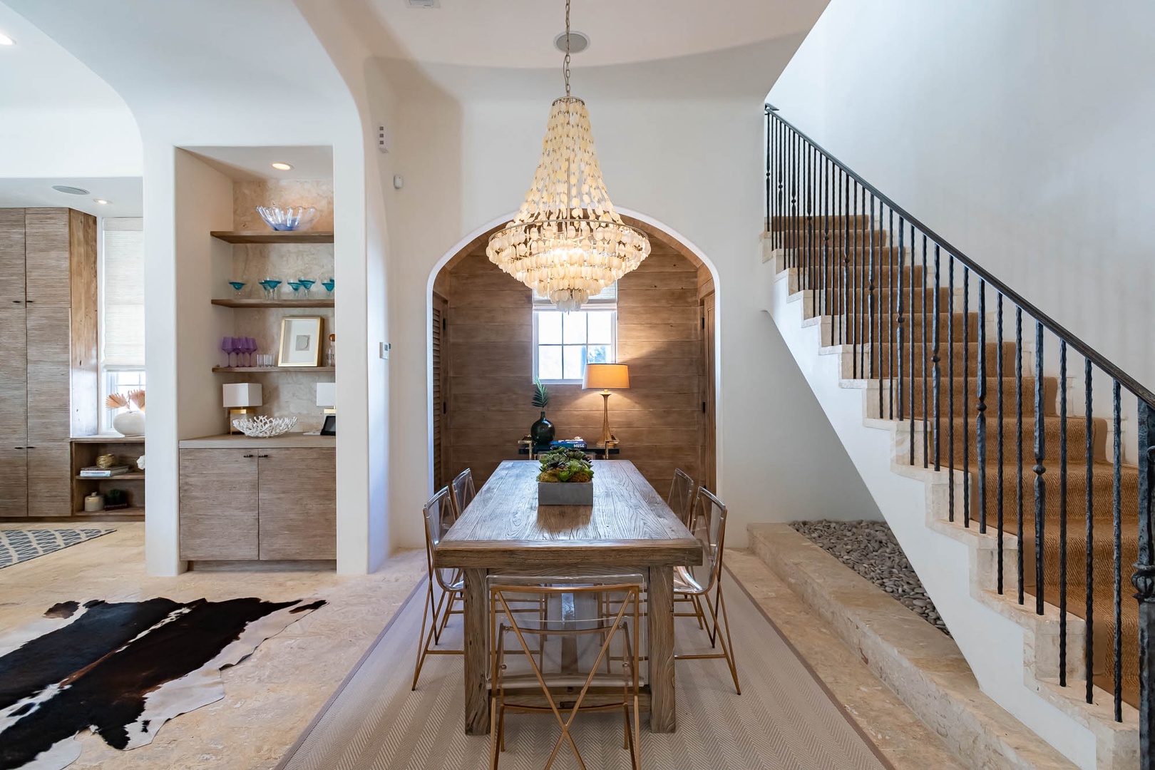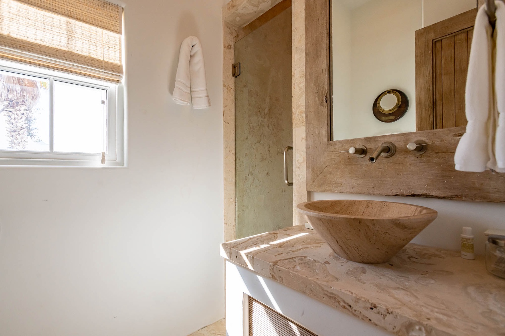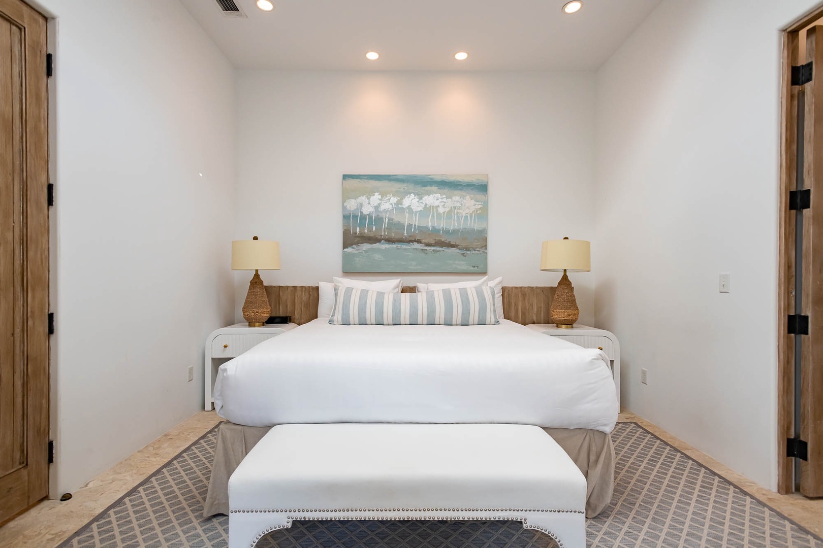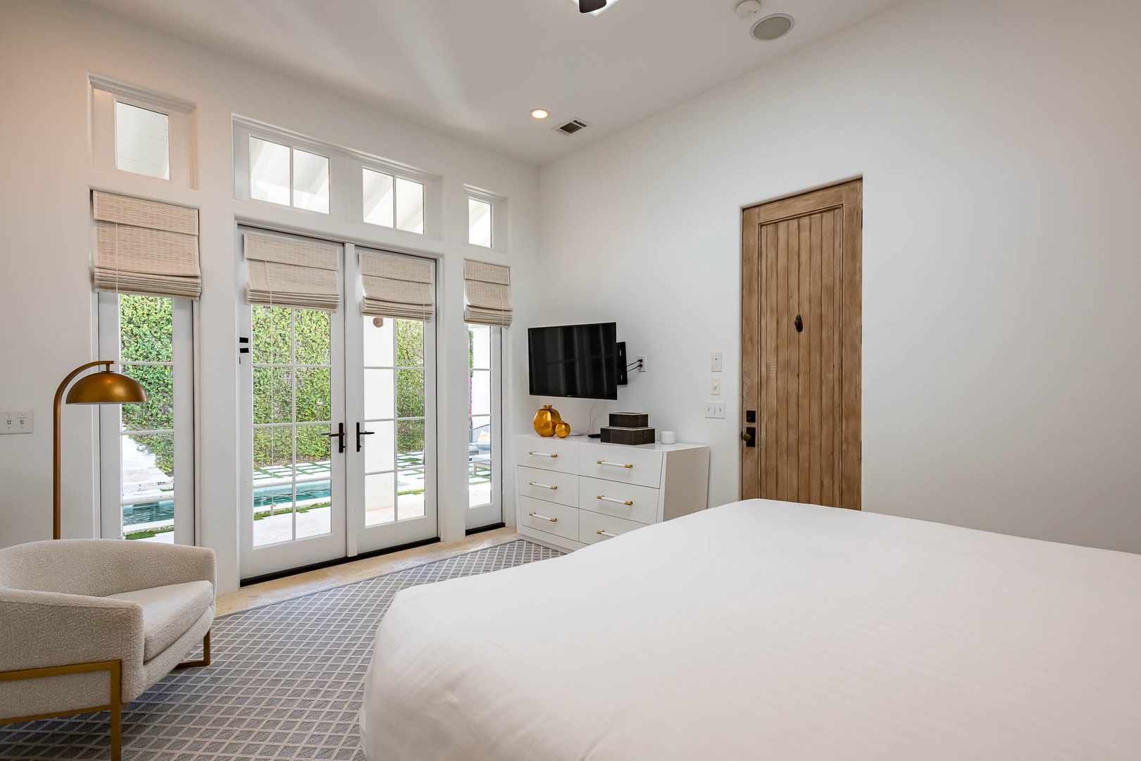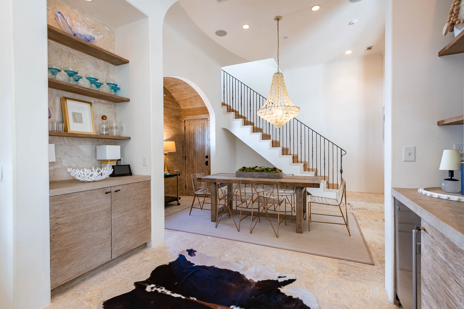 This Alys Beach Vacation Home is a short walk to all Alys Beach Amenities including our emerging Town Center. Guests will find a private courtyard with pool that offers open and covered seating as well as outdoor dining. The family room with beautiful natural wood accents offers ample seating and a wet bar with small refrigerator. The kitchen features a large center island with bar-style seating. Guest will find the primary suite with king-sized bed on the first level with an additional entrance to the courtyard. On the second level, guests will find a small tv lounge with additional seating, and two bedrooms, each with private baths. One of these bedrooms has one king bed and the other has two queen-sized beds. Finally, a roof-top terrace with grill completes this level. The fourth bedroom with a king-sized bed and private bath is detached from the main house and accessible by a stairway from the courtyard. Parking for this home is located in two designated spaces in a parking court.