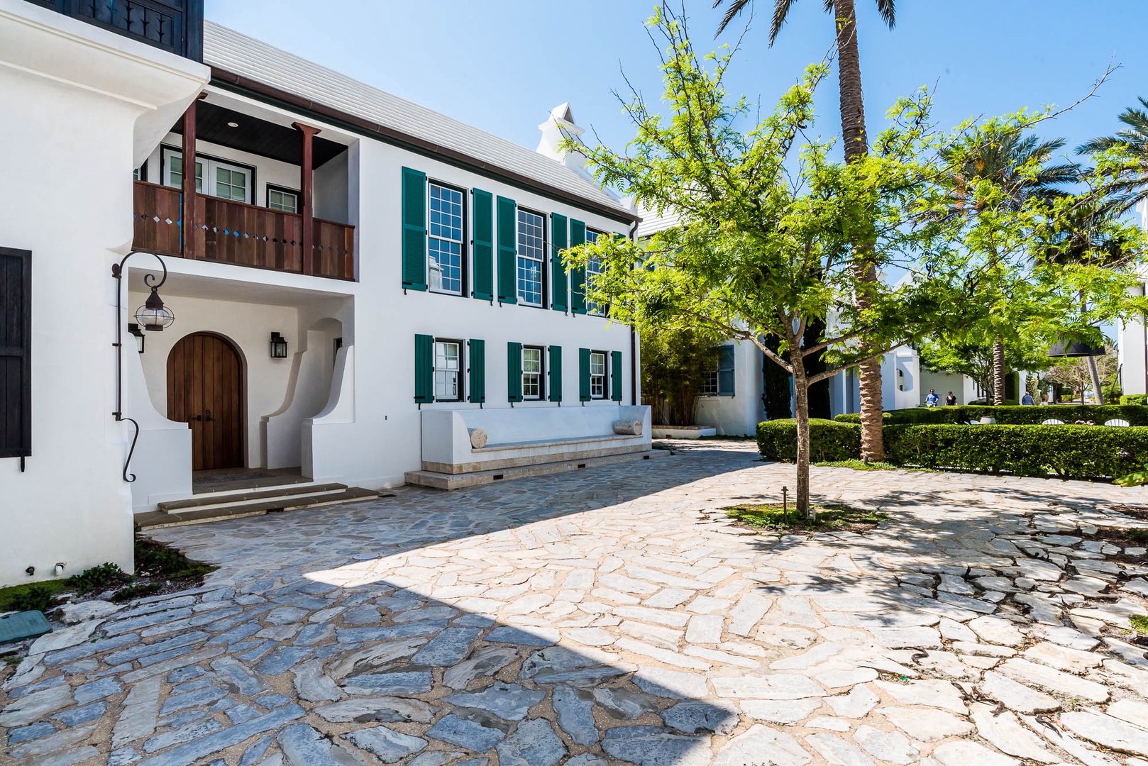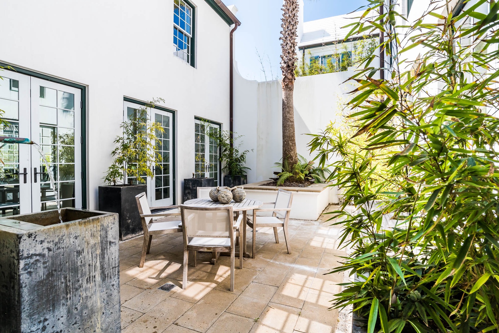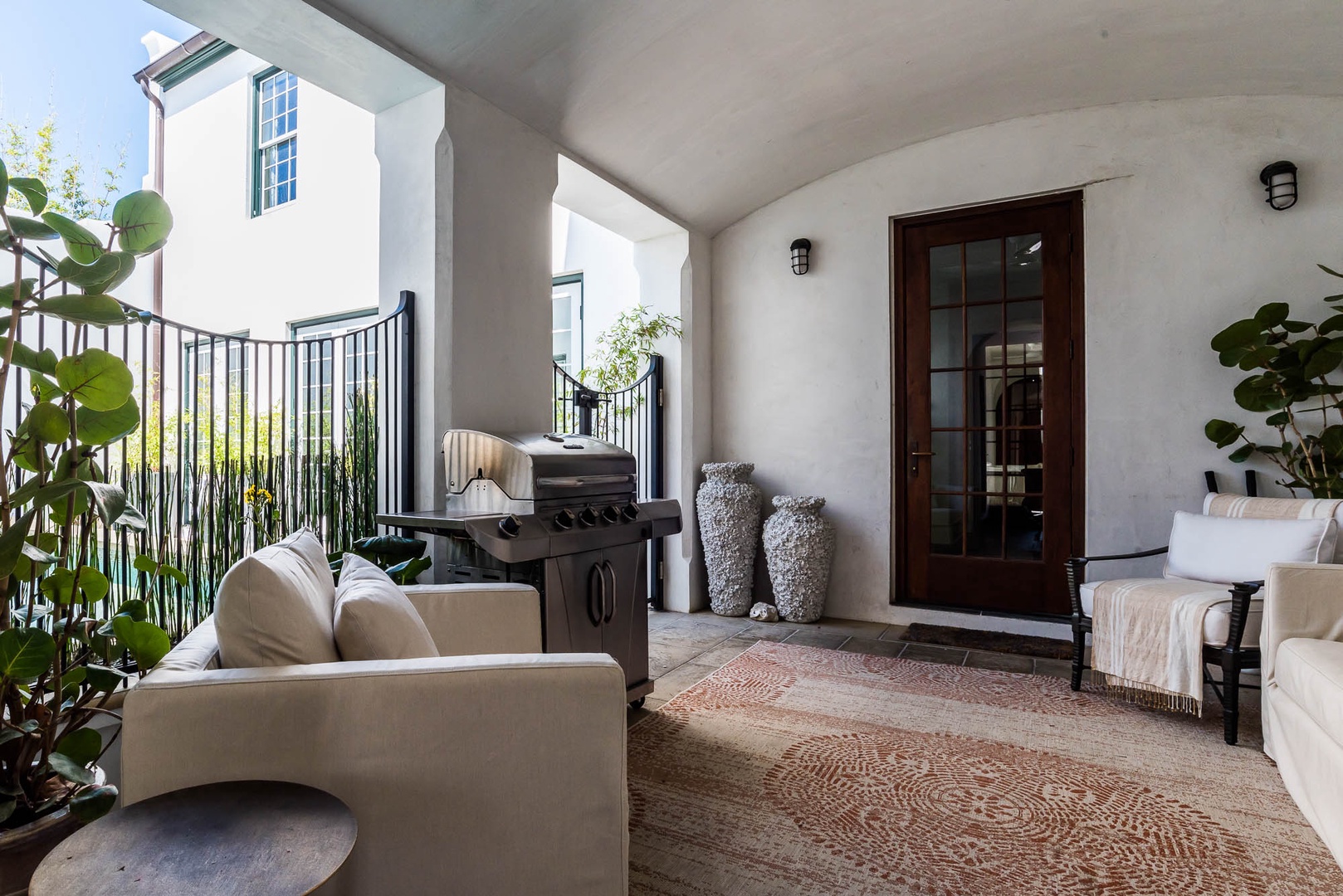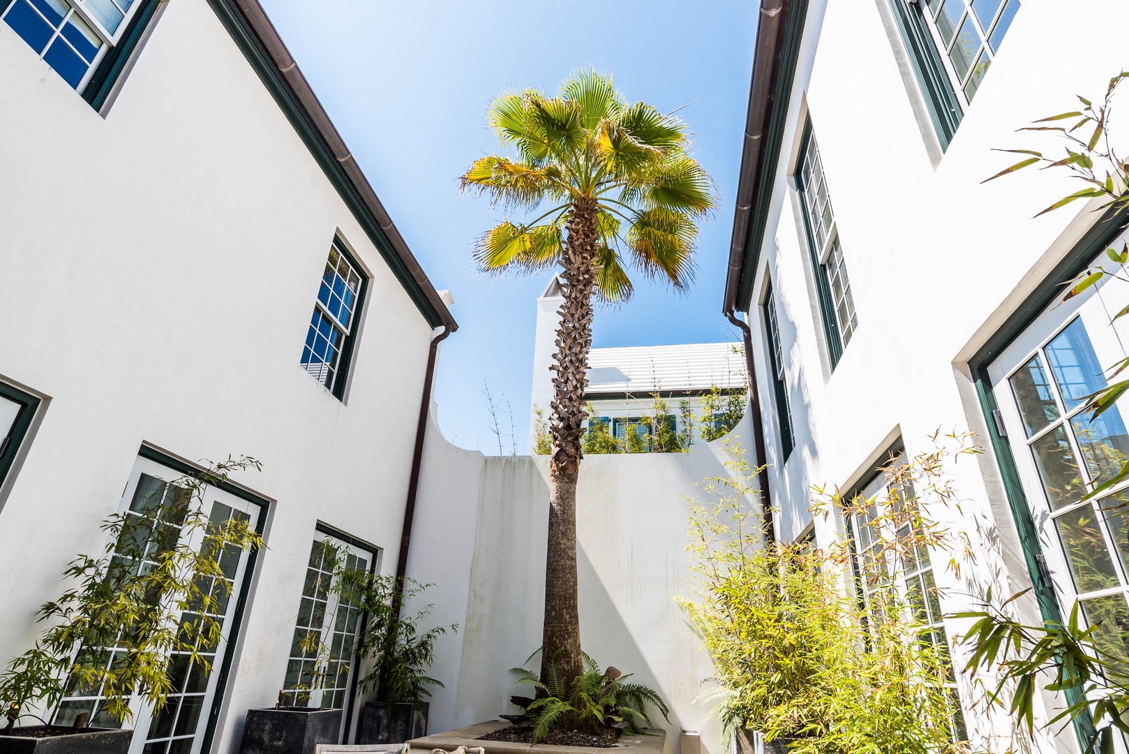 The courtyard house is practically a trademark of Alys Beach. With its stand-alone main rooms joined by a series of French doors, there is no more authentic Alys Beach experience than a courtyard house rental. This 4 bedroom, 4.5 bath home has a centrally located courtyard with a private pool. The private, detached primary suite includes a comfortable study in its loft. A covered zaguan provides a shady entrance to the main rooms. Upstairs are 2 spacious king bedroom suites and a twin bedroom with its own study area.