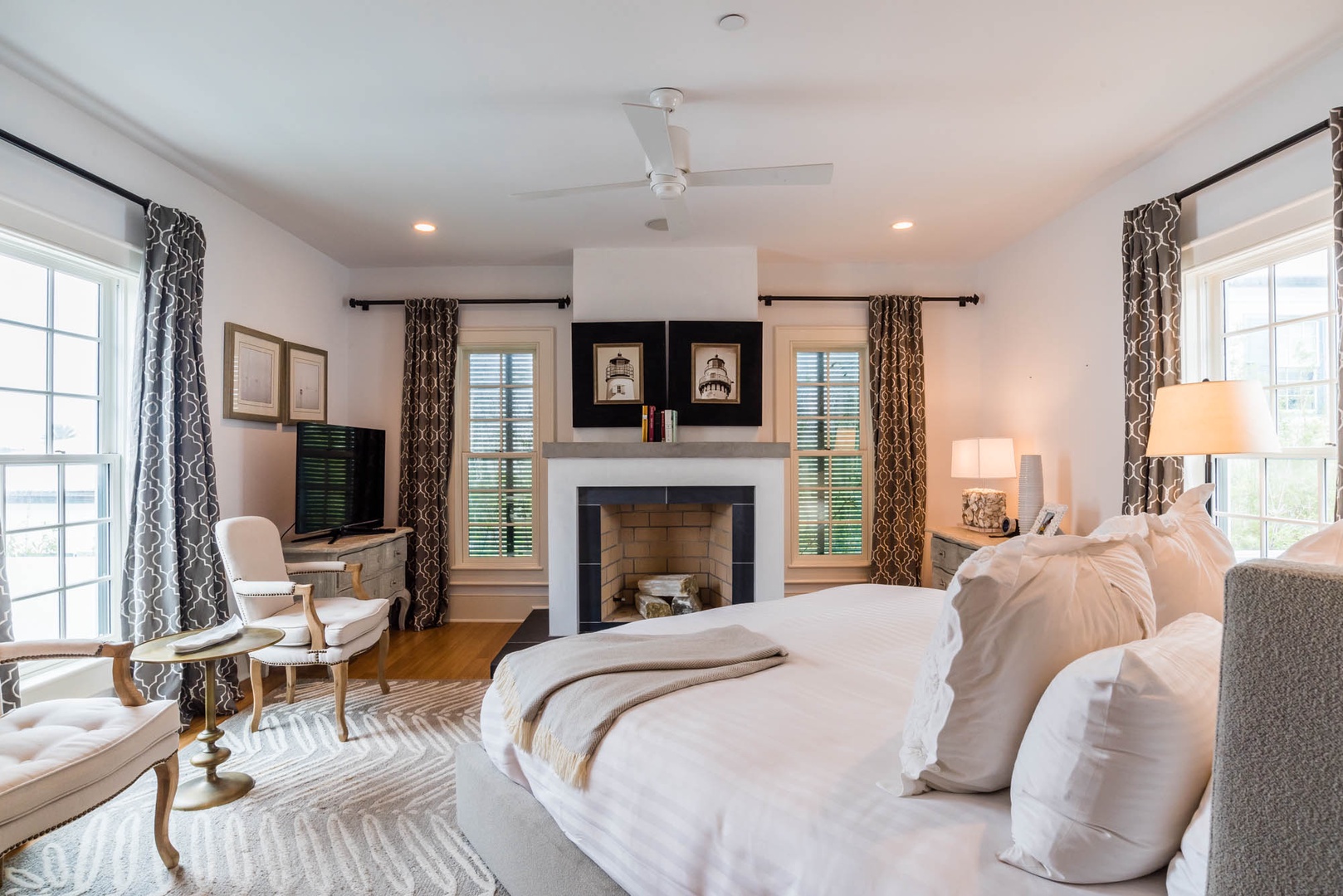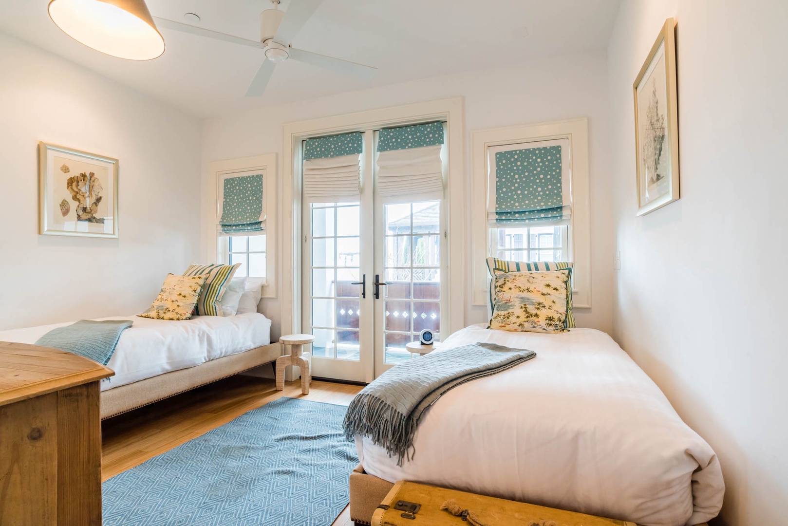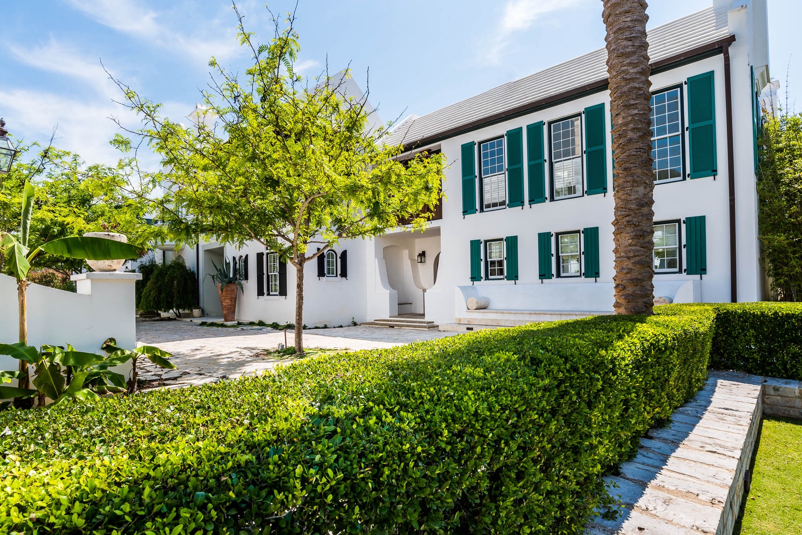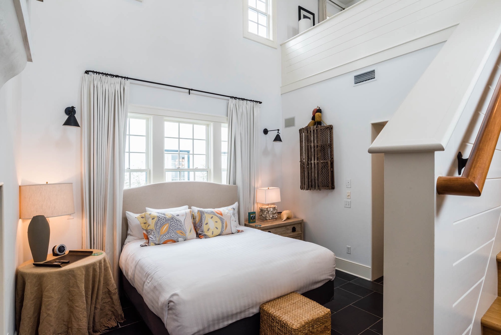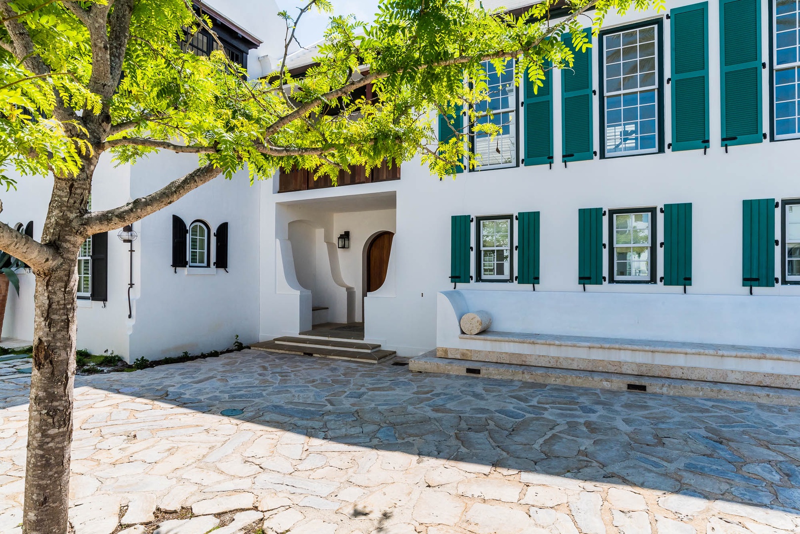 The courtyard house is practically a trademark of Alys Beach. With its stand-alone main rooms joined by a series of French doors, there is no more authentic Alys Beach experience than a courtyard house rental. This 4 bedroom, 4.5 bath home has a centrally located courtyard with a private pool. The private, detached primary suite includes a comfortable study in its loft. A covered zaguan provides a shady entrance to the main rooms. Upstairs are 2 spacious king bedroom suites and a twin bedroom with its own study area.