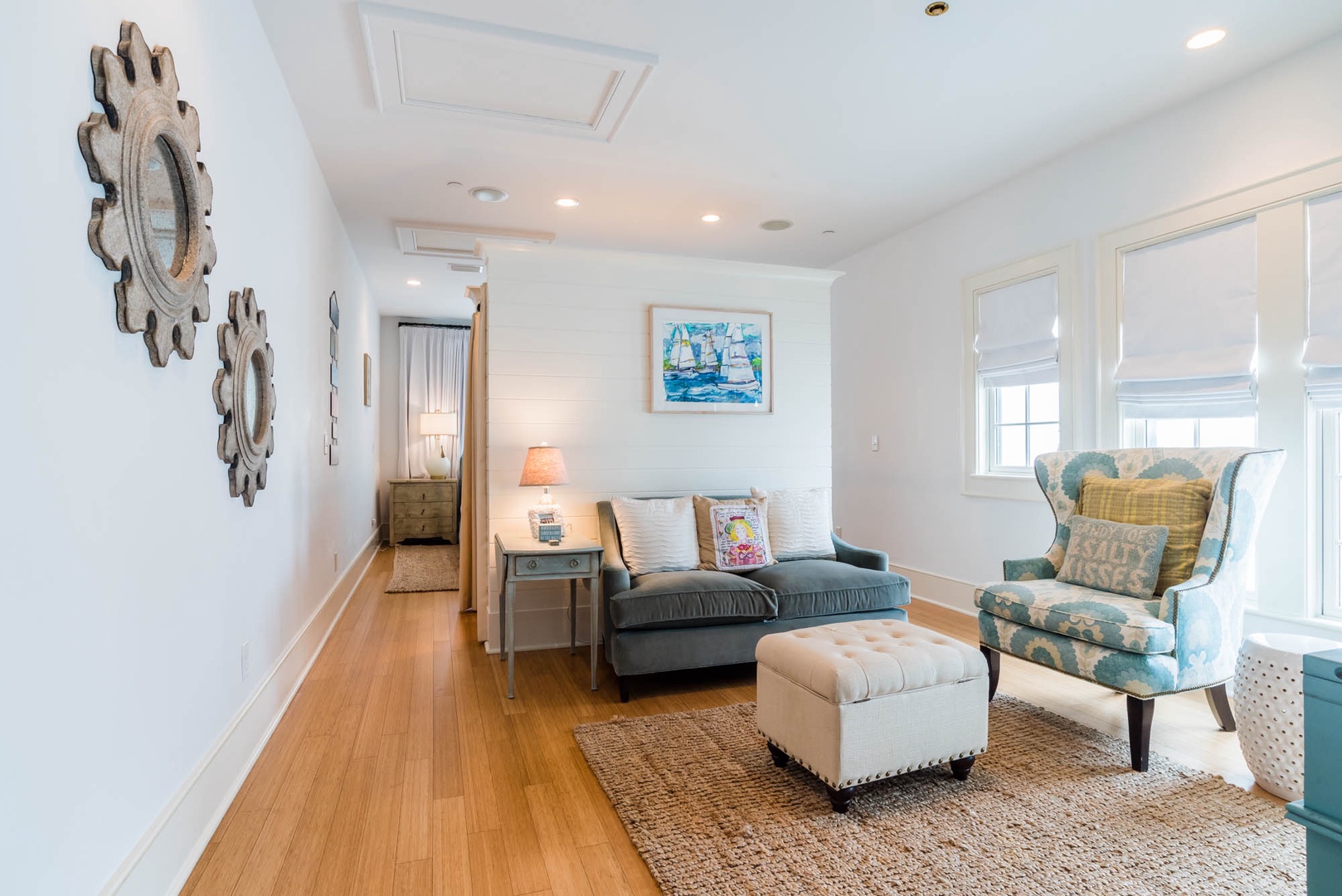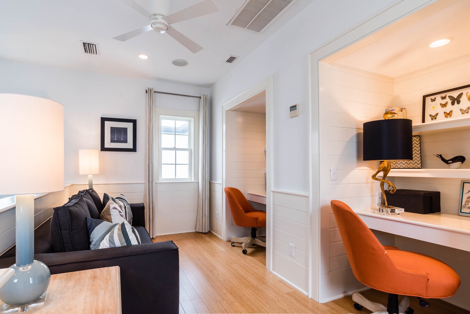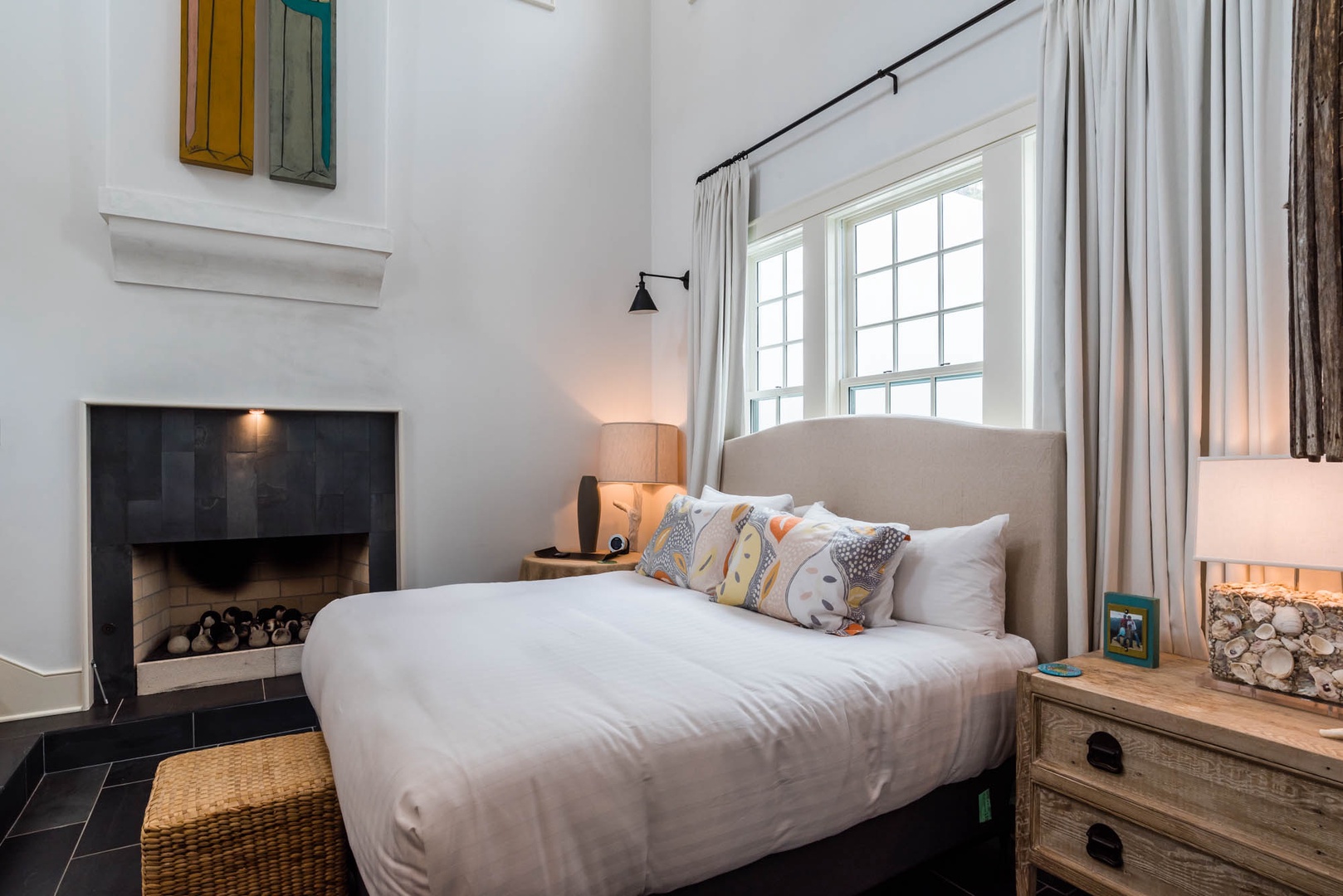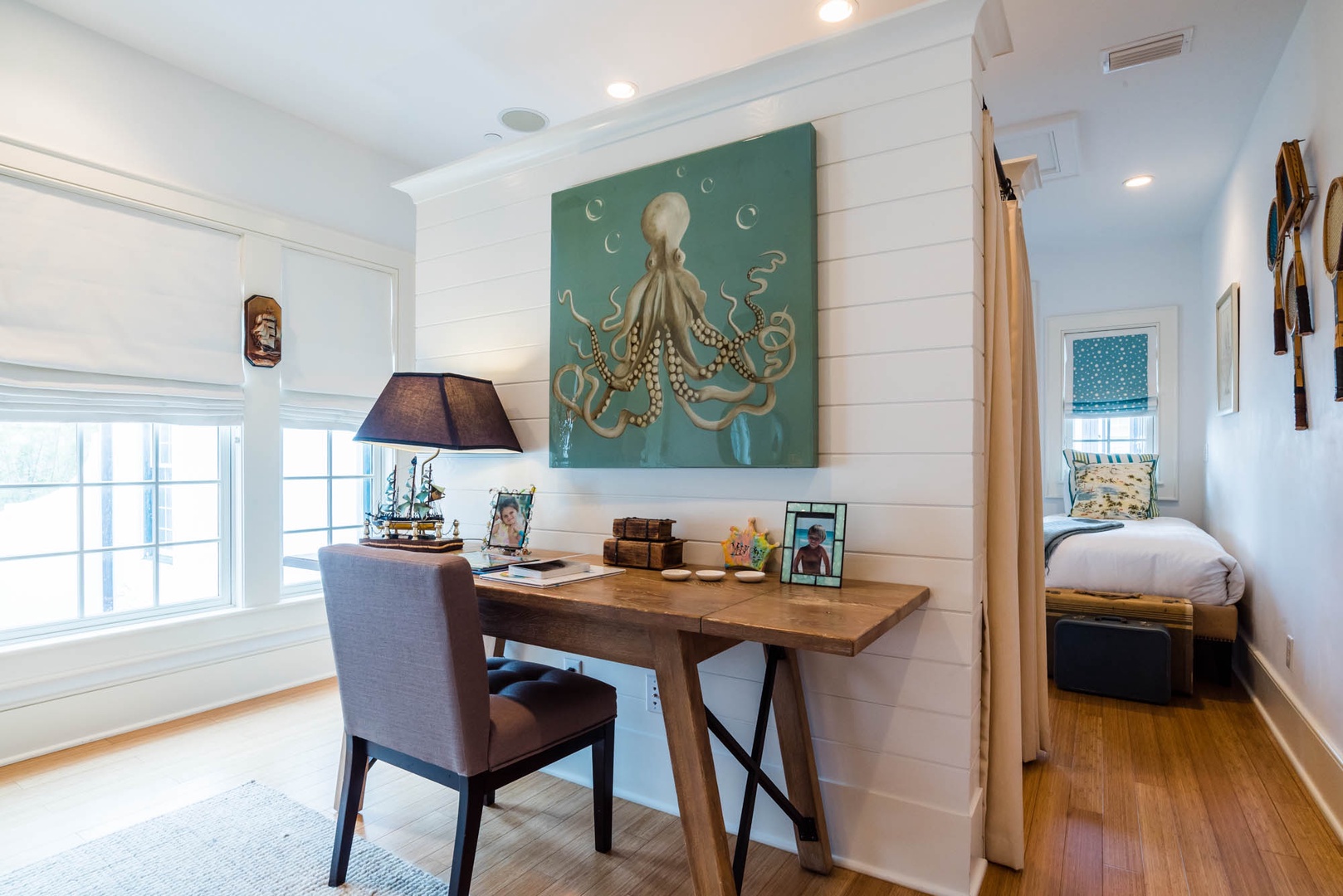The courtyard house is practically a trademark of Alys Beach. With its stand-alone main rooms joined by a series of French doors, there is no more authentic Alys Beach experience than a courtyard house rental. This 4 bedroom, 4.5 bath home has a centrally located courtyard with a private pool. The private, detached primary suite includes a comfortable study in its loft. A covered zaguan provides a shady entrance to the main rooms. Upstairs are 2 spacious king bedroom suites and a twin bedroom with its own study area.
