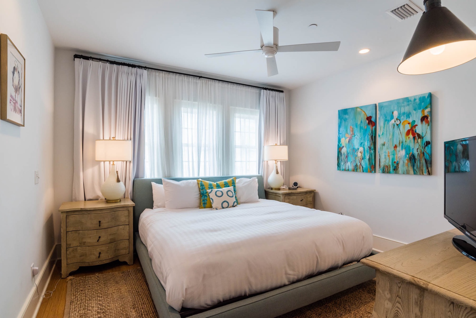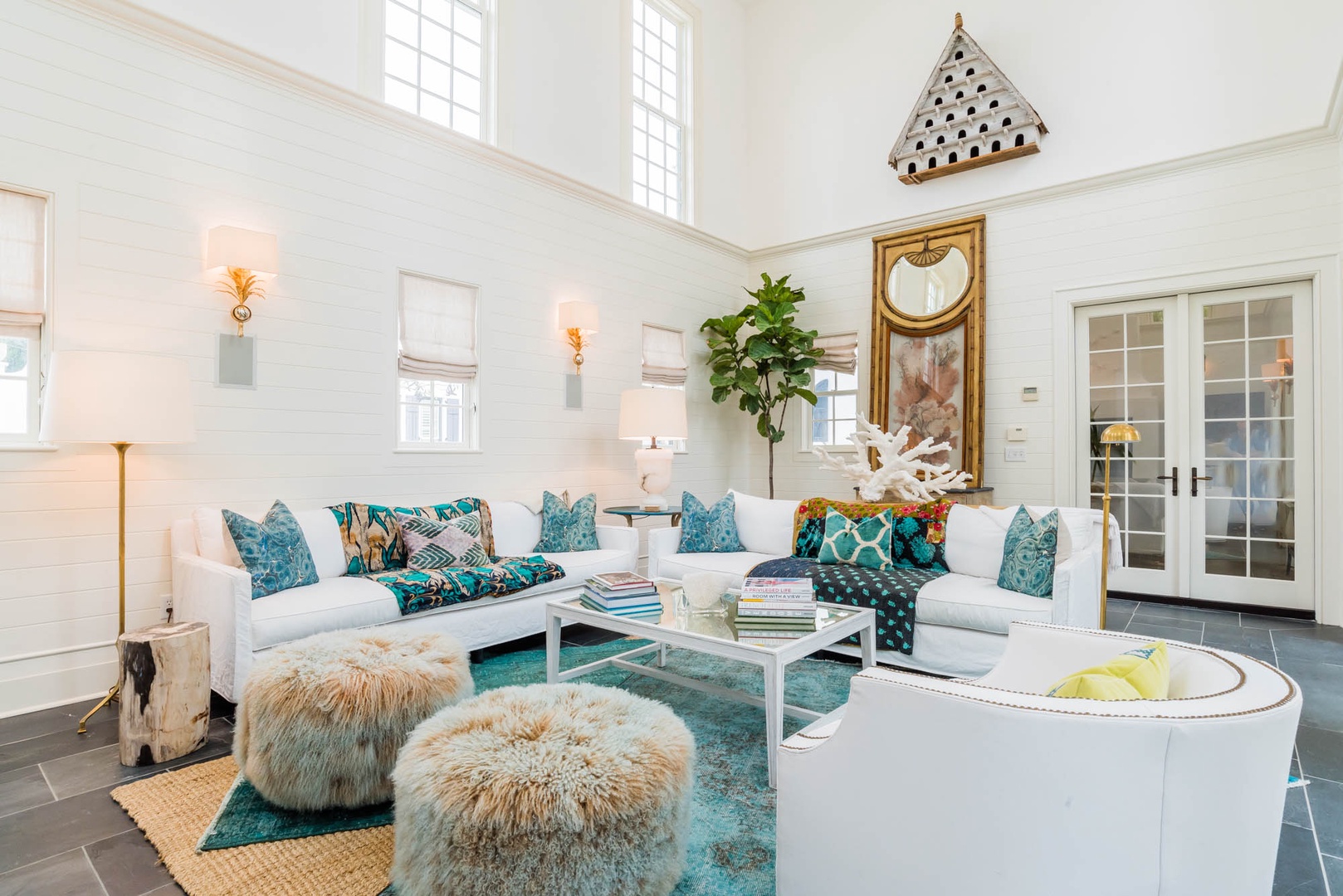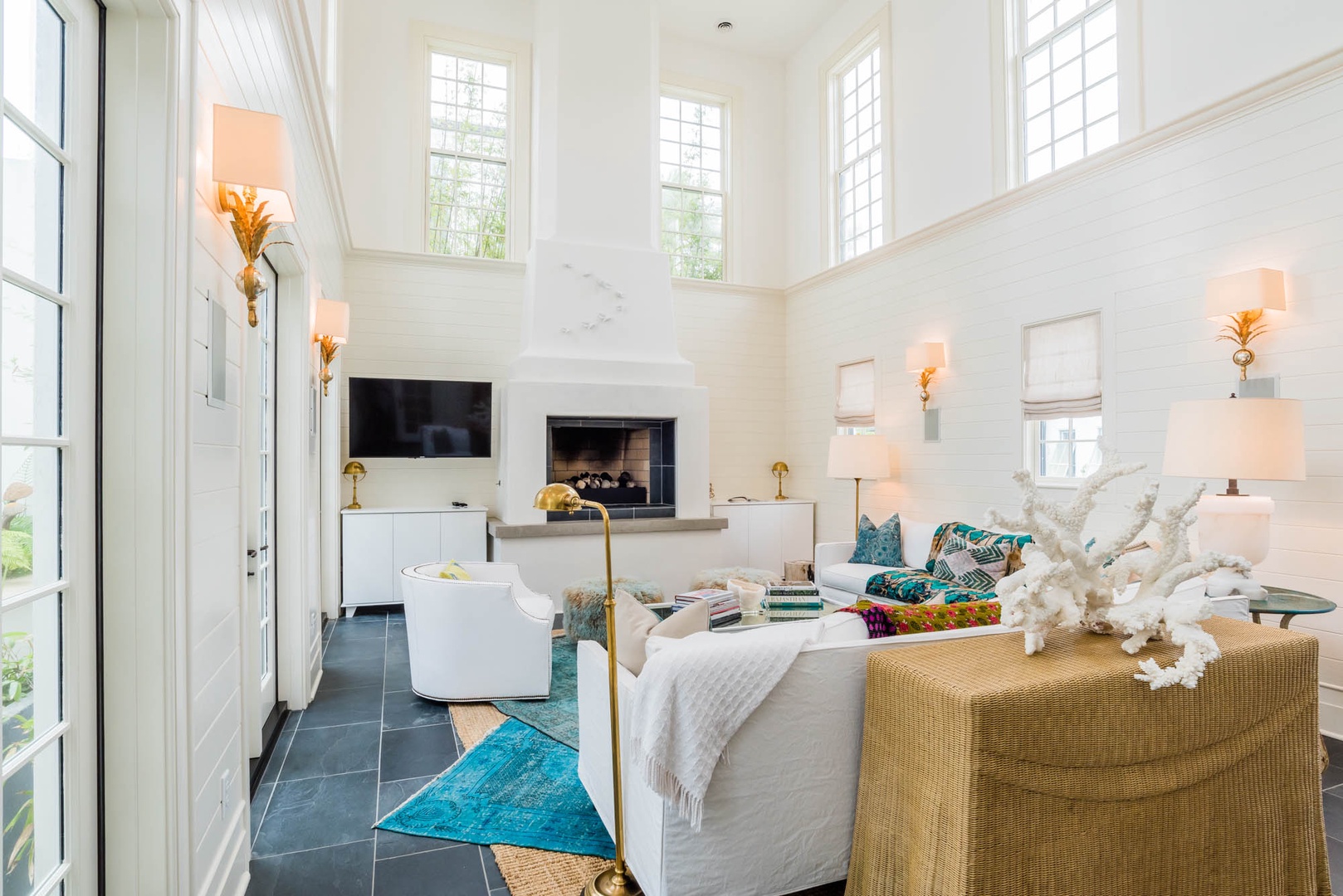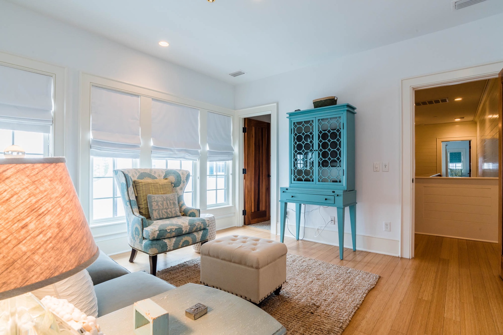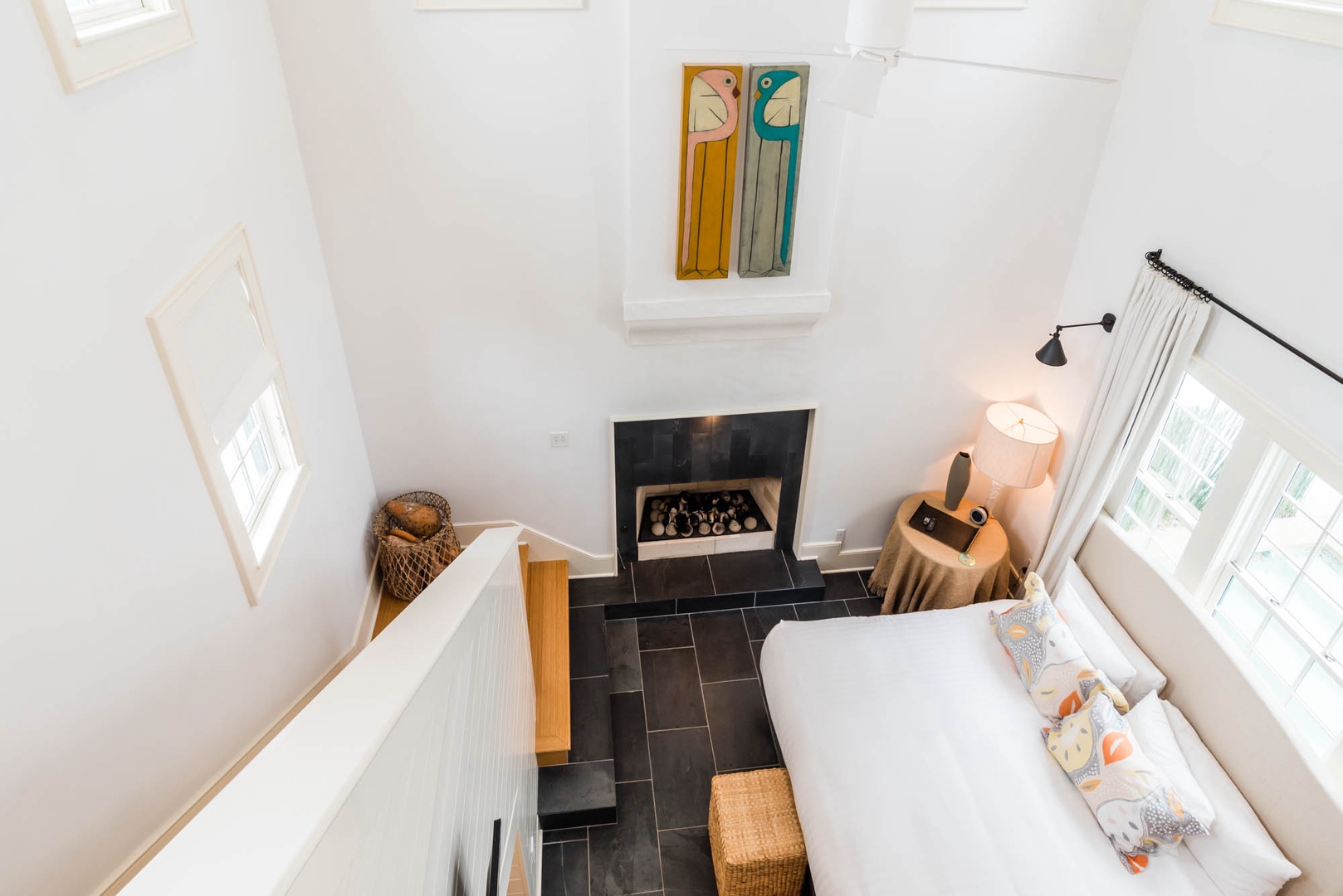The courtyard house is practically a trademark of Alys Beach. With its stand-alone main rooms joined by a series of French doors, there is no more authentic Alys Beach experience than a courtyard house rental. This 4 bedroom, 4.5 bath home has a centrally located courtyard with a private pool. The private, detached primary suite includes a comfortable study in its loft. A covered zaguan provides a shady entrance to the main rooms. Upstairs are 2 spacious king bedroom suites and a twin bedroom with its own study area.