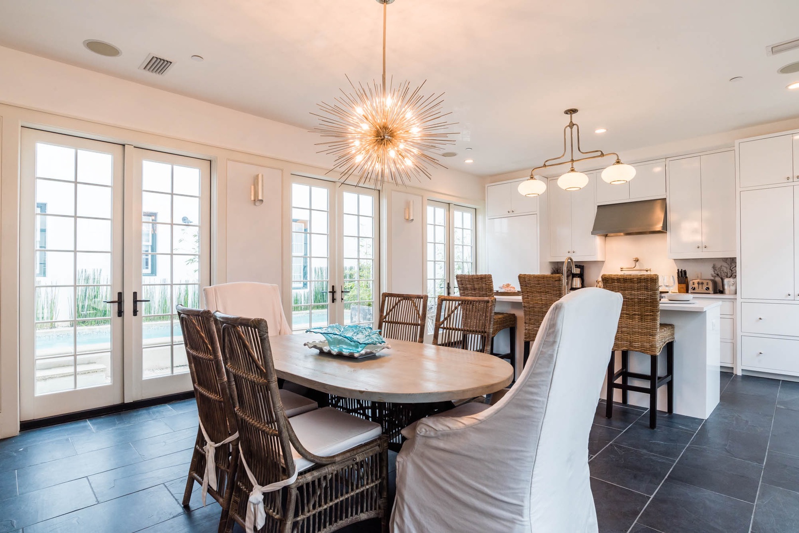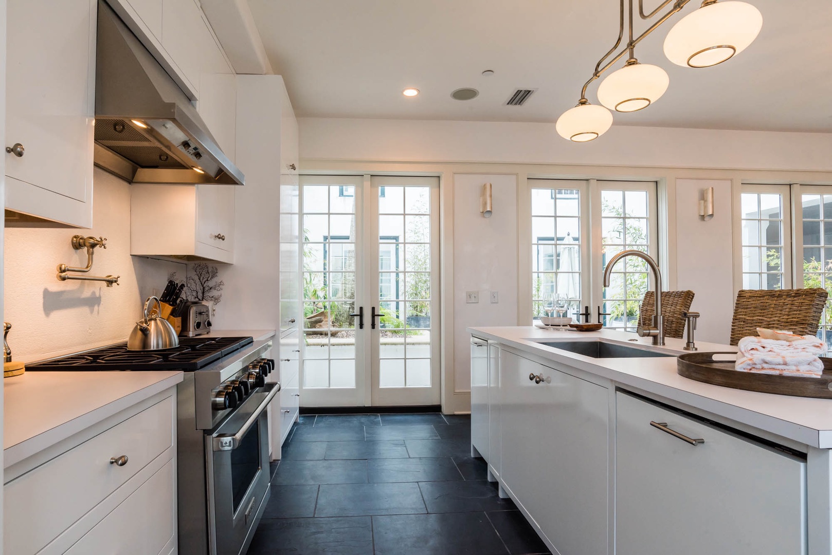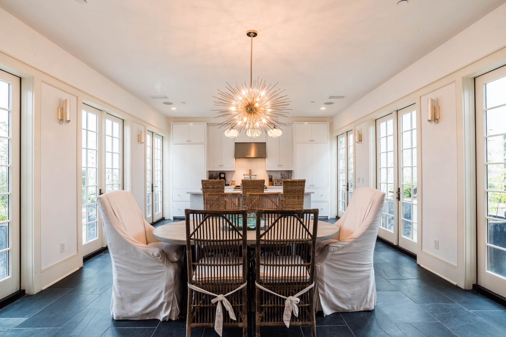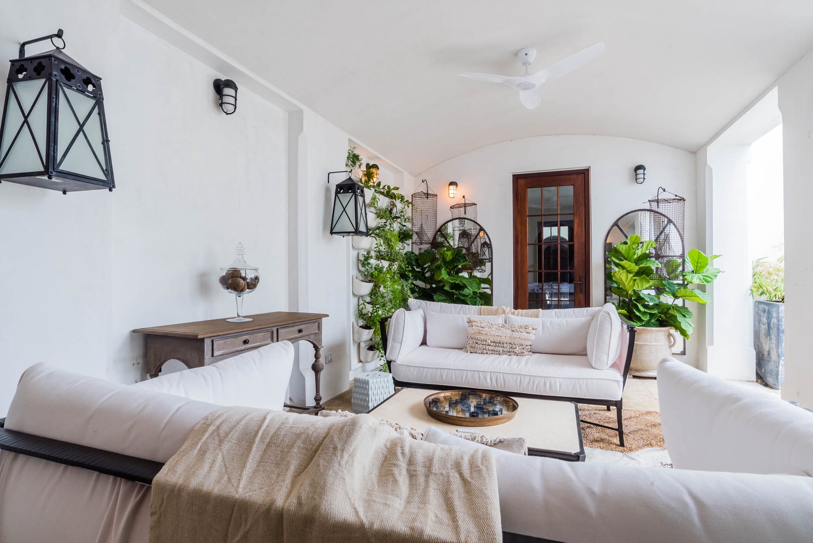 The courtyard house is practically a trademark of Alys Beach. With its stand-alone main rooms joined by a series of French doors, there is no more authentic Alys Beach experience than a courtyard house rental. This 4 bedroom, 4.5 bath home has a centrally located courtyard with a private pool. The private, detached primary suite includes a comfortable study in its loft. A covered zaguan provides a shady entrance to the main rooms. Upstairs are 2 spacious king bedroom suites and a twin bedroom with its own study area.