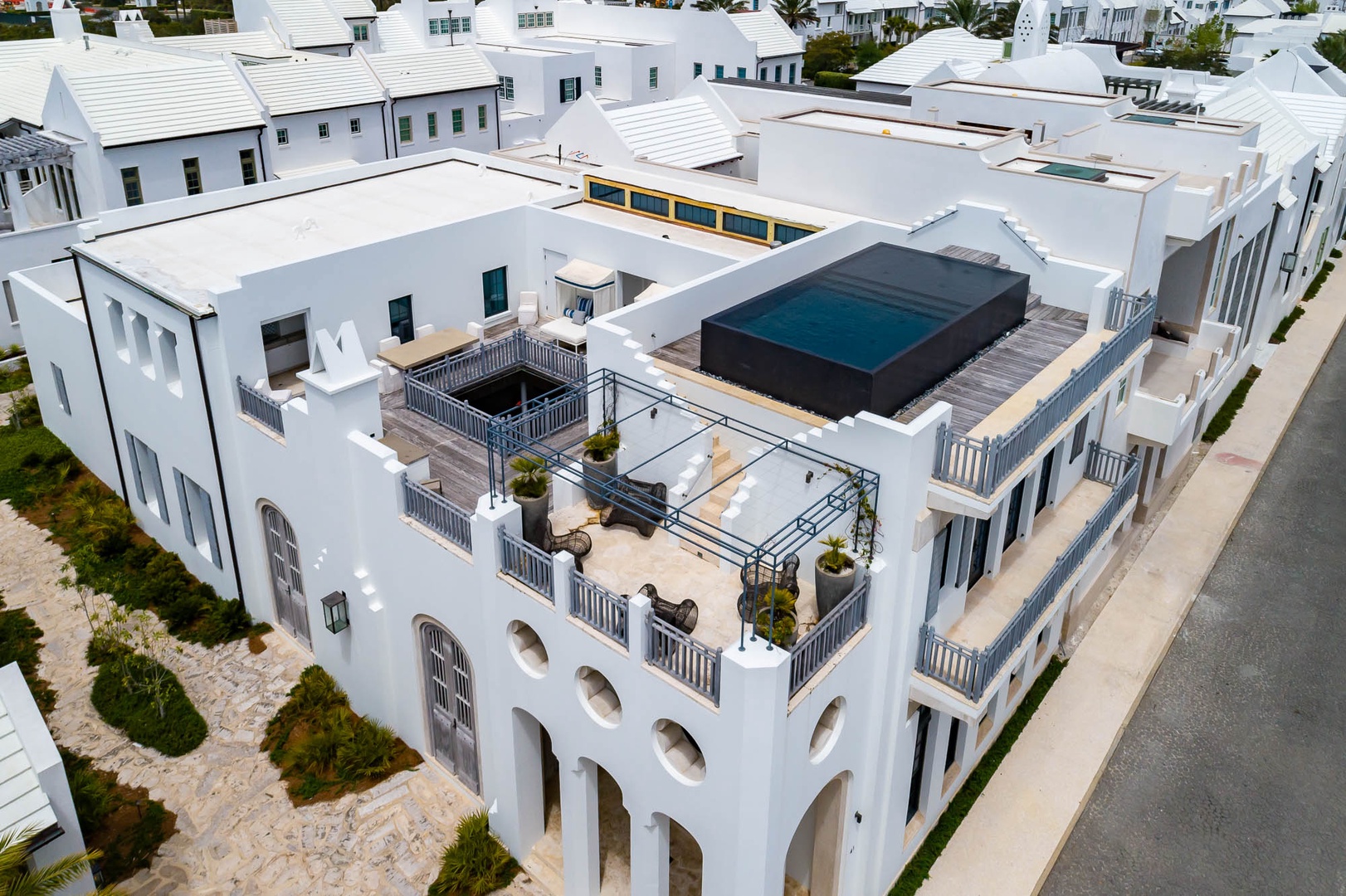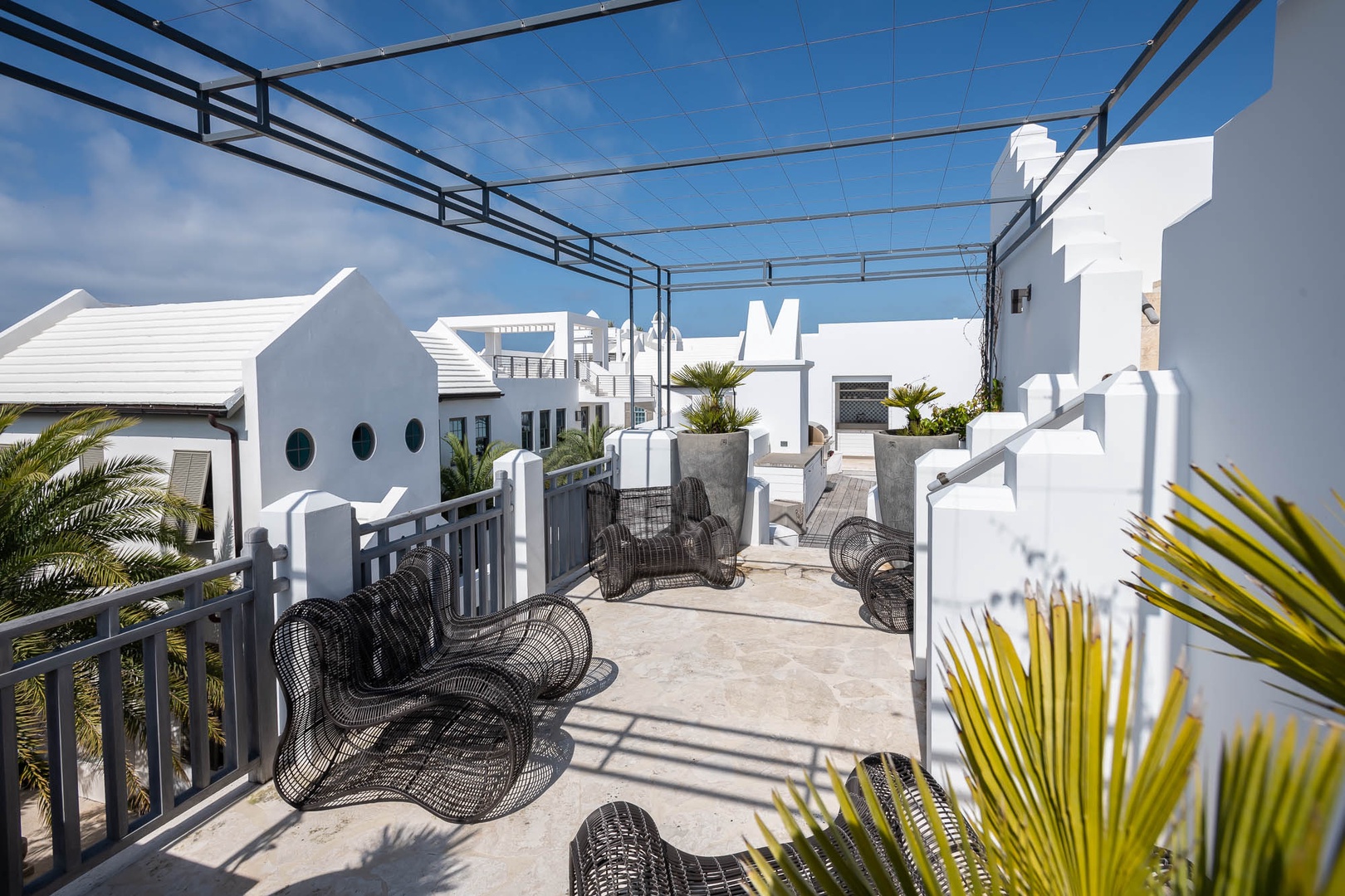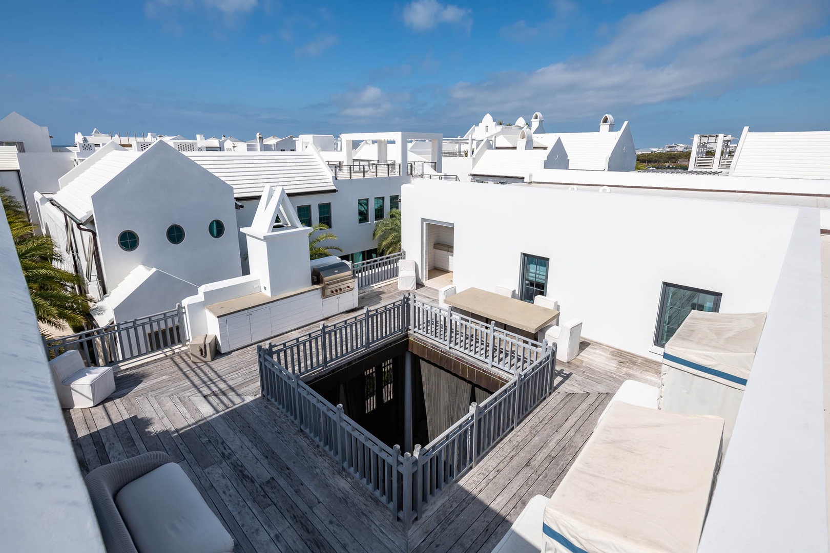 This one-of-a-kind Alys Beach Vacation home offers an unbelievable experience to all guests. The first-floor courtyard resembles an atrium surrounding a splash pool and hot tub. The spacious, open family room with high ceilings offers ample seating, a dining area and kitchen with large center island. The master suite with a king-sized bed is designed around an open-air courtyard and fountain. A half-bath and small TV den complete the lower level. The second level offers four bedrooms, all with private baths. A large bedroom with a king-sized bed offers separation from the rest of the bedrooms on this level. On an opposite hallway, two bedrooms, each with one full-sized bed, and one bedroom with three single beds are found. The laundry area is also located on the second level. Opening from the second floor, guests in this home will discover a large rooftop terrace with spectacular views, a built-in grill and wetbar area and large outdoor dining area. Finally, one level higher than the terrace, guests will enjoy an incredible rim overflow swimming pool. Parking for this home is located in two marked spaces in a parking court.