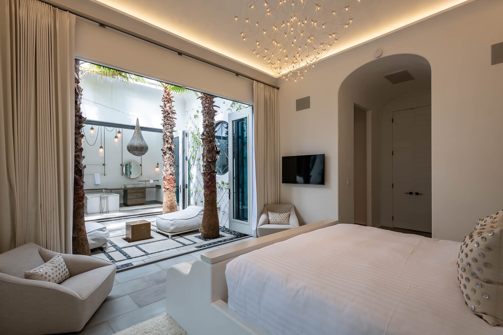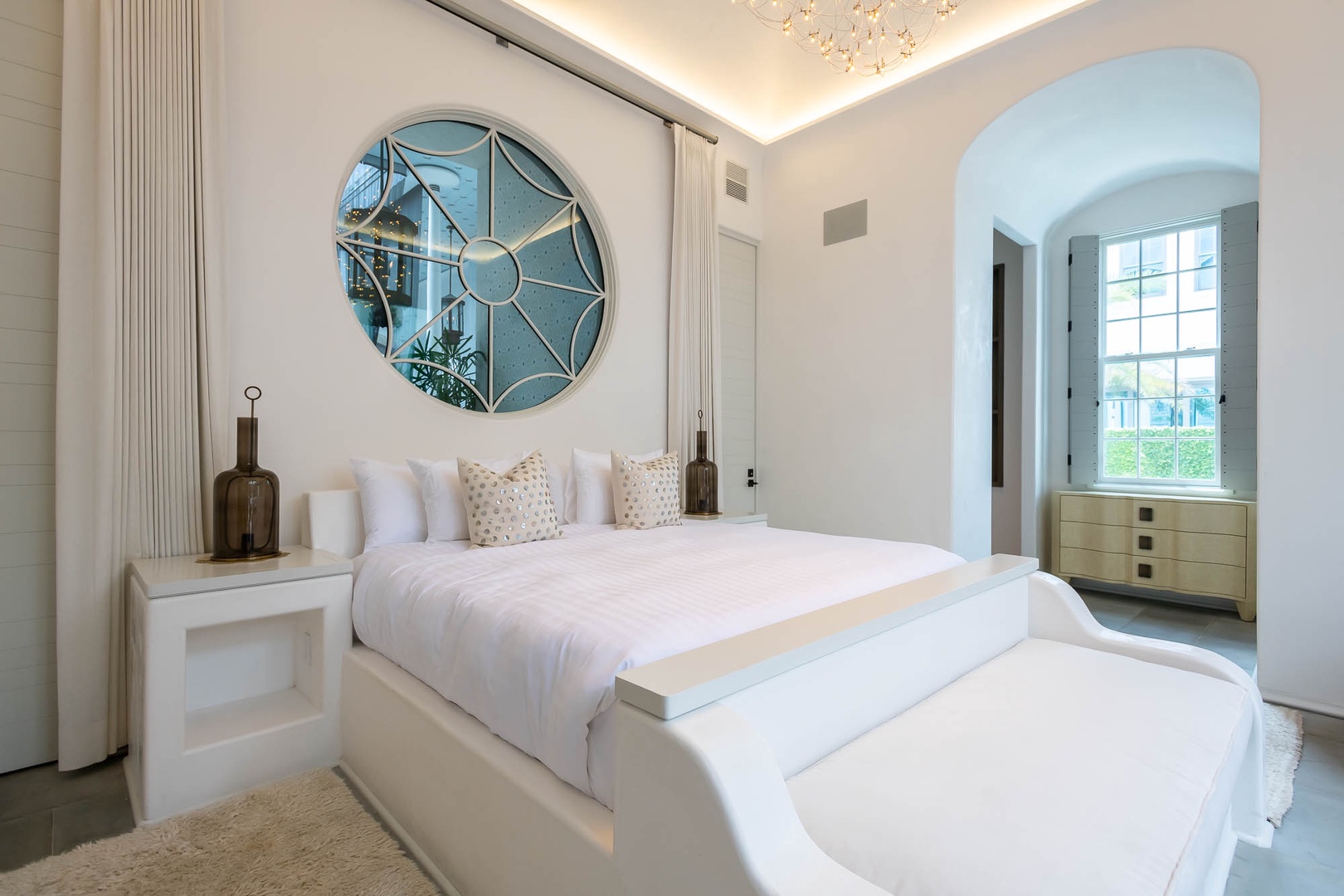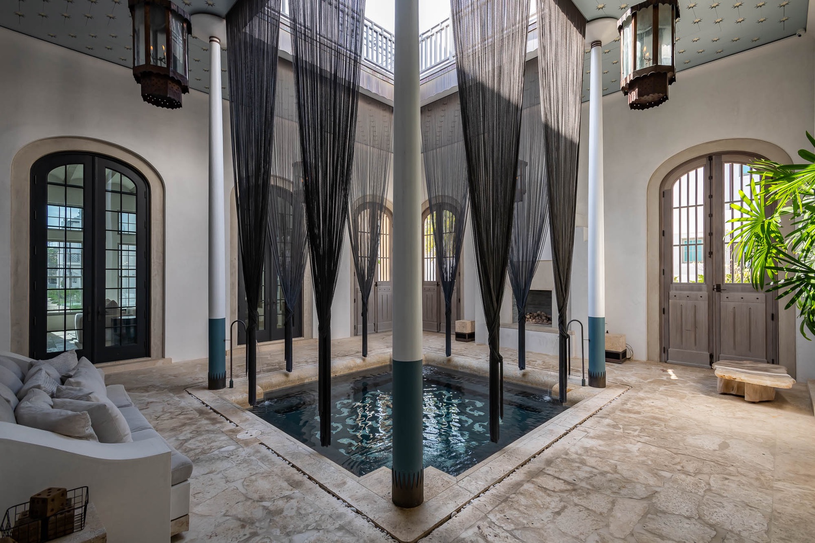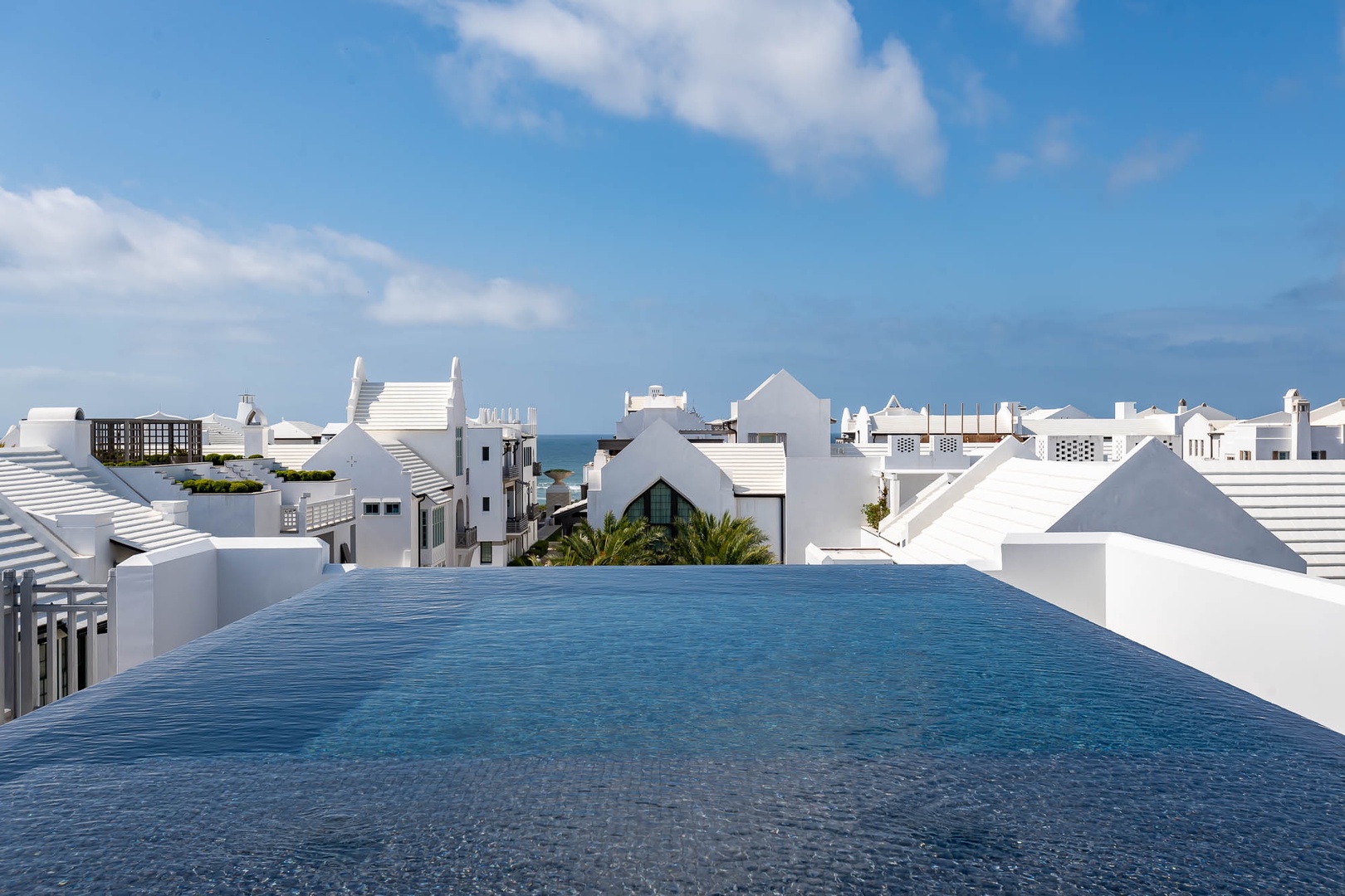This one-of-a-kind Alys Beach Vacation home offers an unbelievable experience to all guests. The first-floor courtyard resembles an atrium surrounding a splash pool and hot tub. The spacious, open family room with high ceilings offers ample seating, a dining area and kitchen with large center island. The master suite with a king-sized bed is designed around an open-air courtyard and fountain. A half-bath and small TV den complete the lower level. The second level offers four bedrooms, all with private baths. A large bedroom with a king-sized bed offers separation from the rest of the bedrooms on this level. On an opposite hallway, two bedrooms, each with one full-sized bed, and one bedroom with three single beds are found. The laundry area is also located on the second level. Opening from the second floor, guests in this home will discover a large rooftop terrace with spectacular views, a built-in grill and wetbar area and large outdoor dining area. Finally, one level higher than the terrace, guests will enjoy an incredible rim overflow swimming pool. Parking for this home is located in two marked spaces in a parking court.