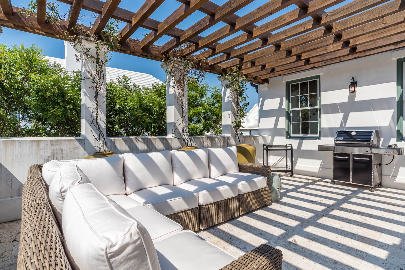 When you want it to just be about friends and family, you’ll be well rewarded with a courtyard offering ample seating around a refreshing dipping pool and the natural attraction of a fireplace. And when you want the complete Alys Beach experience, it’s just outside your door along the main pedestrian path, Sea Garden Walk. With 2 bedrooms, and the primary suite, on the first floor and 2 more on the upper floor, this vacation rental makes accommodation effortless. A gourmet kitchen with limestone island and top-of-the-line appliances adds luxury to this beach getaway. With unique gathering spaces throughout and a rooftop terrace offering stunning views, this home is the ideal vacation oasis.Three bedrooms, including the primary bedroom are on the first floor. The second floor has two bedrooms with a “Jack and Jill” bathroom and a rooftop terrace. From the rooftop terrace enjoy stunning sunsets and vignettes of surrounding Alys Beach. Parking for this home is two designated spaces in a parking court.