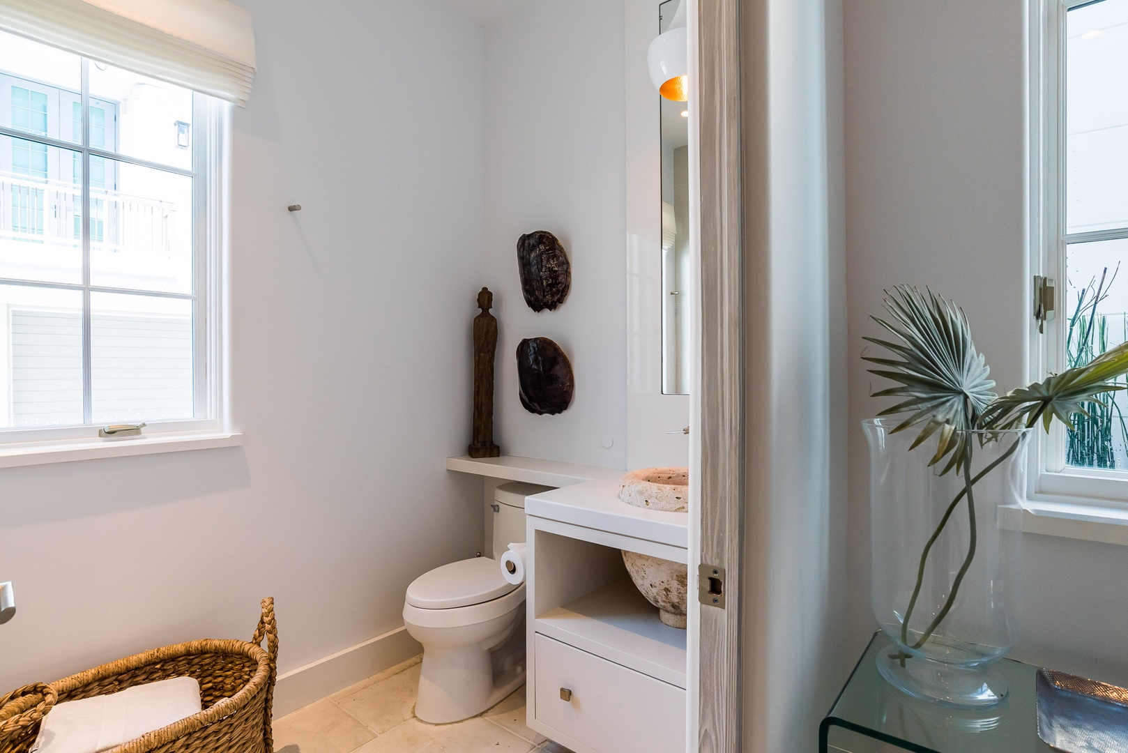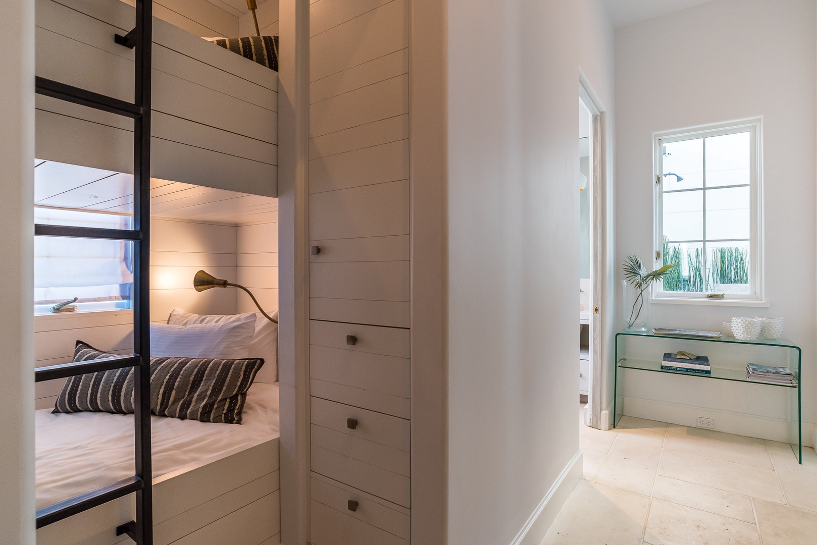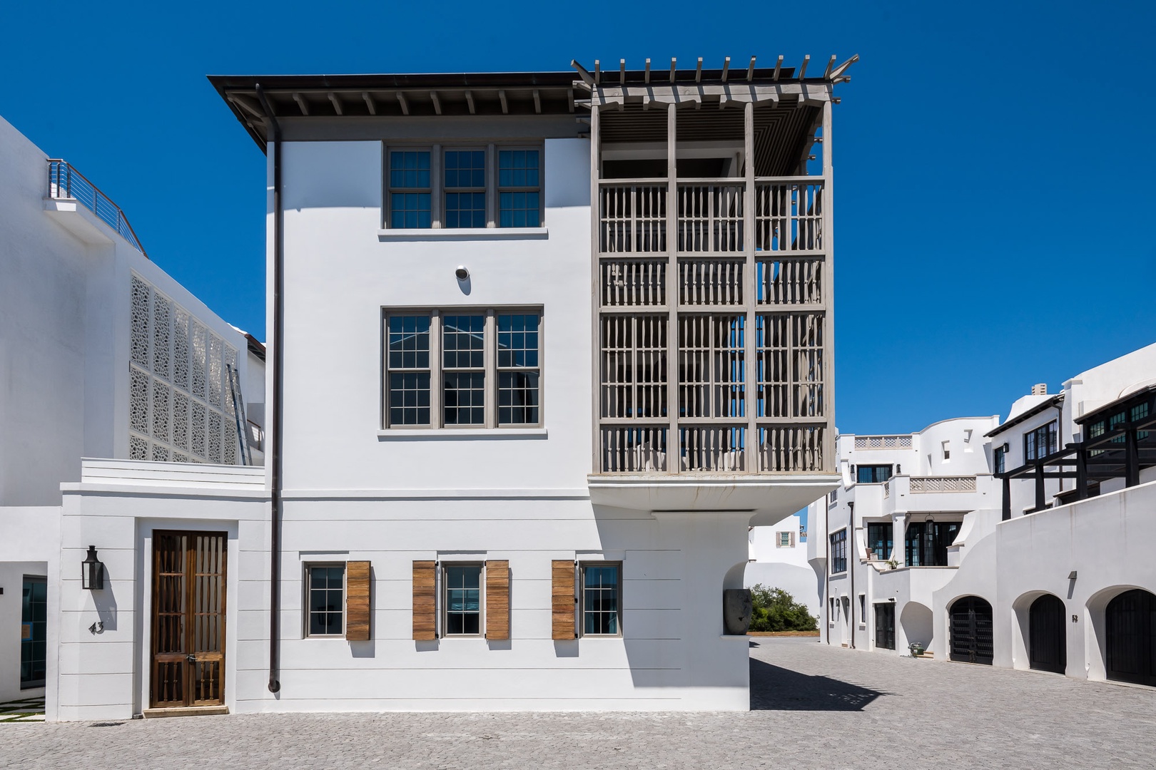 This impressive Alys Beach Vacation Rental home, located on a very private and quiet fully built-out alley, was designed by noted architectural firm Khoury-Vogt and has been featured in several magazines such as VIE and In Niche. The home sits one row back from the Gulf and offers water views from five different rooms thanks to careful placement of front-row homes. Entering from Sea Venture Alley you will find an open courtyard with pool that provides shade much of the day. The ground level offers a bedroom with a queen-sized bed as well as a bunk area with one set of bunk beds. The bedroom and the bunk area share a full bath and are perfect for multiple families seeking separate private areas. The second floor offers a half-bath as well as a spacious great room and open kitchen with a large center island. Both rooms, as well as a balcony off of the great room, provide direct water views. The third floor offers the primary bedroom with a private balcony facing the Gulf and attached primary bathroom with a large sunken tub/shower. Finally, another bedroom on this level offers a king-sized bed, private bathroom and a balcony with water views. Parking for this home is located in a two-car garage.