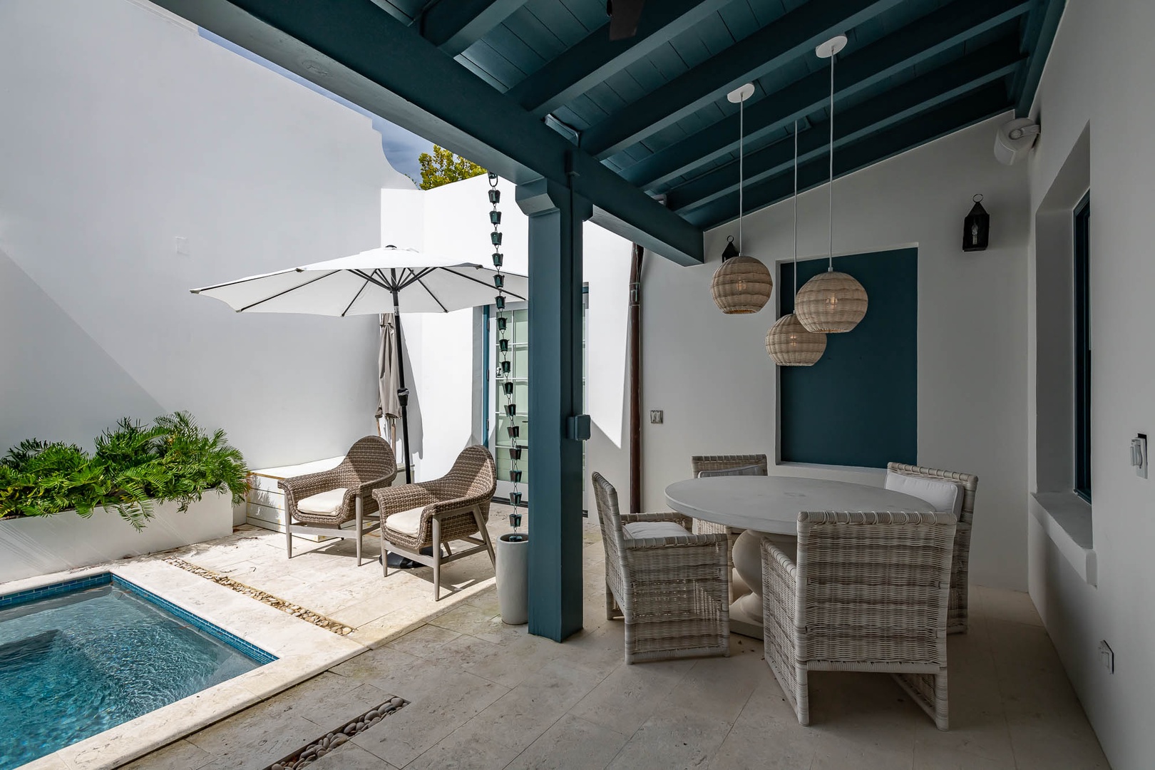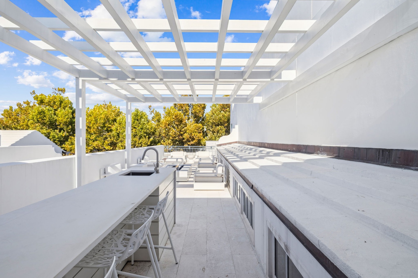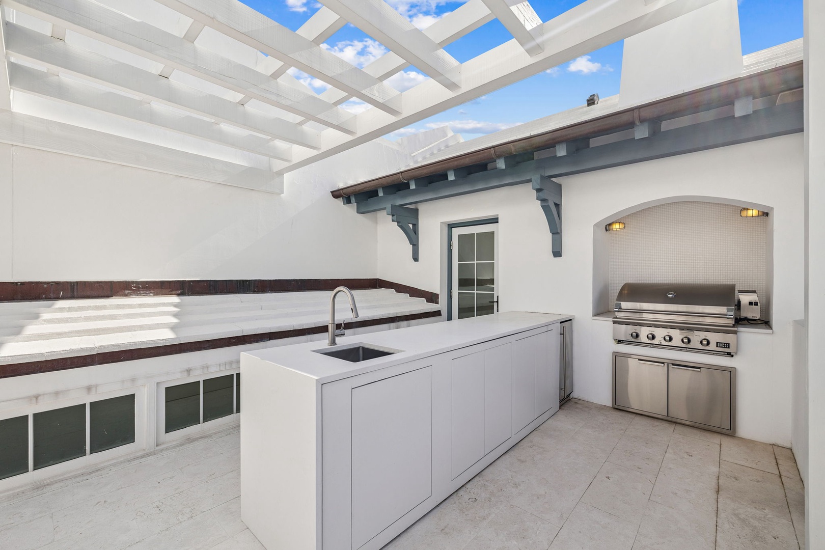 This renovated 3 bedroom, 3.5 bath Alys Beach home fronts the Sea Garden Pedestrian Path leading to the beach to the south and fire pit to the north. The spacious courtyard includes a beautiful new pool, outdoor dining area and porch swing that make it a perfect space for family gatherings. The first floor includes the en suite primary bedroom, open kitchen and living areas. The second floor includes the guest king bedroom and bath, as well as a roof-top terrace and summer kitchen perfect for a relaxing evening under the stars.