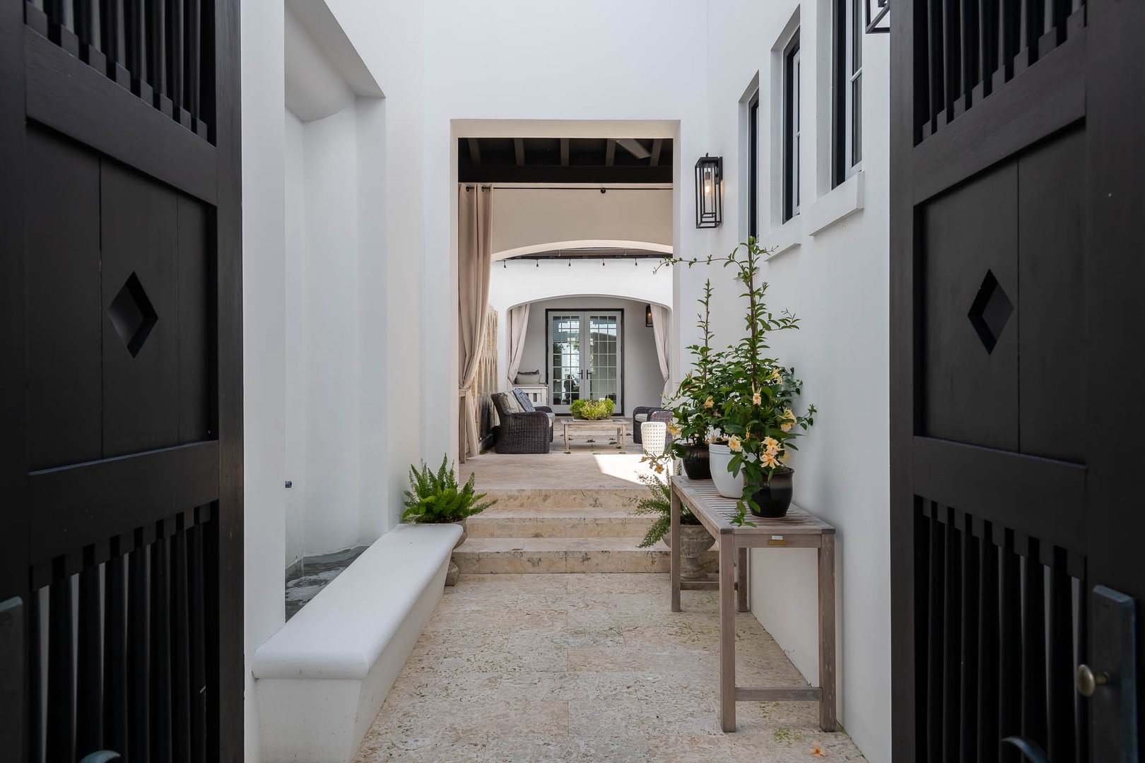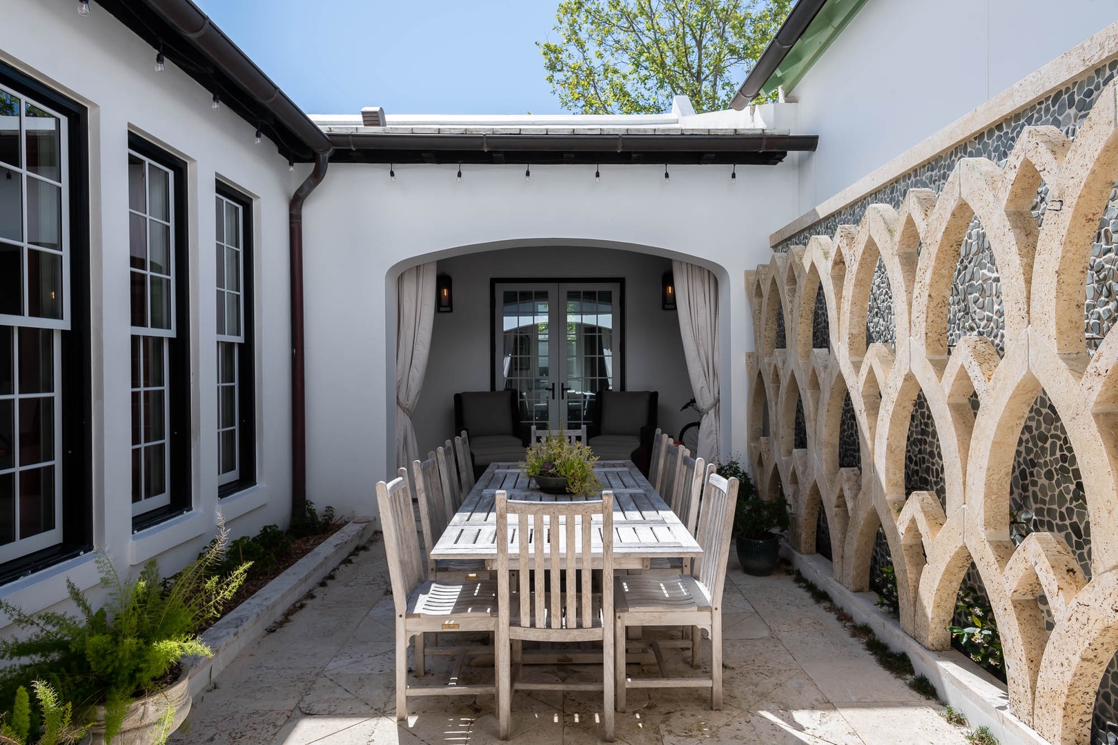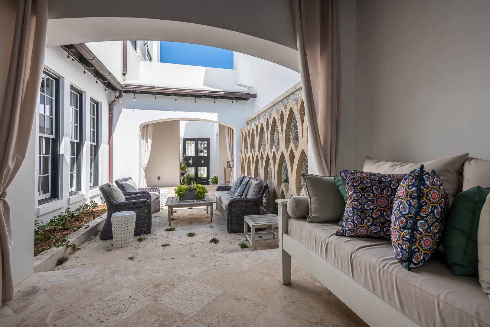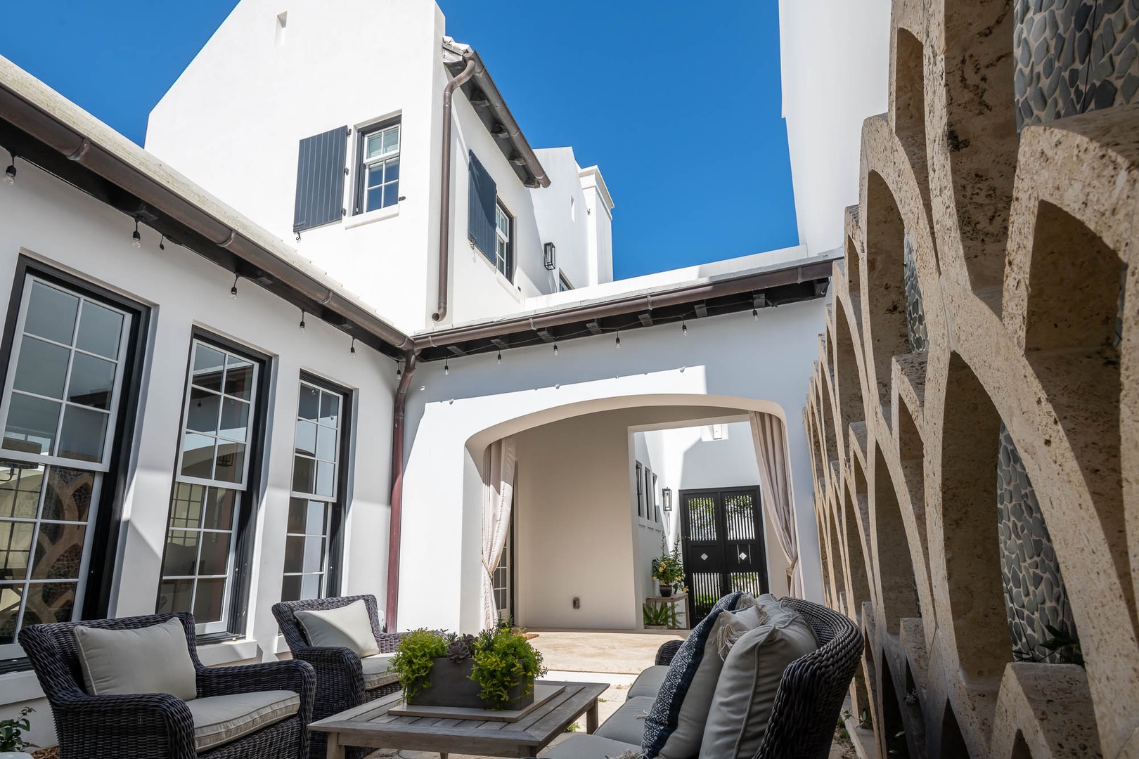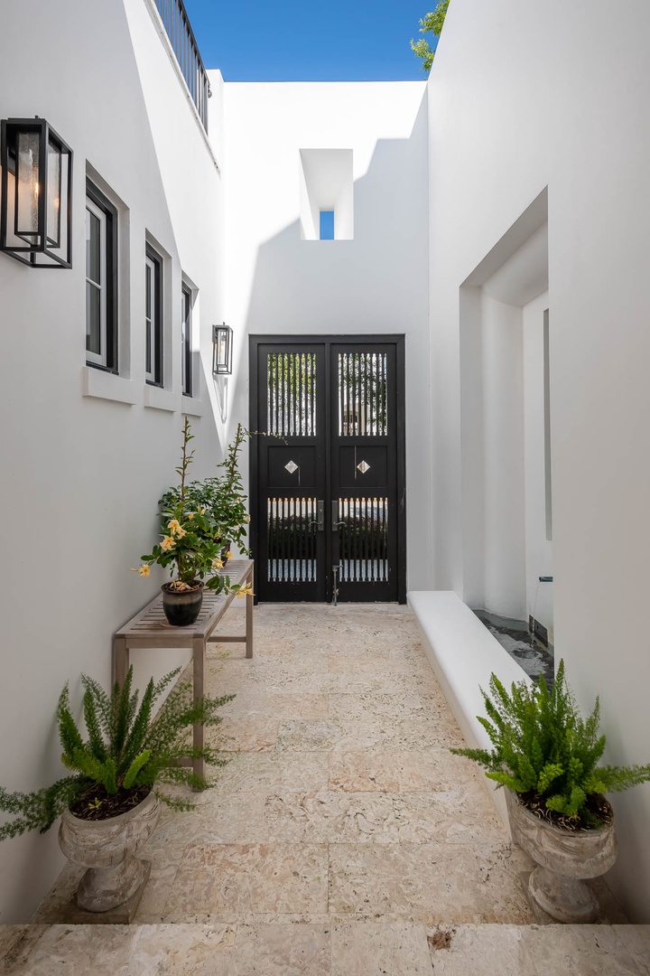 This Alys Beach vacation rental home is ideally situated on North Charles Street giving guests a short walk to the emerging Town Center, Caliza Pool Complex and the Gulf. On the first level, two separate courtyards, each with private loggias, offer quintessential Alys Beach living. The dining room looks out to each courtyard and is defined by a vaulted timber beam ceiling. A large living room provides a sense of comfort and ease with an inviting fireplace and 13-foot ceilings. The kitchen with a center island completes the public rooms on this level. Just off the kitchen, guests will find two bedrooms, one with a king-sized bed and the other with two full-sized beds. Both bedrooms feature private baths. The primary suite with a king-sized bed is found on the second level and offers ultimate privacy for guests. A small balcony is also found off the primary suite. Parking for this home is located in two designated spaces in a parking court.