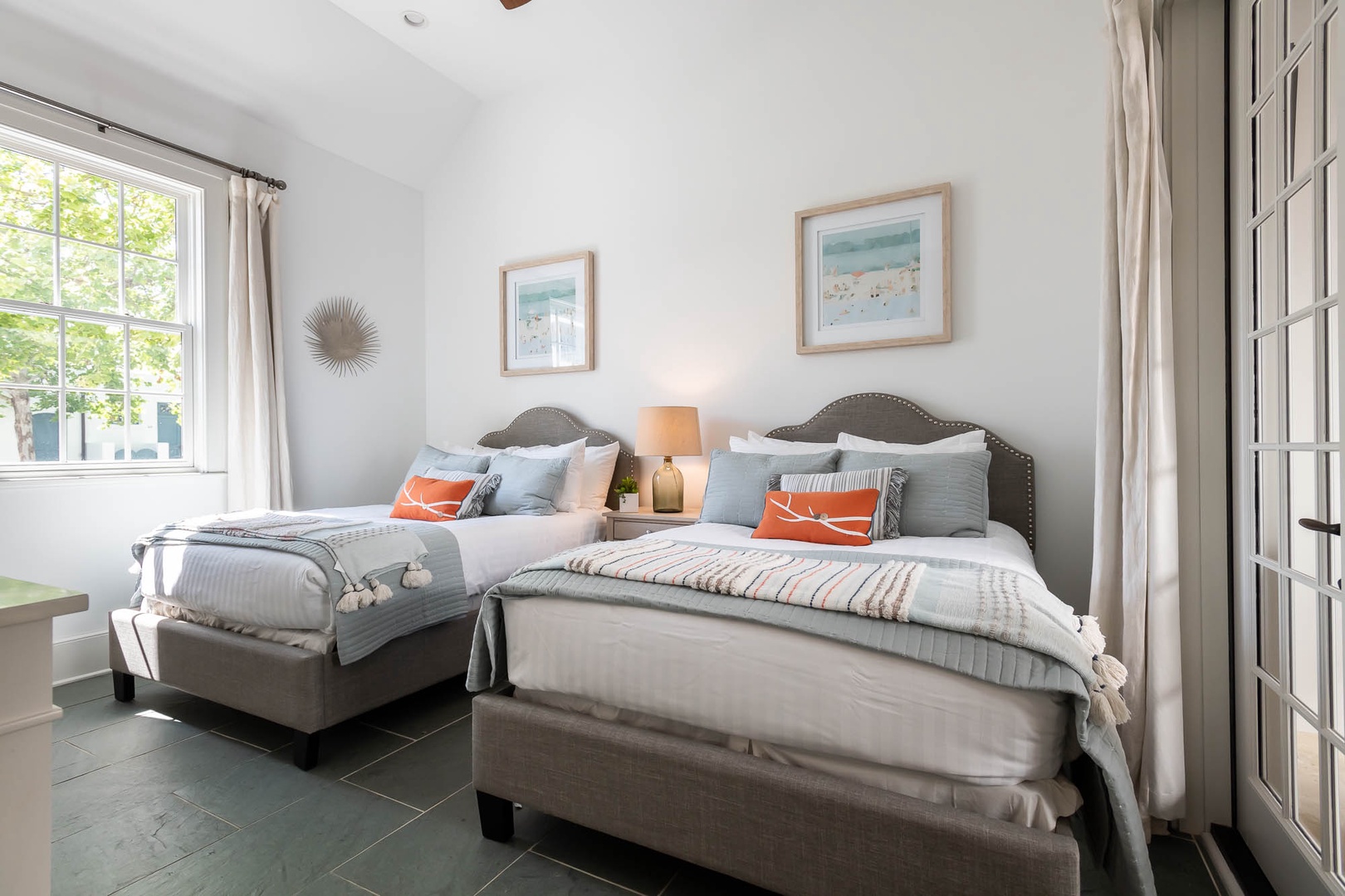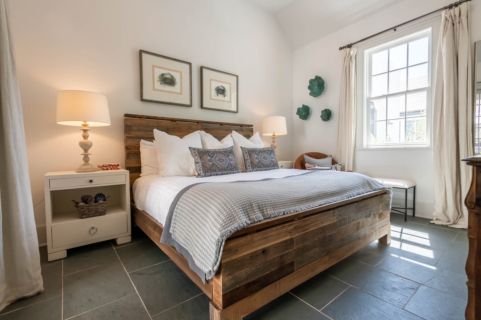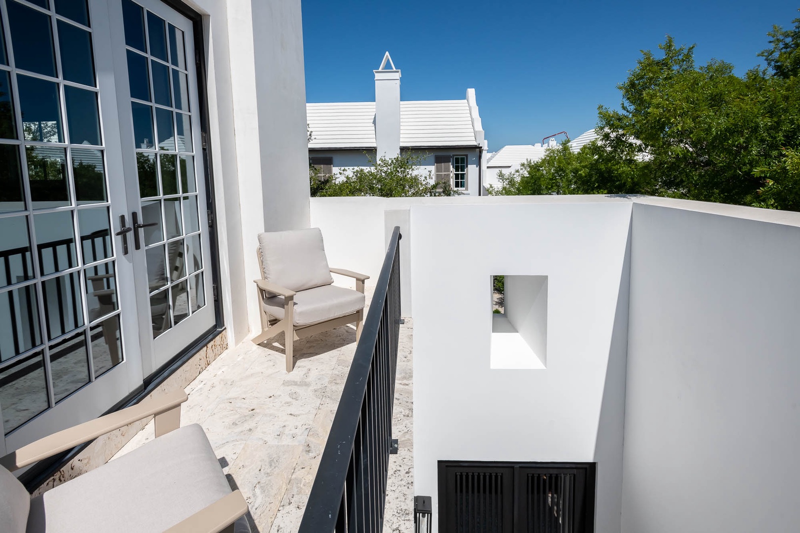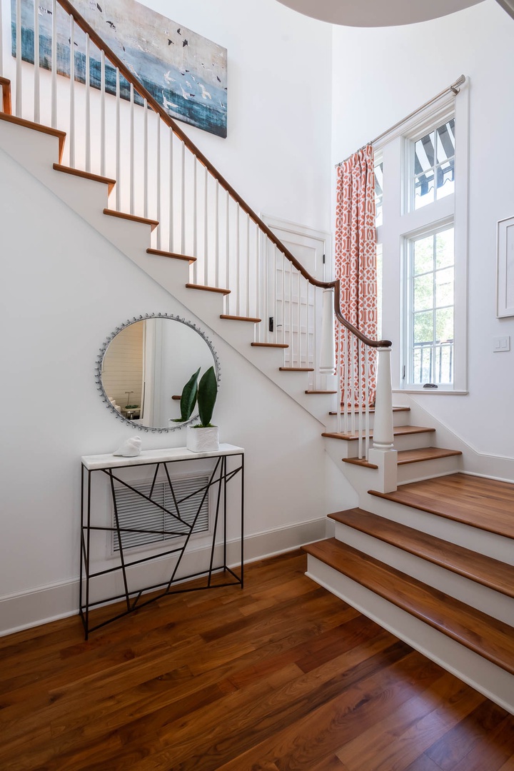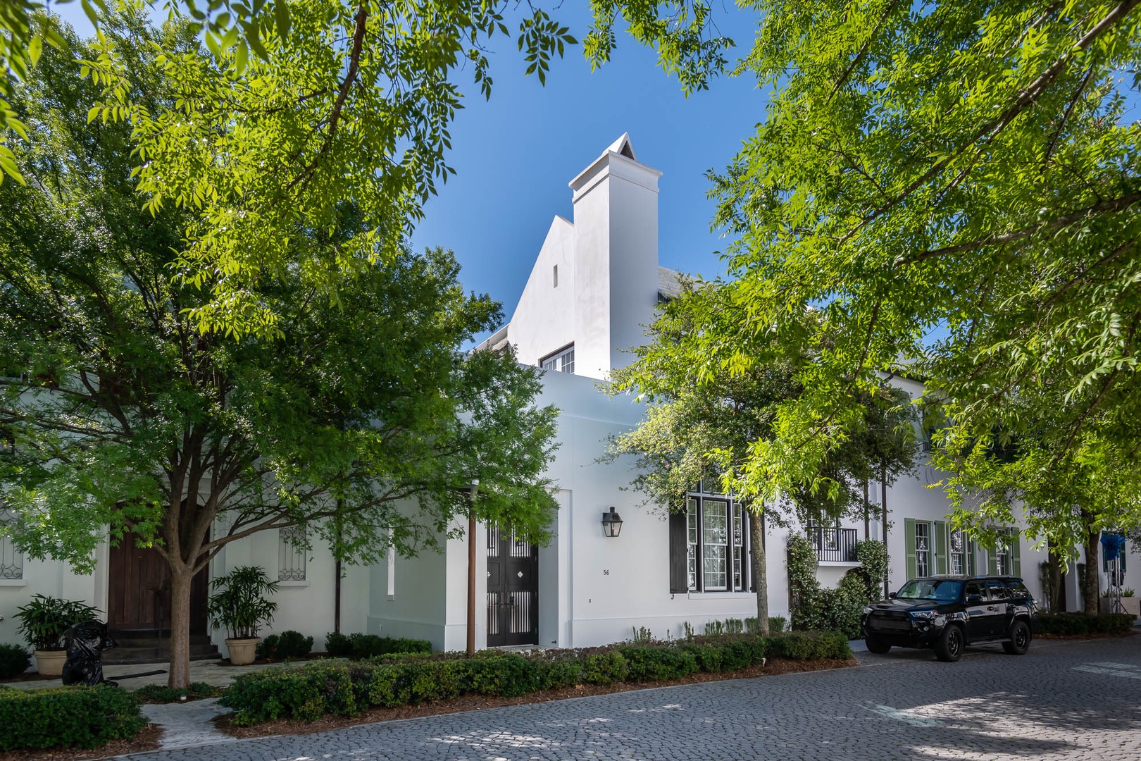 This Alys Beach vacation rental home is ideally situated on North Charles Street giving guests a short walk to the emerging Town Center, Caliza Pool Complex and the Gulf. On the first level, two separate courtyards, each with private loggias, offer quintessential Alys Beach living. The dining room looks out to each courtyard and is defined by a vaulted timber beam ceiling. A large living room provides a sense of comfort and ease with an inviting fireplace and 13-foot ceilings. The kitchen with a center island completes the public rooms on this level. Just off the kitchen, guests will find two bedrooms, one with a king-sized bed and the other with two full-sized beds. Both bedrooms feature private baths. The primary suite with a king-sized bed is found on the second level and offers ultimate privacy for guests. A small balcony is also found off the primary suite. Parking for this home is located in two designated spaces in a parking court.