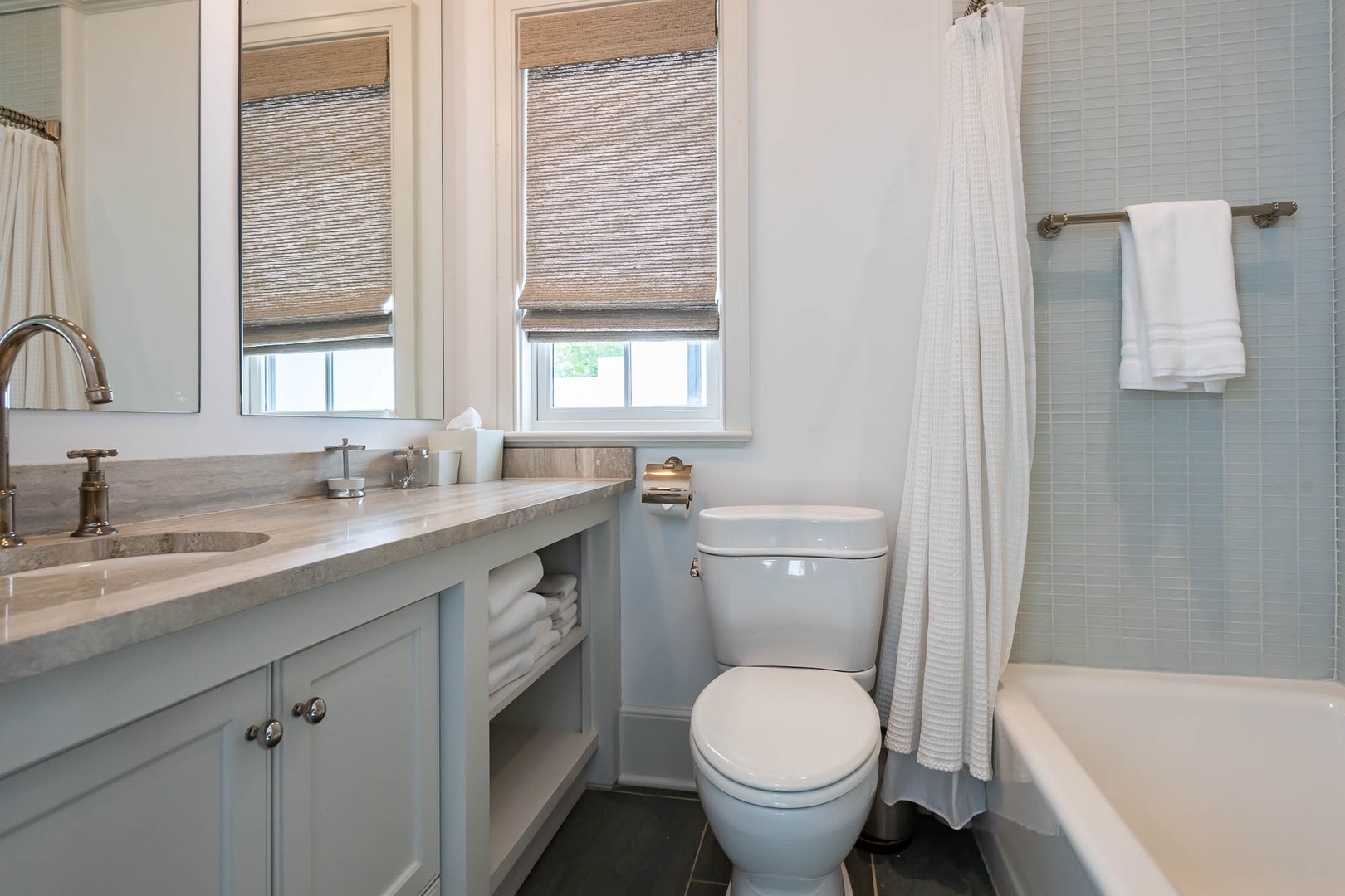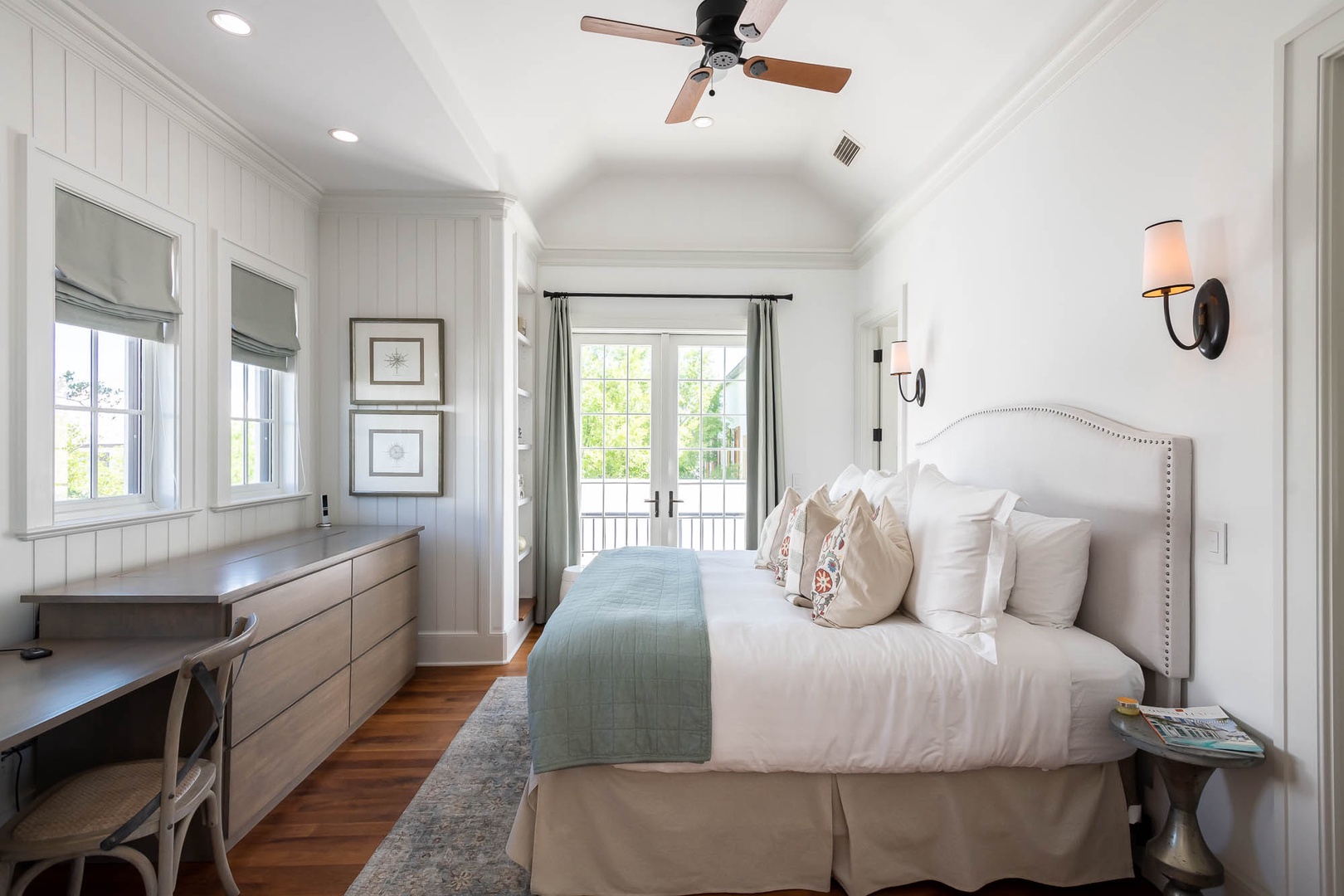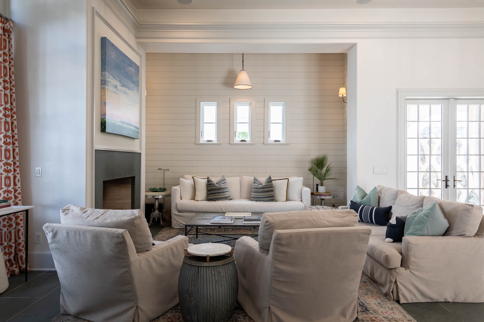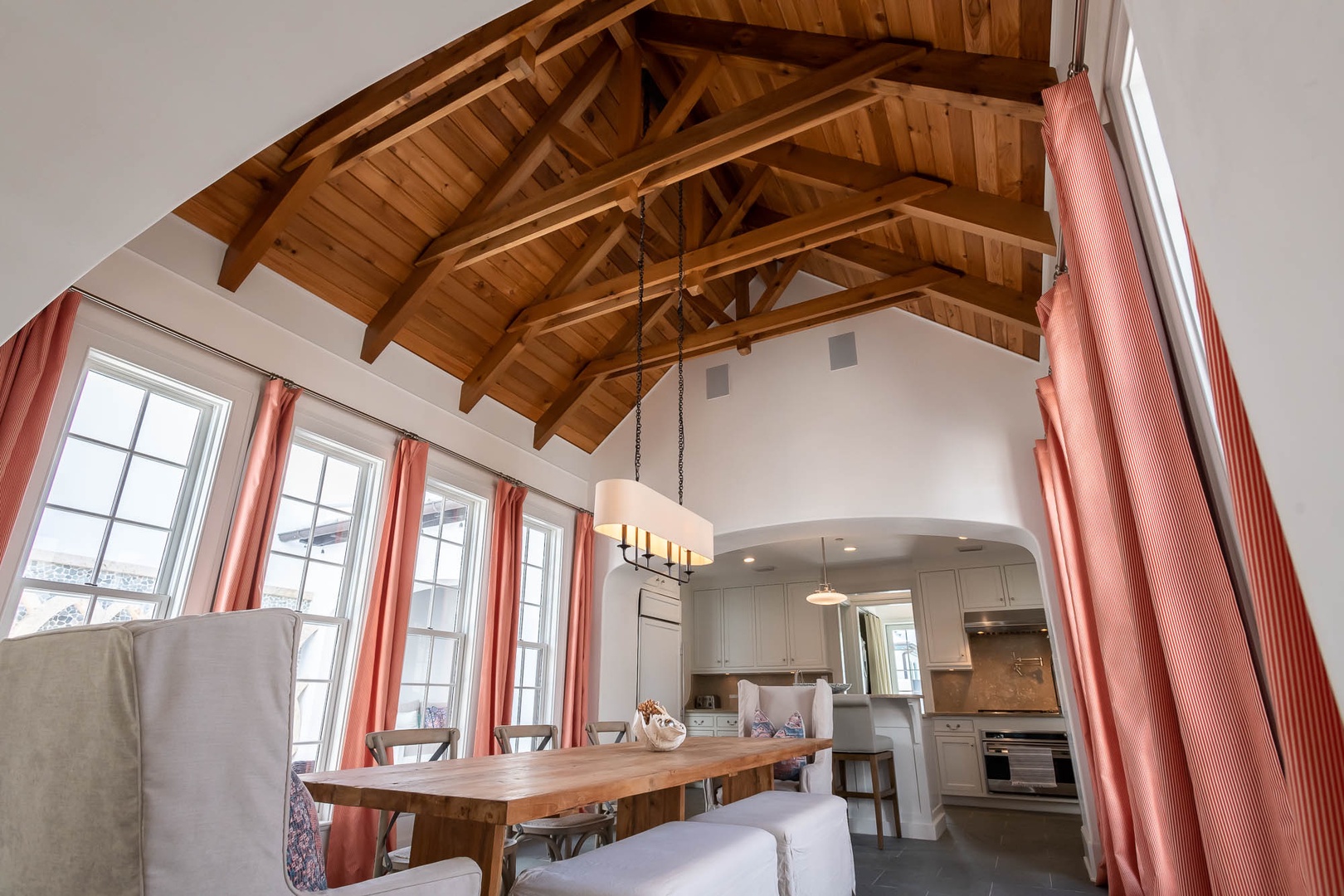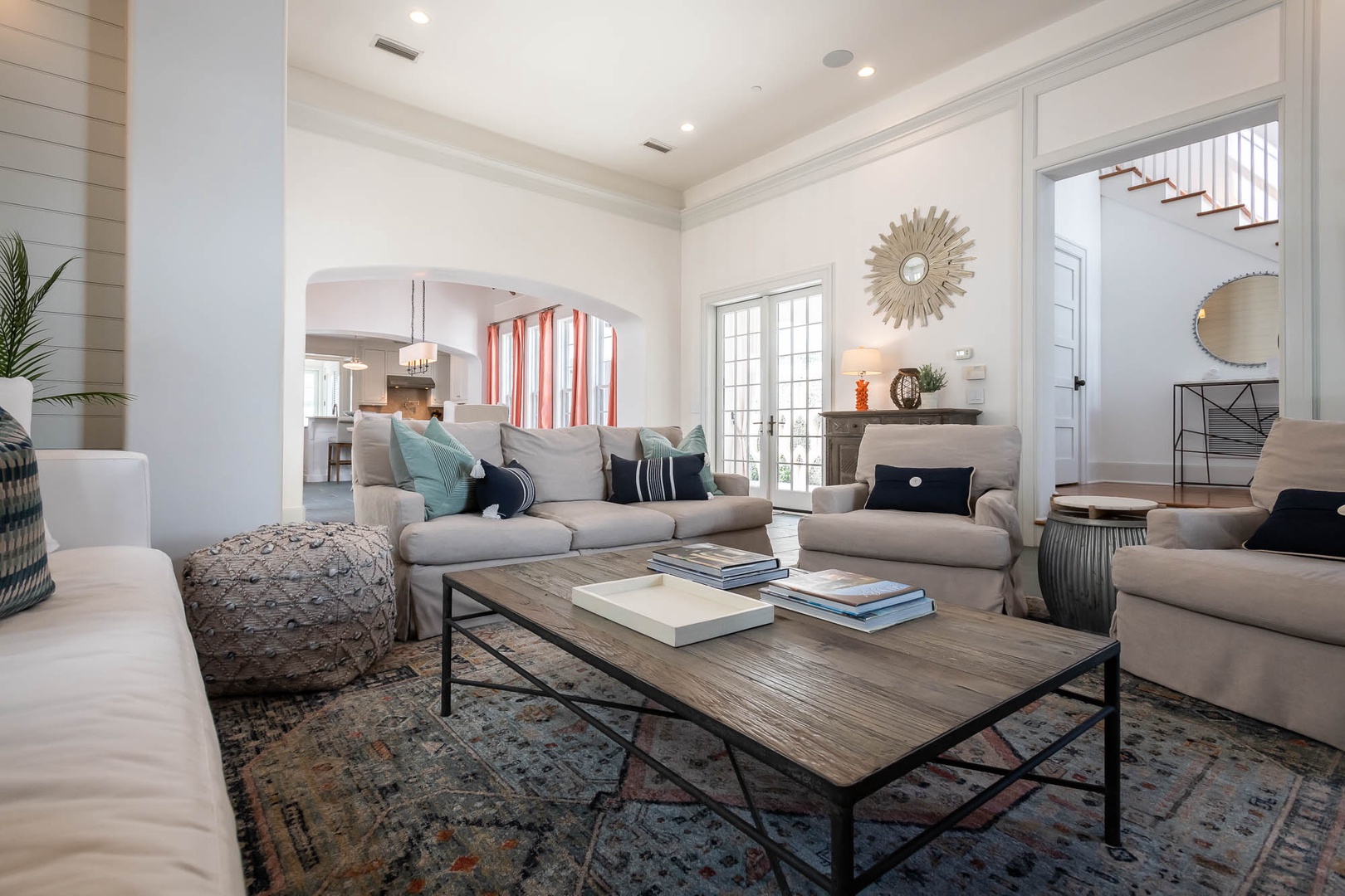 This Alys Beach vacation rental home is ideally situated on North Charles Street giving guests a short walk to the emerging Town Center, Caliza Pool Complex and the Gulf. On the first level, two separate courtyards, each with private loggias, offer quintessential Alys Beach living. The dining room looks out to each courtyard and is defined by a vaulted timber beam ceiling. A large living room provides a sense of comfort and ease with an inviting fireplace and 13-foot ceilings. The kitchen with a center island completes the public rooms on this level. Just off the kitchen, guests will find two bedrooms, one with a king-sized bed and the other with two full-sized beds. Both bedrooms feature private baths. The primary suite with a king-sized bed is found on the second level and offers ultimate privacy for guests. A small balcony is also found off the primary suite. Parking for this home is located in two designated spaces in a parking court.