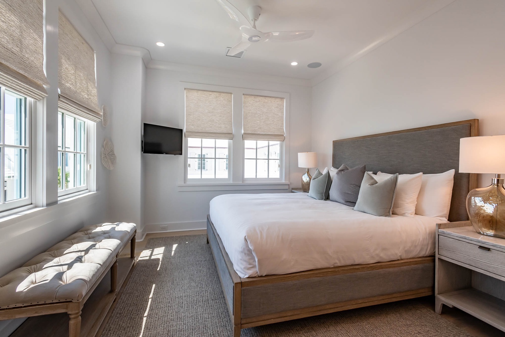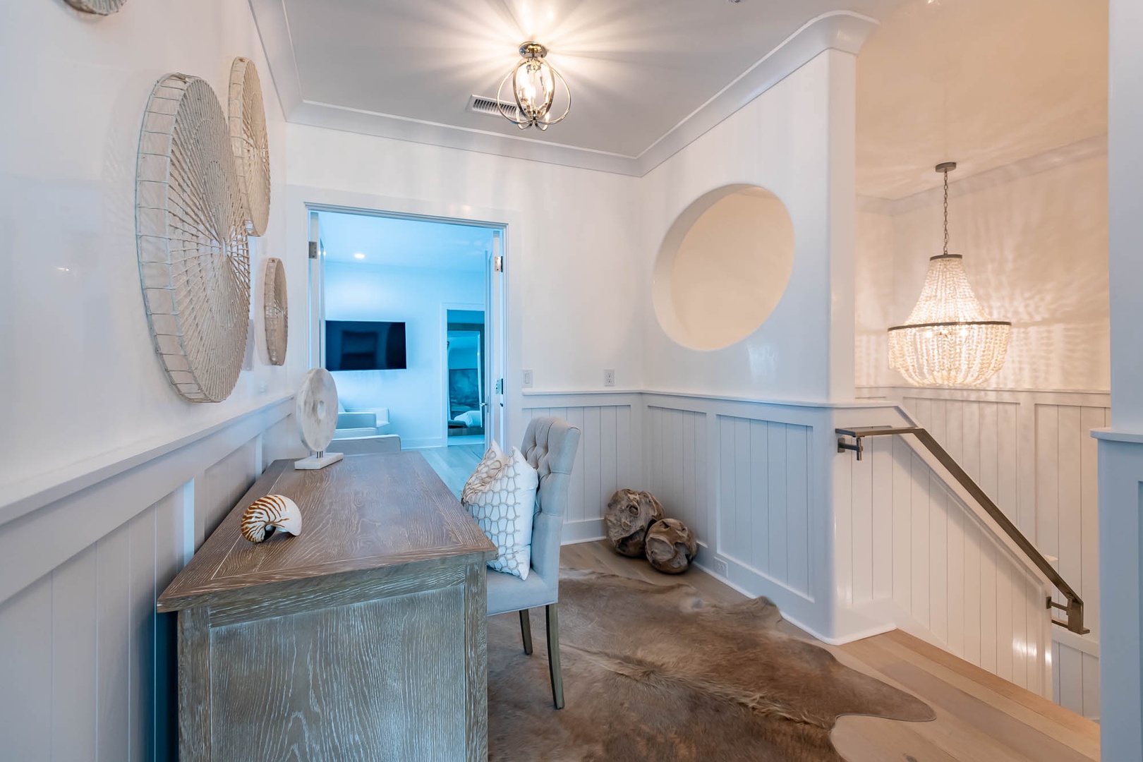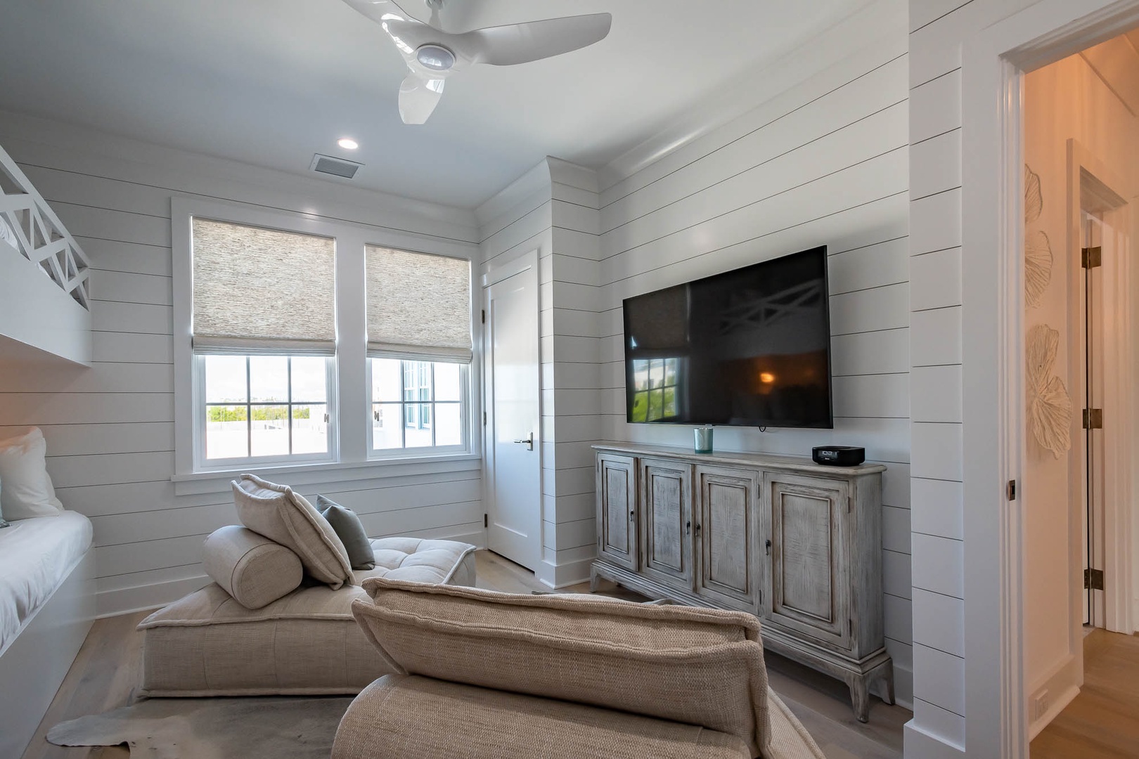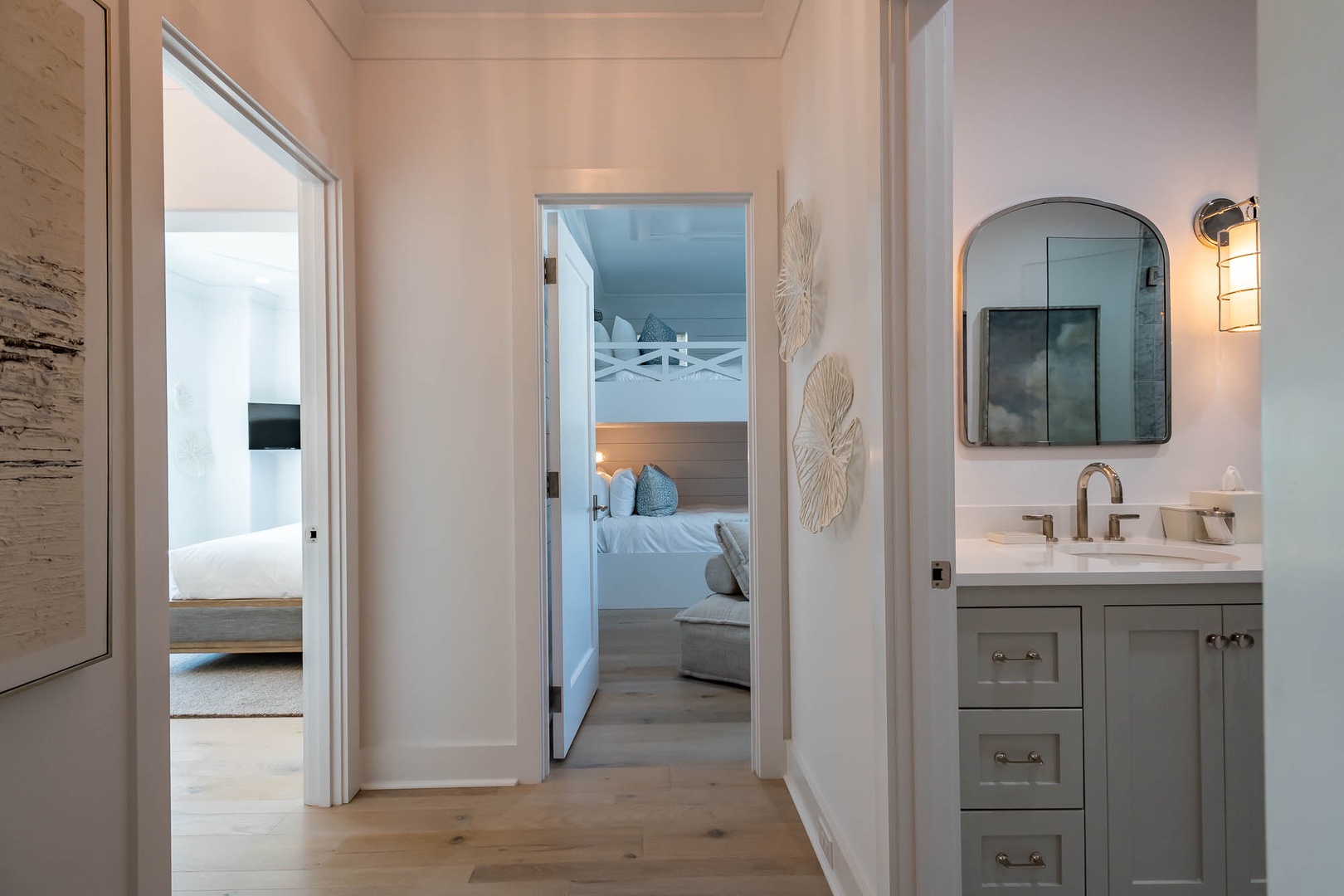 This beautiful vacation rental home offers a perfect stay at Alys Beach. Located on the beautiful Turtle Bale pedestrian path, the Gulf is only a short distance away. The first level of this home offers a private courtyard featuring a built-in grill, heated pool, open seating for enjoying the sun and a covered outdoor dining area. The interior of the first floor features a spacious great room with a gas fireplace, ample seating, dining area and a well-equipped kitchen with a large center island. The laundry area, a half-bath and one bedroom with a king-sized bed and private bath are also on this level. On the second level, guests will find the primary suite with a king-sized bed as well as one more bedroom with one king-sized bed and private bath. Another bedroom with a king-sized bed and a bedroom with four bunk beds (two upper, two lower) share a full bath and complete the second level. Parking for this home is located in two designated spaces in a parking court.
