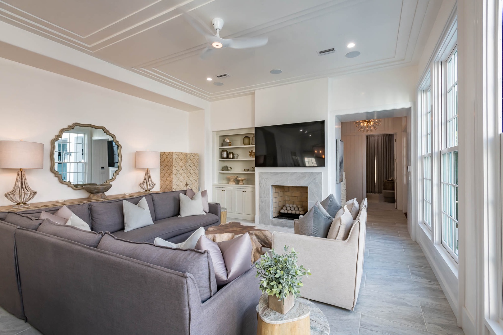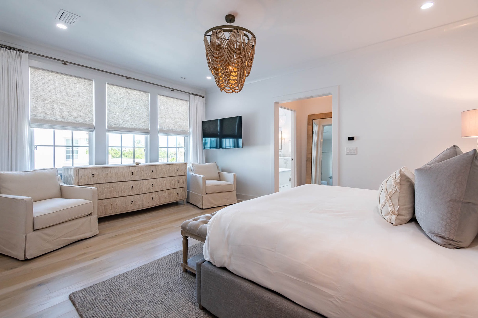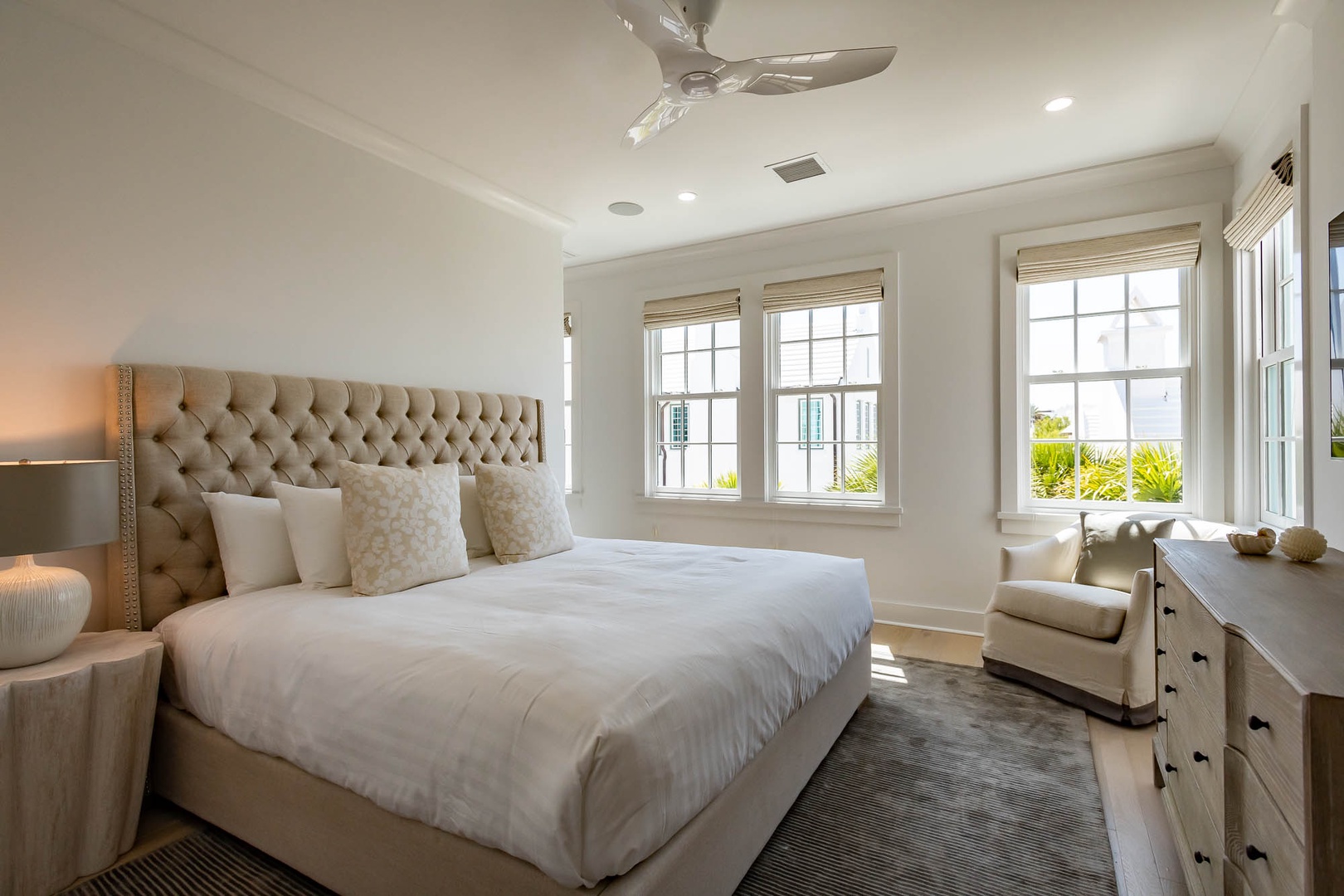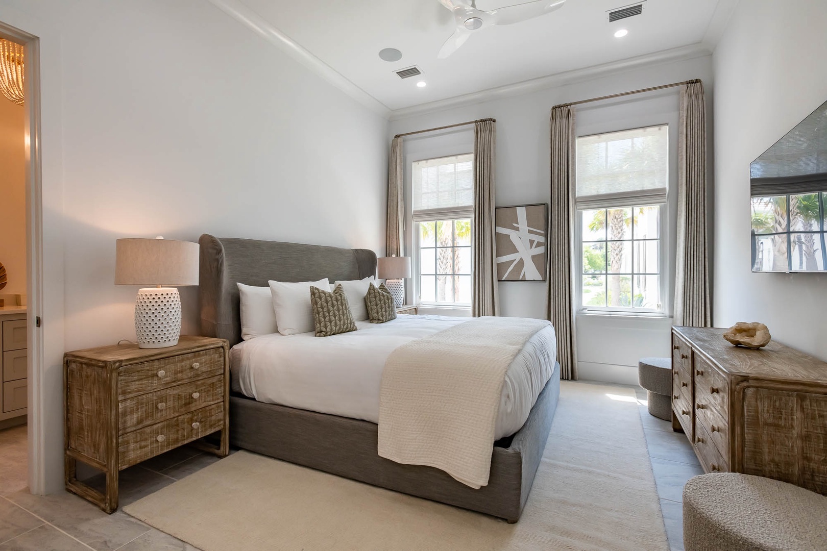 This beautiful vacation rental home offers a perfect stay at Alys Beach. Located on the beautiful Turtle Bale pedestrian path, the Gulf is only a short distance away. The first level of this home offers a private courtyard featuring a built-in grill, heated pool, open seating for enjoying the sun and a covered outdoor dining area. The interior of the first floor features a spacious great room with a gas fireplace, ample seating, dining area and a well-equipped kitchen with a large center island. The laundry area, a half-bath and one bedroom with a king-sized bed and private bath are also on this level. On the second level, guests will find the primary suite with a king-sized bed as well as one more bedroom with one king-sized bed and private bath. Another bedroom with a king-sized bed and a bedroom with four bunk beds (two upper, two lower) share a full bath and complete the second level. Parking for this home is located in two designated spaces in a parking court.