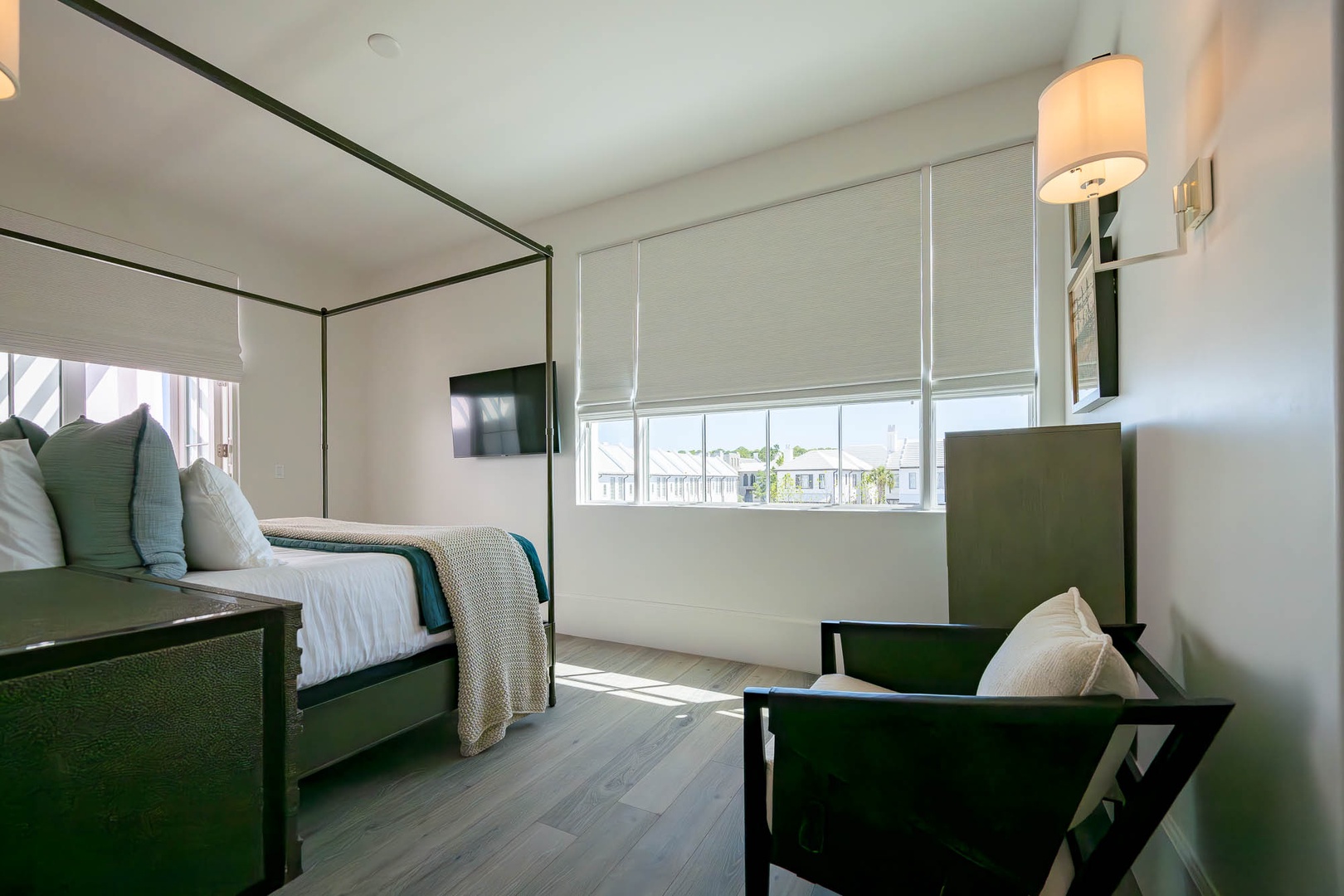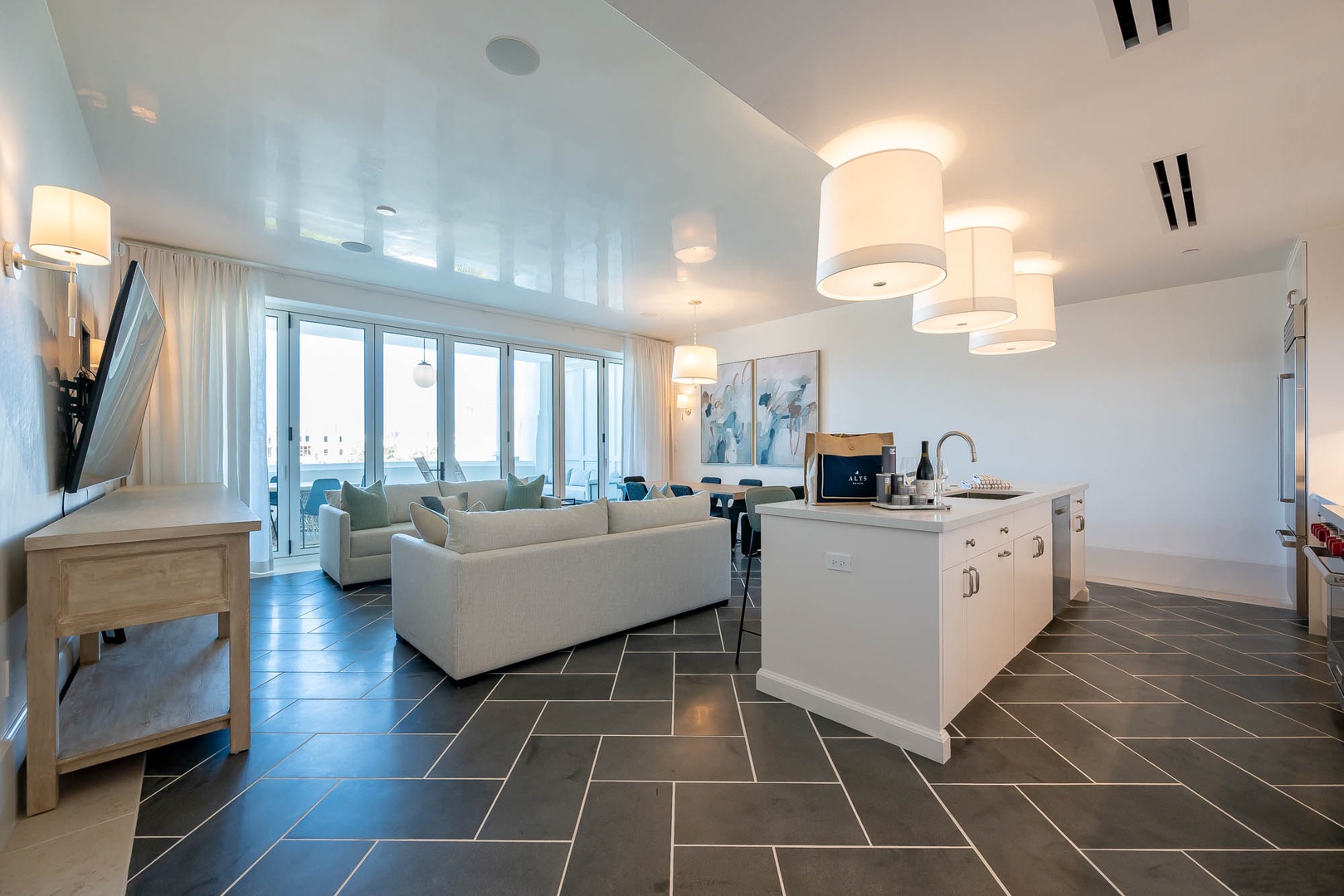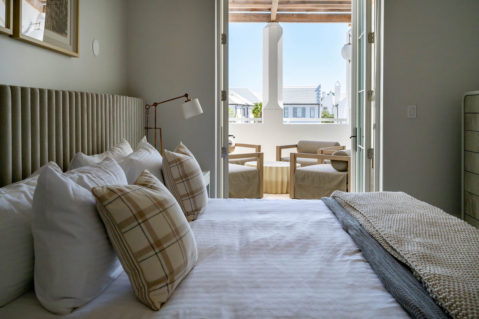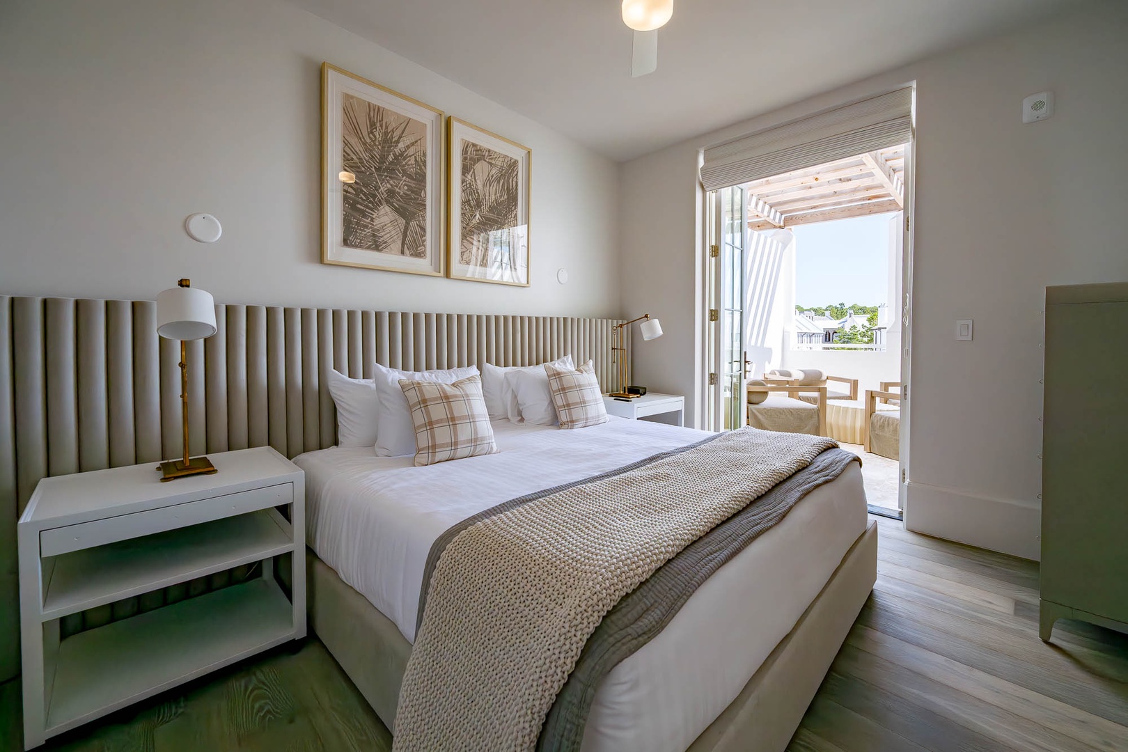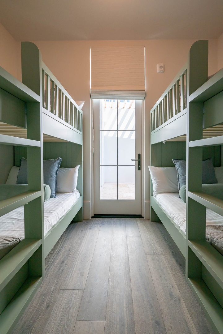 This brand new condominium at Alys Beach is located in the recently-completed Della building. This second floor home features a large balcony overlooking Town Center and the Amphitheatre with a partial Gulf view in the distance. This vacation rental also offers a spacious family room, dining area and kitchen with a large center island. Both the primary bedroom and the second bedroom feature one king-sized bed and ensuite baths. A powder room is also located off of the family room. The bunk area sleeps four with two upper and two lower single bunks. Finally, both bedrooms and the bunk area offer access to another private balcony overlooking the rear of the building. Parking for Della 205 is located in a parking court behind the building with one reserved space.