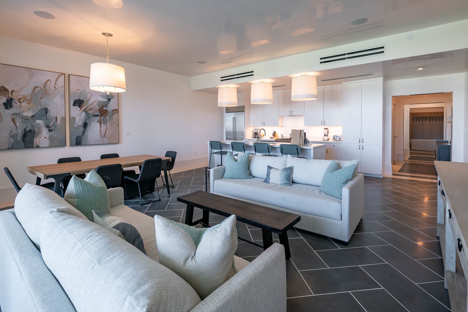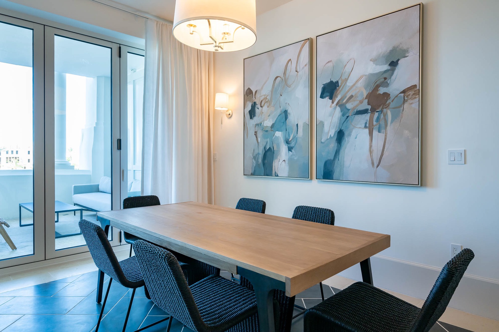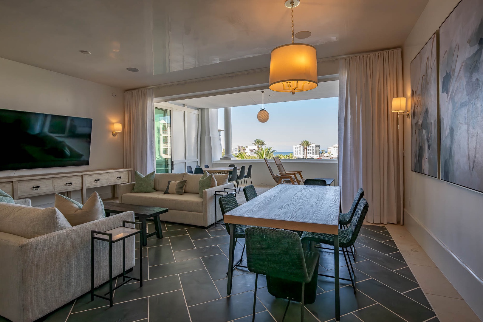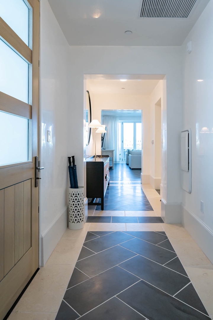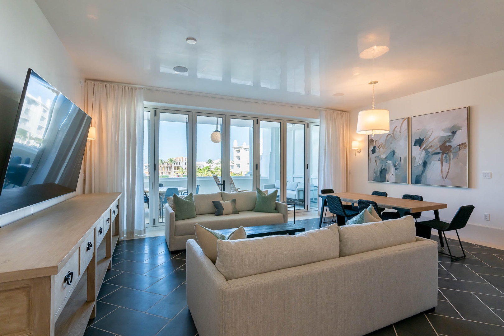 This brand new condominium at Alys Beach is located in the recently-completed Della building. This second floor home features a large balcony overlooking Town Center and the Amphitheatre with a partial Gulf view in the distance. This vacation rental also offers a spacious family room, dining area and kitchen with a large center island. Both the primary bedroom and the second bedroom feature one king-sized bed and ensuite baths. A powder room is also located off of the family room. The bunk area sleeps four with two upper and two lower single bunks. Finally, both bedrooms and the bunk area offer access to another private balcony overlooking the rear of the building. Parking for Della 205 is located in a parking court behind the building with one reserved space.
