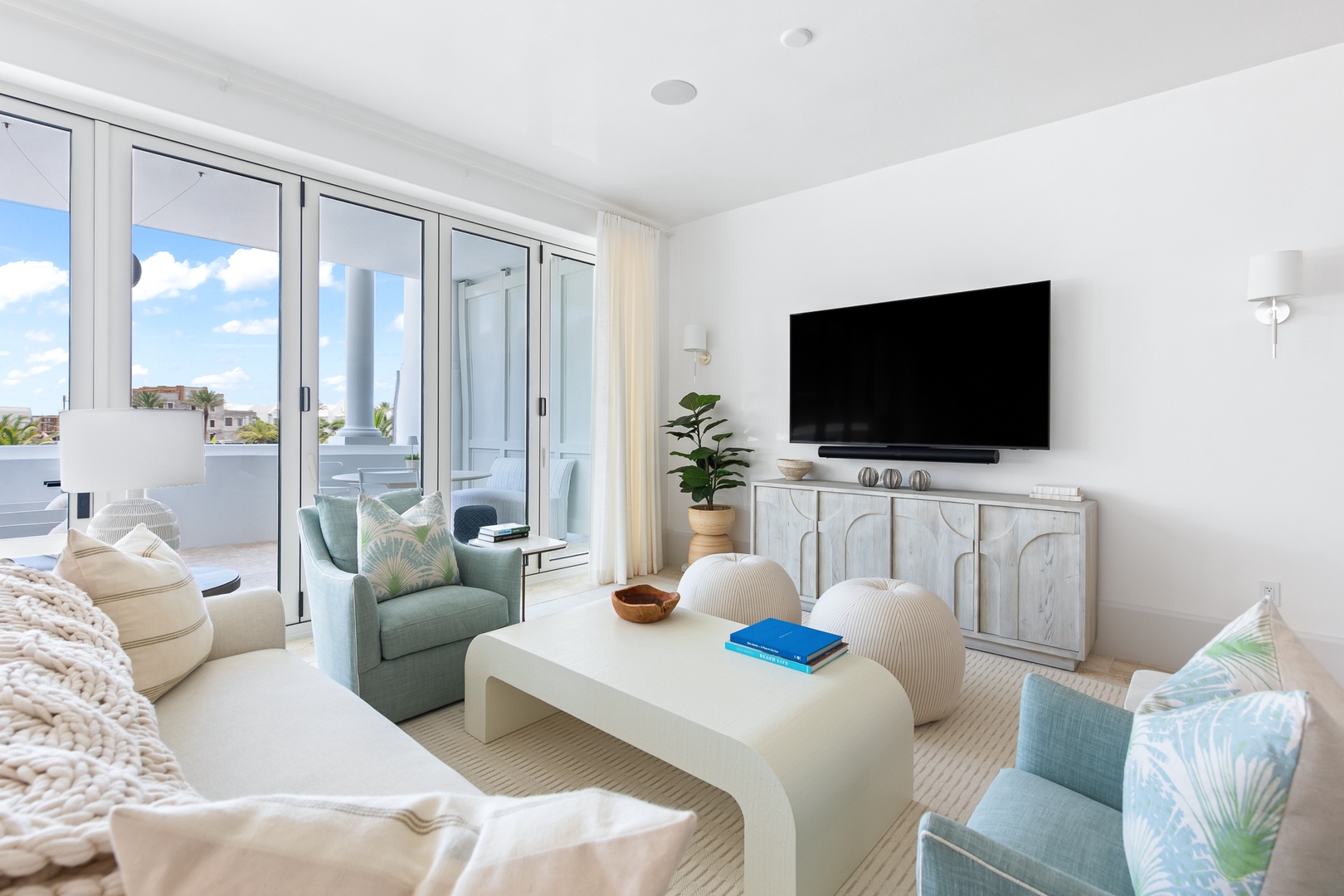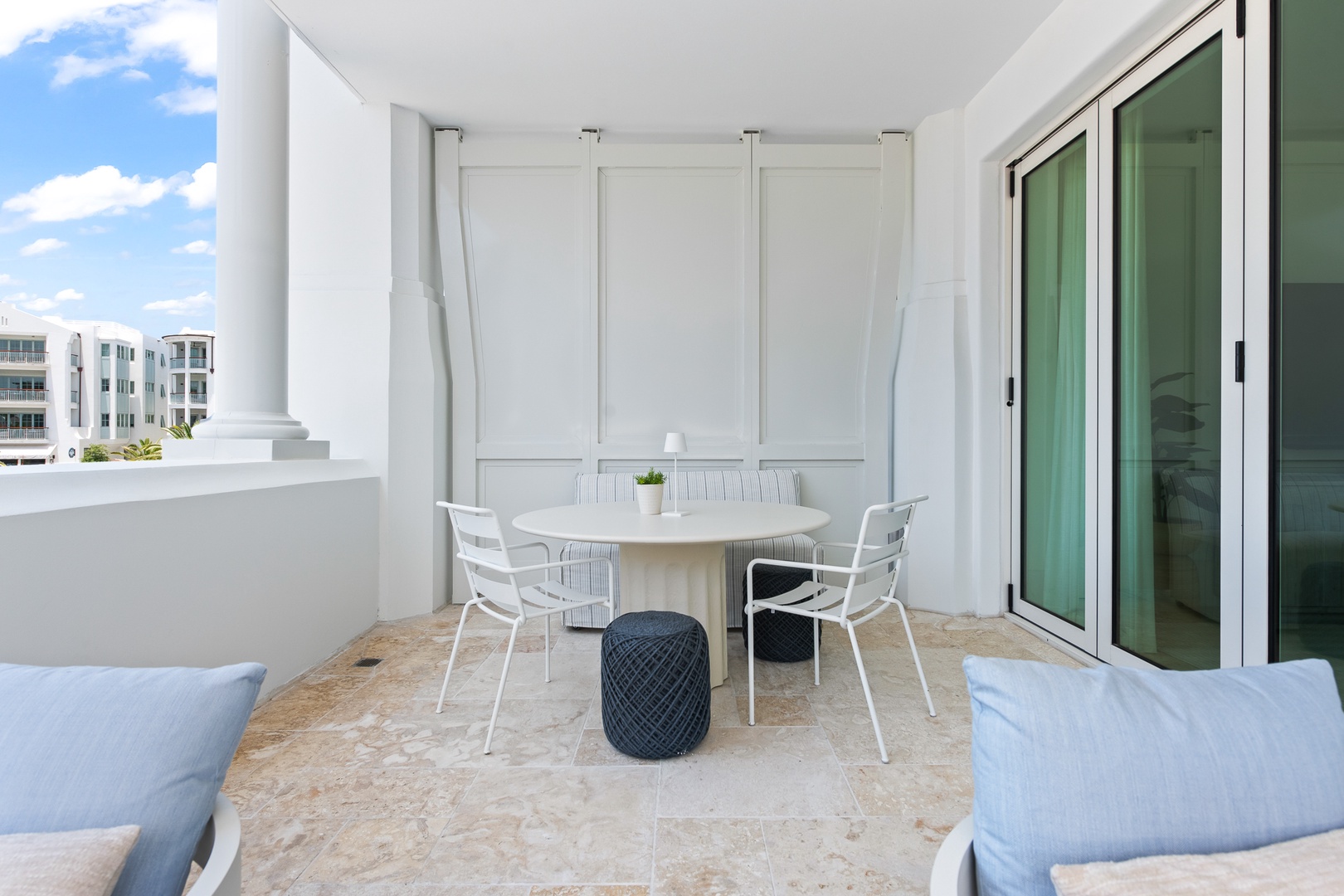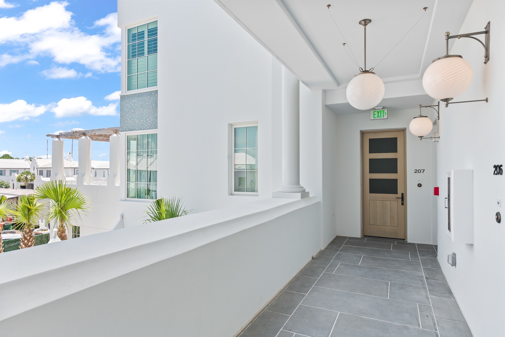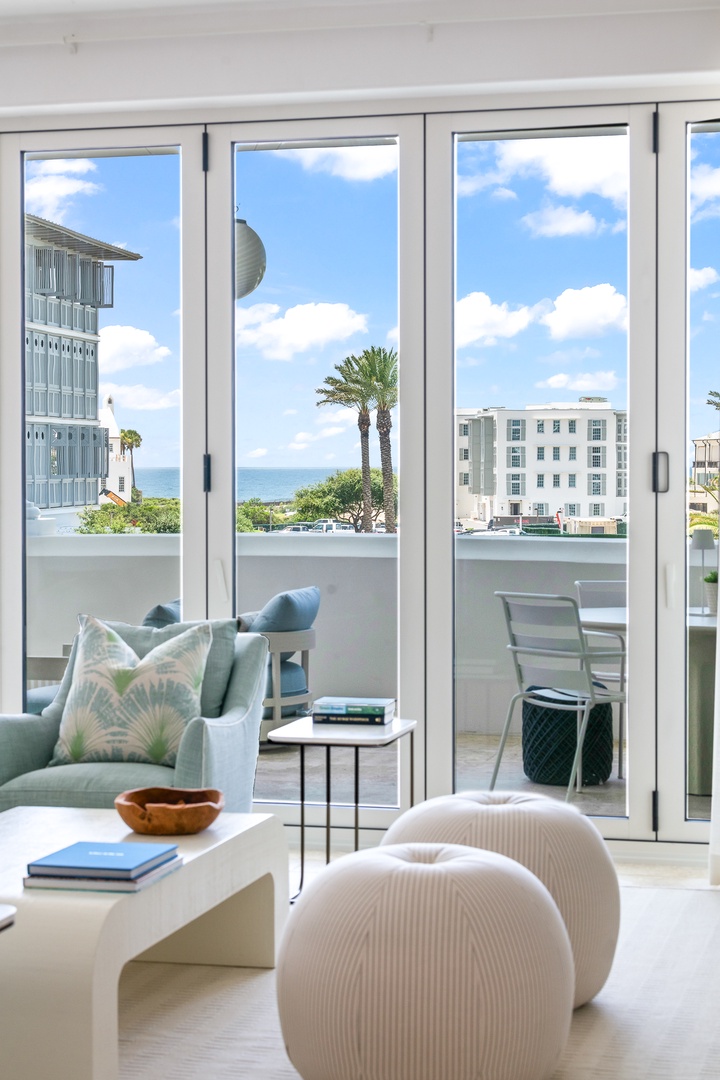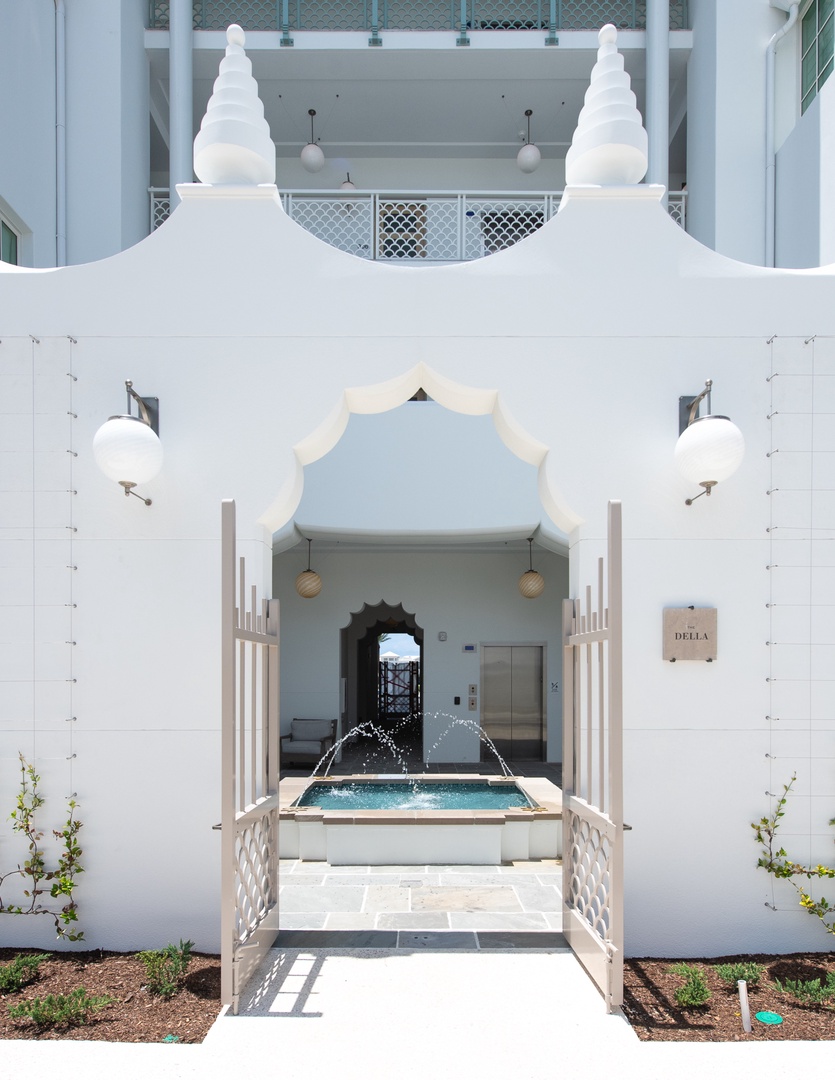 This brand new condominium at Alys Beach is located in the recently-completed Della building. This second floor home features a large balcony overlooking Town Center and the Amphitheatre with a partial Gulf view in the distance. This home offers a spacious family room, dining area, kitchen with a large center island and a powder room. The primary bedroom contains a king-sized bed and ensuite bath. The second bedroom offers two queen-sized beds and an ensuite bath. Parking for Della 207 is located in a parking court behind the building with one reserved space.