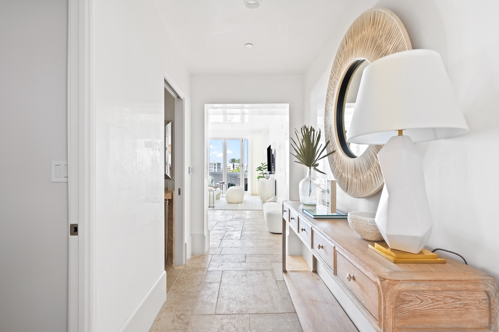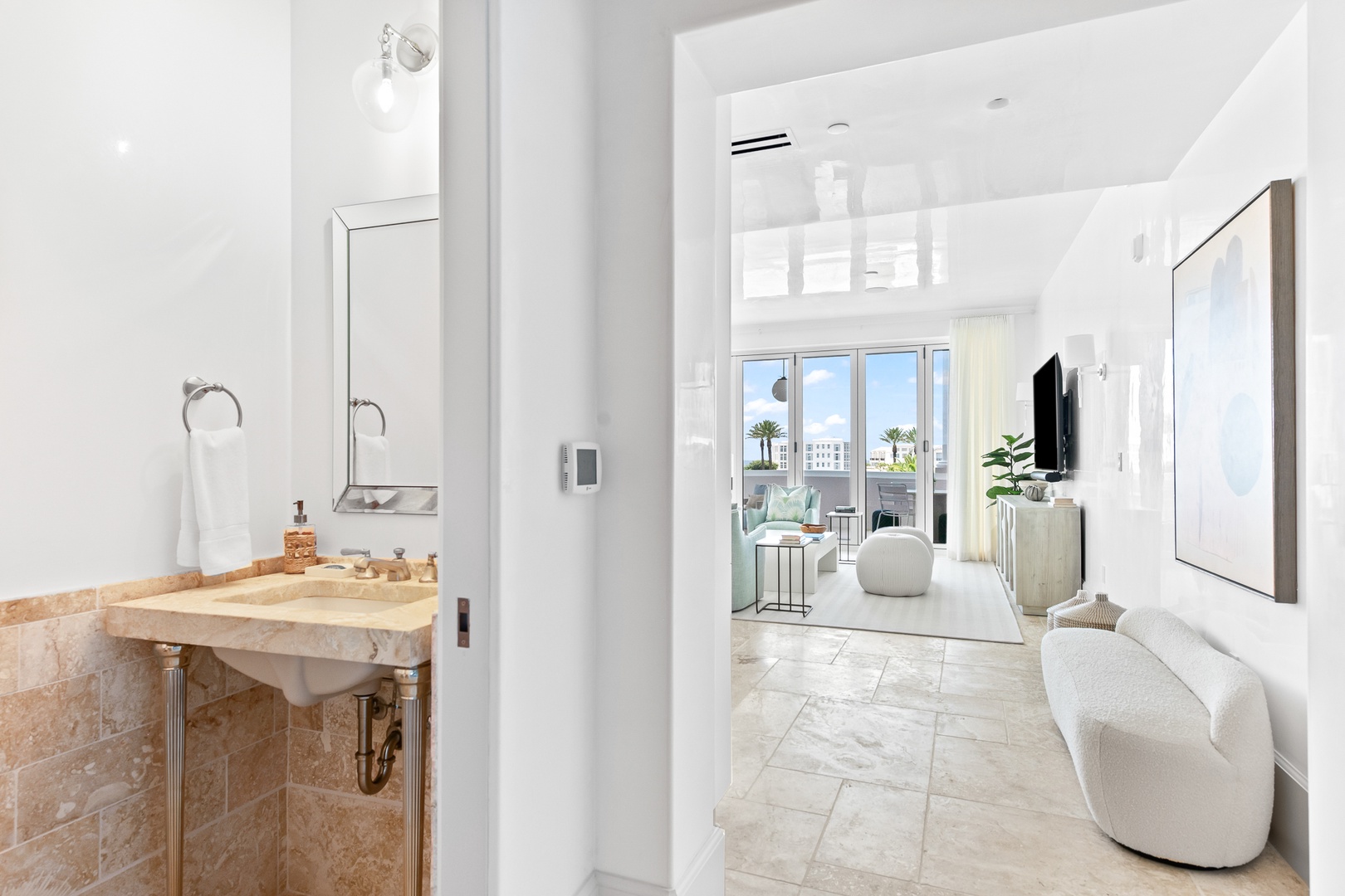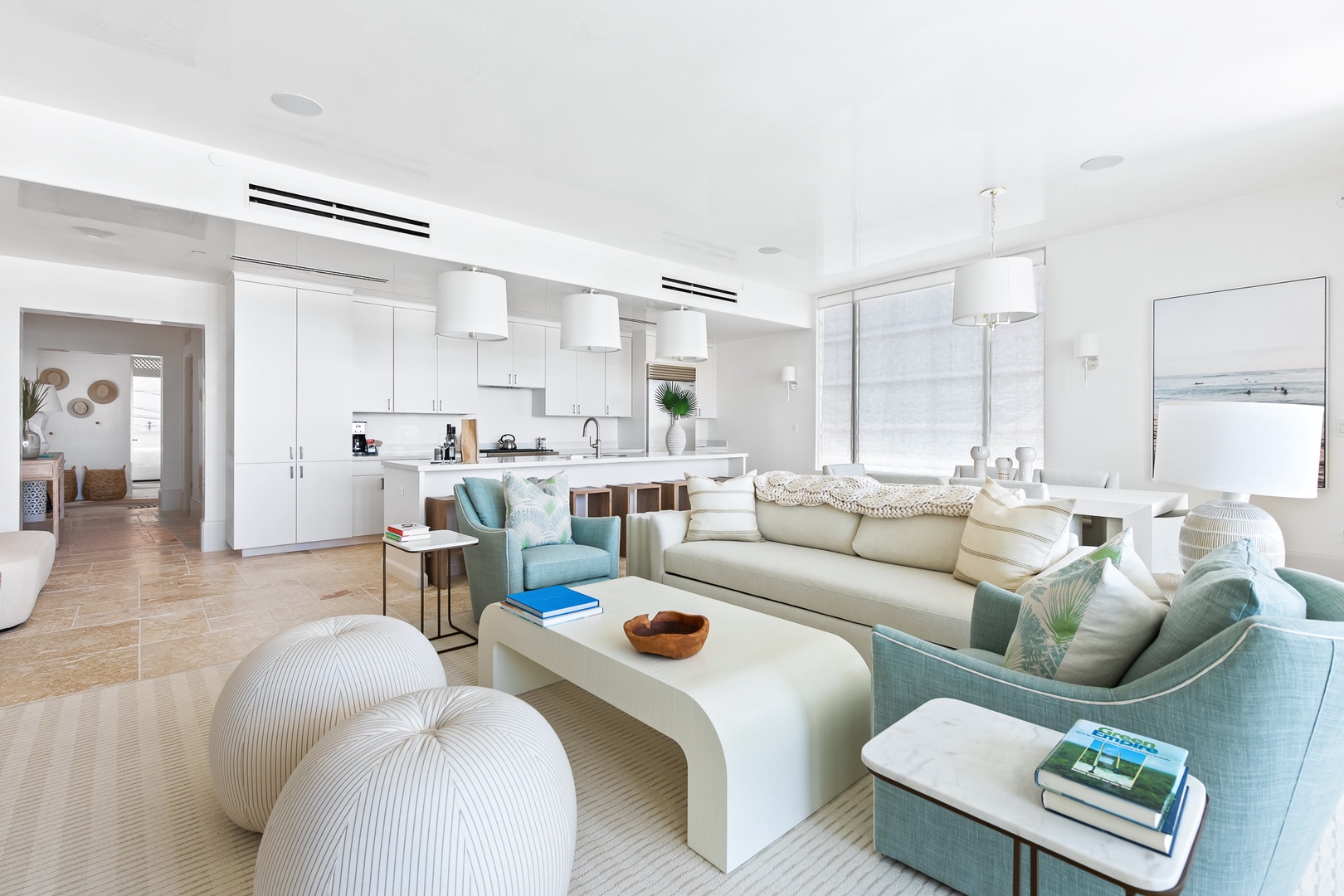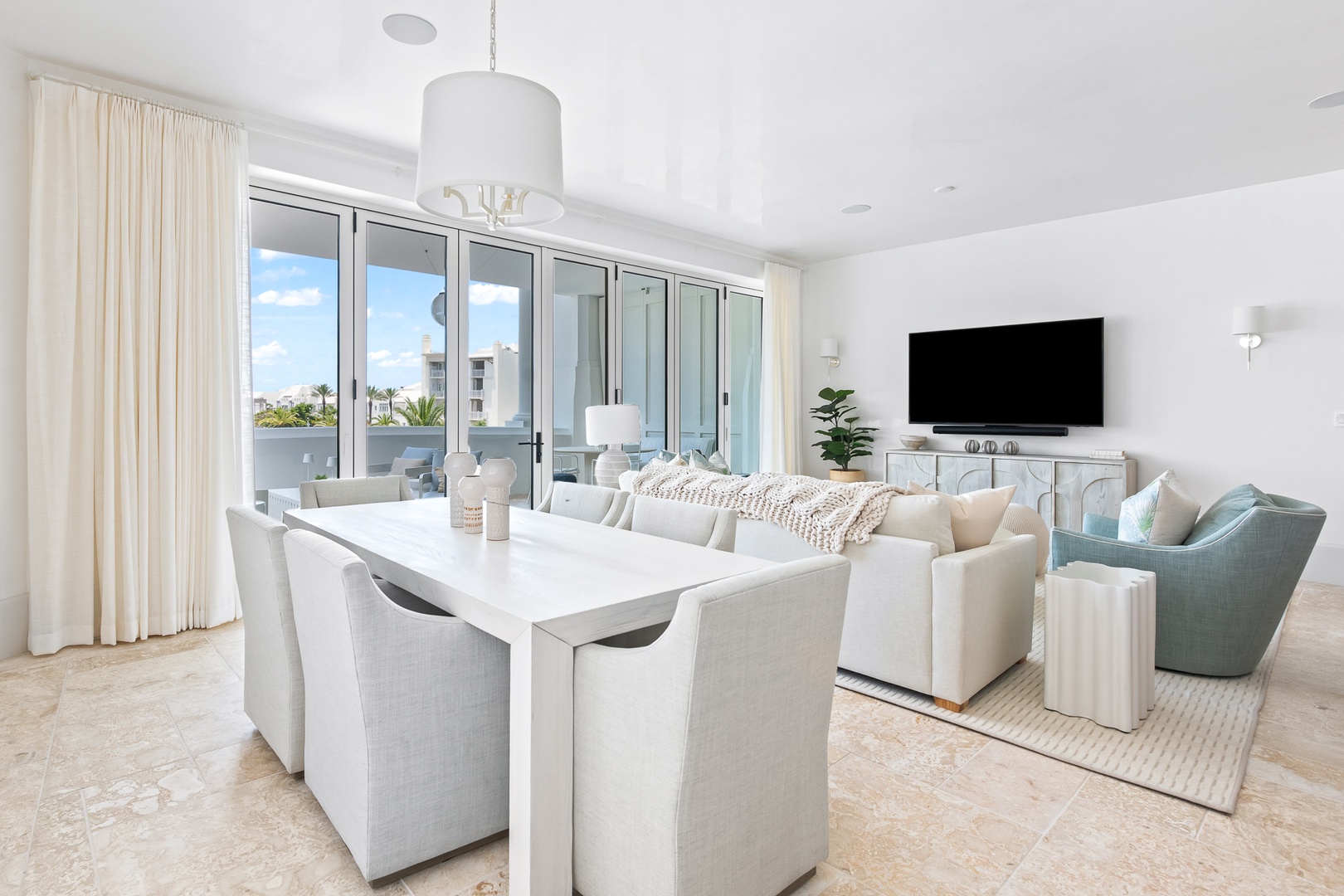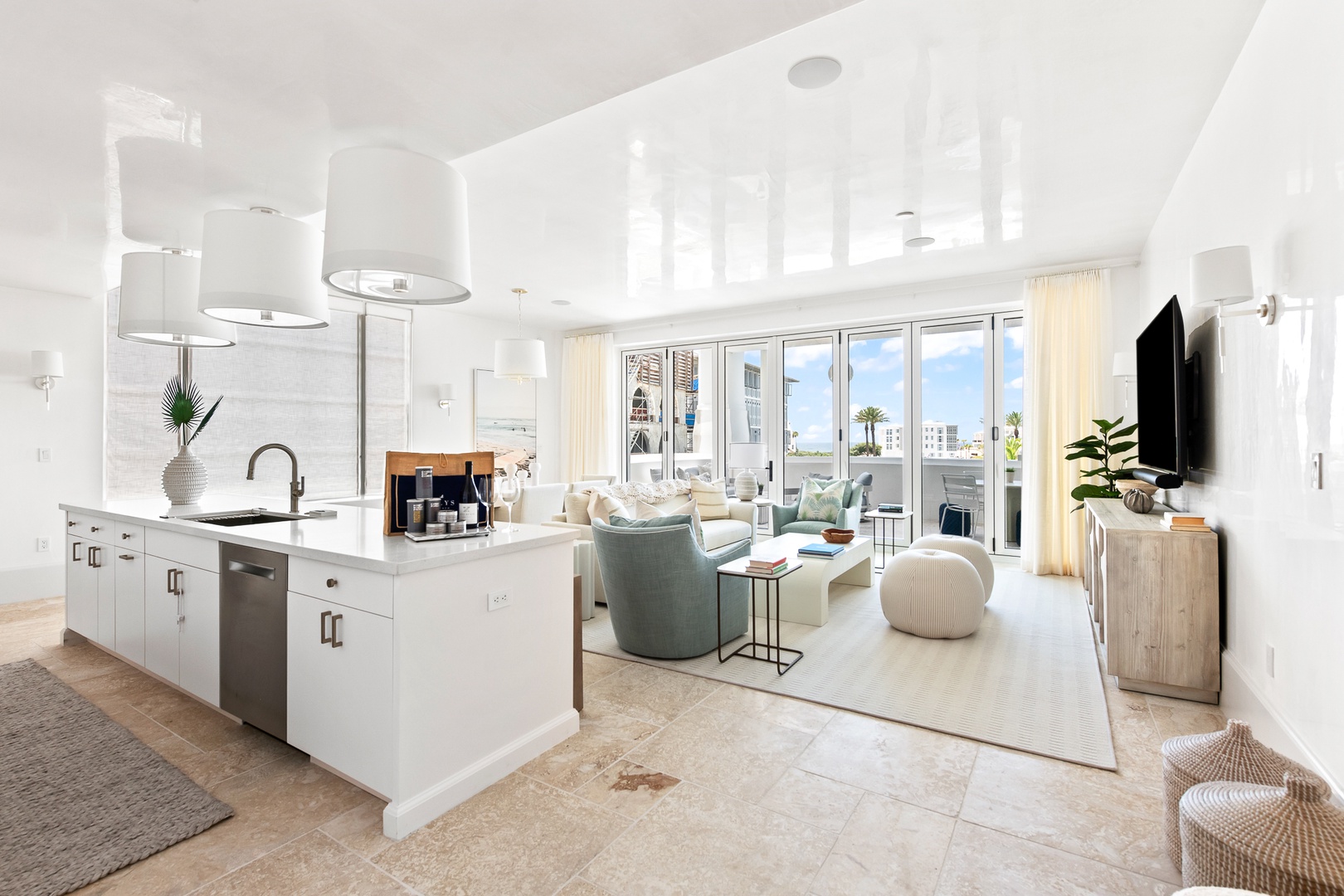 This brand new condominium at Alys Beach is located in the recently-completed Della building. This second floor home features a large balcony overlooking Town Center and the Amphitheatre with a partial Gulf view in the distance. This home offers a spacious family room, dining area, kitchen with a large center island and a powder room. The primary bedroom contains a king-sized bed and ensuite bath. The second bedroom offers two queen-sized beds and an ensuite bath. Parking for Della 207 is located in a parking court behind the building with one reserved space.