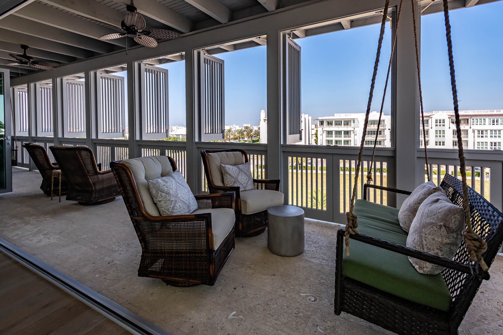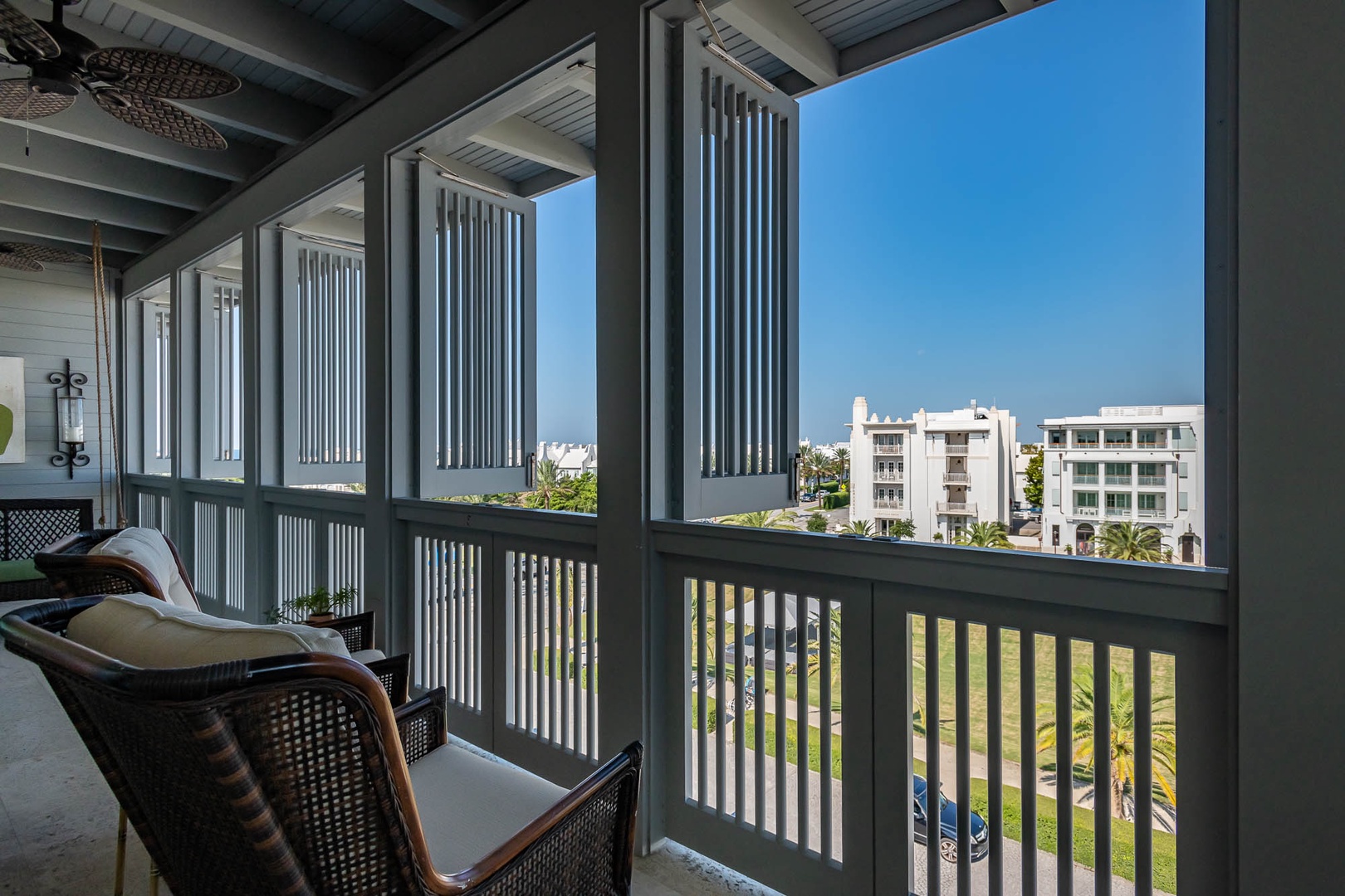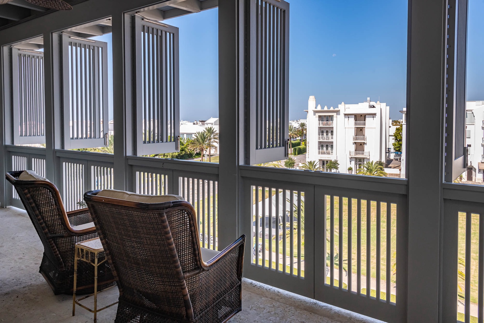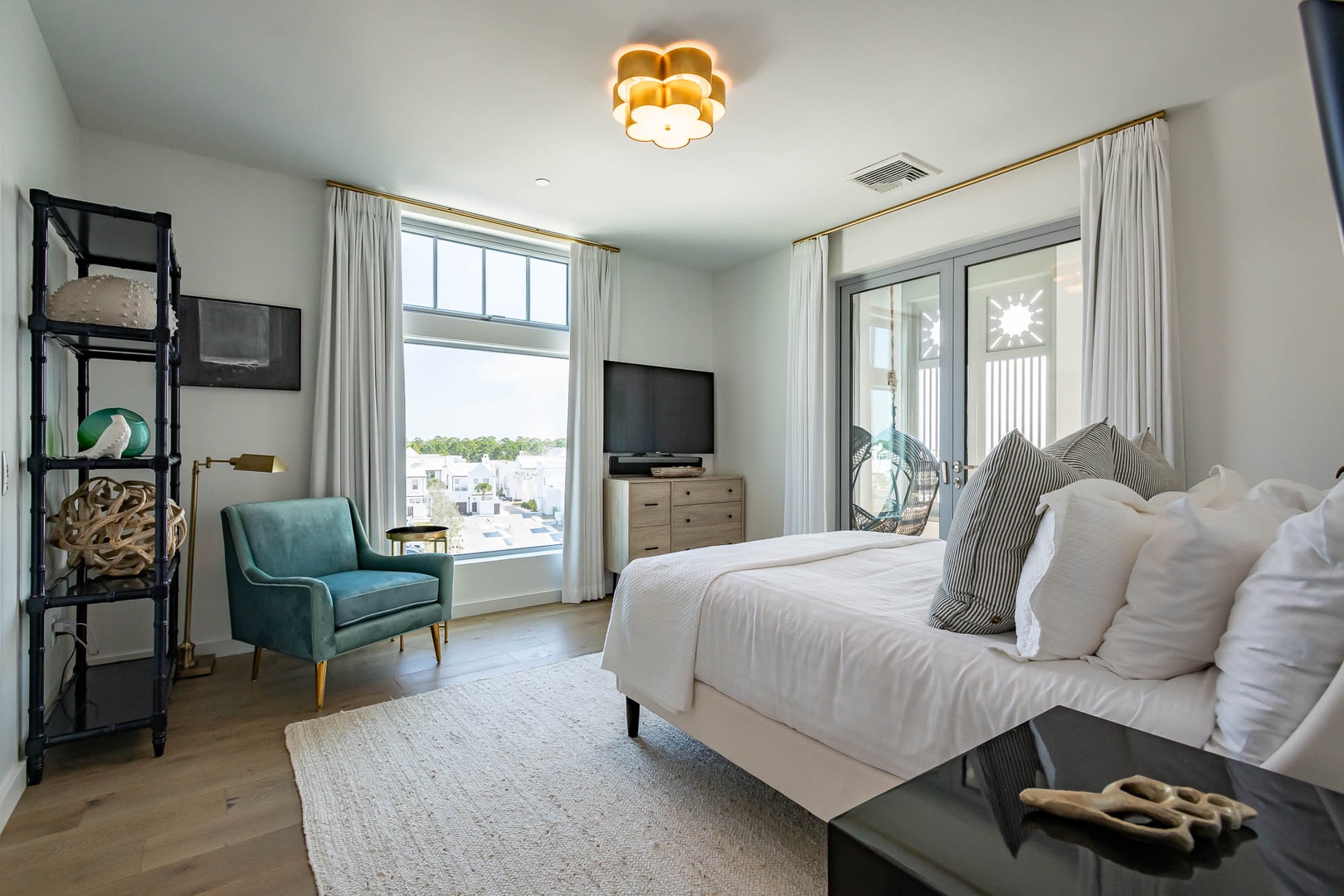 This beautiful condominium on the top floor of The May building offers expansive views across the amphitheater and town center. Just steps from restaurants and merchants, this is the perfect location for exploring Alys Beach. The spacious family room and kitchen provide for a separate sitting and dining area and opens to a large balcony with ample outdoor seating. The primary suite with a king-sized bed is located off the family room and also provides direct access to the balcony. The two additional bedrooms, one with a king-sized bed and the other with a queen-sized bed feature private bathrooms and have views to the East. Each of these bedrooms opens to a small balcony with additional outdoor seating. Finally, in an alcove in the main hallway, there is one set of bunk beds for additional sleeping. Parking for this residence is one designated space in a parking court.
