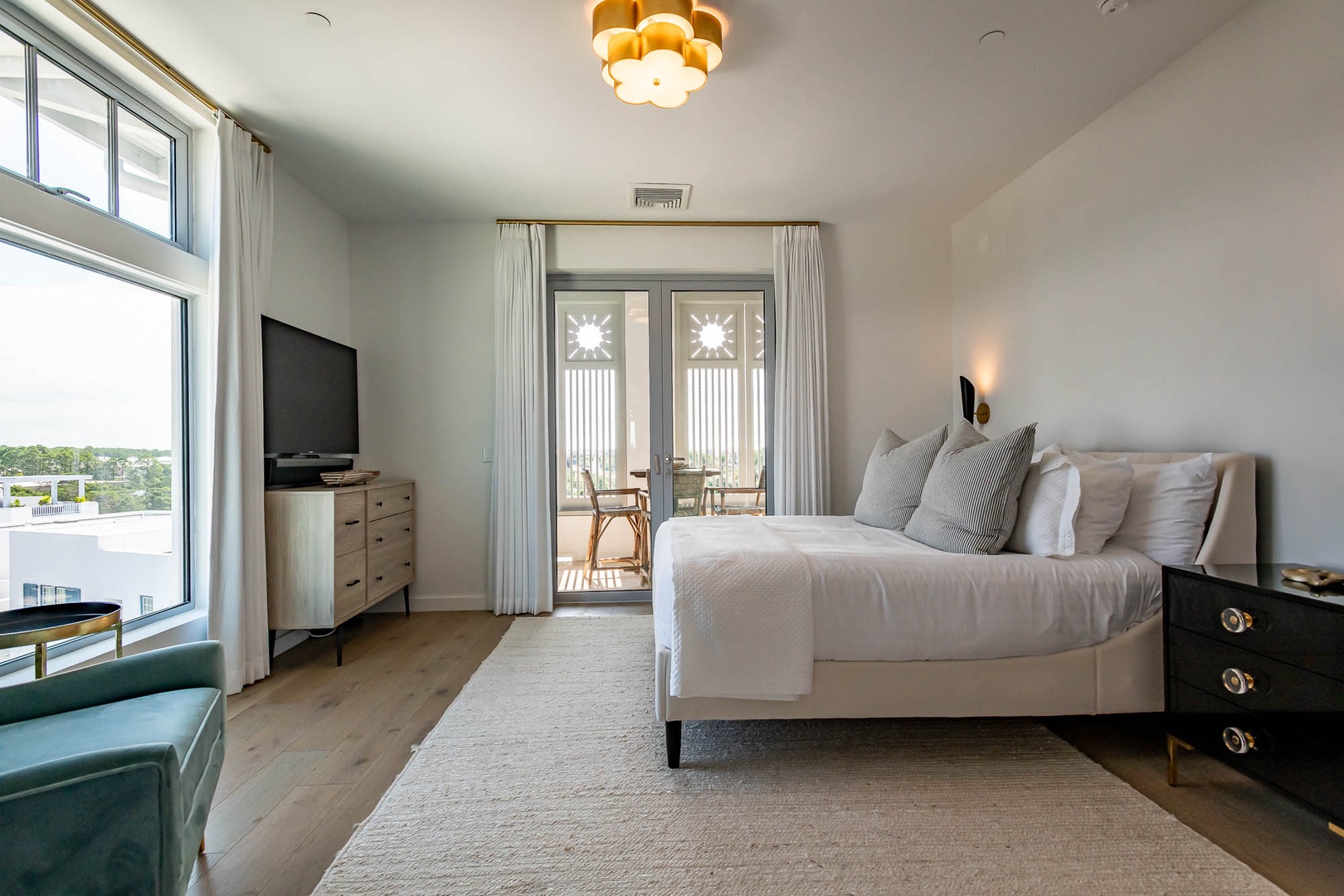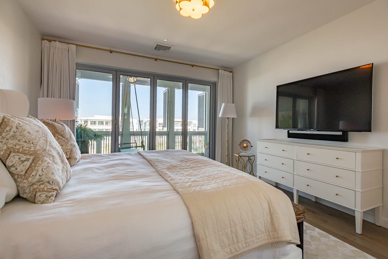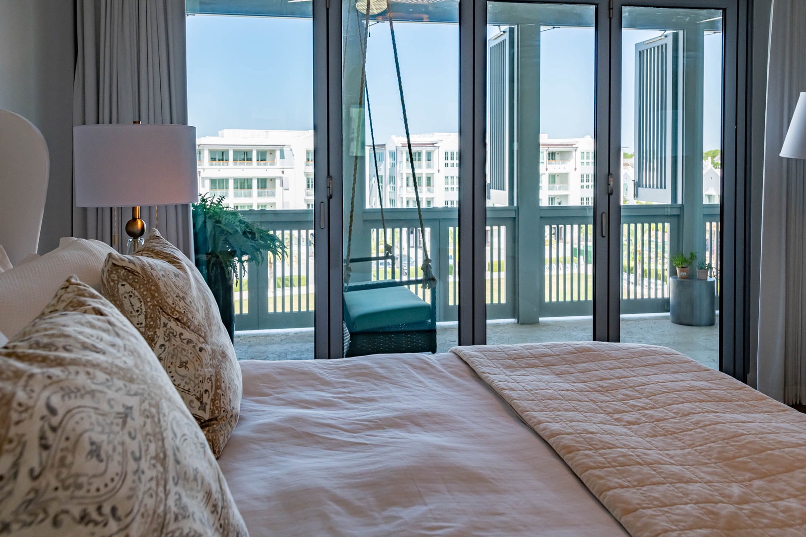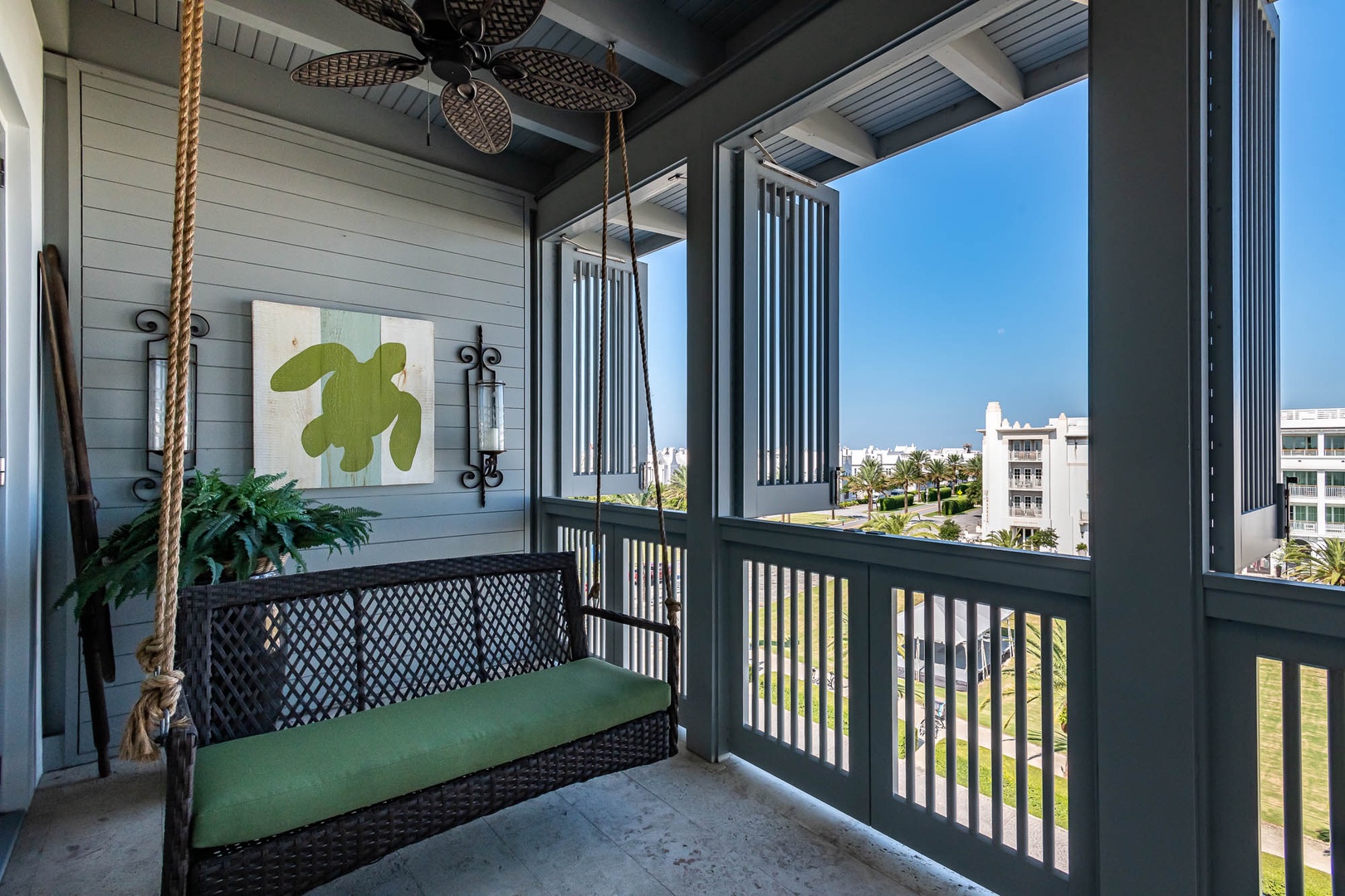 This beautiful condominium on the top floor of The May building offers expansive views across the amphitheater and town center. Just steps from restaurants and merchants, this is the perfect location for exploring Alys Beach. The spacious family room and kitchen provide for a separate sitting and dining area and opens to a large balcony with ample outdoor seating. The primary suite with a king-sized bed is located off the family room and also provides direct access to the balcony. The two additional bedrooms, one with a king-sized bed and the other with a queen-sized bed feature private bathrooms and have views to the East. Each of these bedrooms opens to a small balcony with additional outdoor seating. Finally, in an alcove in the main hallway, there is one set of bunk beds for additional sleeping. Parking for this residence is one designated space in a parking court.