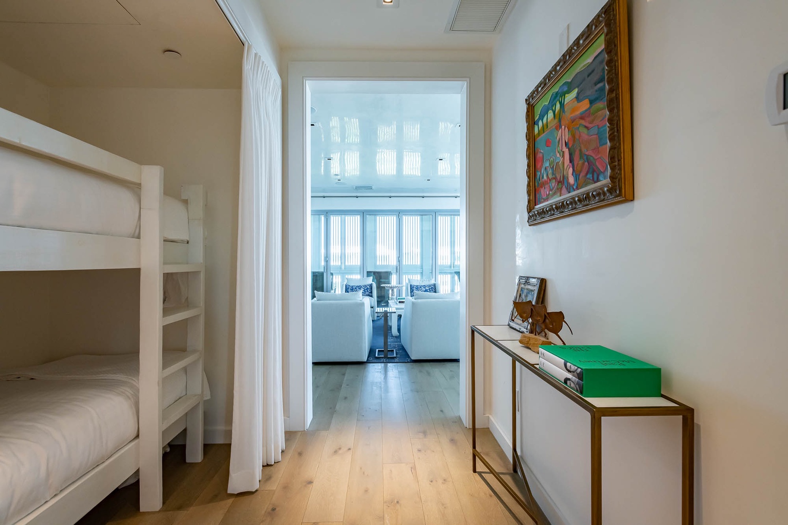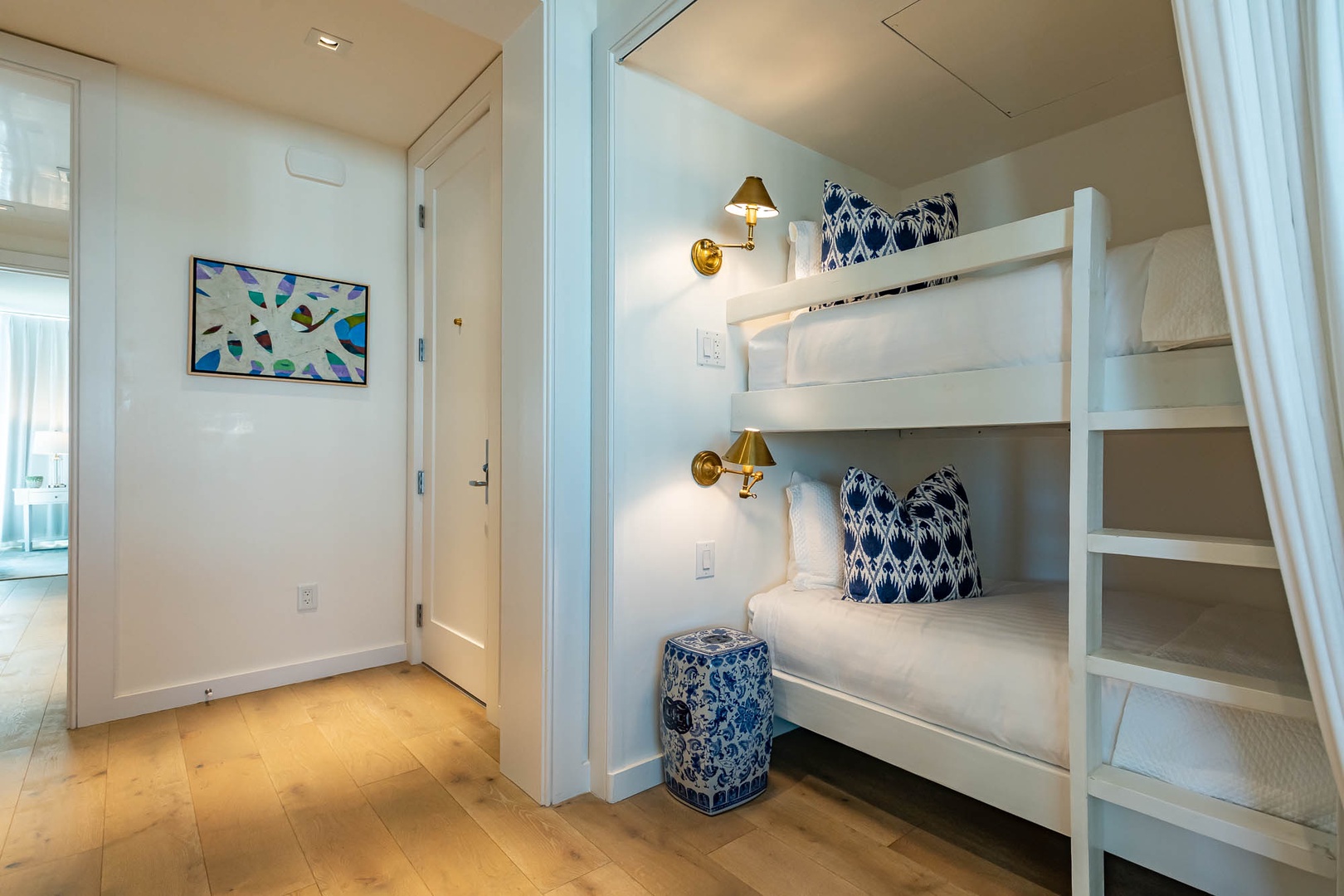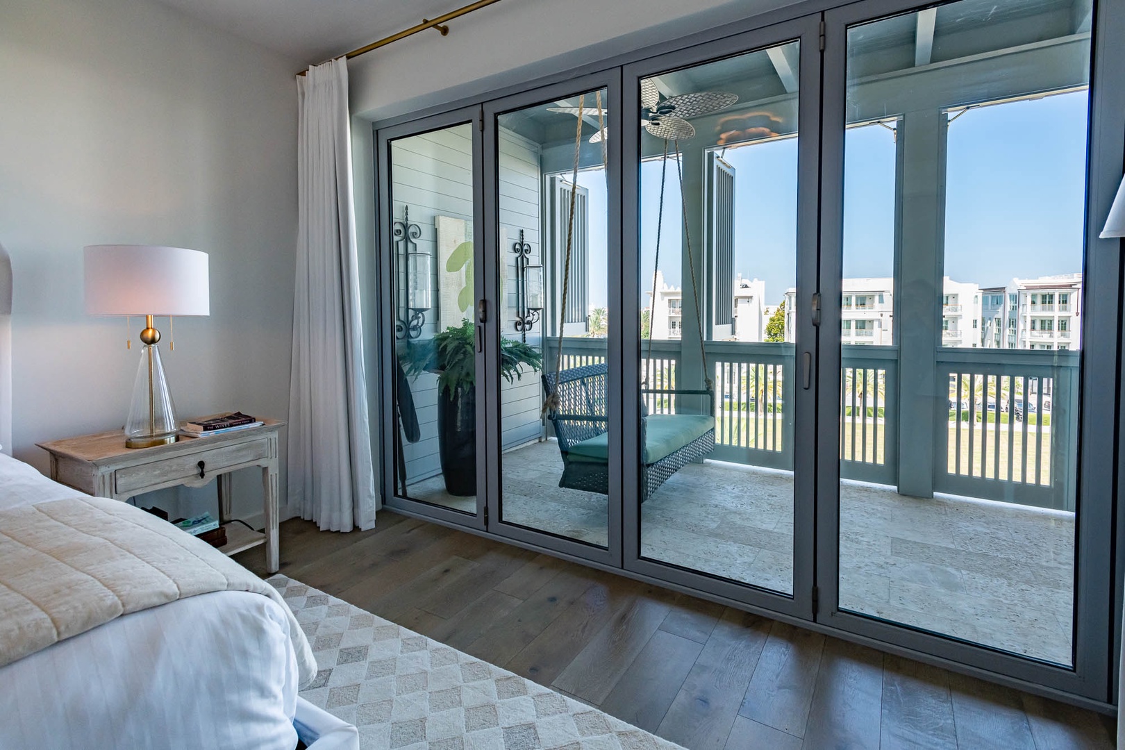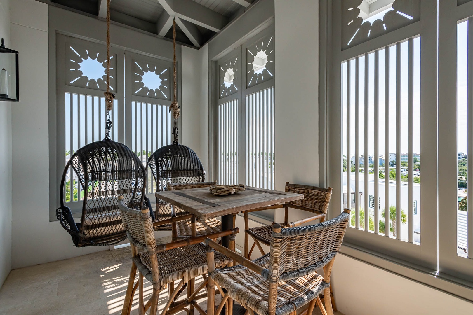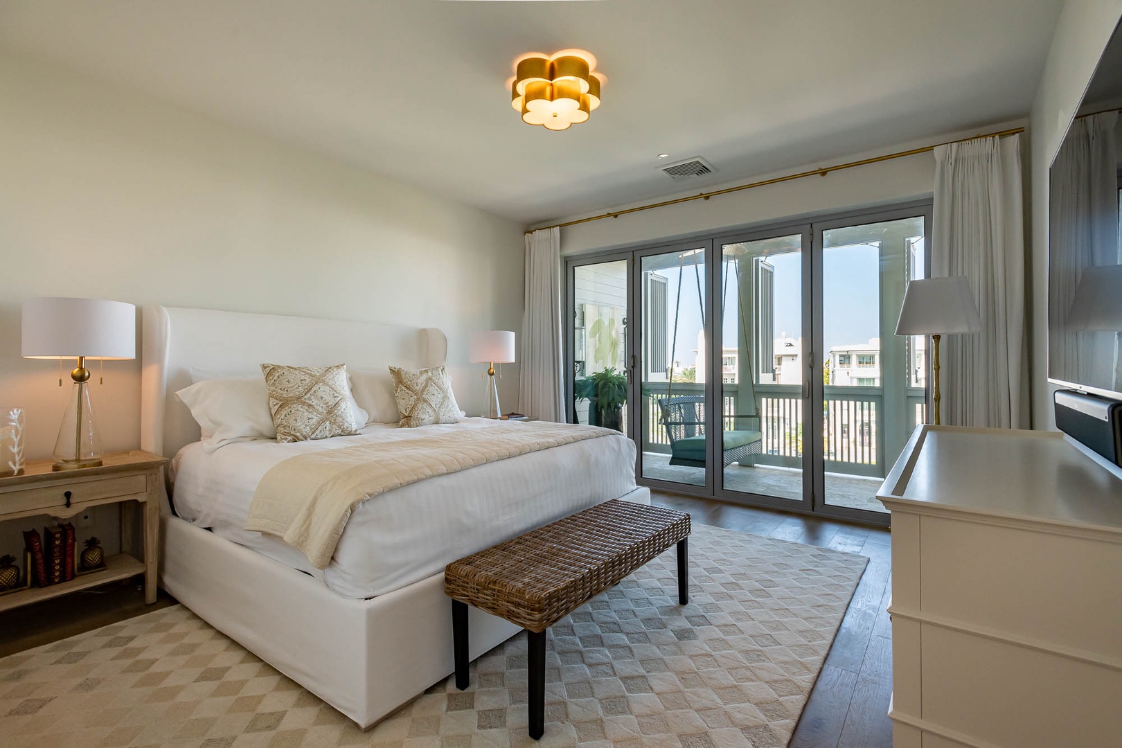This beautiful condominium on the top floor of The May building offers expansive views across the amphitheater and town center. Just steps from restaurants and merchants, this is the perfect location for exploring Alys Beach. The spacious family room and kitchen provide for a separate sitting and dining area and opens to a large balcony with ample outdoor seating. The primary suite with a king-sized bed is located off the family room and also provides direct access to the balcony. The two additional bedrooms, one with a king-sized bed and the other with a queen-sized bed feature private bathrooms and have views to the East. Each of these bedrooms opens to a small balcony with additional outdoor seating. Finally, in an alcove in the main hallway, there is one set of bunk beds for additional sleeping. Parking for this residence is one designated space in a parking court.
