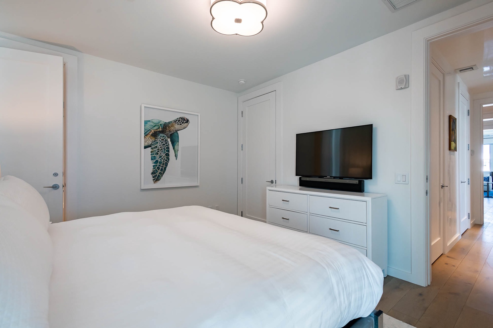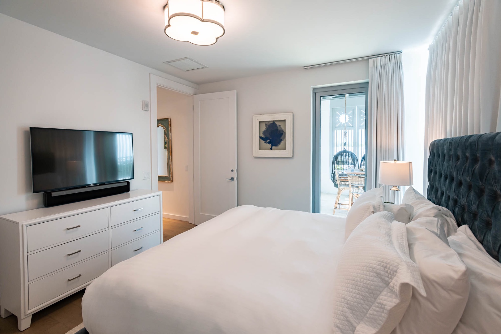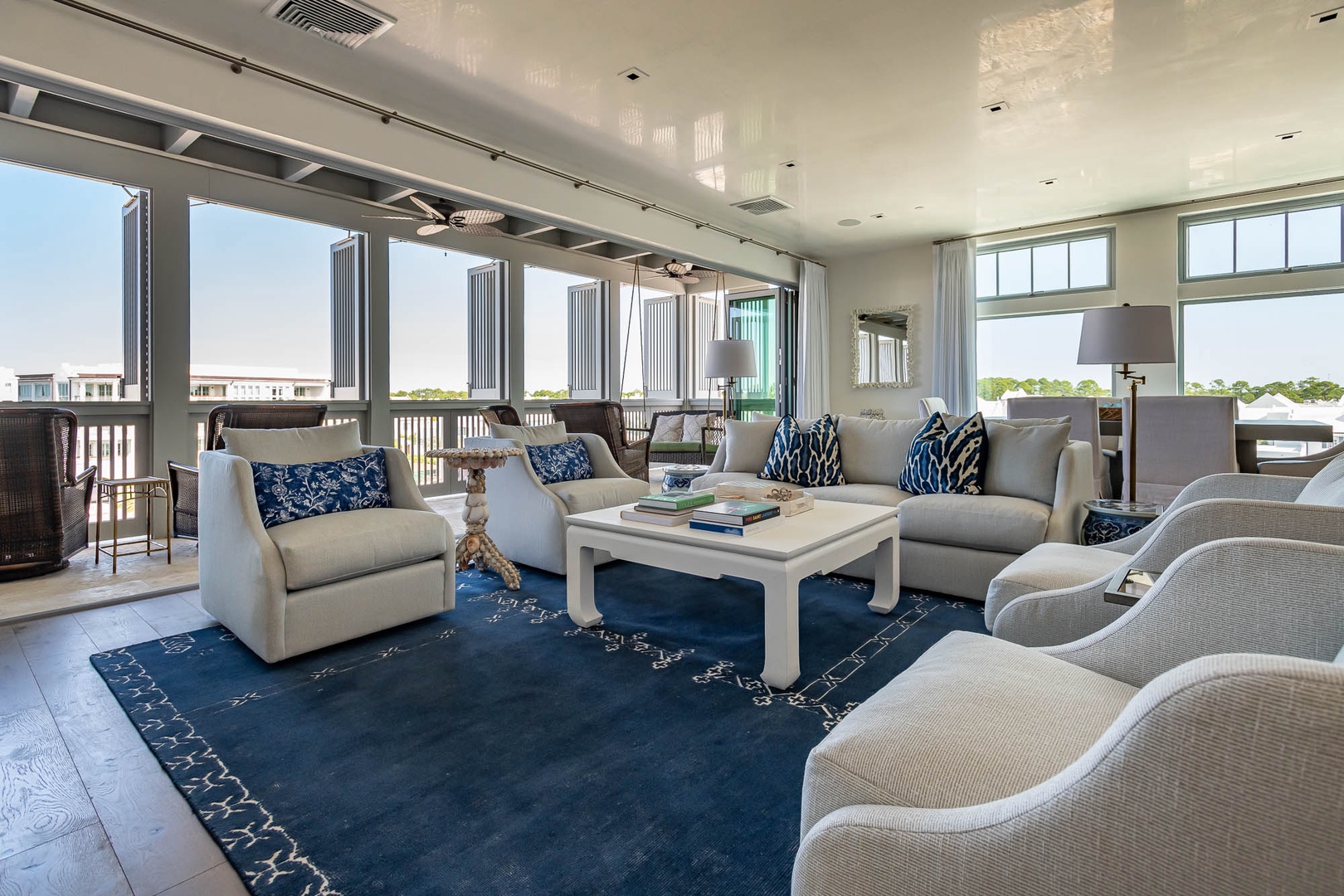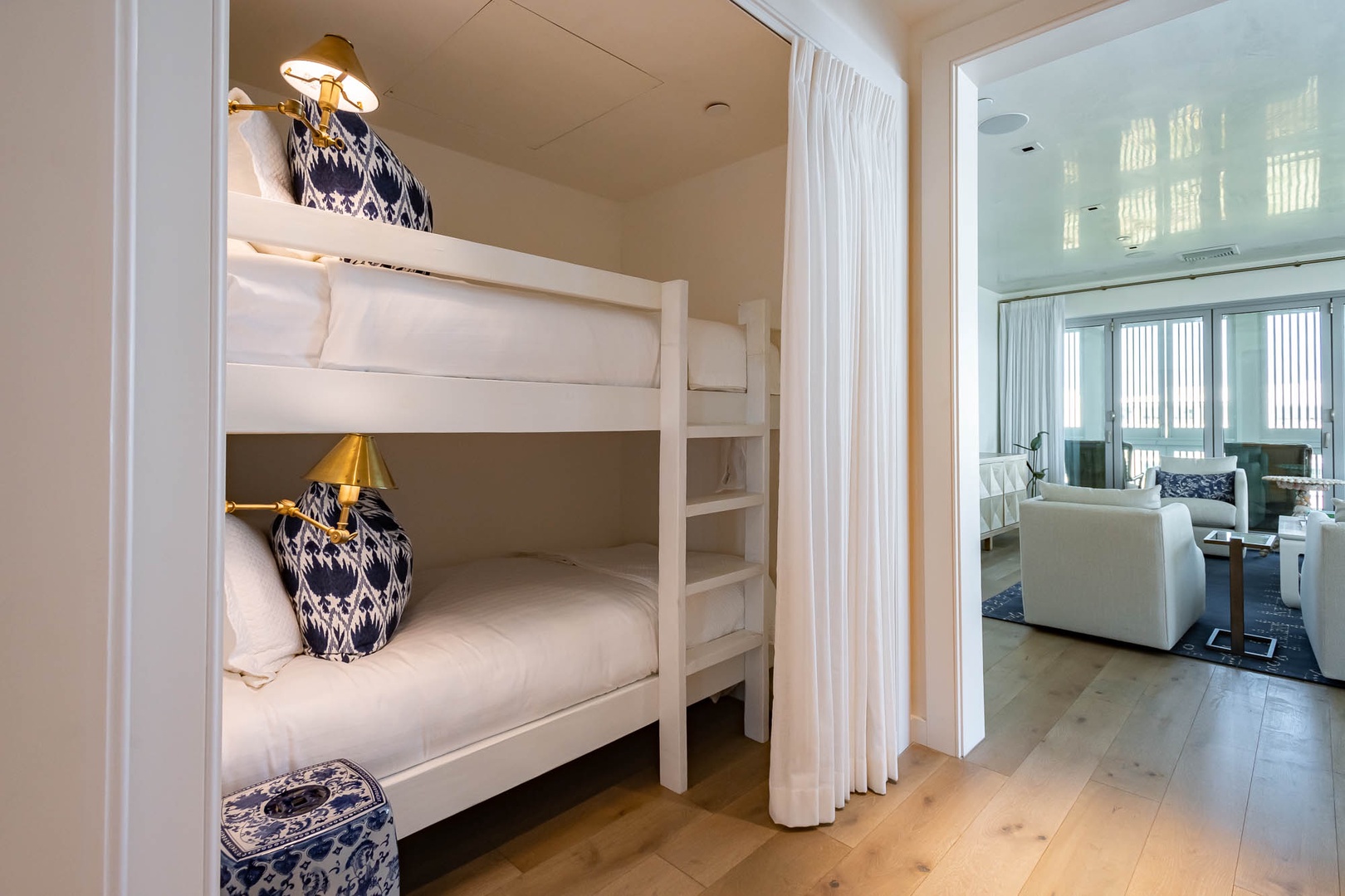 This beautiful condominium on the top floor of The May building offers expansive views across the amphitheater and town center. Just steps from restaurants and merchants, this is the perfect location for exploring Alys Beach. The spacious family room and kitchen provide for a separate sitting and dining area and opens to a large balcony with ample outdoor seating. The primary suite with a king-sized bed is located off the family room and also provides direct access to the balcony. The two additional bedrooms, one with a king-sized bed and the other with a queen-sized bed feature private bathrooms and have views to the East. Each of these bedrooms opens to a small balcony with additional outdoor seating. Finally, in an alcove in the main hallway, there is one set of bunk beds for additional sleeping. Parking for this residence is one designated space in a parking court.